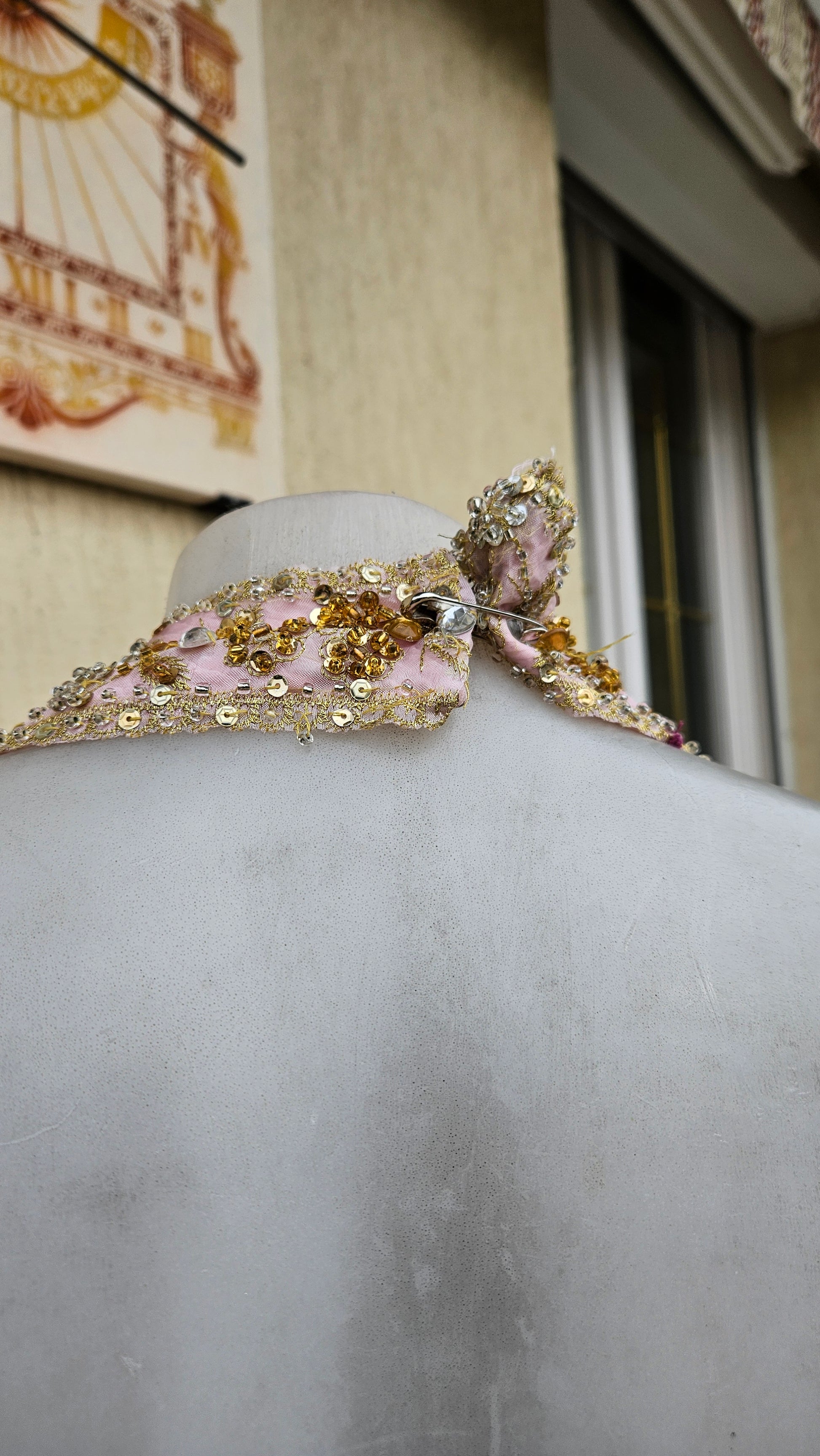 ATTENTION : Fermeture dans la nuque par une épingles à nourrice car crochets cassés. Présence d'accros au niveau de la jupe (voir photos). Prix fixé en conséquent.