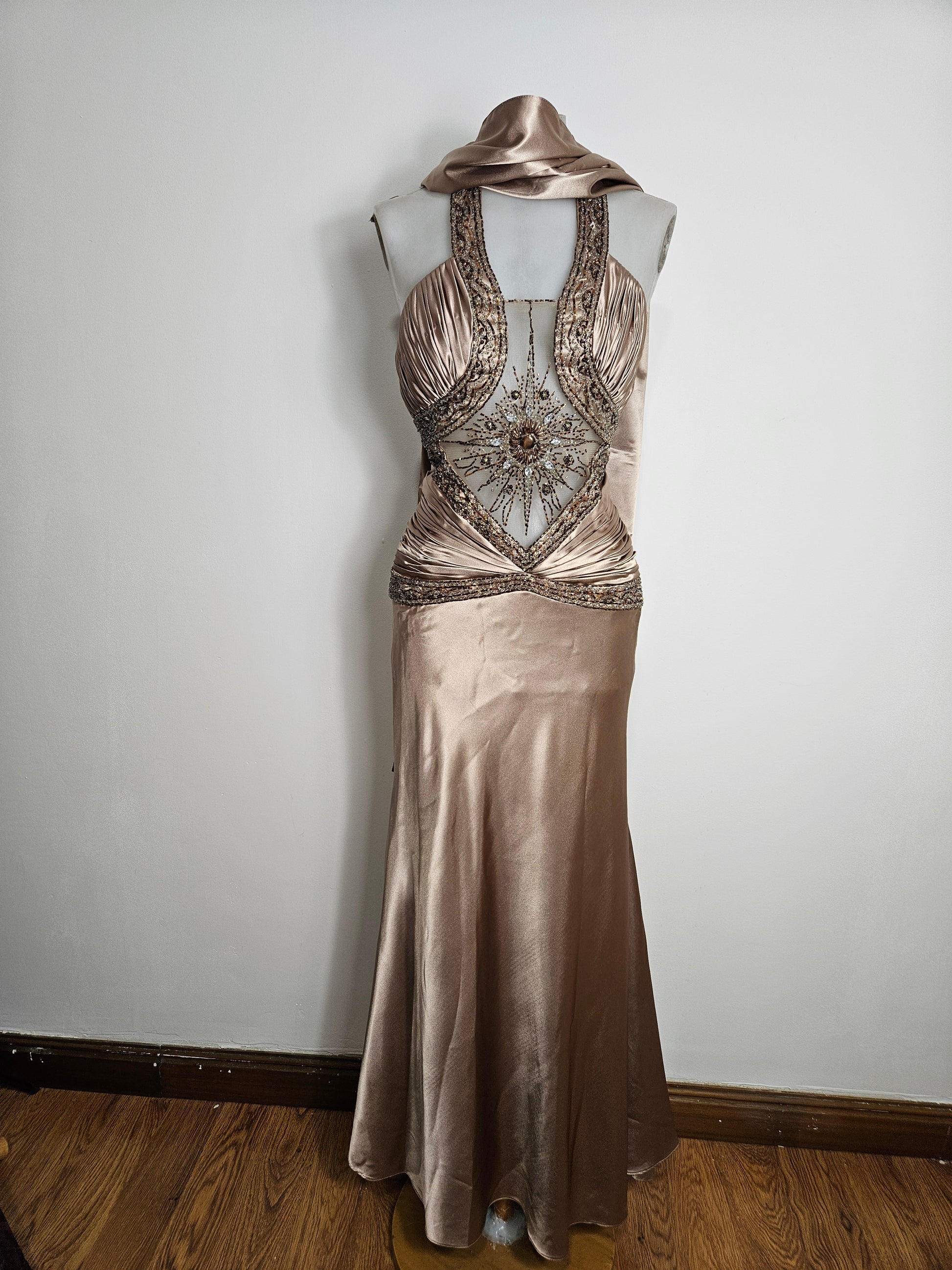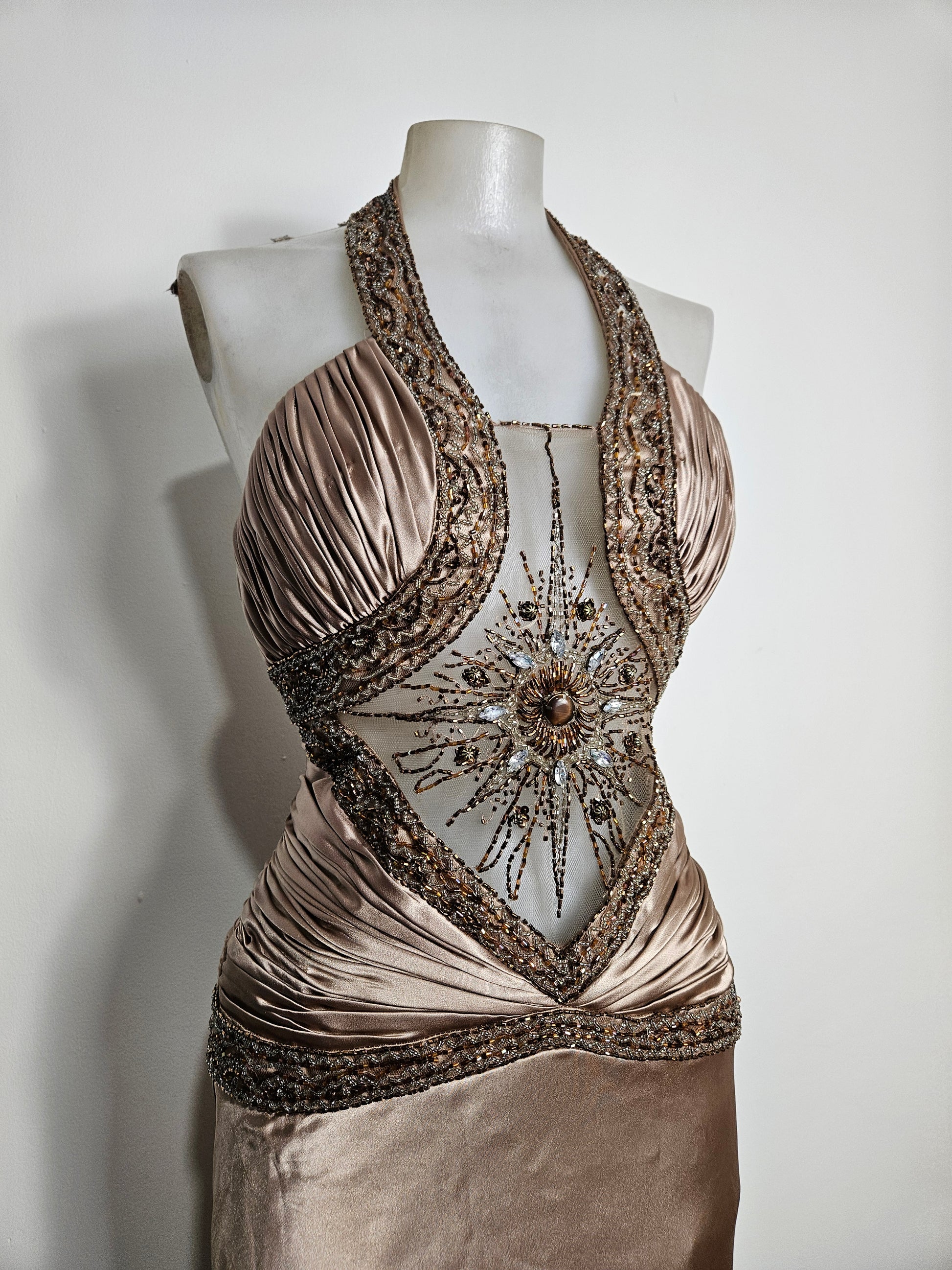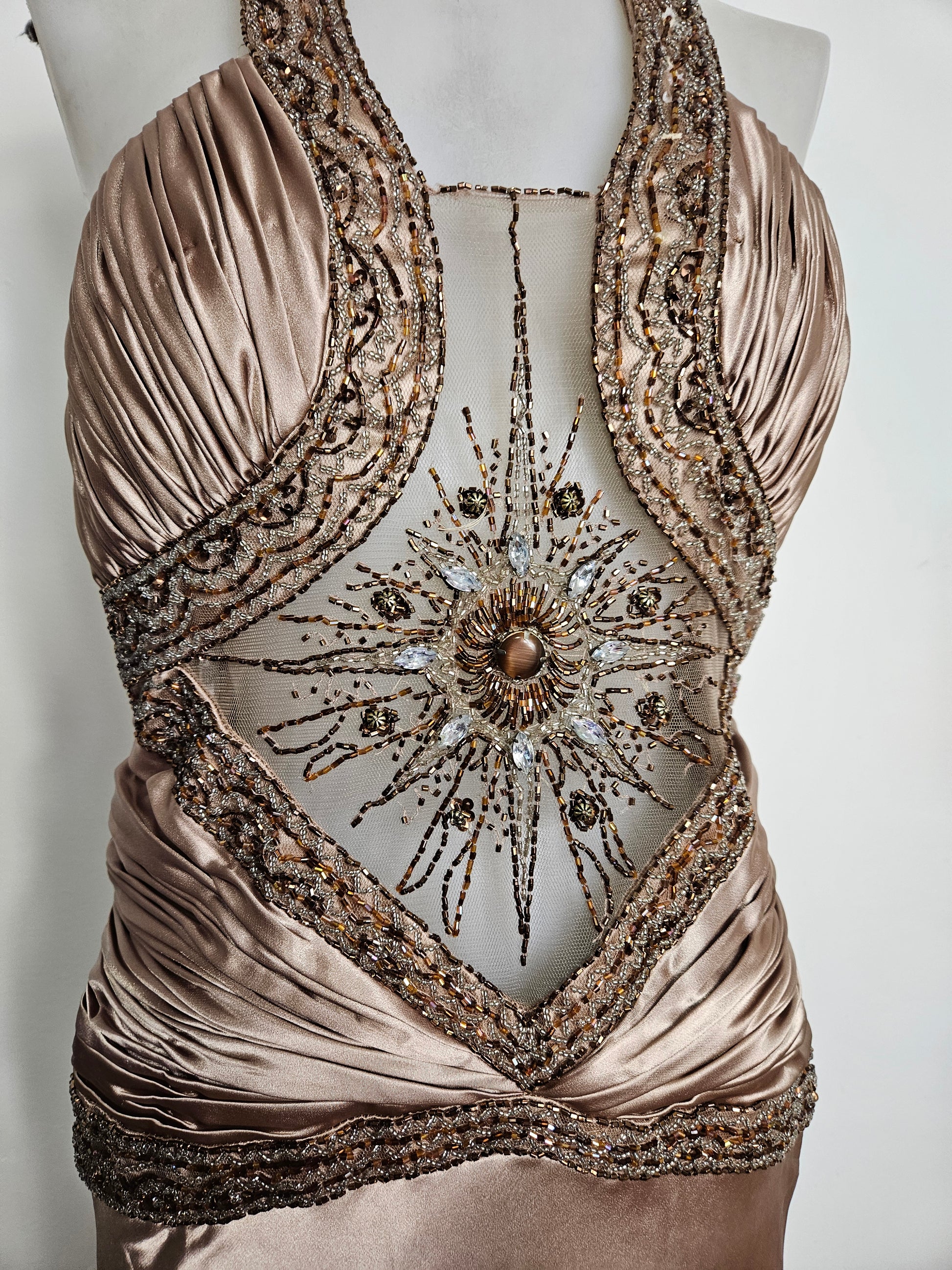 - Le buste est structuré par des fronces et bordé de riches broderies perlées formant un motif central rayonnant sur une base en tulle transparent.