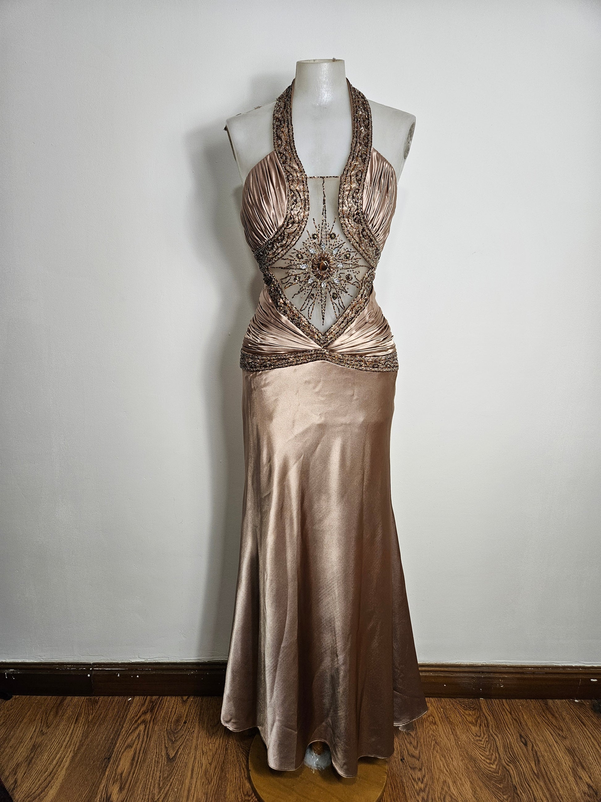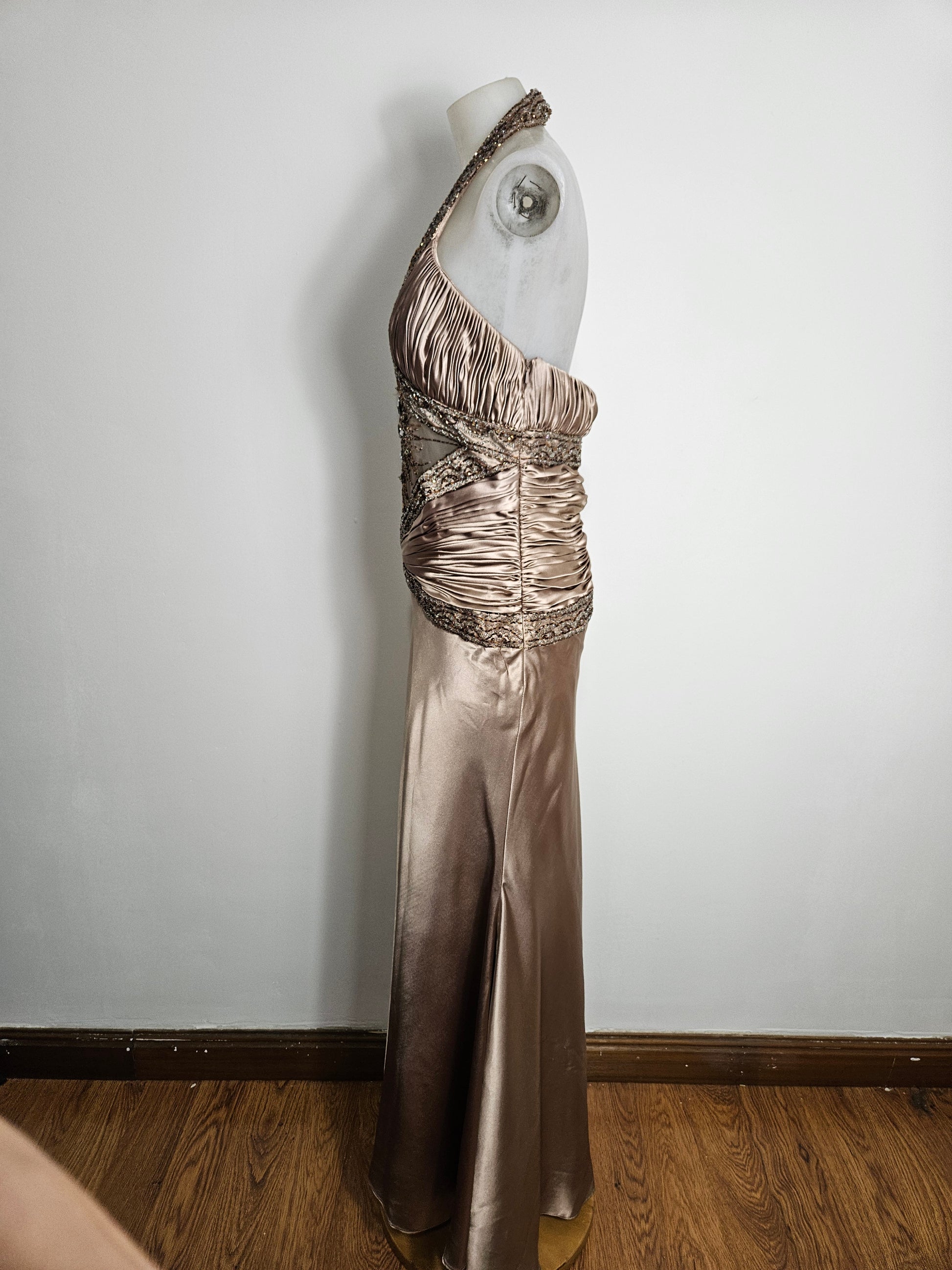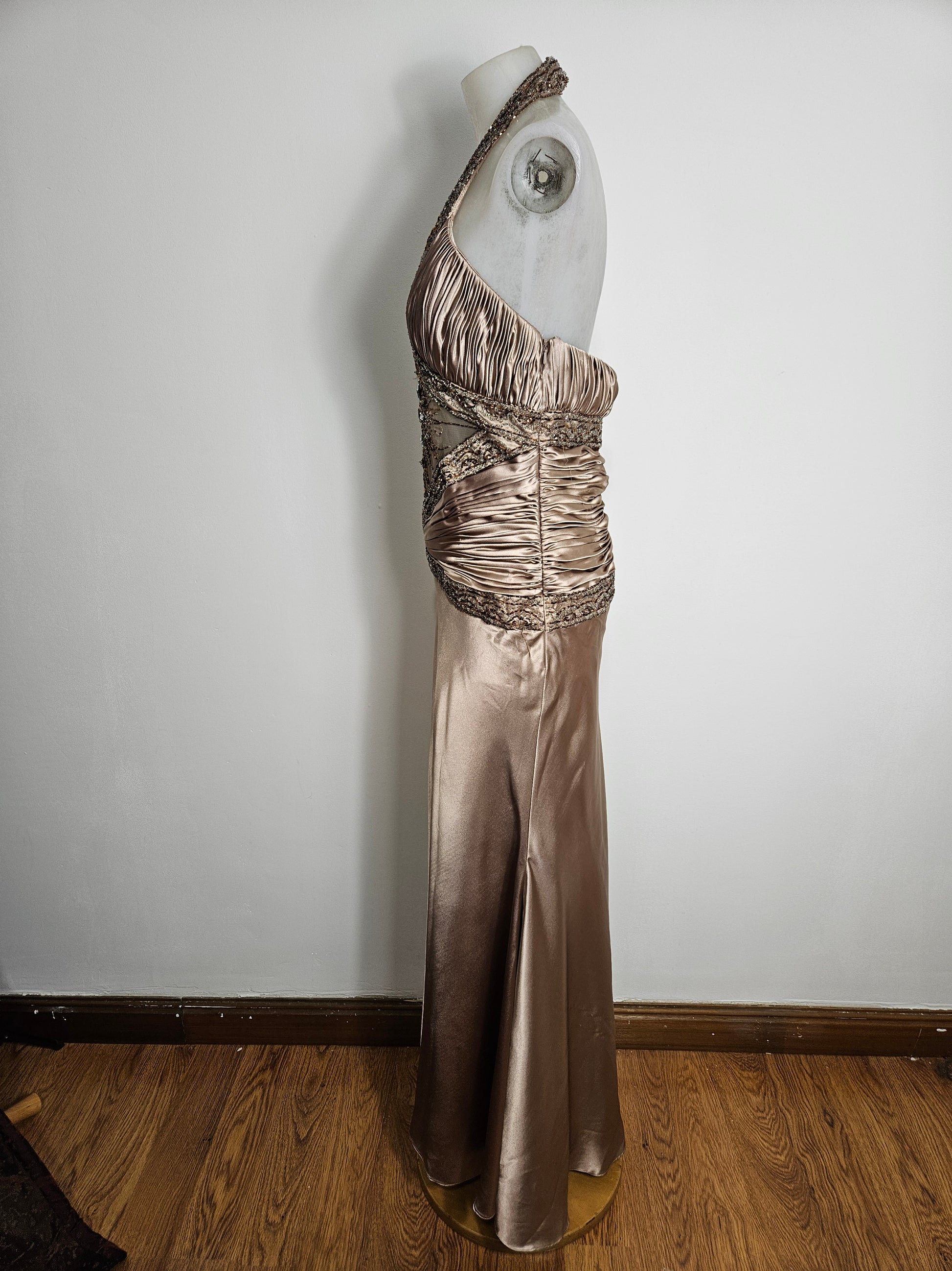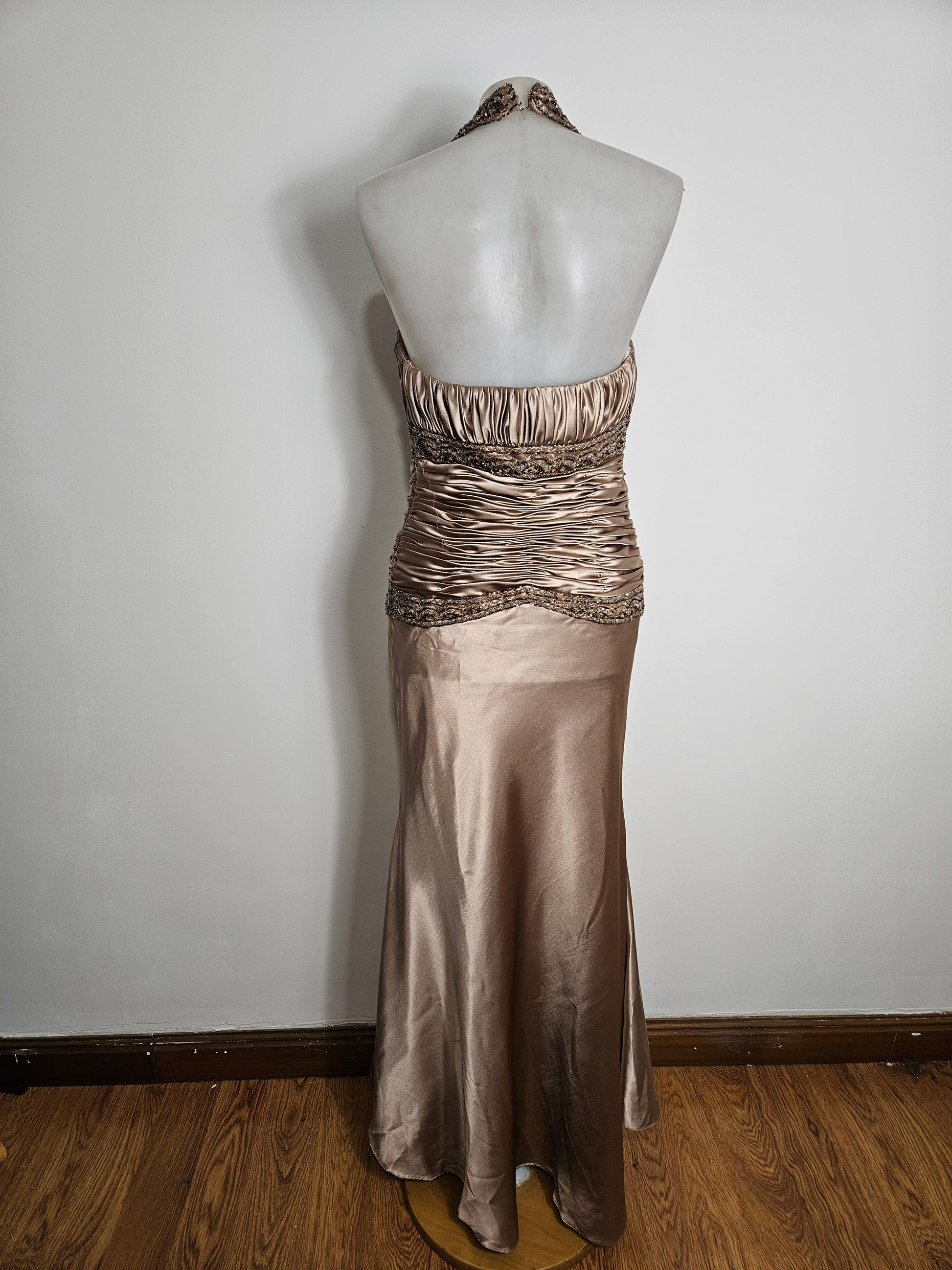 - Longue robe satinée à col halter et dos nu.