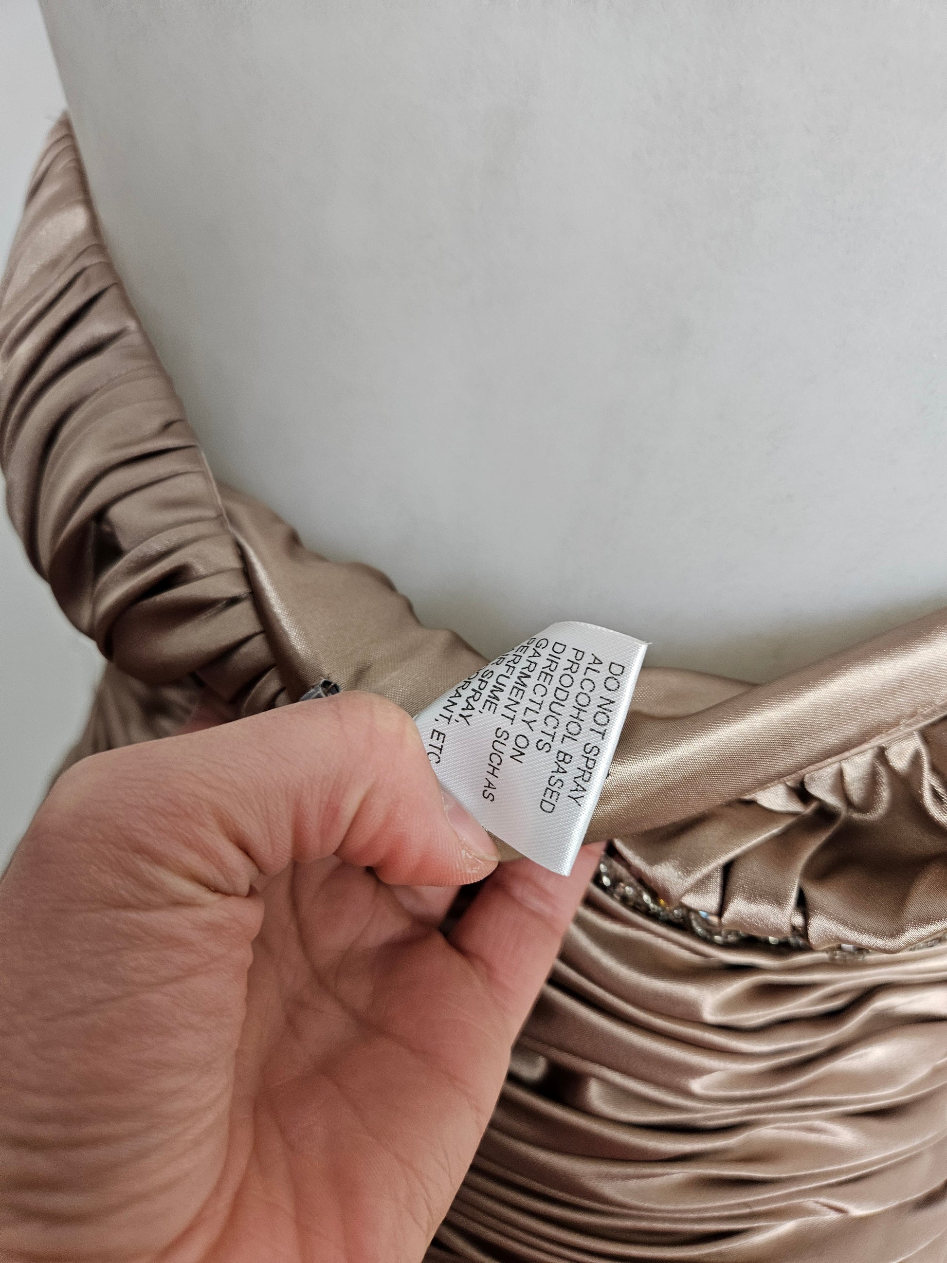 - La jupe est longue, fluide et légèrement évasée, avec un tombé brillant et soyeux.