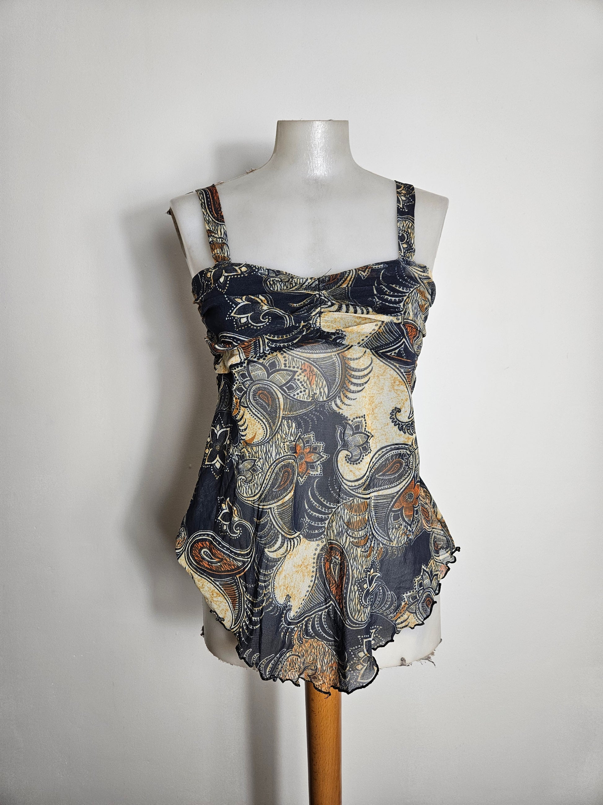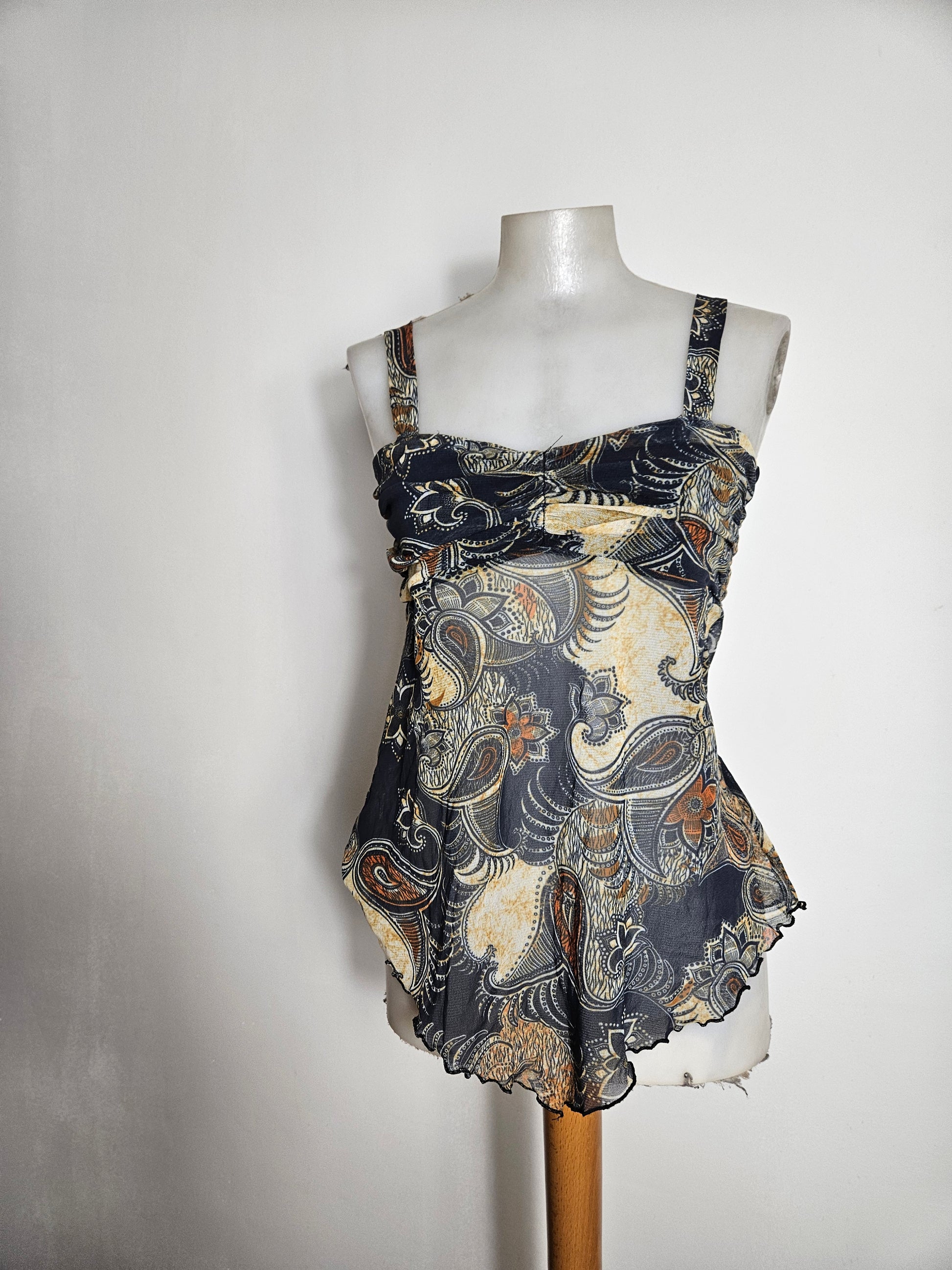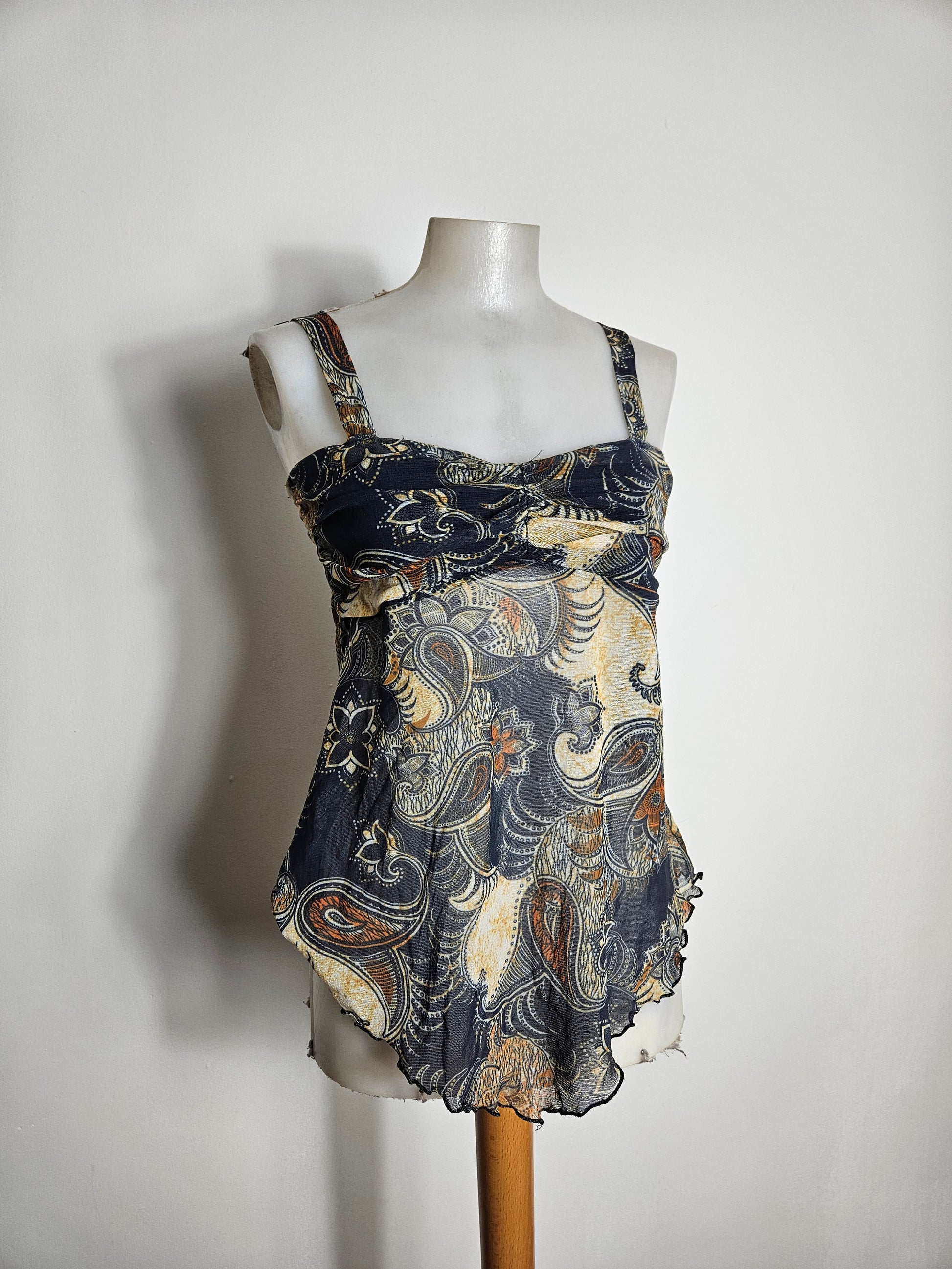 Top à bretelles larges avec imprimé cachemire multicolore sur fond sombre. Encolure droite avec fronces sur le devant. Coupe fluide avec bas asymétrique légèrement ondulé. Matière légère et semi-transparente. Doublée au niveau de la poitrine mais pas au niveau du ventre.