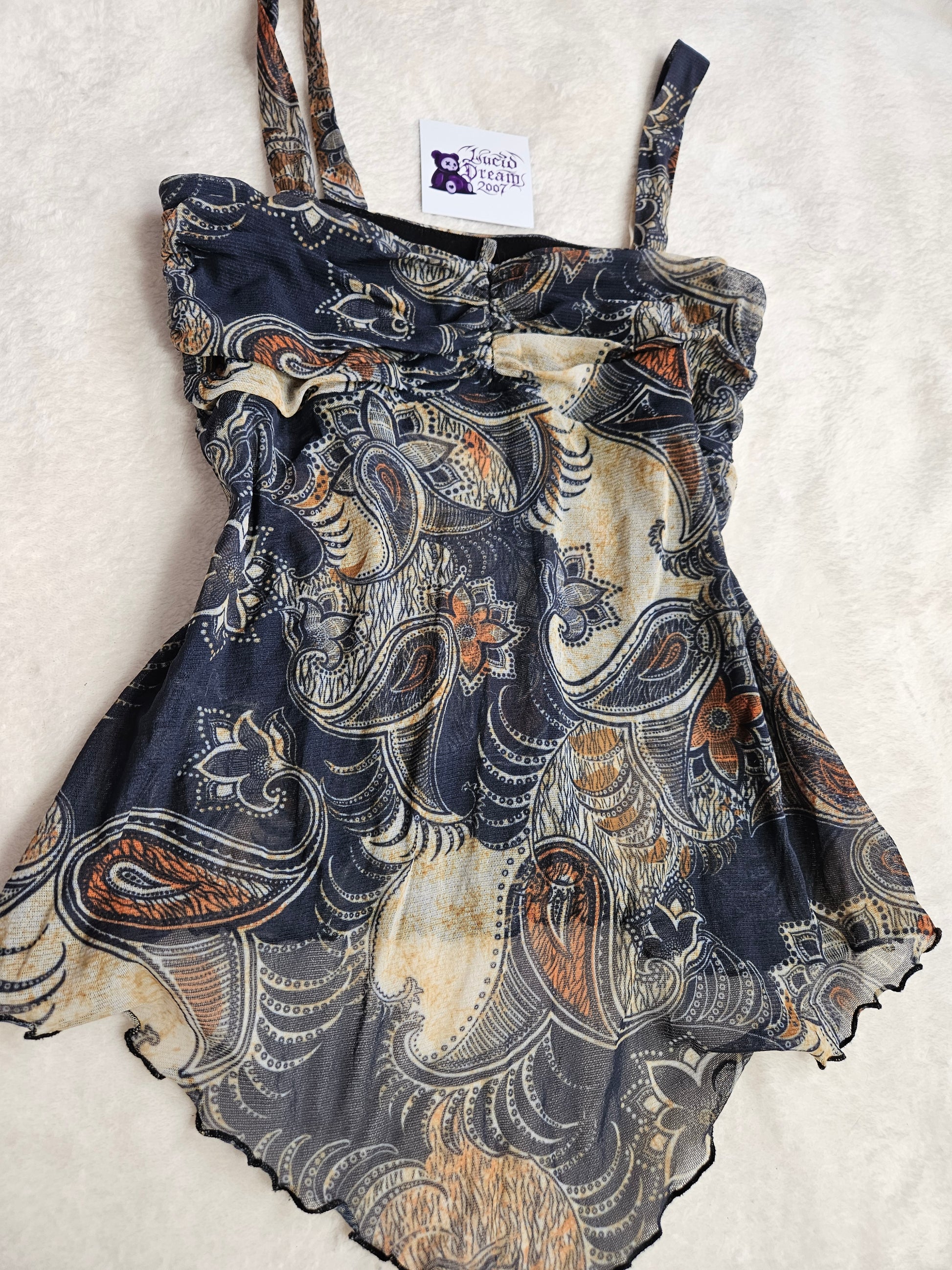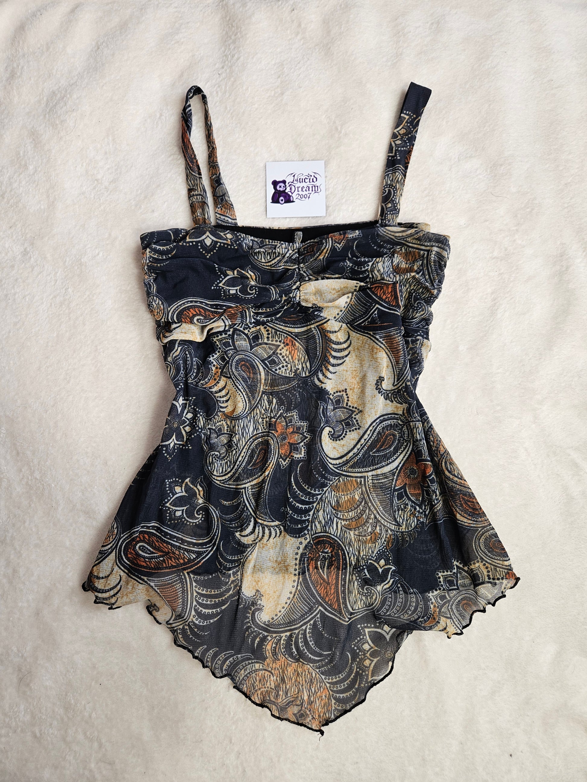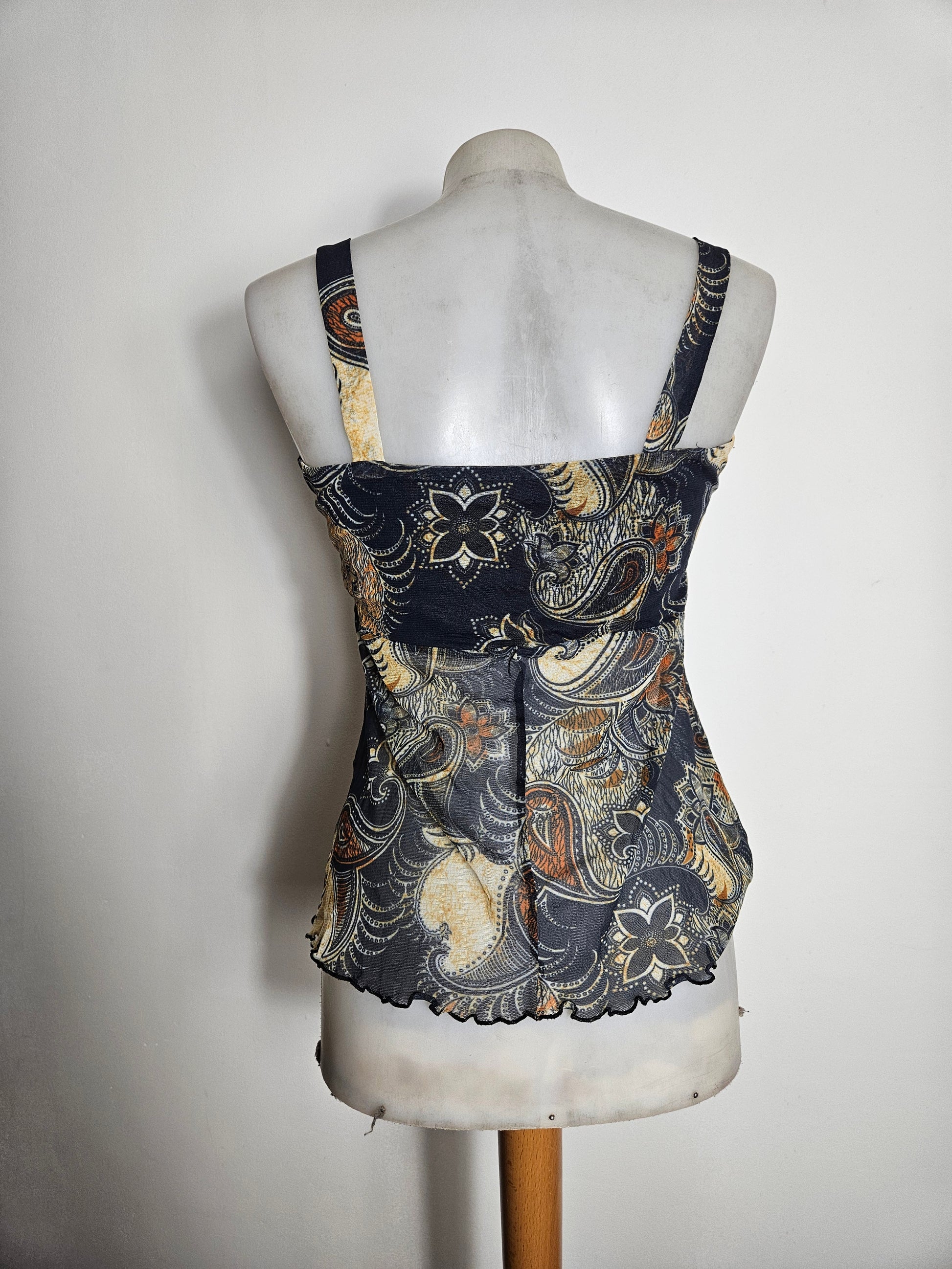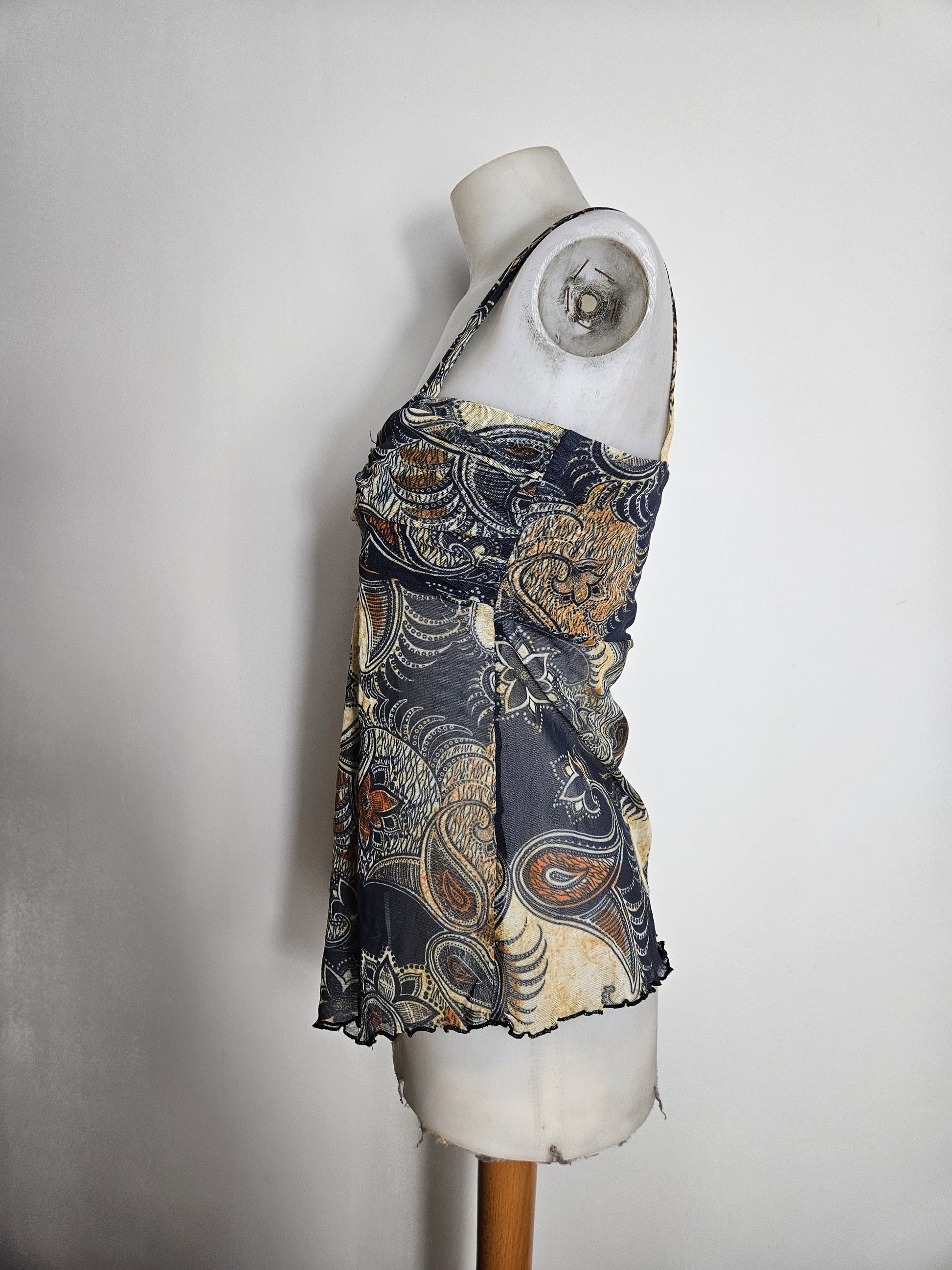Top à bretelles larges avec imprimé cachemire multicolore sur fond sombre. Encolure droite avec fronces sur le devant. Coupe fluide avec bas asymétrique légèrement ondulé. Matière légère et semi-transparente. Doublée au niveau de la poitrine mais pas au niveau du ventre.