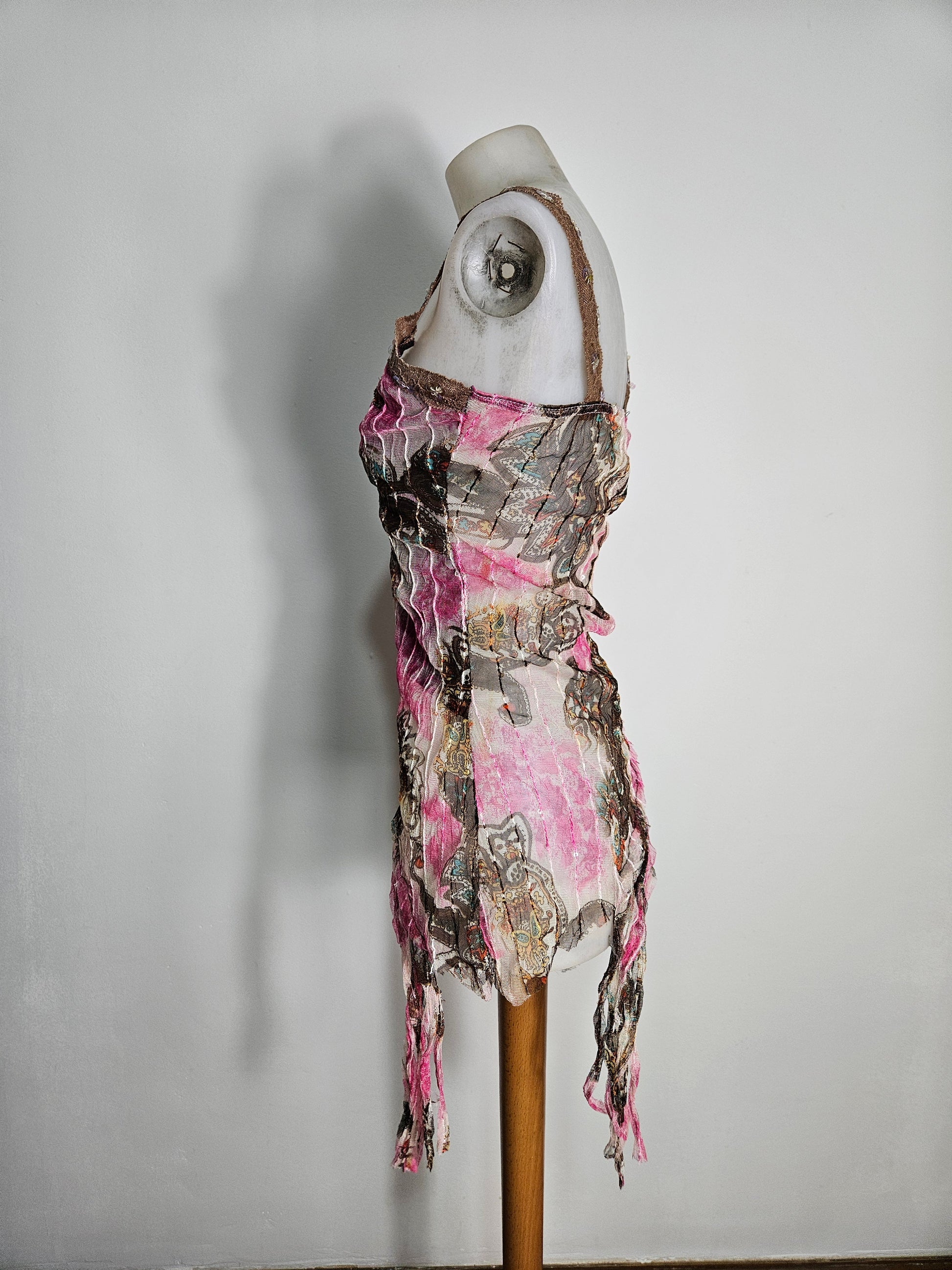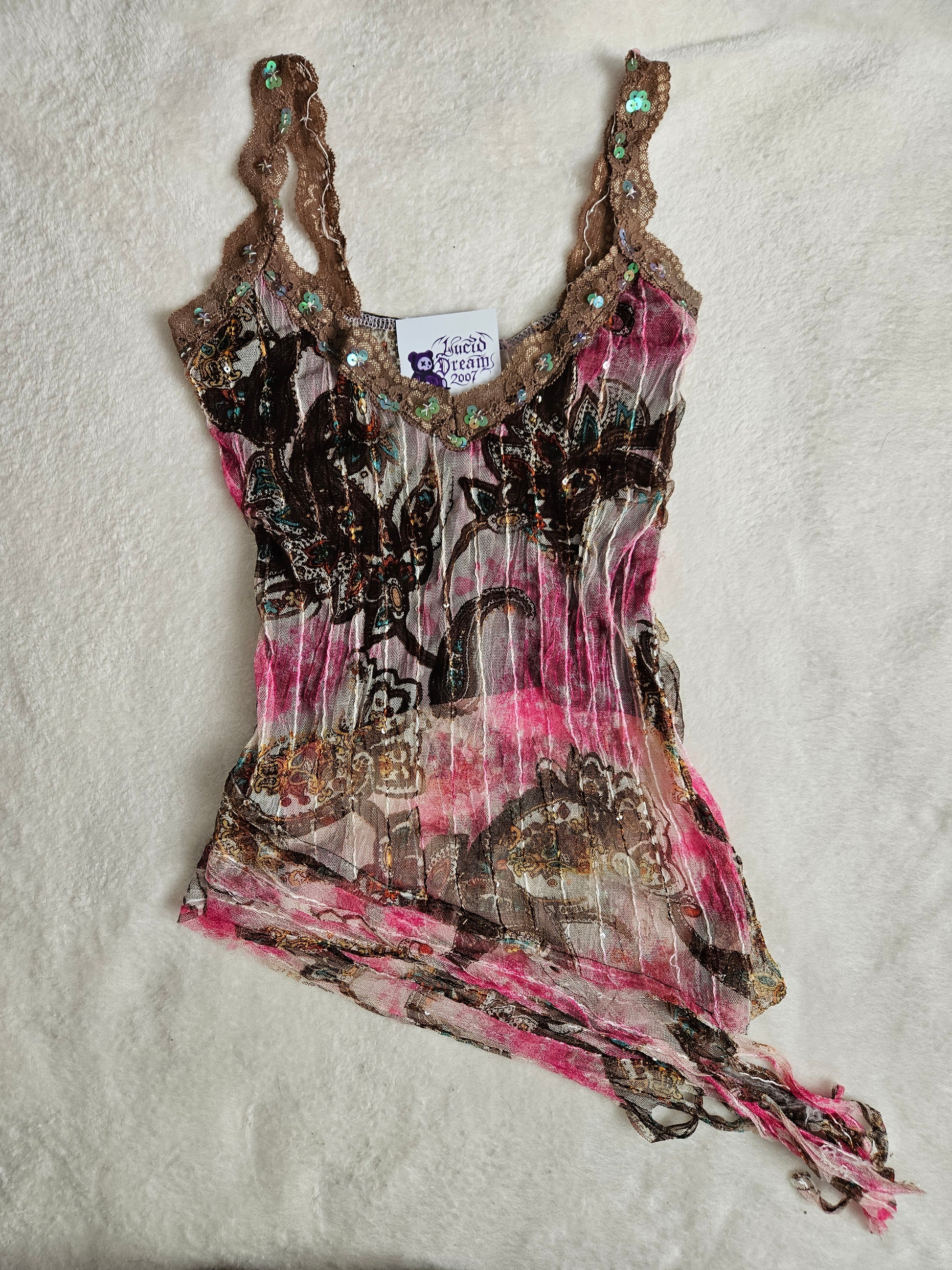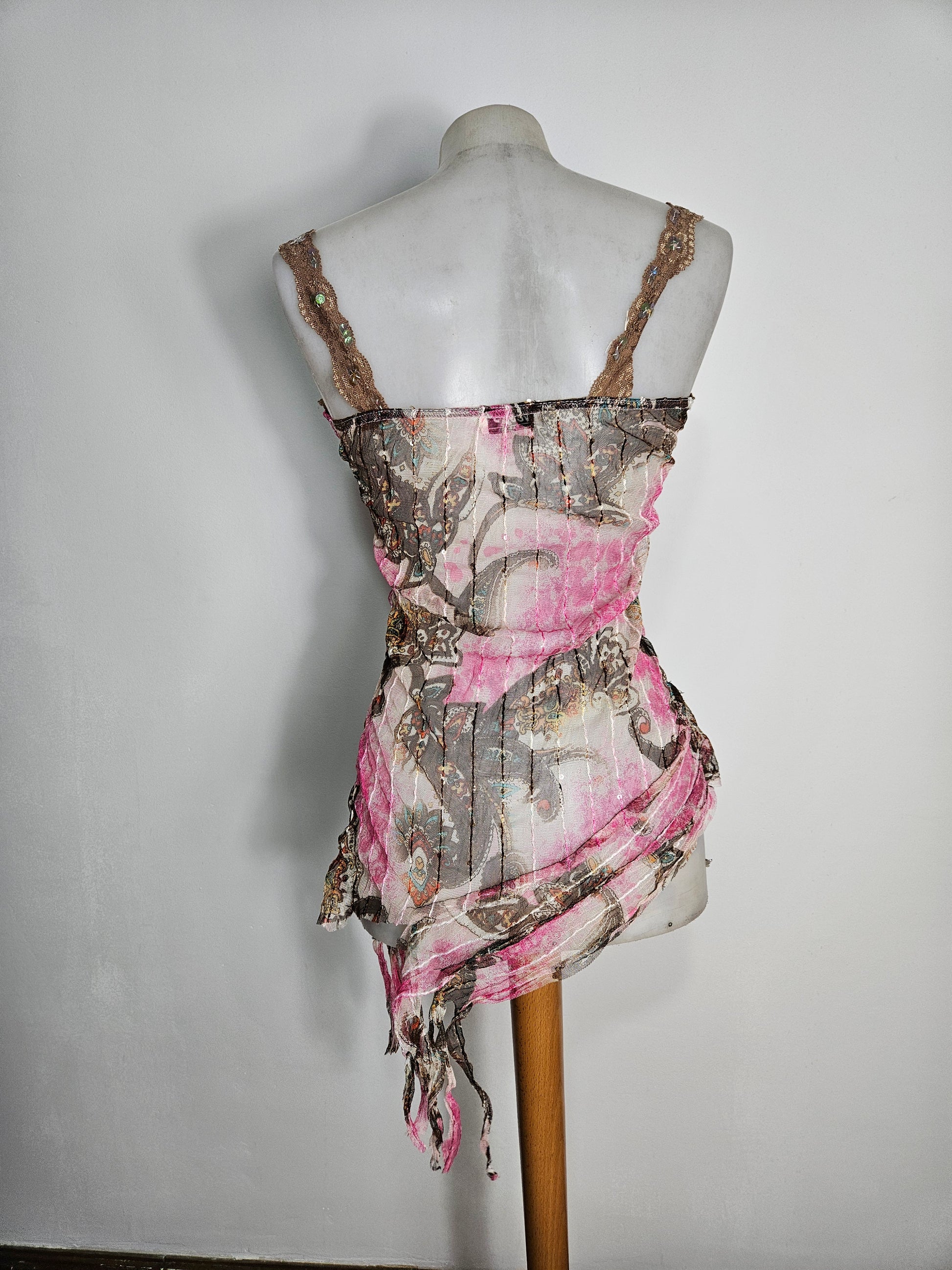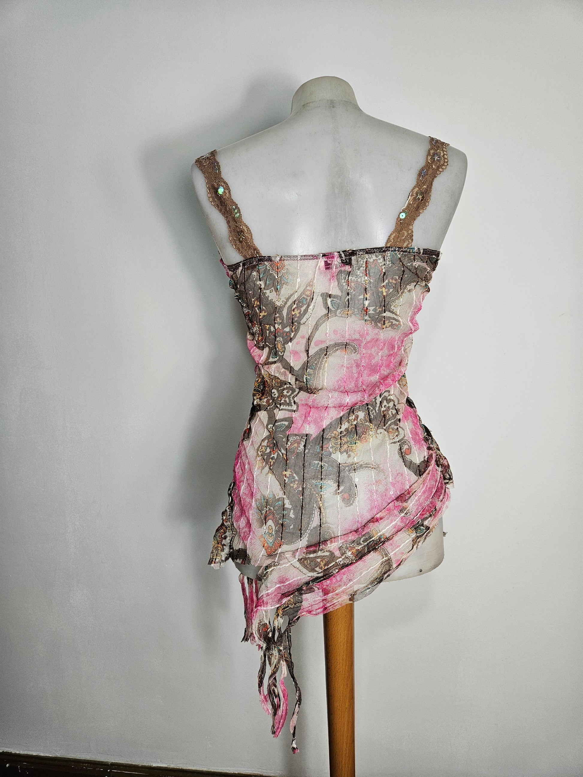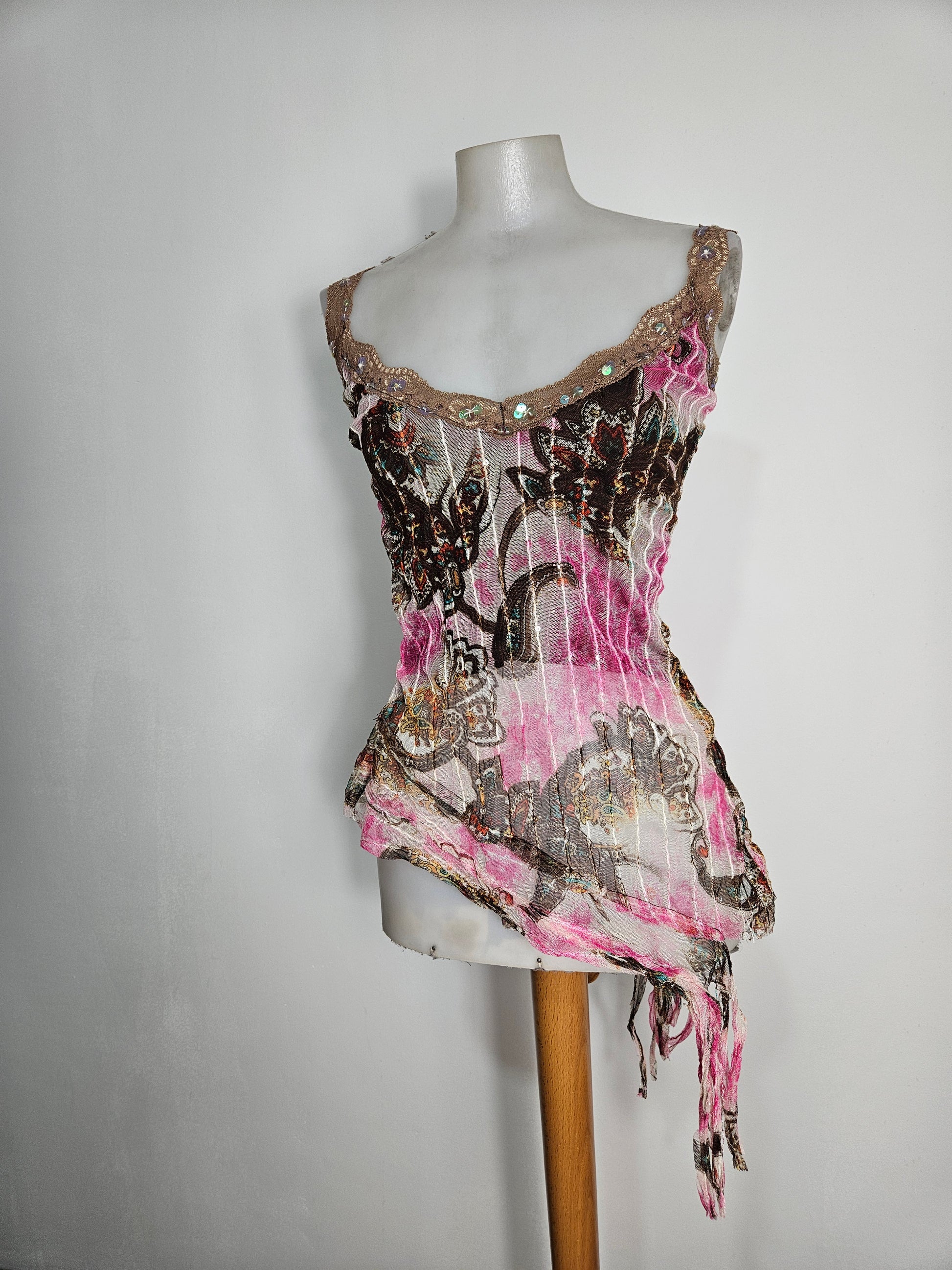 Top sans manches à fines bretelles. Coupe ajustée avec bas asymétrique et finition effilée. Encolure ornée d’un galon décoratif avec petits éléments brillants intégrés. Tissu imprimé à motifs abstraits et floraux dans des tons rose, brun, beige et touches plus foncées. Matière transparente et streth.