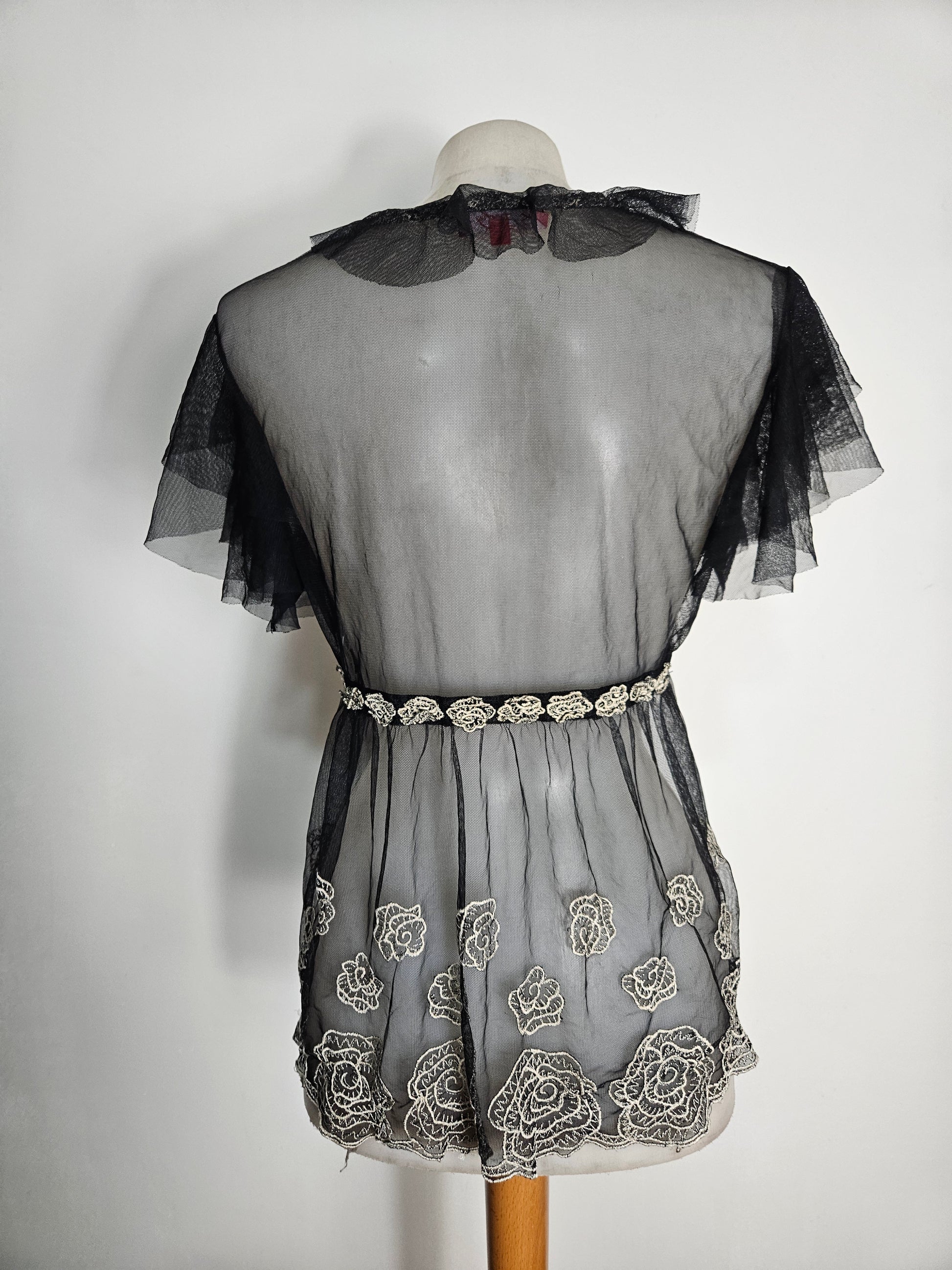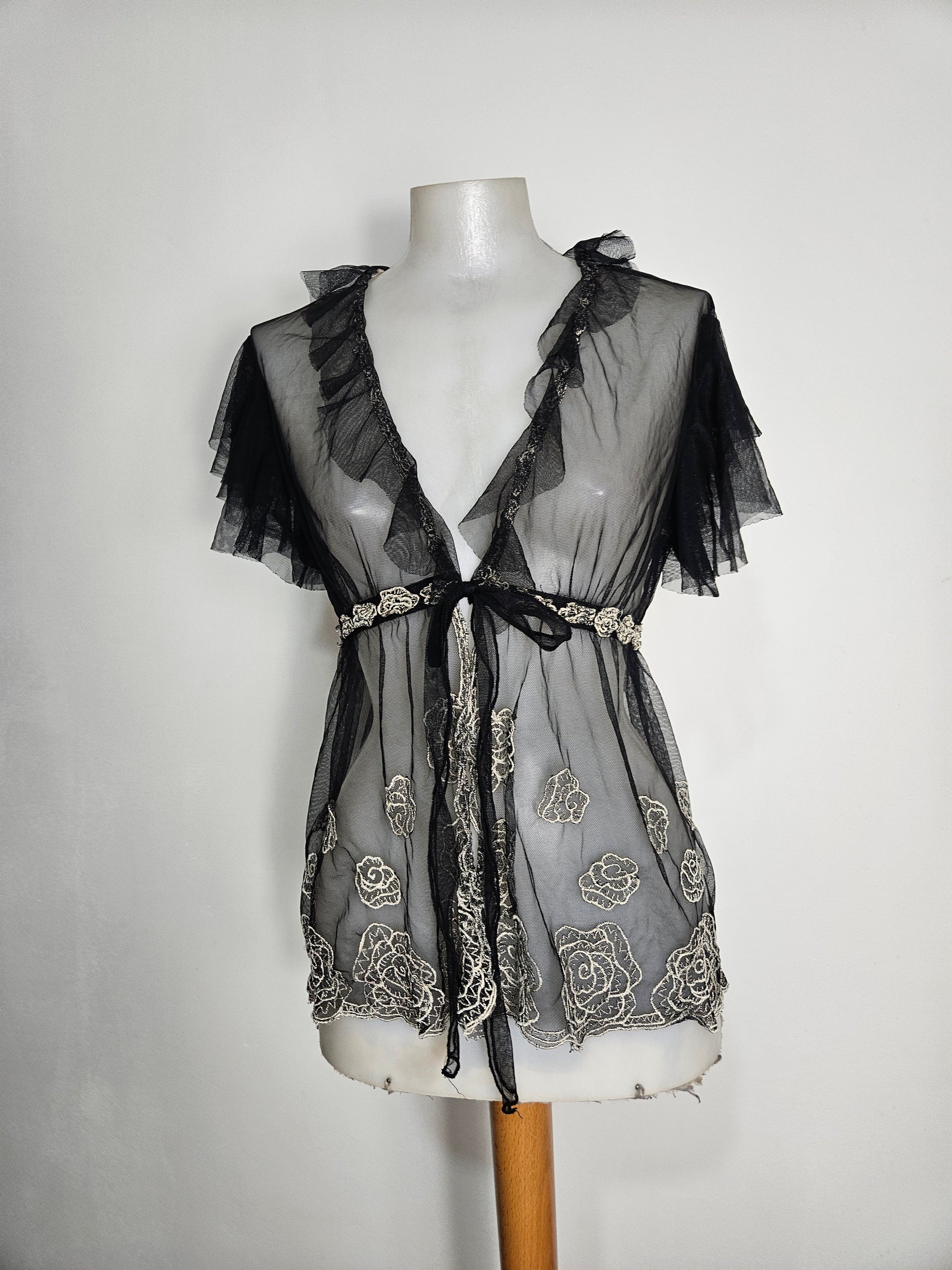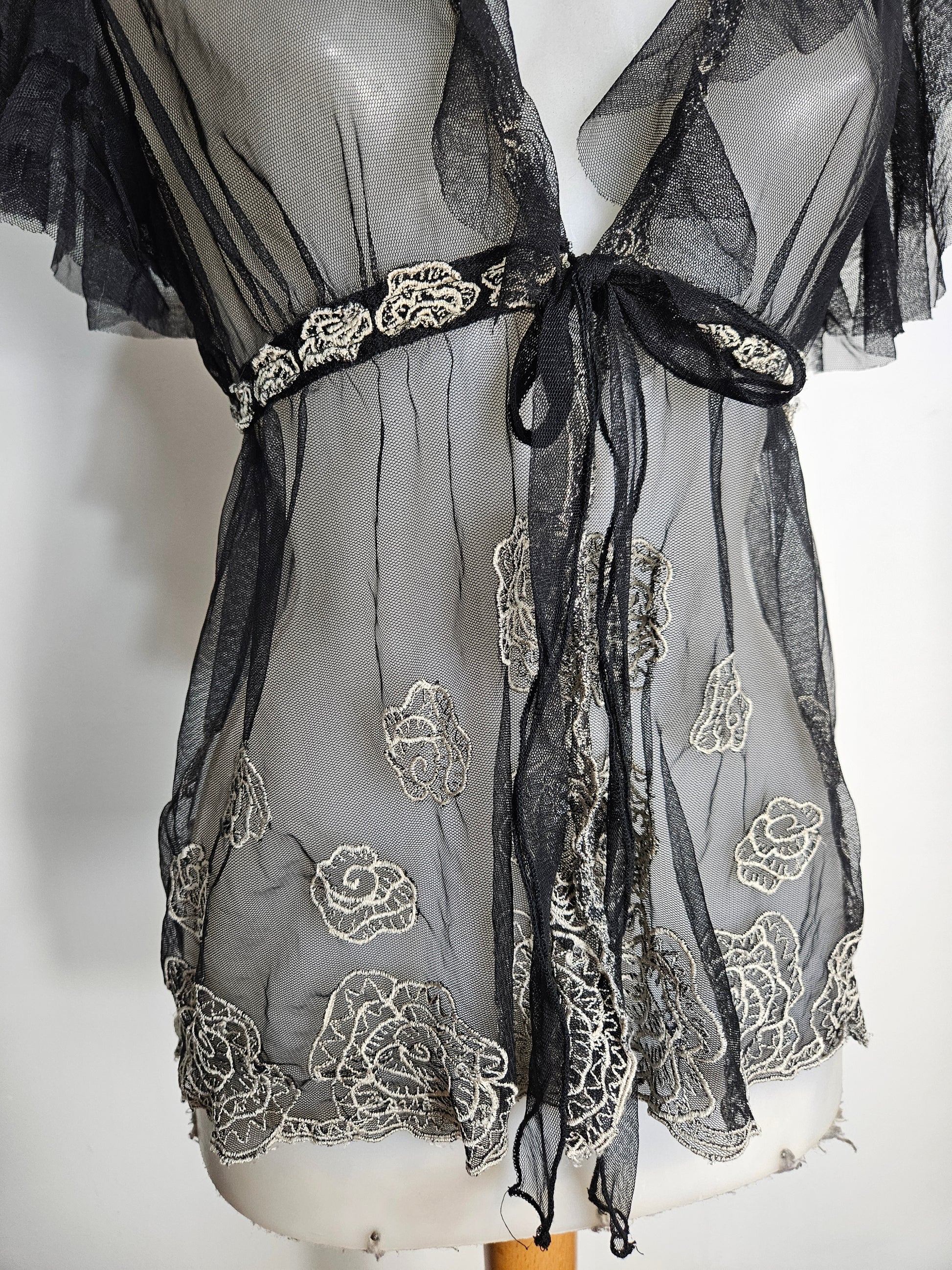 Top transparent en maille fine noire. Coupe fluide avec col en V plongeant. Manches courtes à volants. Fermeture par lien à nouer sous la poitrine. Broderies florales contrastées réparties sur l’ensemble du tissu. Ourlet décoré de broderies. Matière légère et transparente.