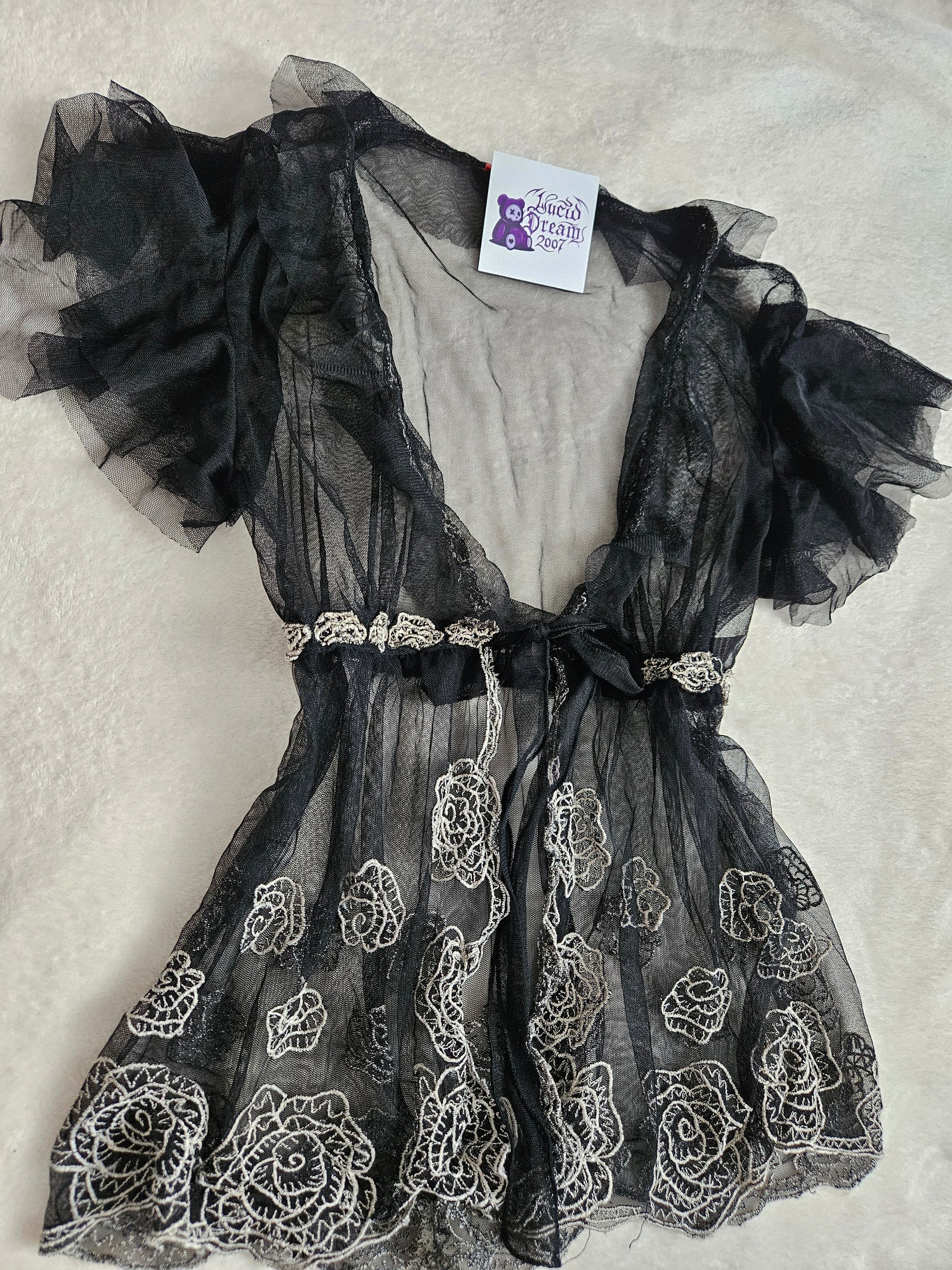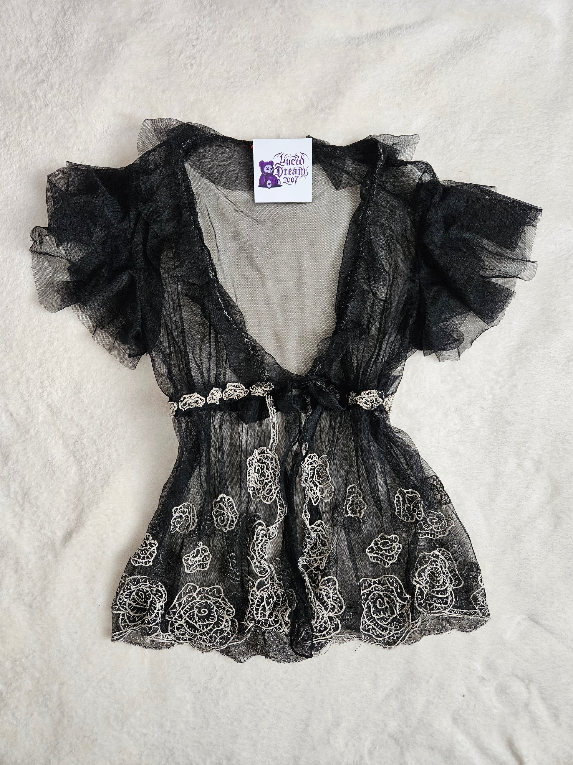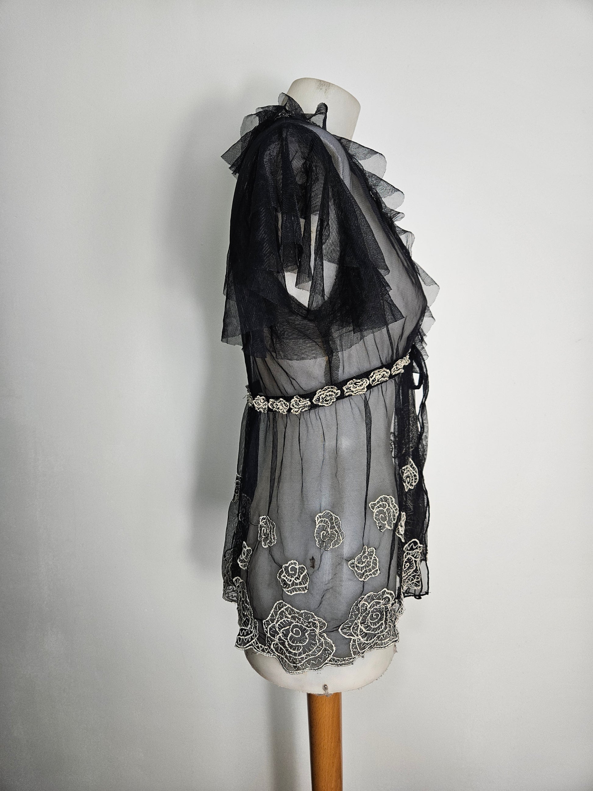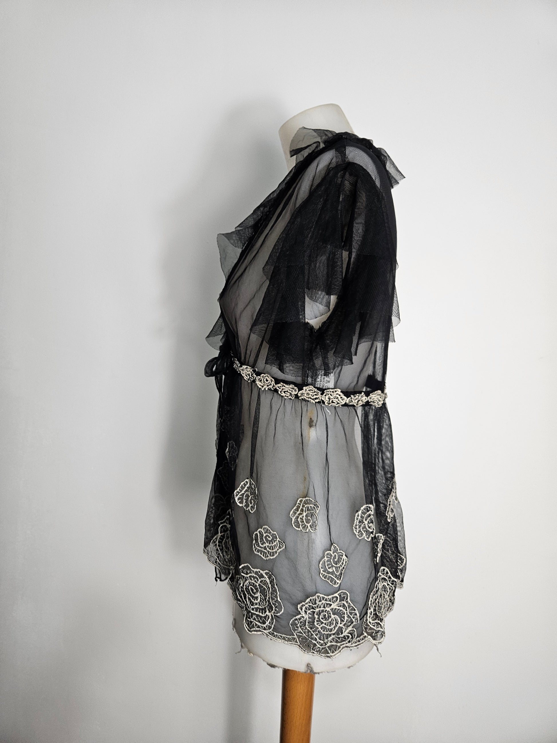 Top transparent en maille fine noire. Coupe fluide avec col en V plongeant. Manches courtes à volants. Fermeture par lien à nouer sous la poitrine. Broderies florales contrastées réparties sur l’ensemble du tissu. Ourlet décoré de broderies. Matière légère et transparente.