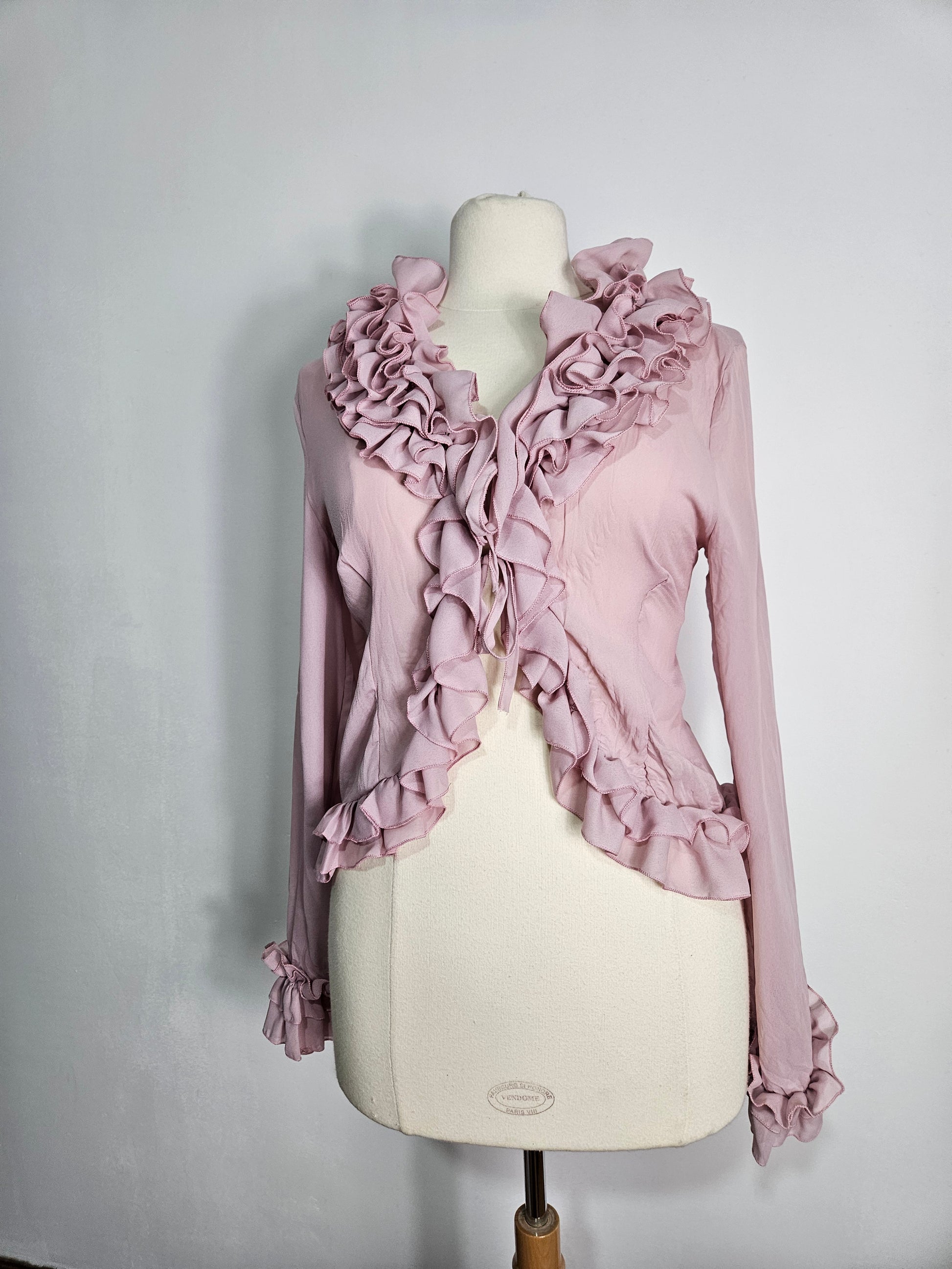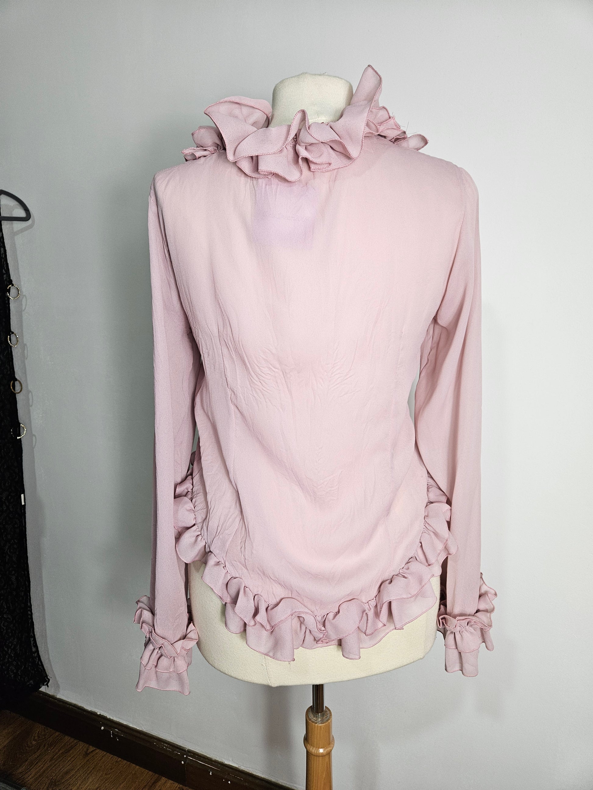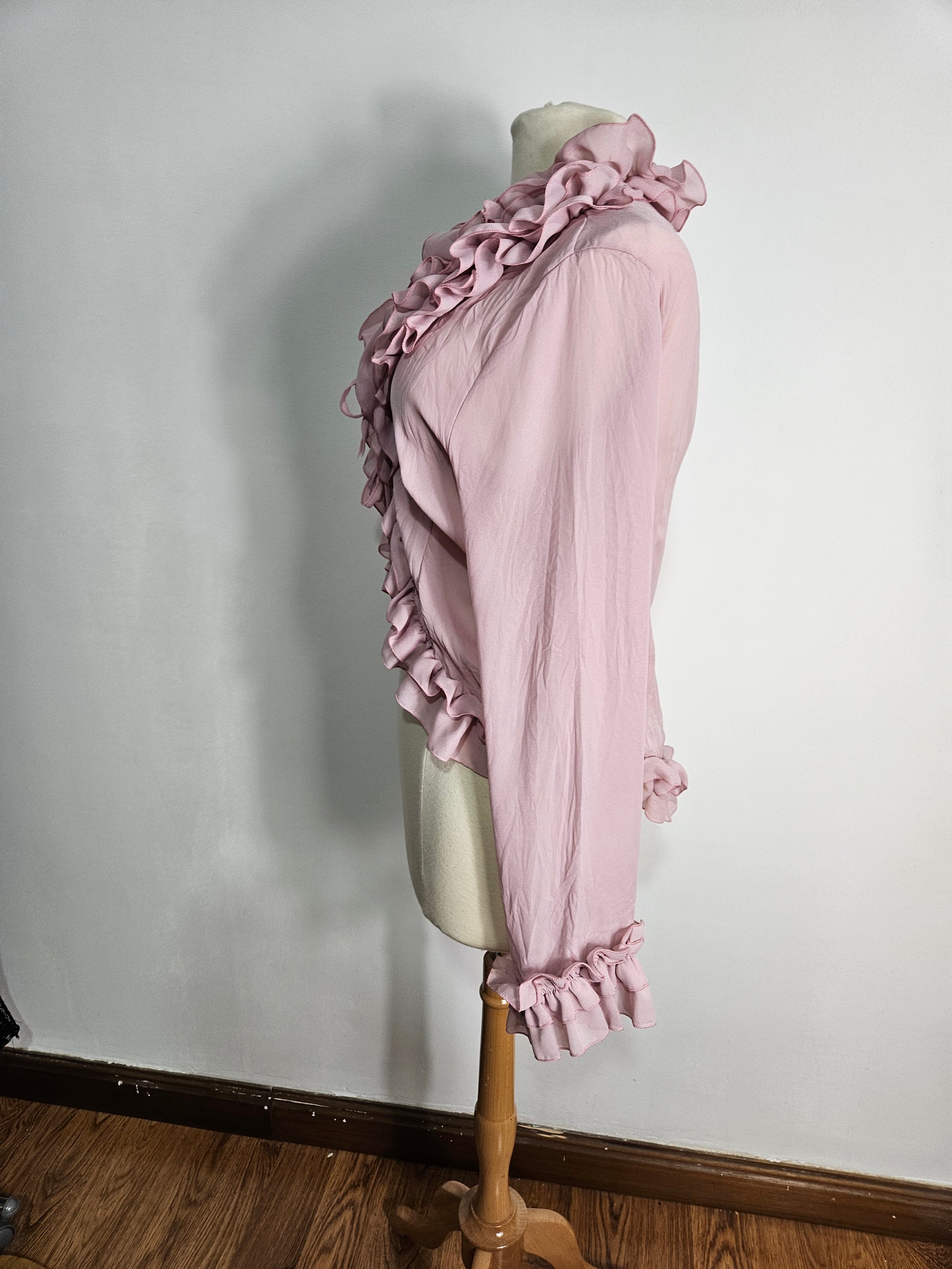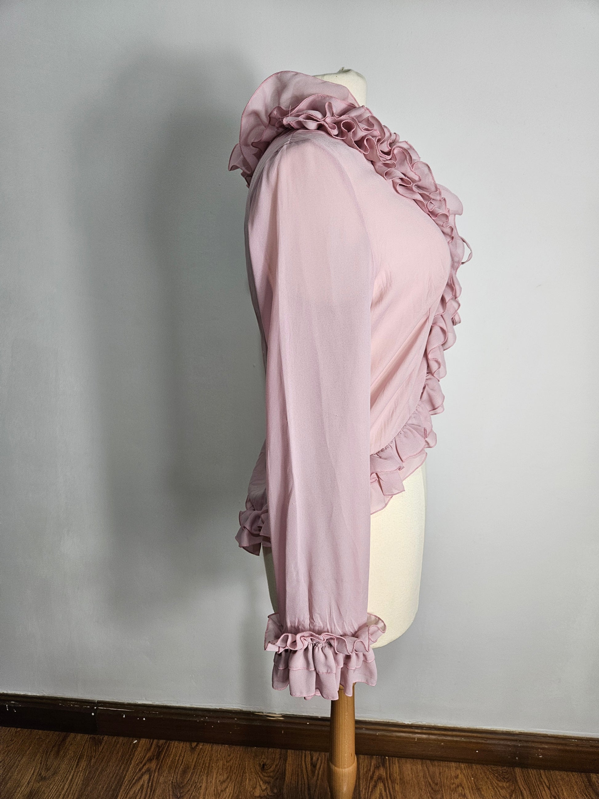 Sublime chemisier rose clair tout en voile/mesh. Avec une cascade de volants/froufrous autour du col. Les manches sont longues et également ornées de volants. Il se ferme avec des lacets à l'avant. Il n'est pas doublé et est donc transparent.