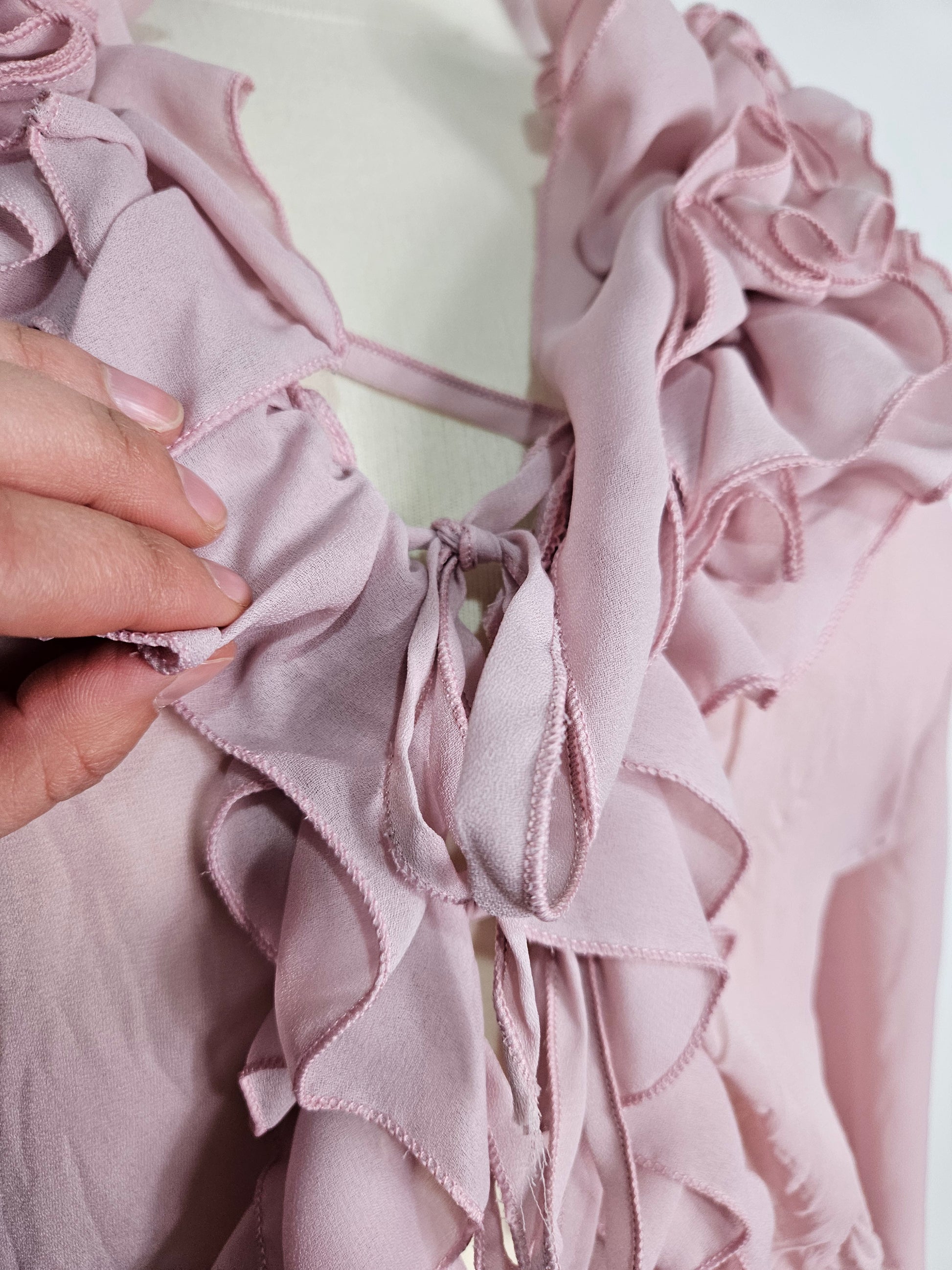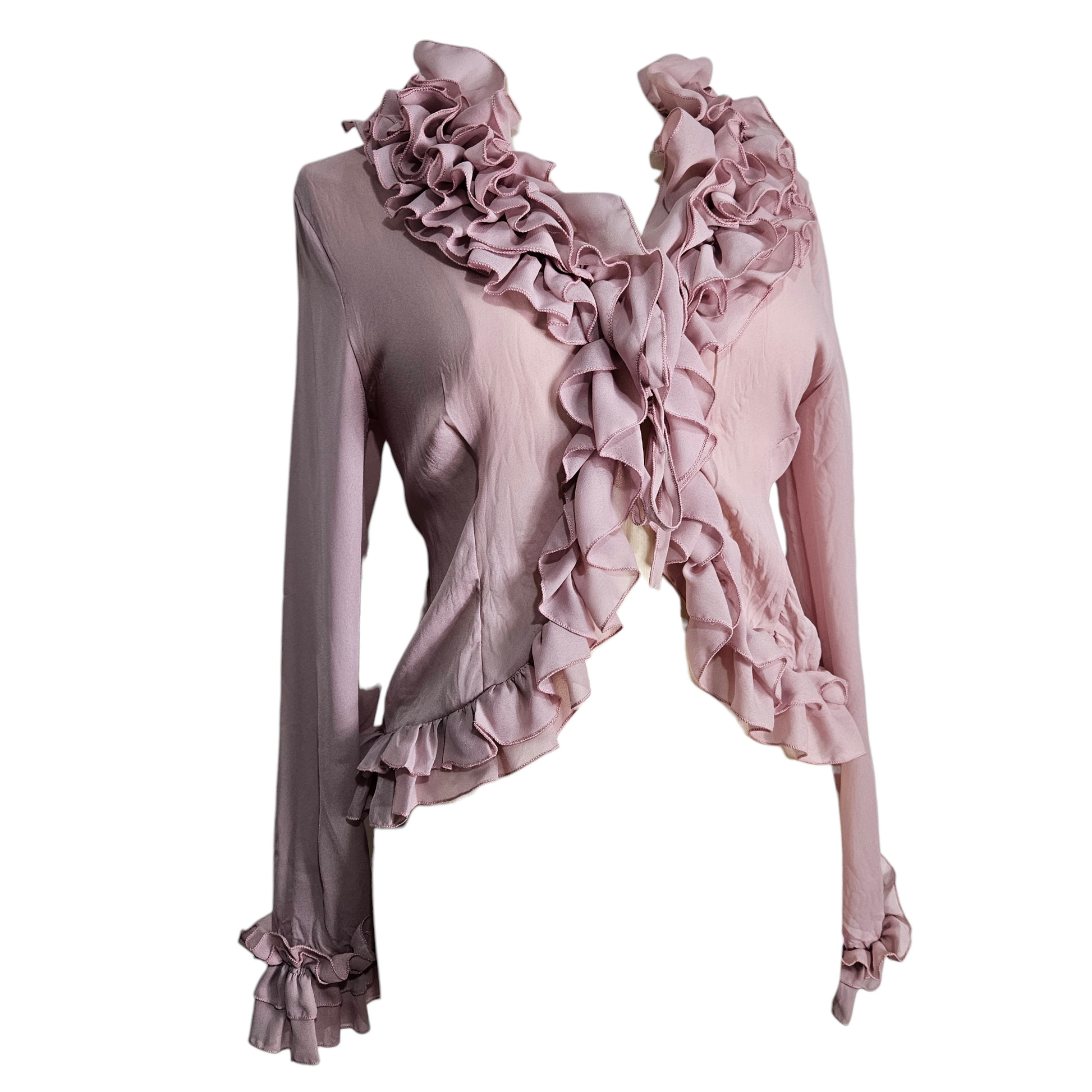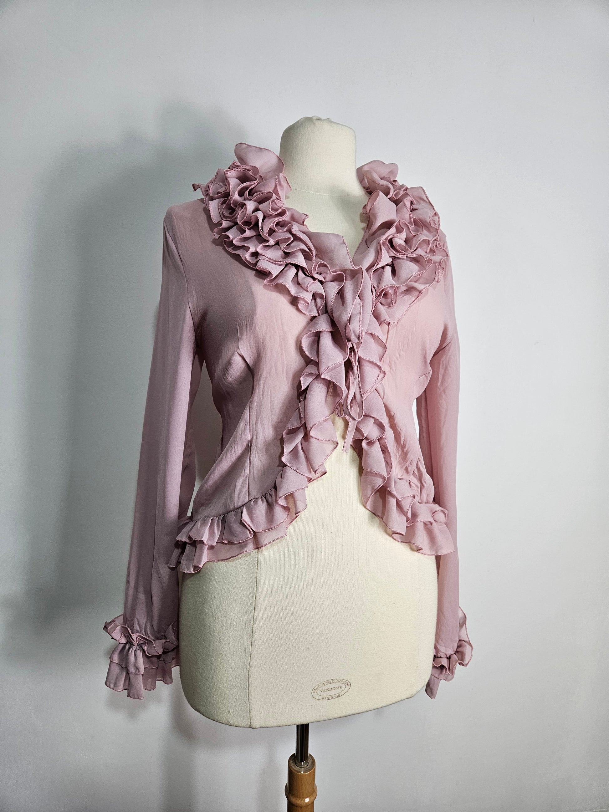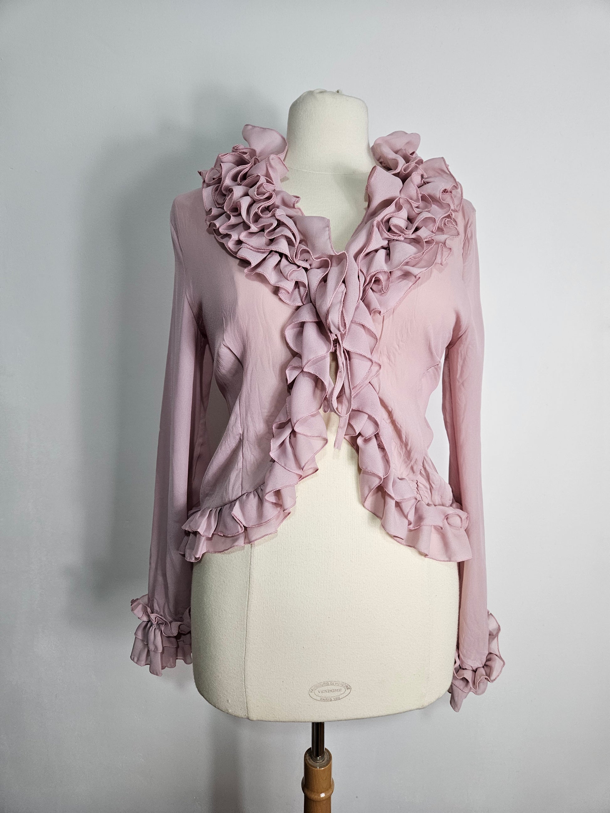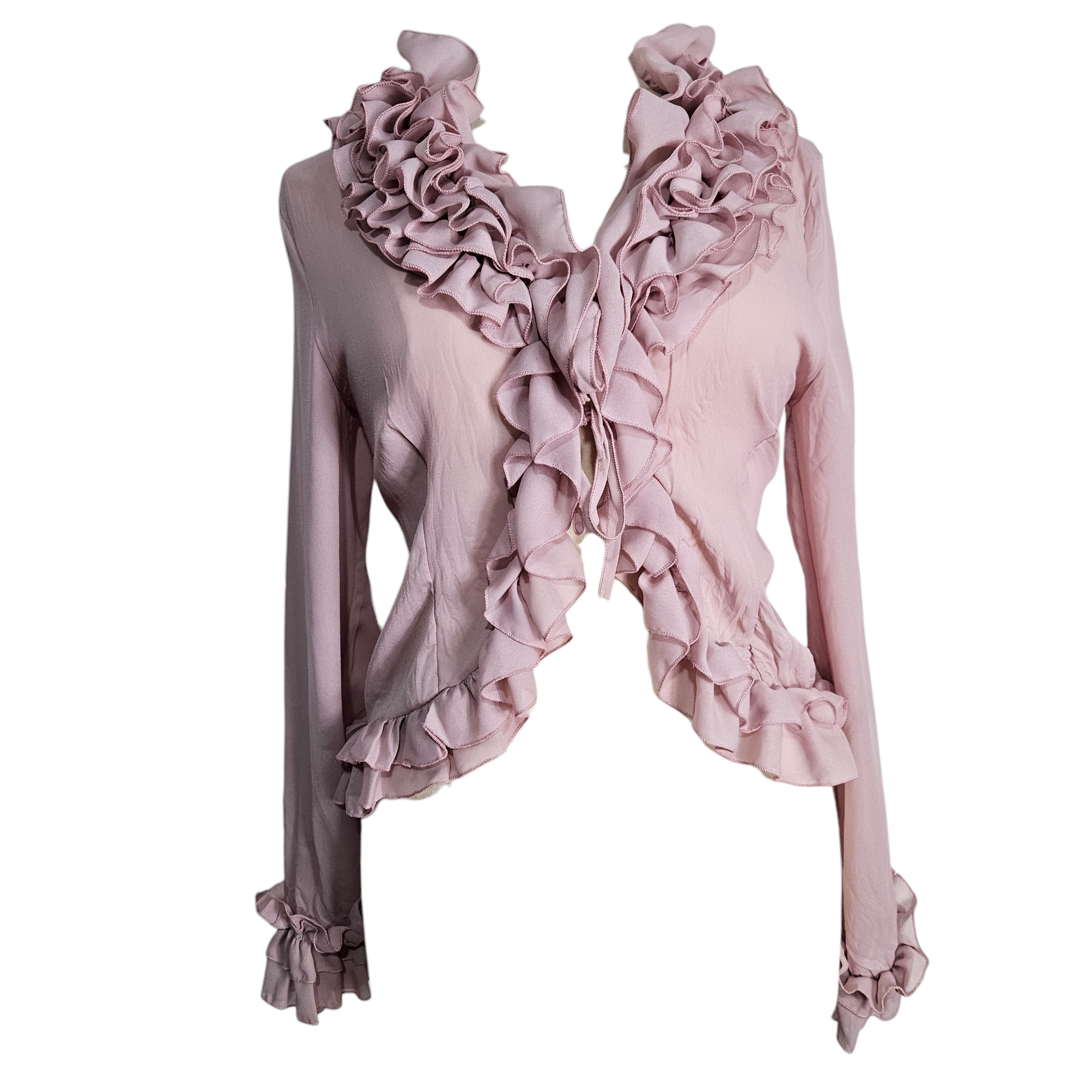 Sublime chemisier rose clair tout en voile/mesh. Avec une cascade de volants/froufrous autour du col. Les manches sont longues et également ornées de volants. Il se ferme avec des lacets à l'avant. Il n'est pas doublé et est donc transparent.