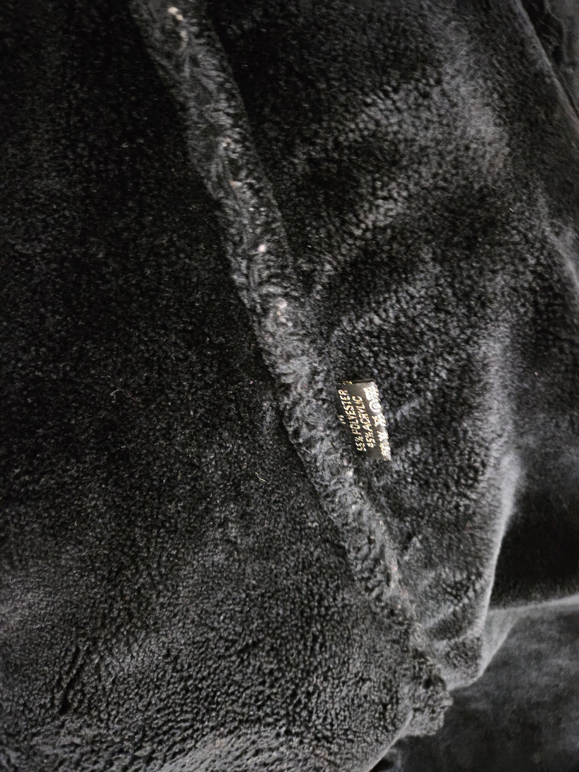 - Long manteau noir en fausse peau retournée et fausse fourrure