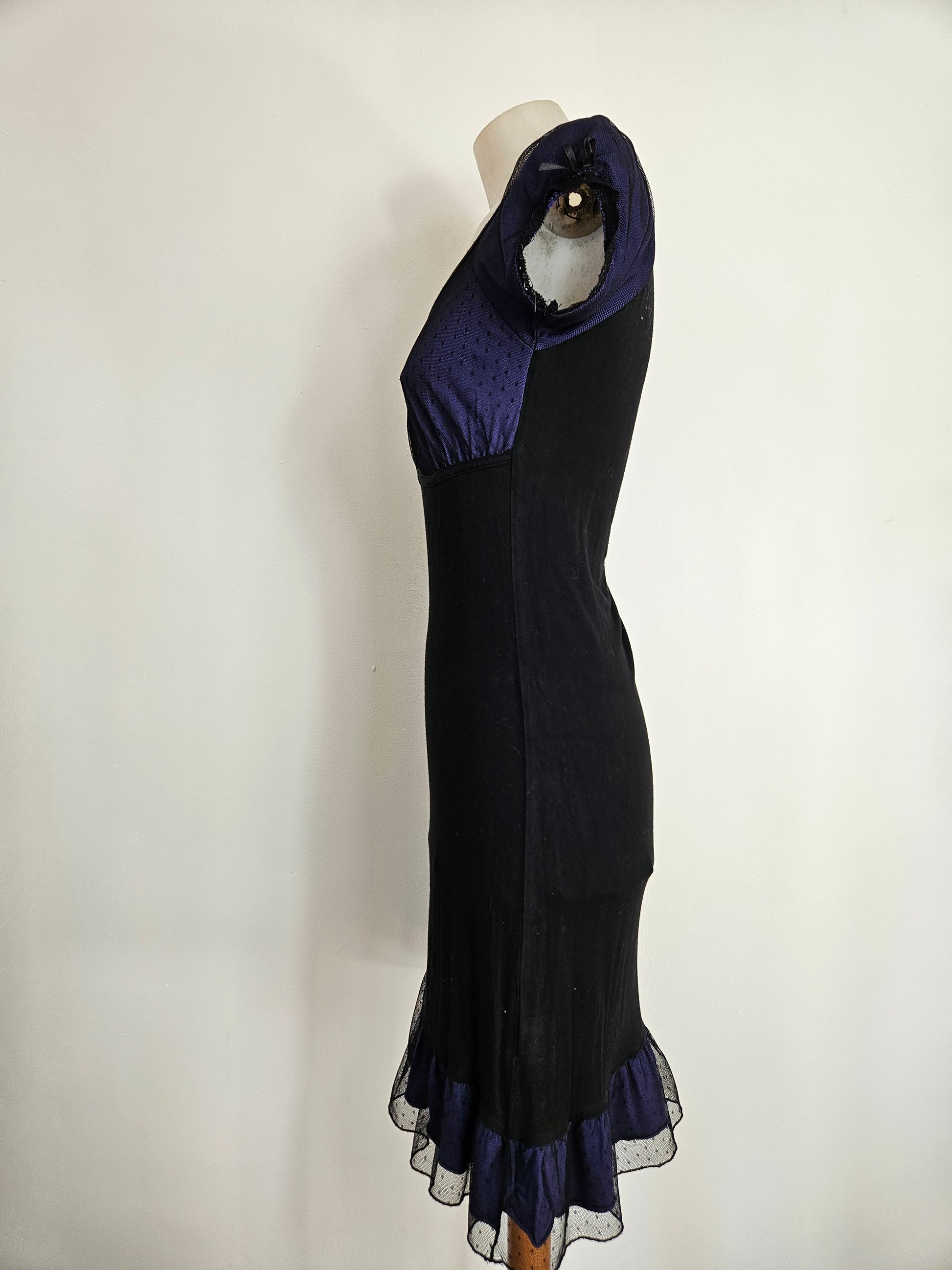 - Partie jupe noire extensible, coupe moulante aux hanches puis légèrement fluide