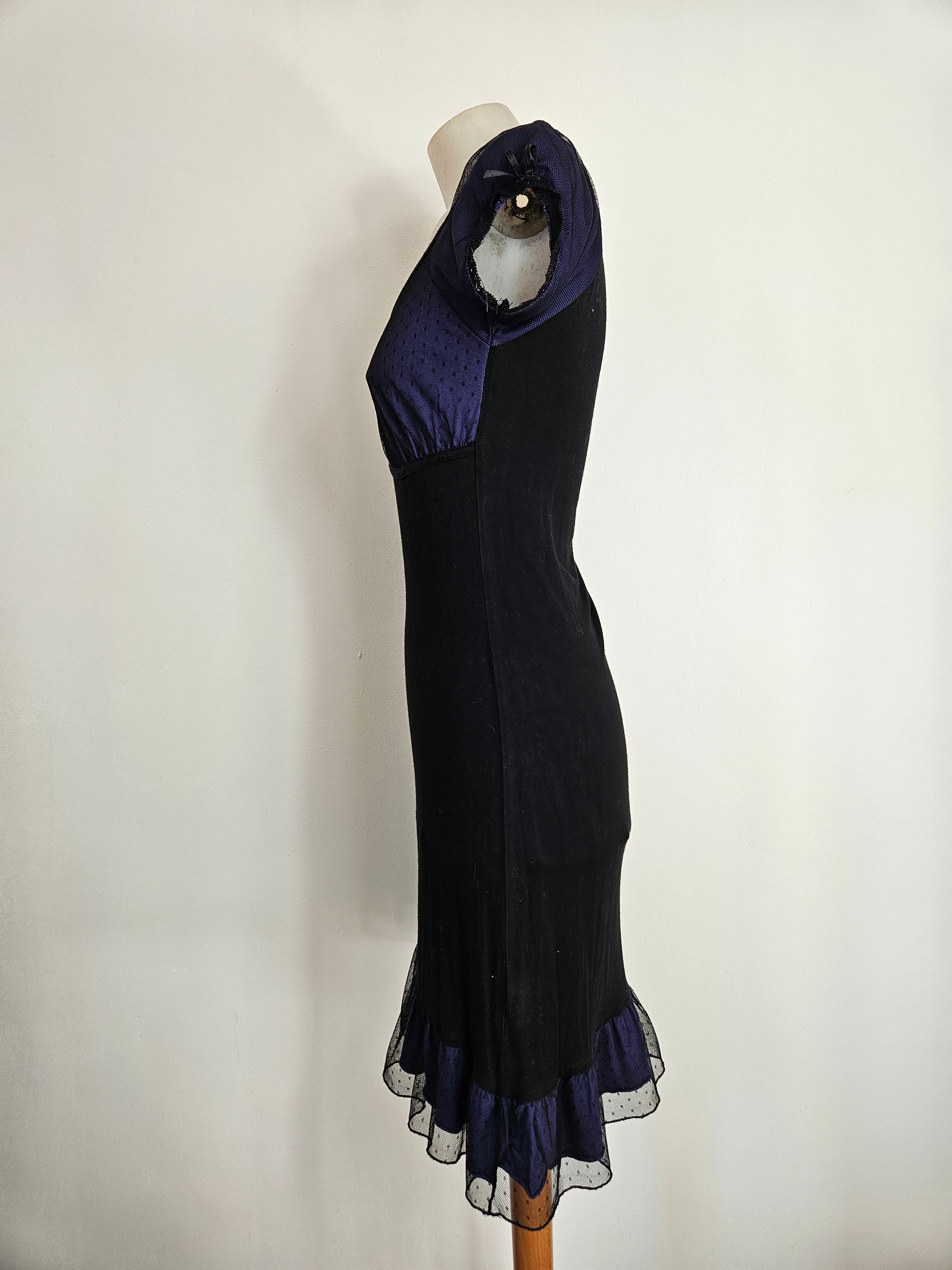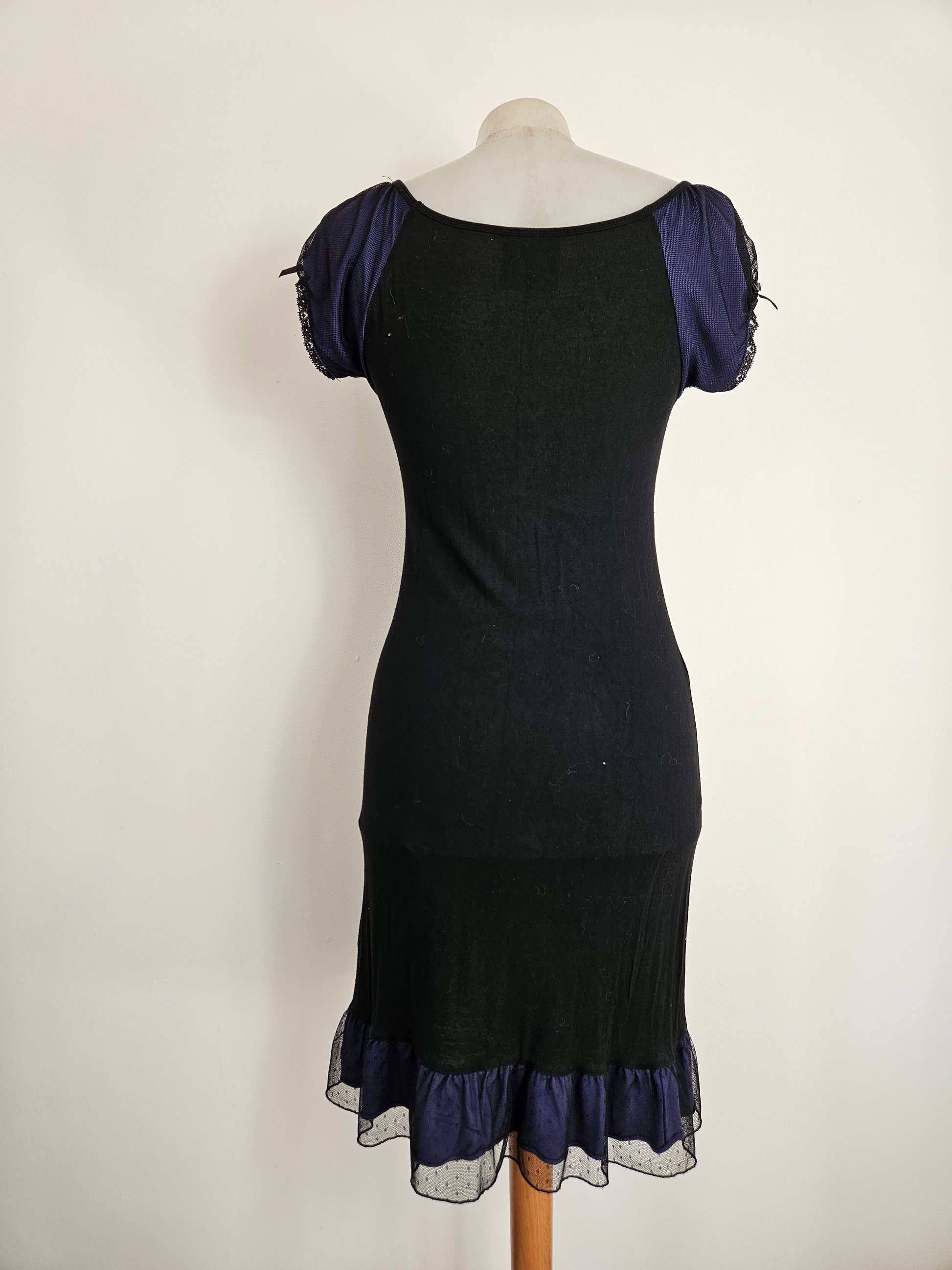 - Haut violet satiné avec petits pois en voile, manches courtes bouffantes et nœuds satinés
