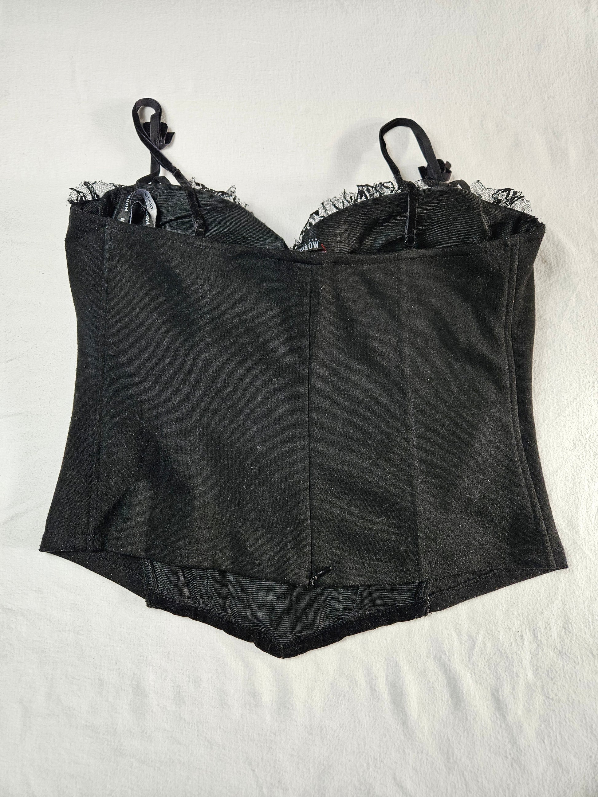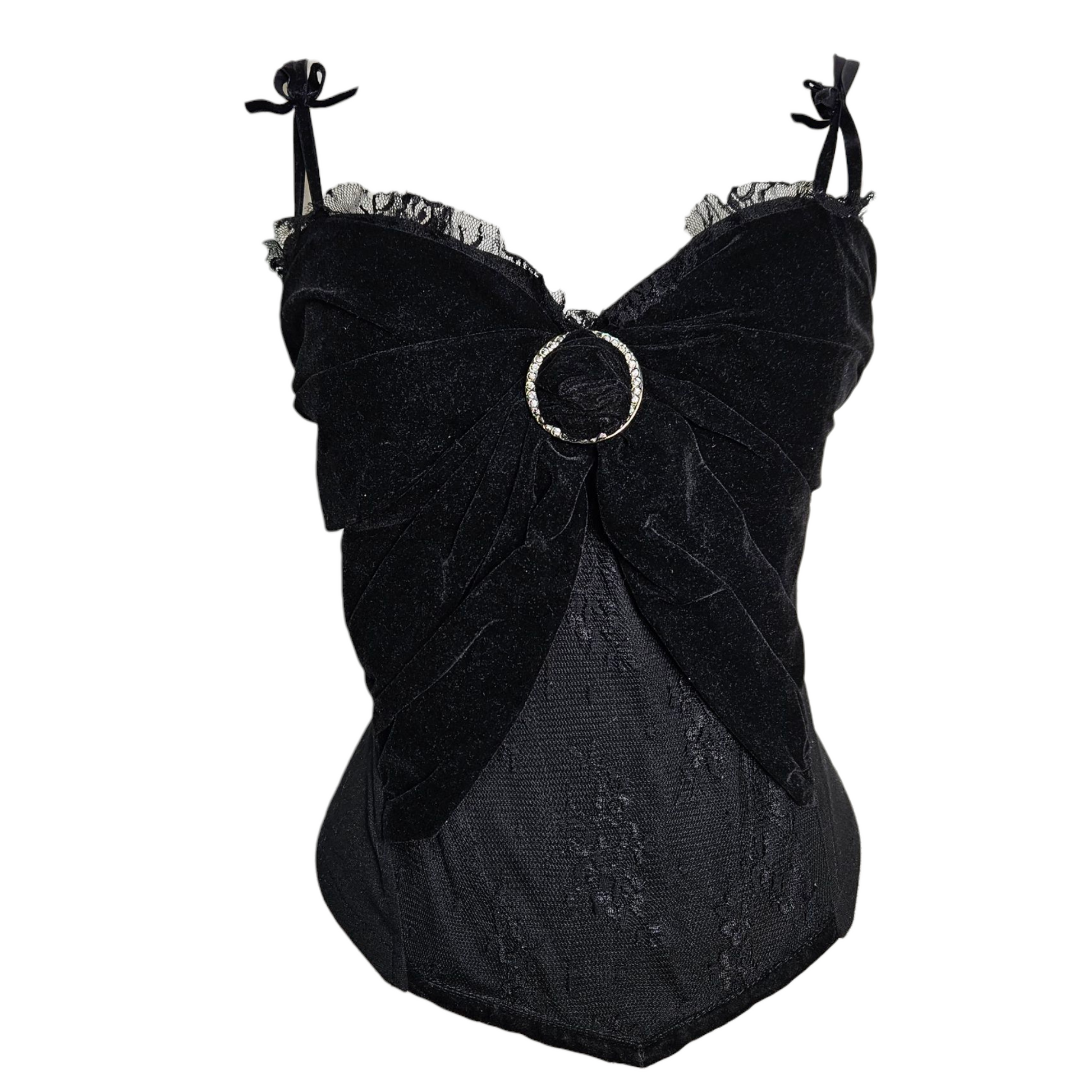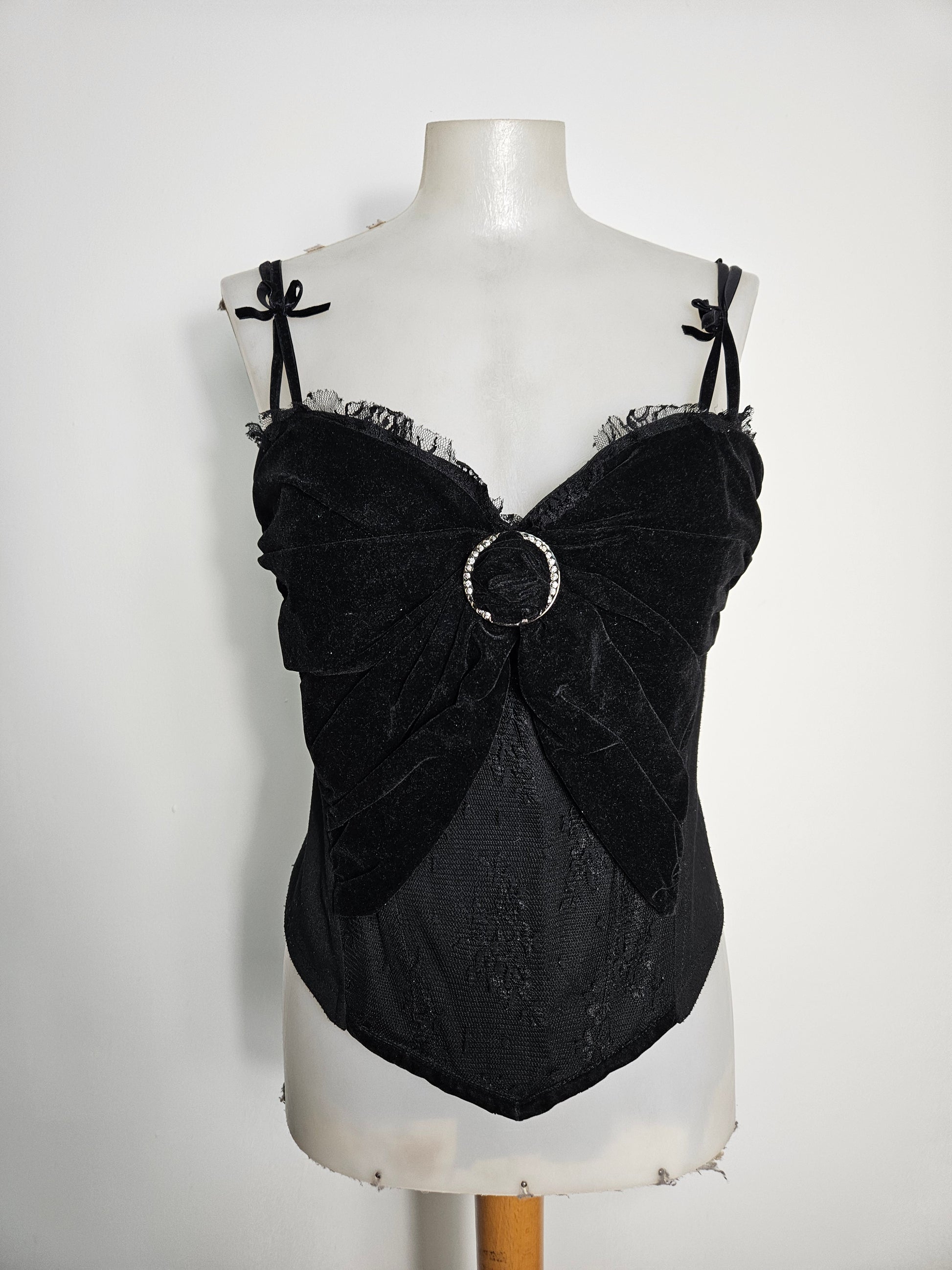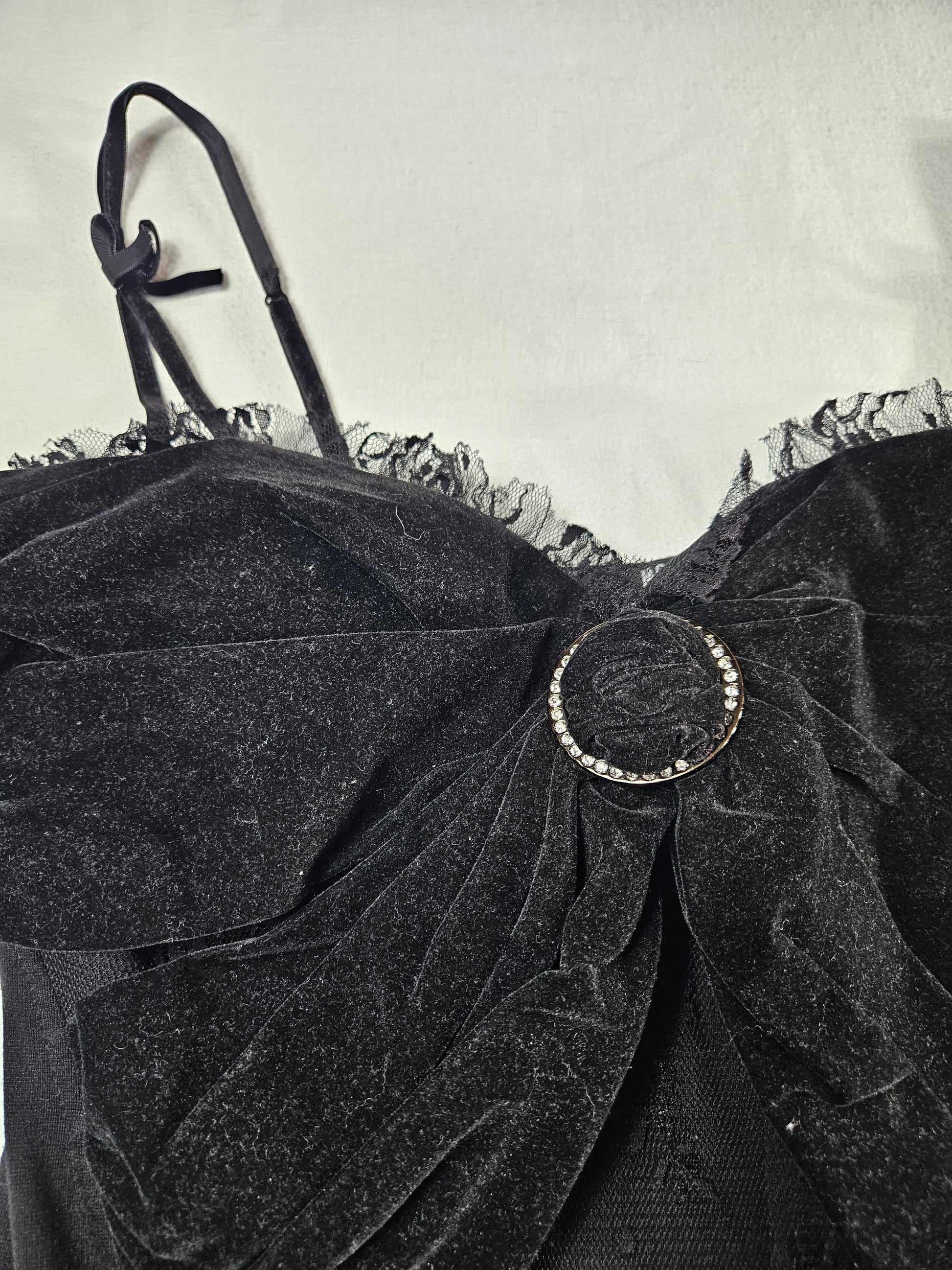 - Grand nœud en velours au centre avec une boucle décorative en strass argenté