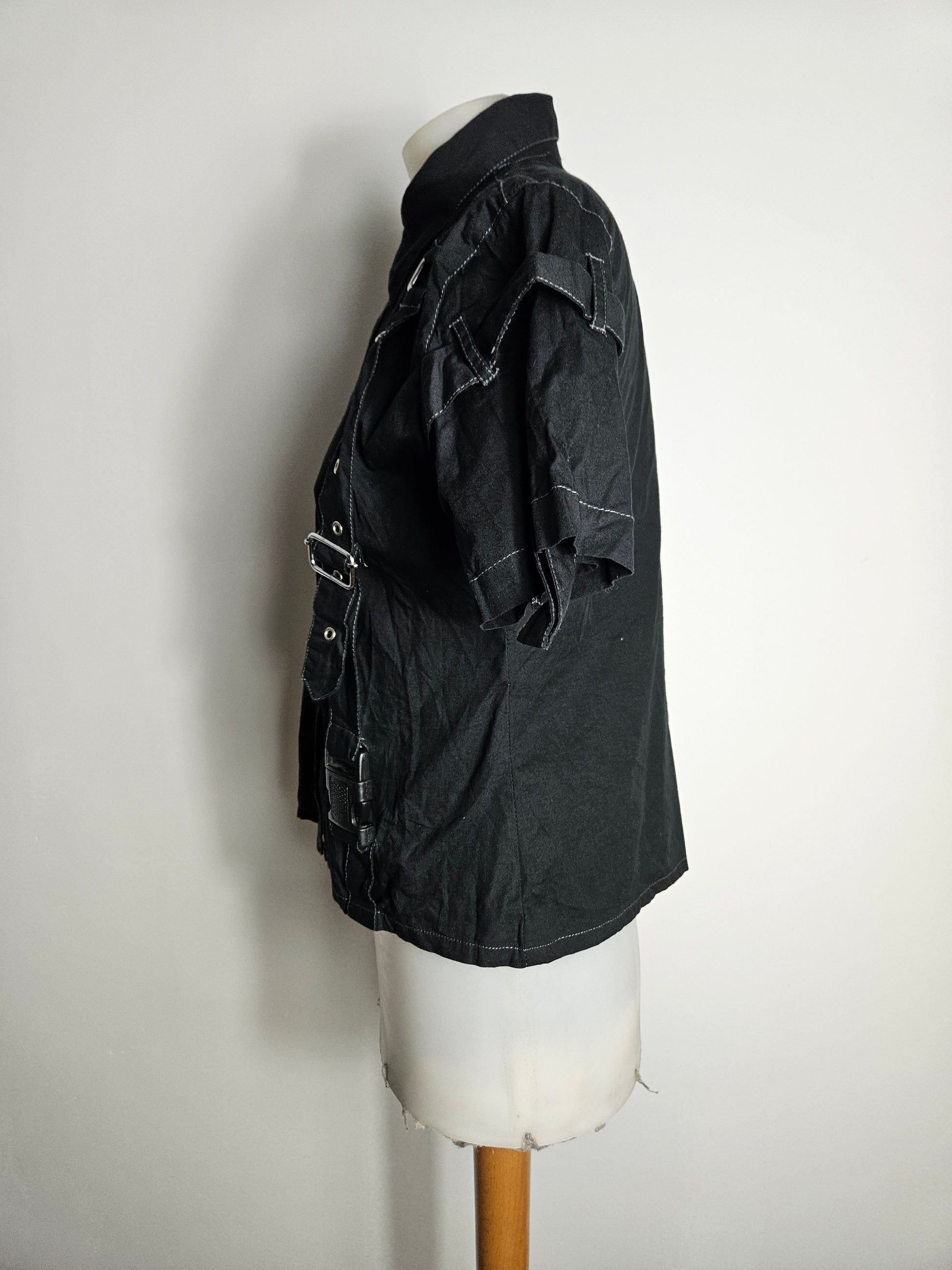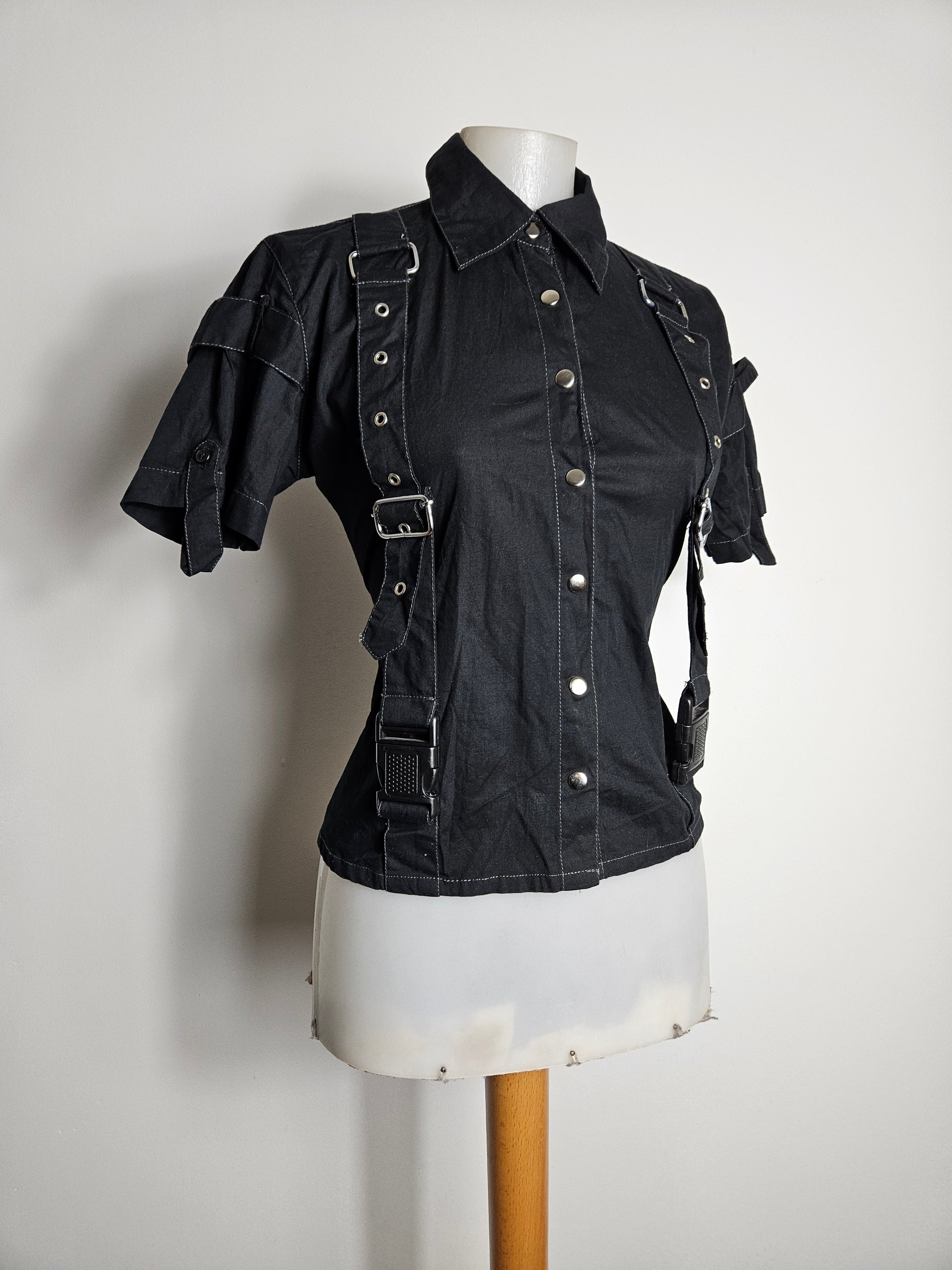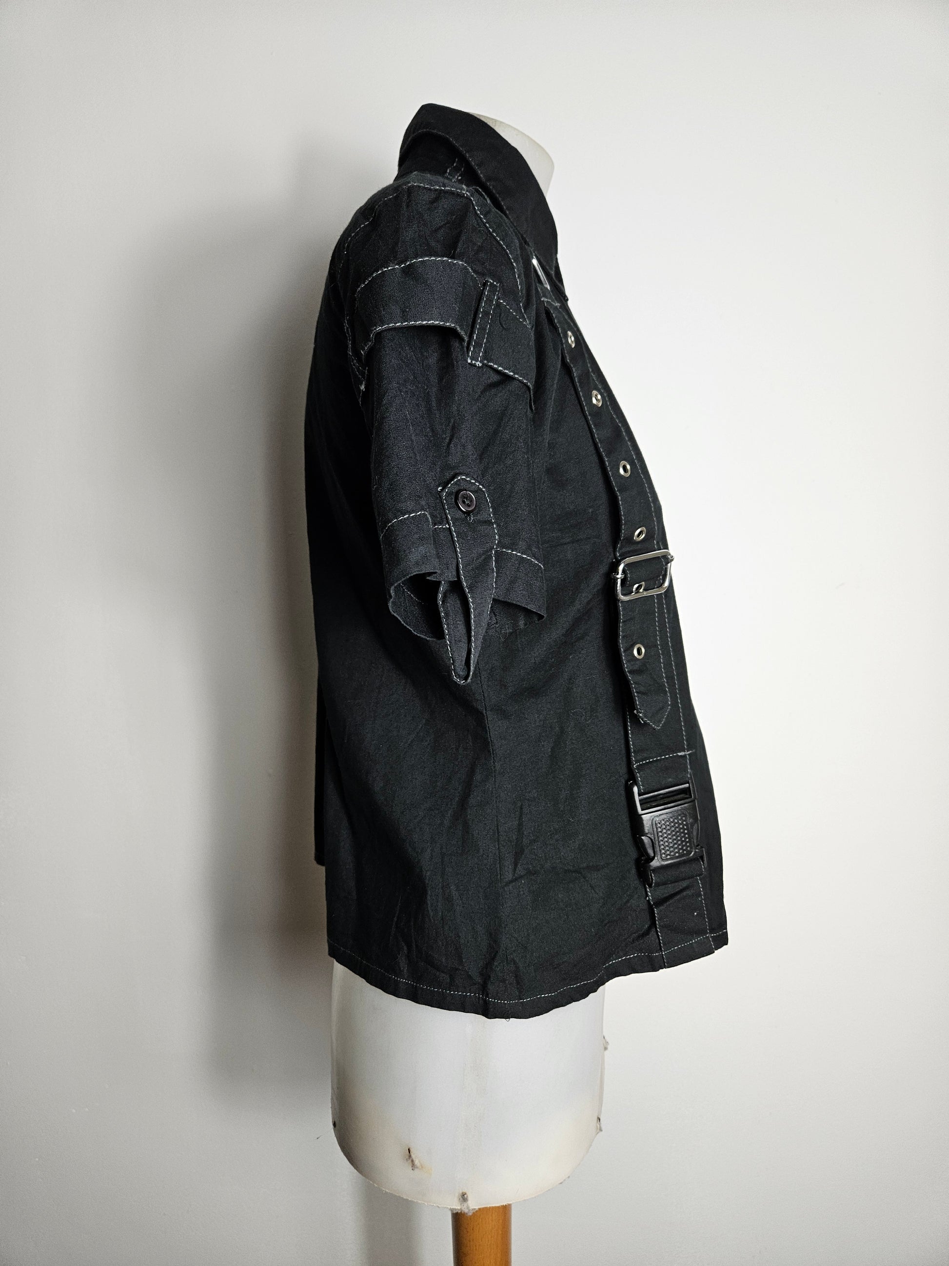 - Chemise noire à manches courtes avec sangles et détails utilitaires.