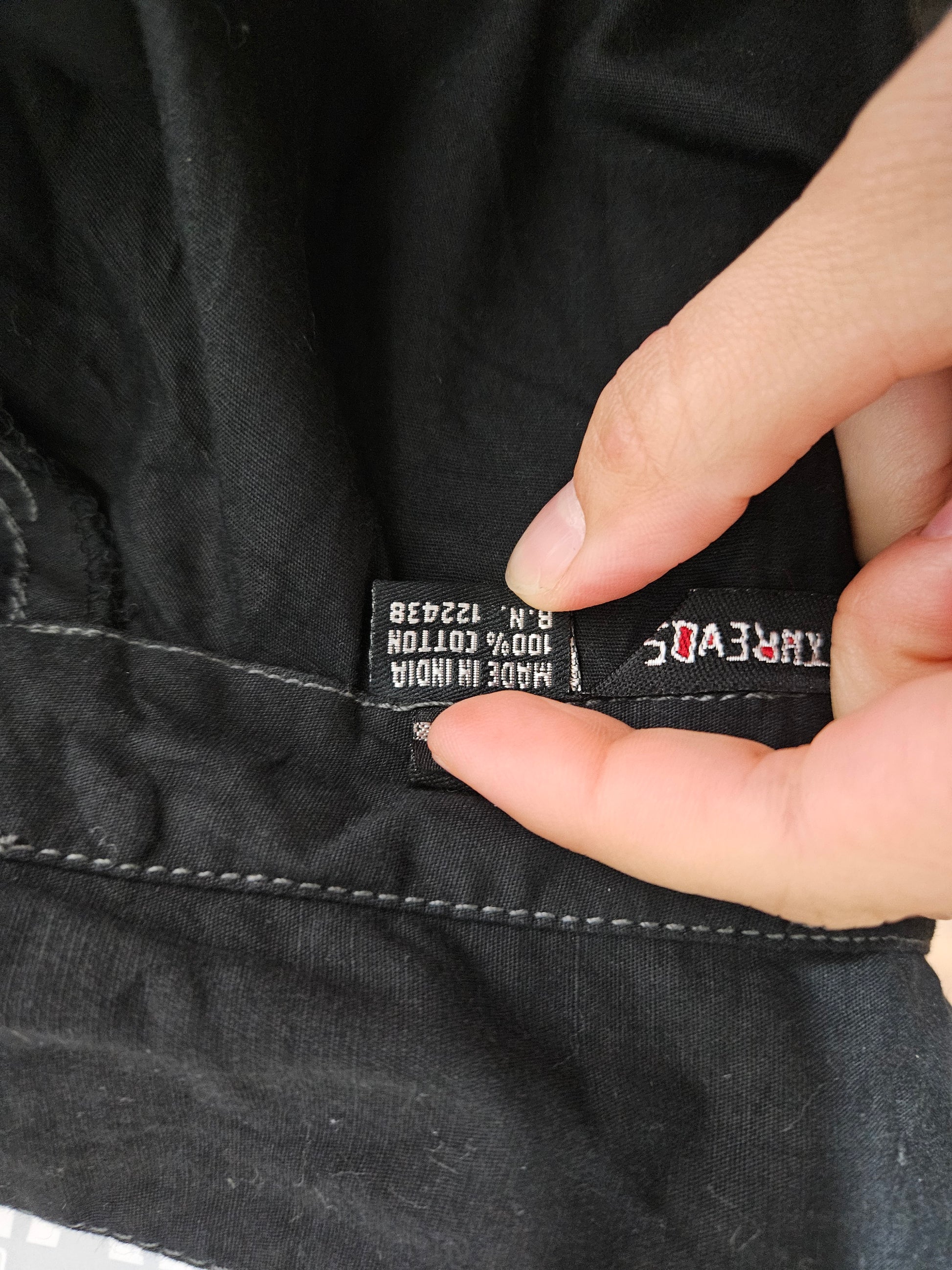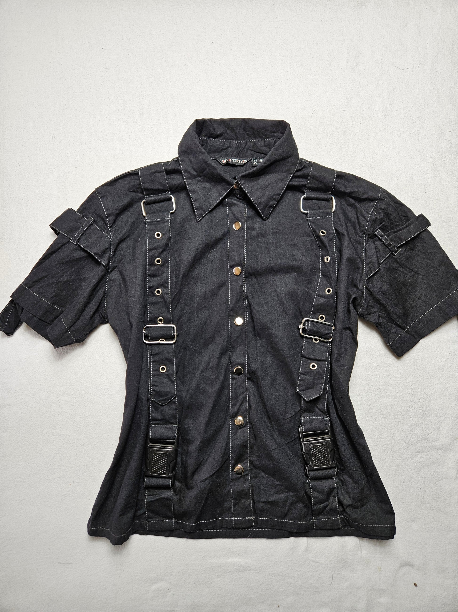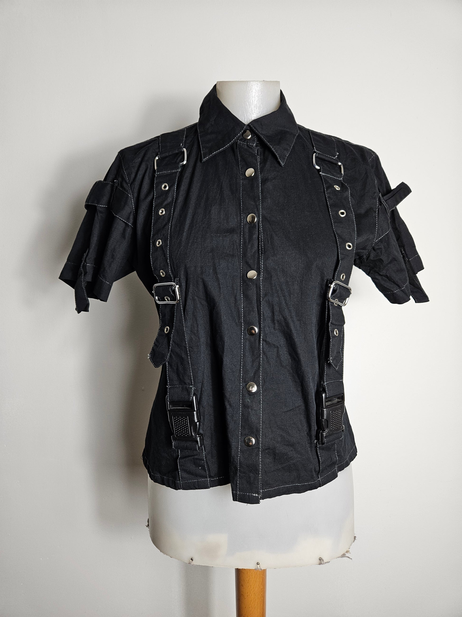 - Chemise noire à manches courtes avec sangles et détails utilitaires.
