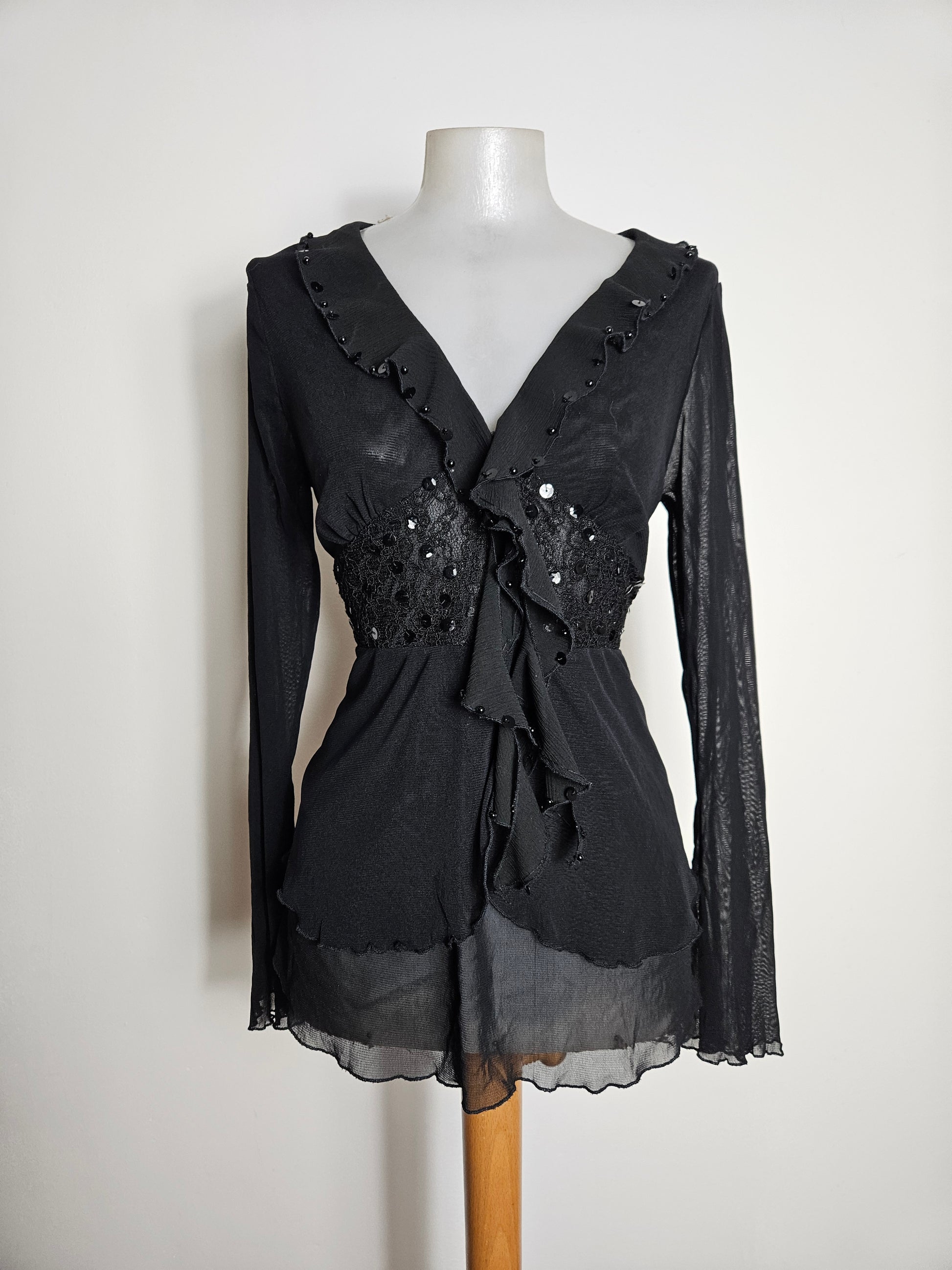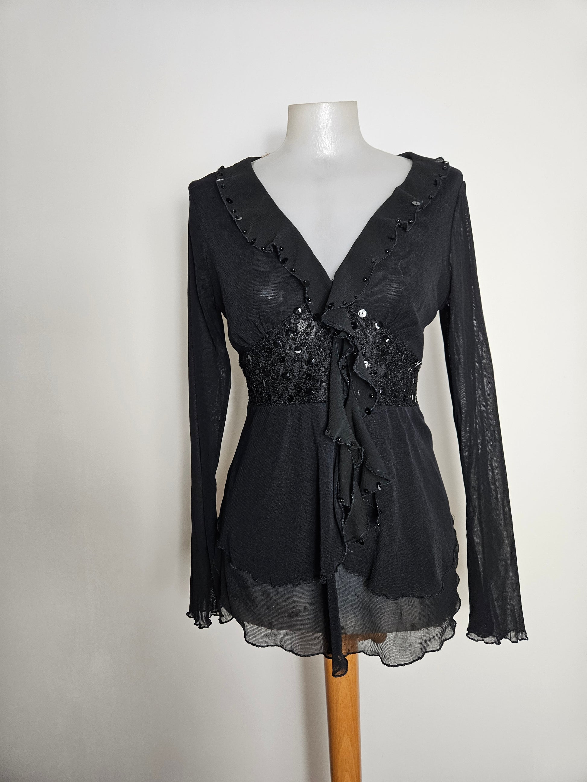 Top noir semi-transparent à manches longues. Encolure en V avec volants sur le devant. Détails de petites perles et sequins noirs le long de l’encolure et sur le buste. Bande de dentelle noire à la taille. Coupe cintrée avec ourlet légèrement évasé. Tissu fluide et léger.