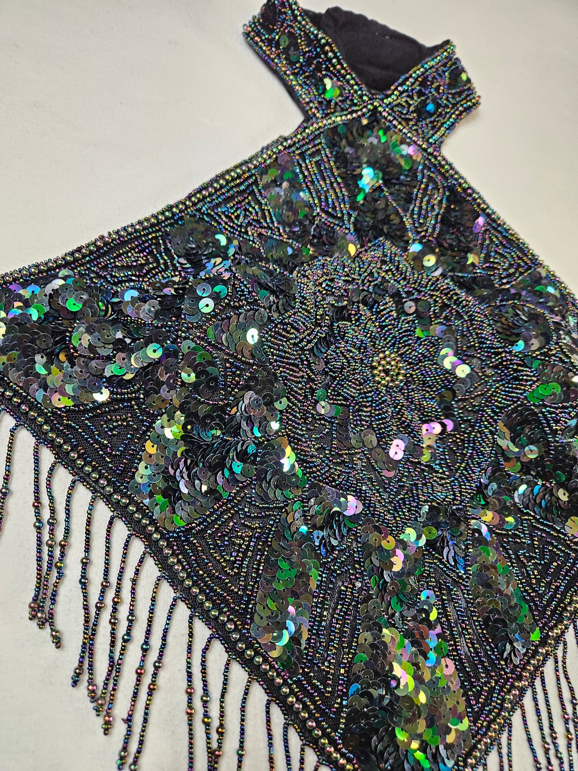 - Les sequins sont noirs avec des reflets multicolores à dominance de vert.