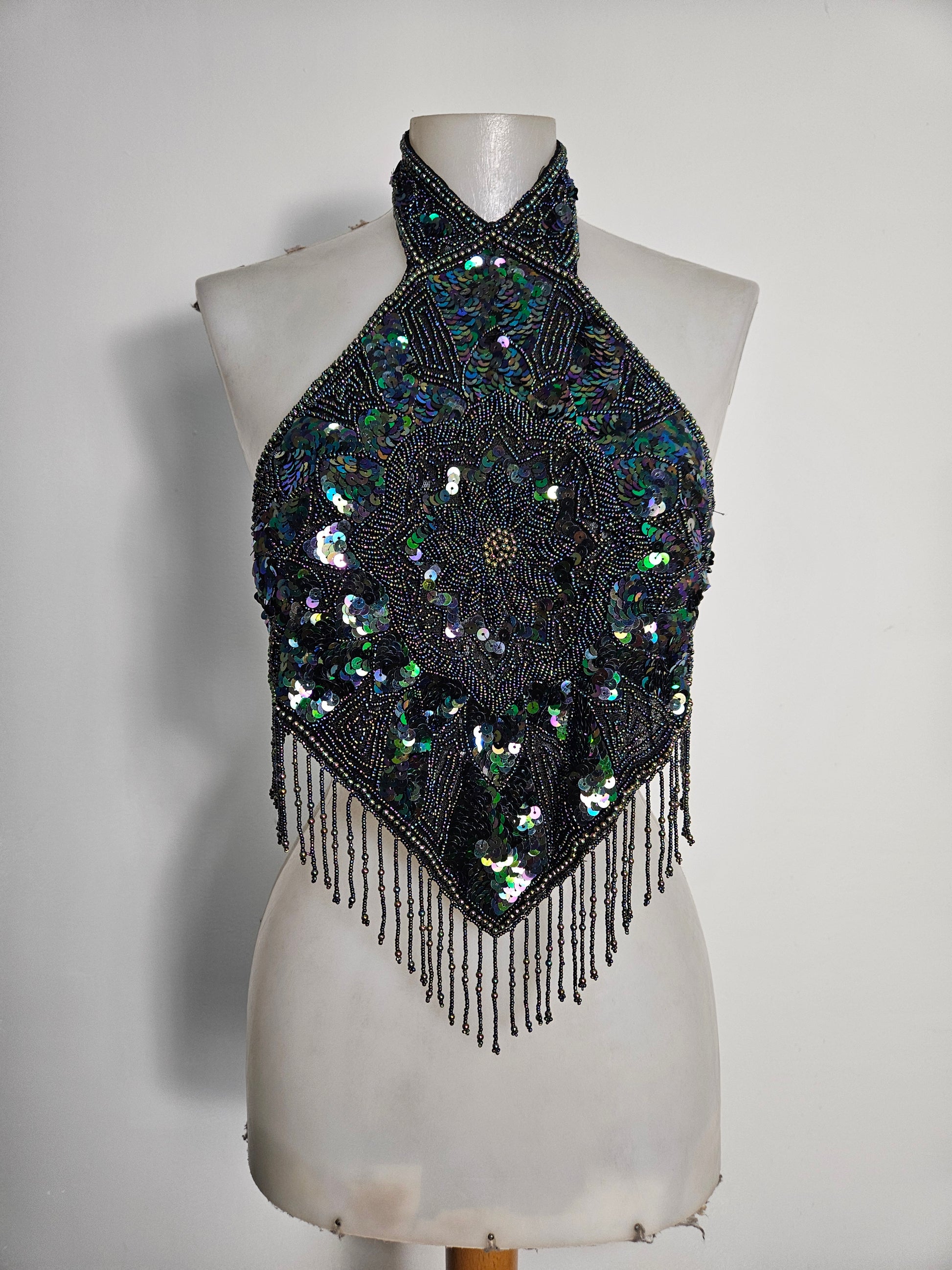 - Haut en voile brodé de perles et sequins en motifs d'arabesques.
