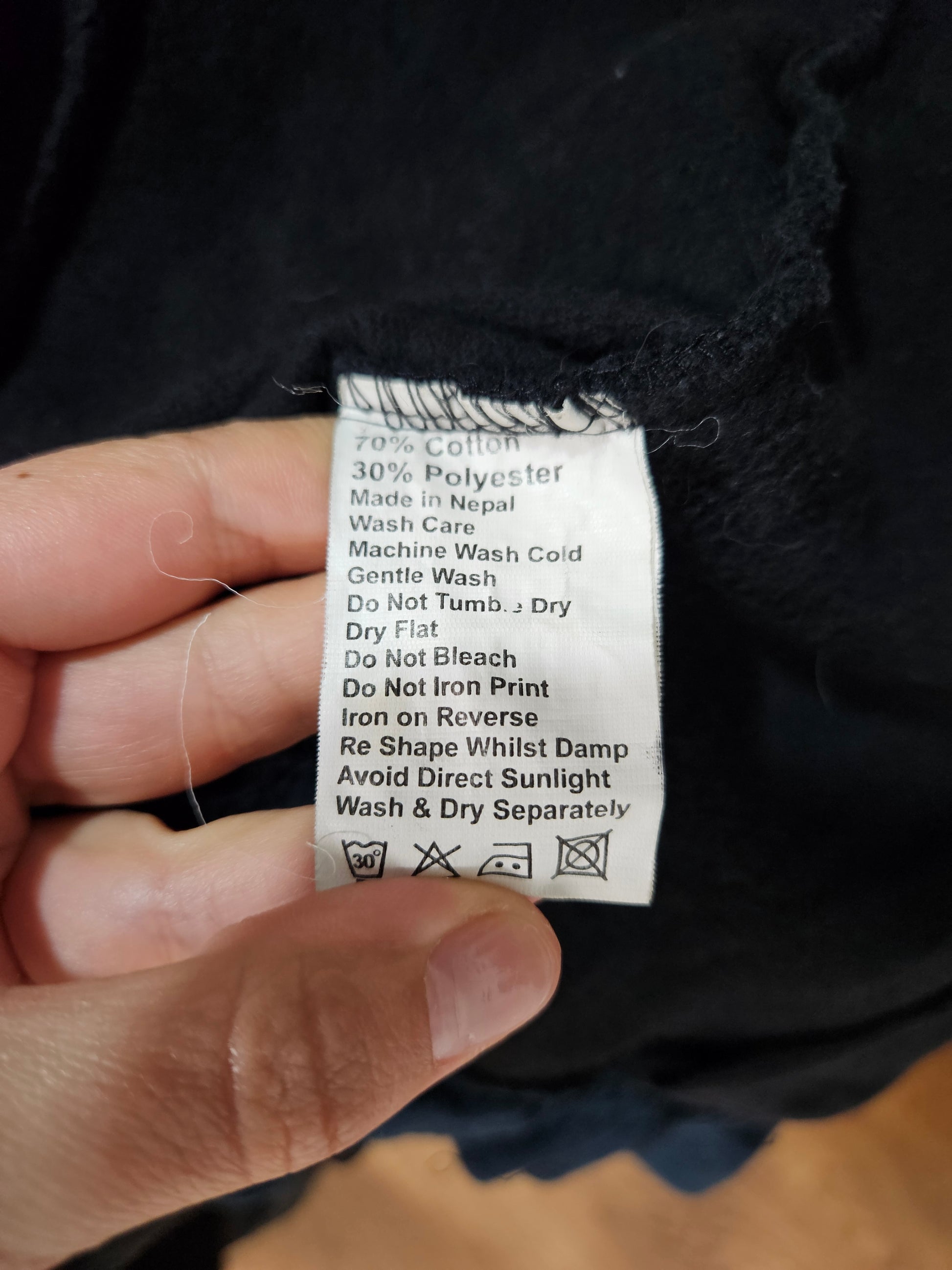 Entretien : Lavage à froid en machine, cycle délicat, séchage à plat, repassage doux à l’envers.