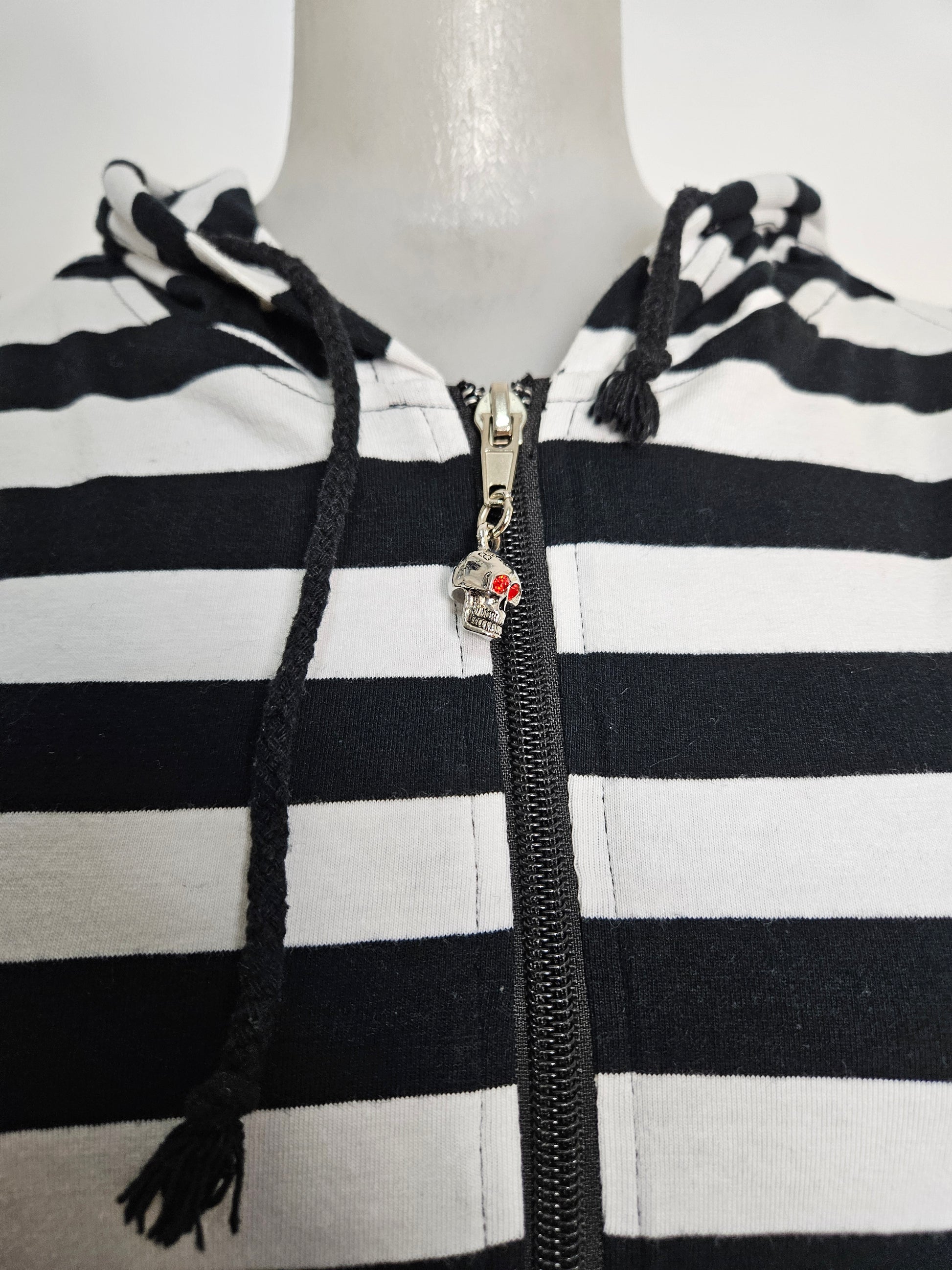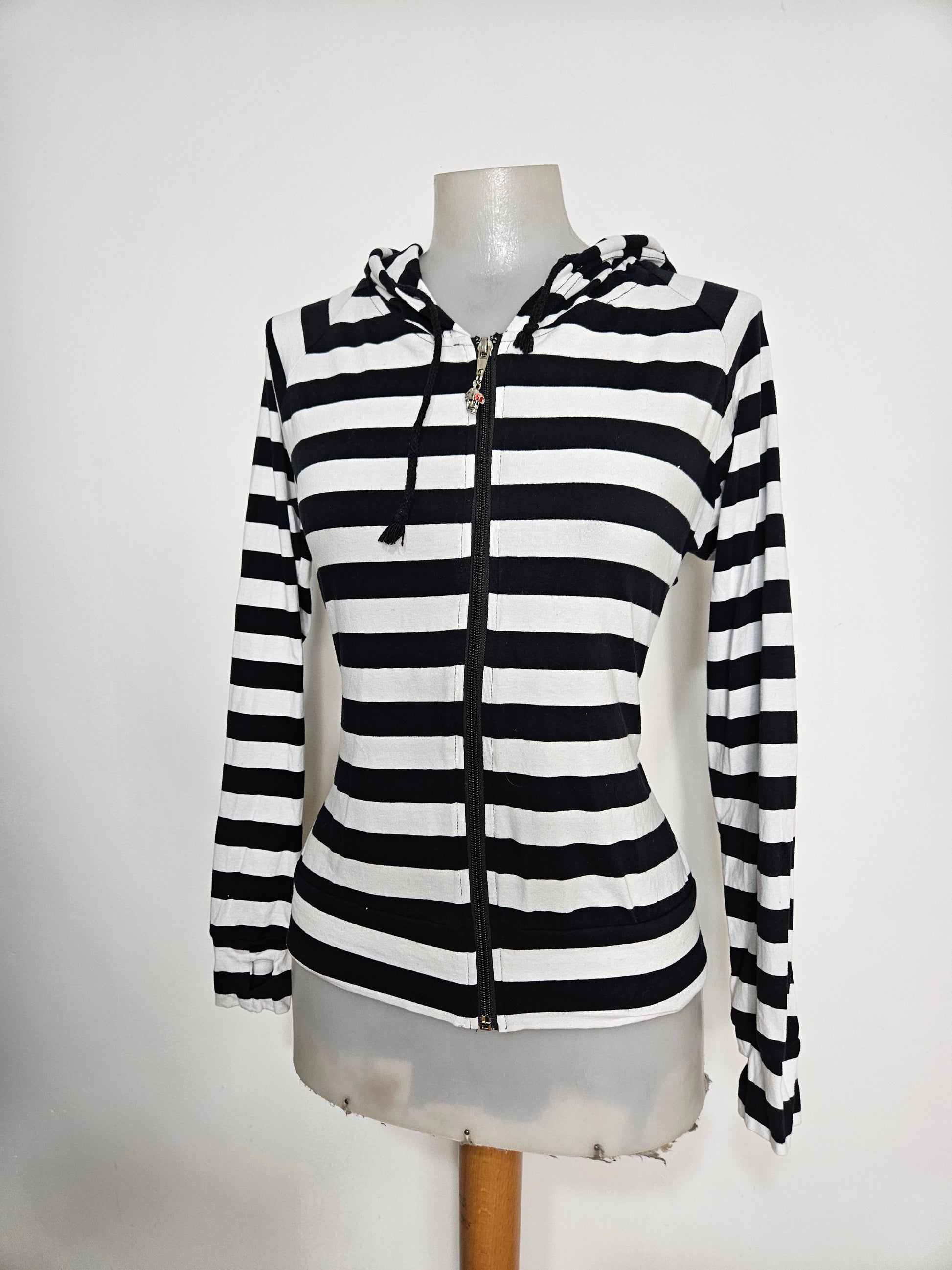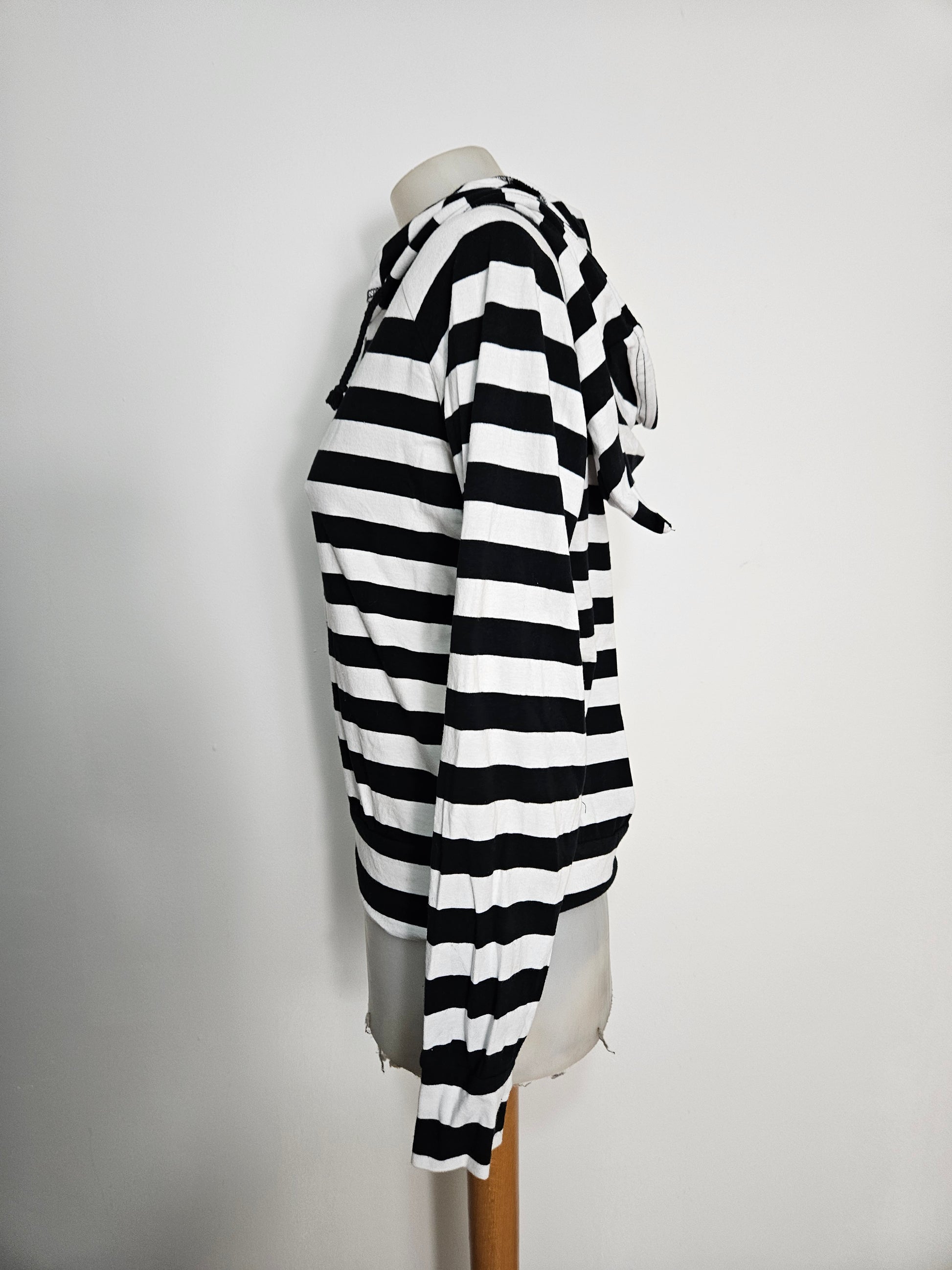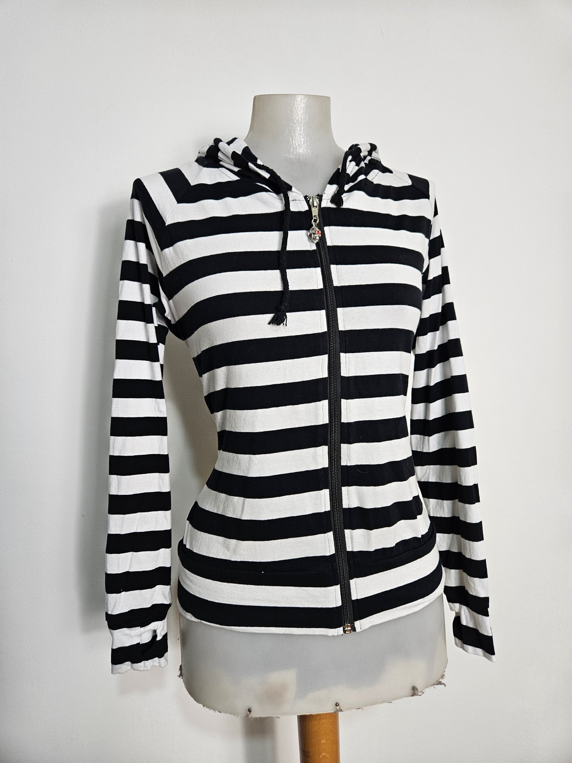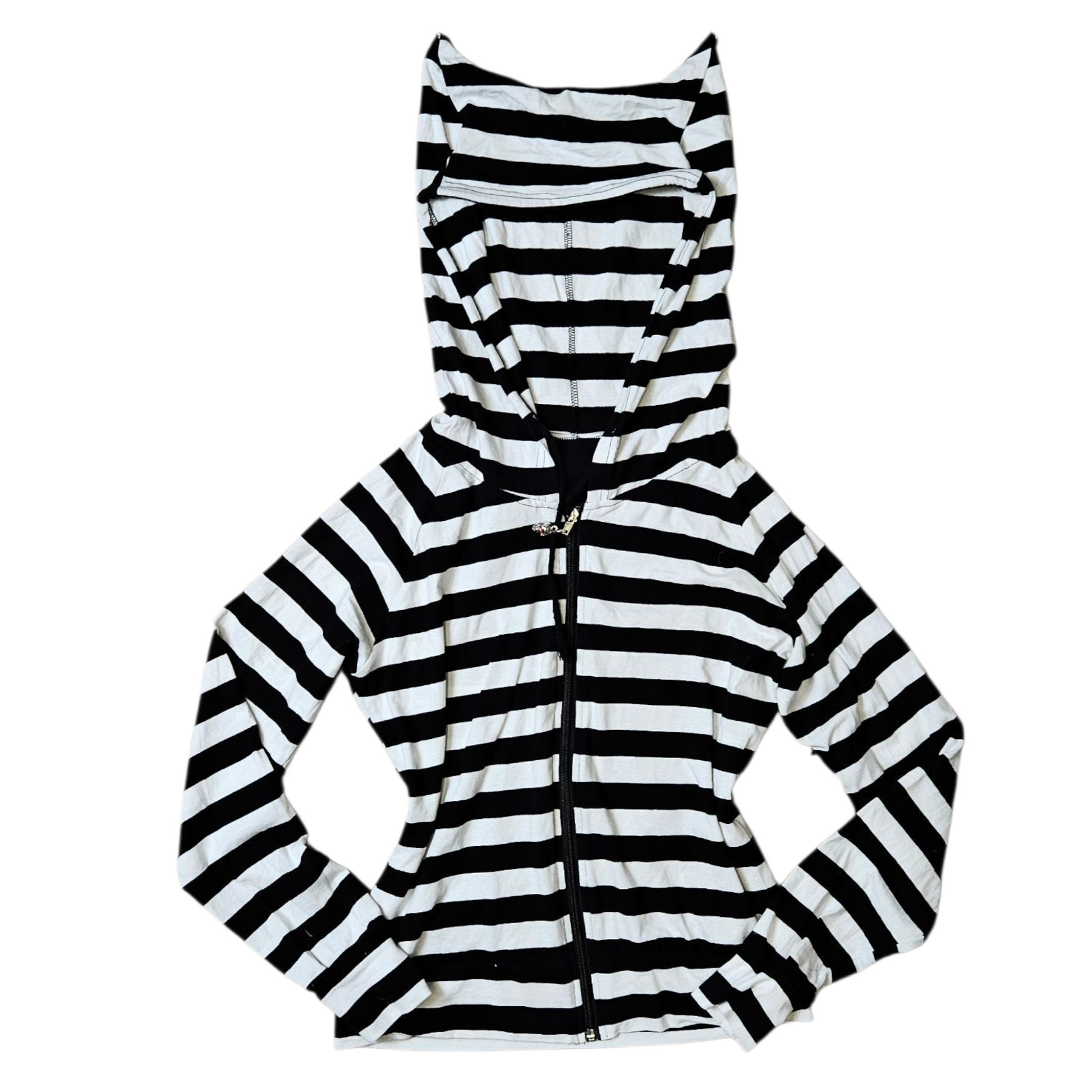 - Gilet rayé noir et rblanc à capuche, modèle iconique des années 2000.