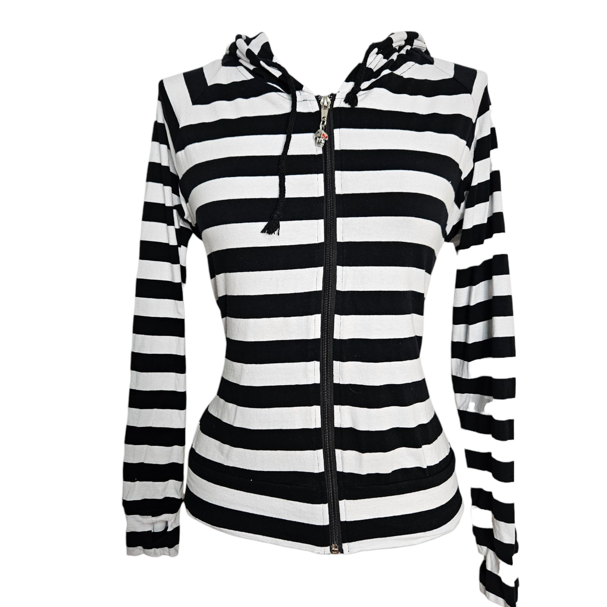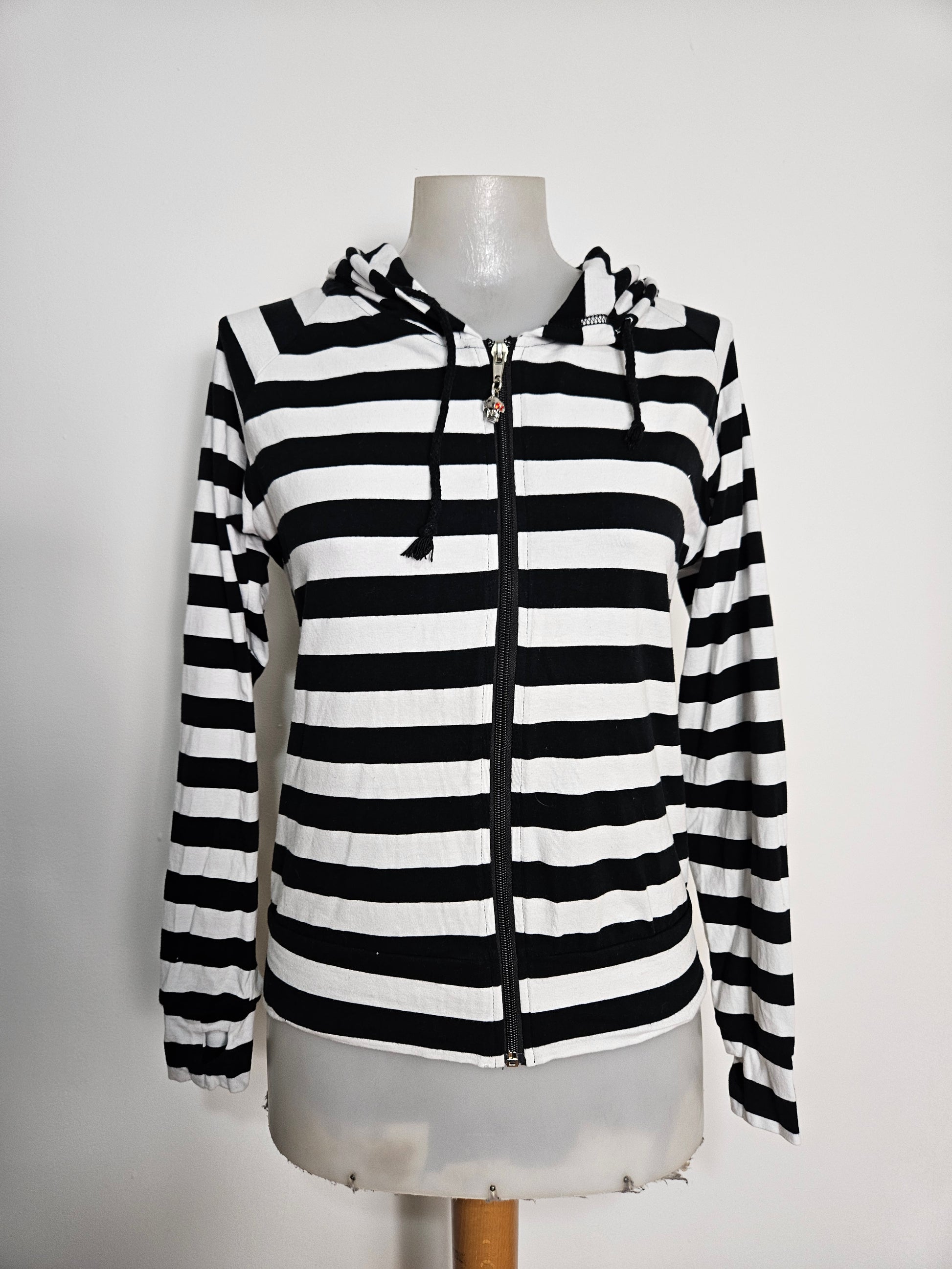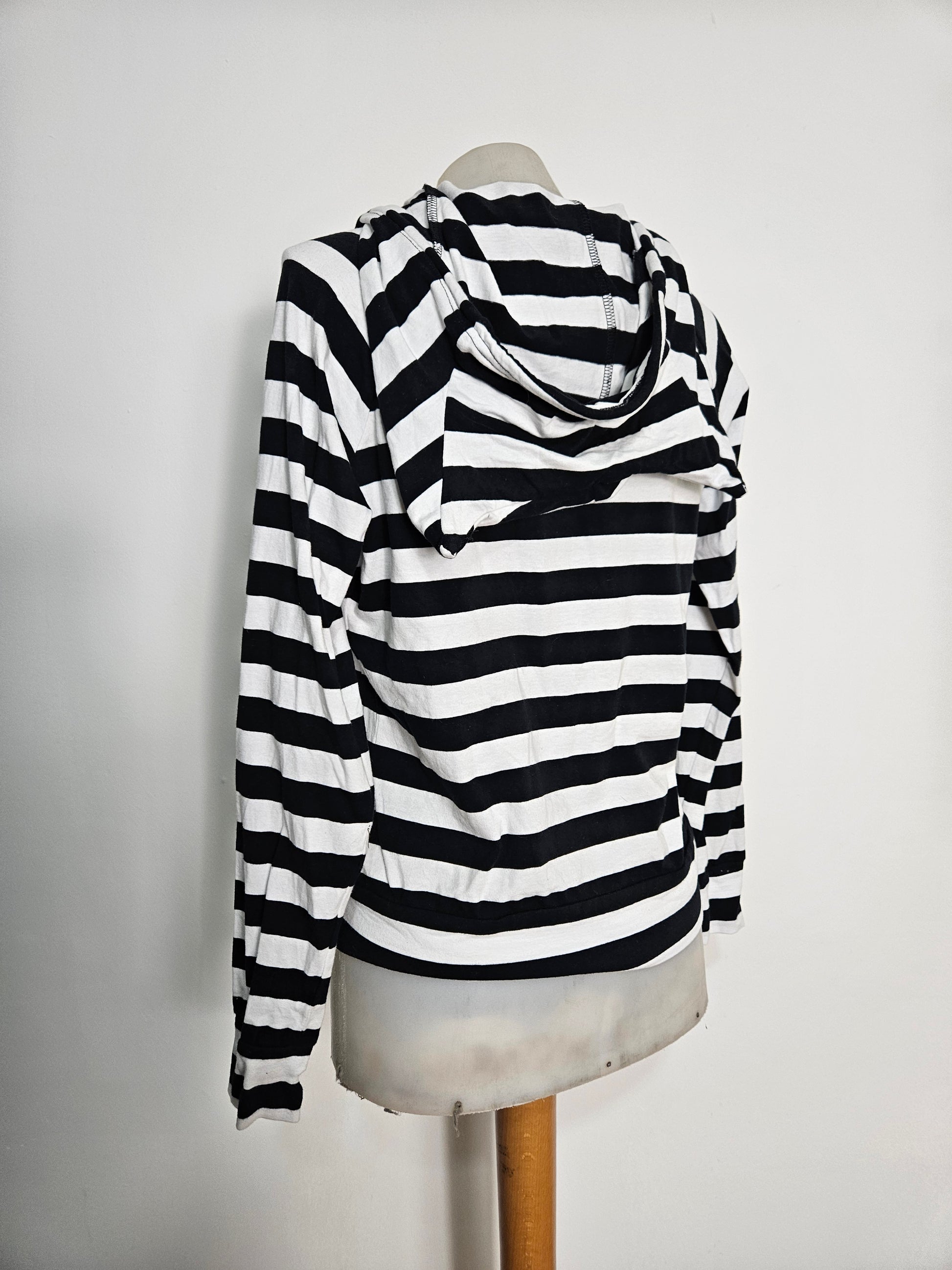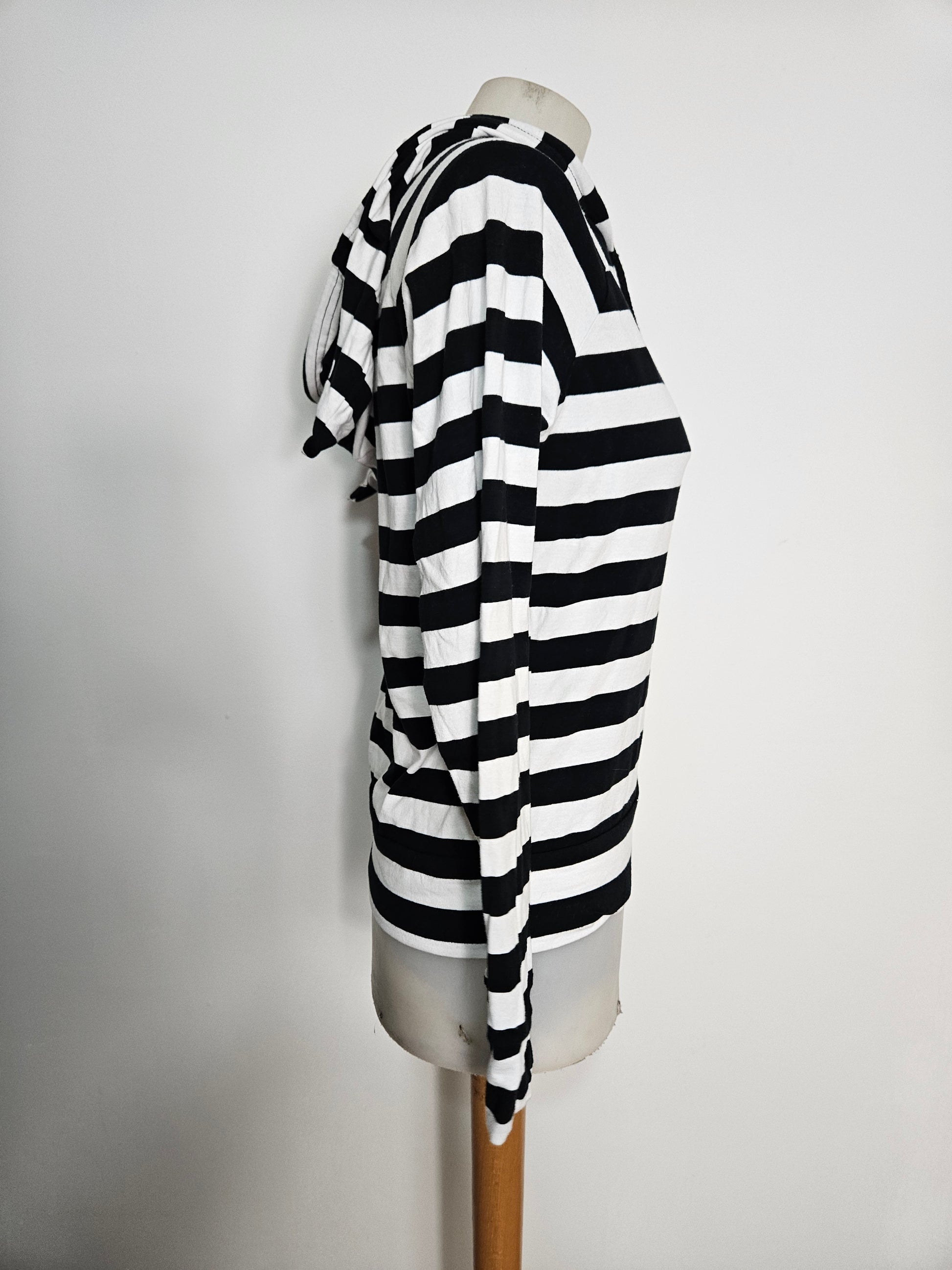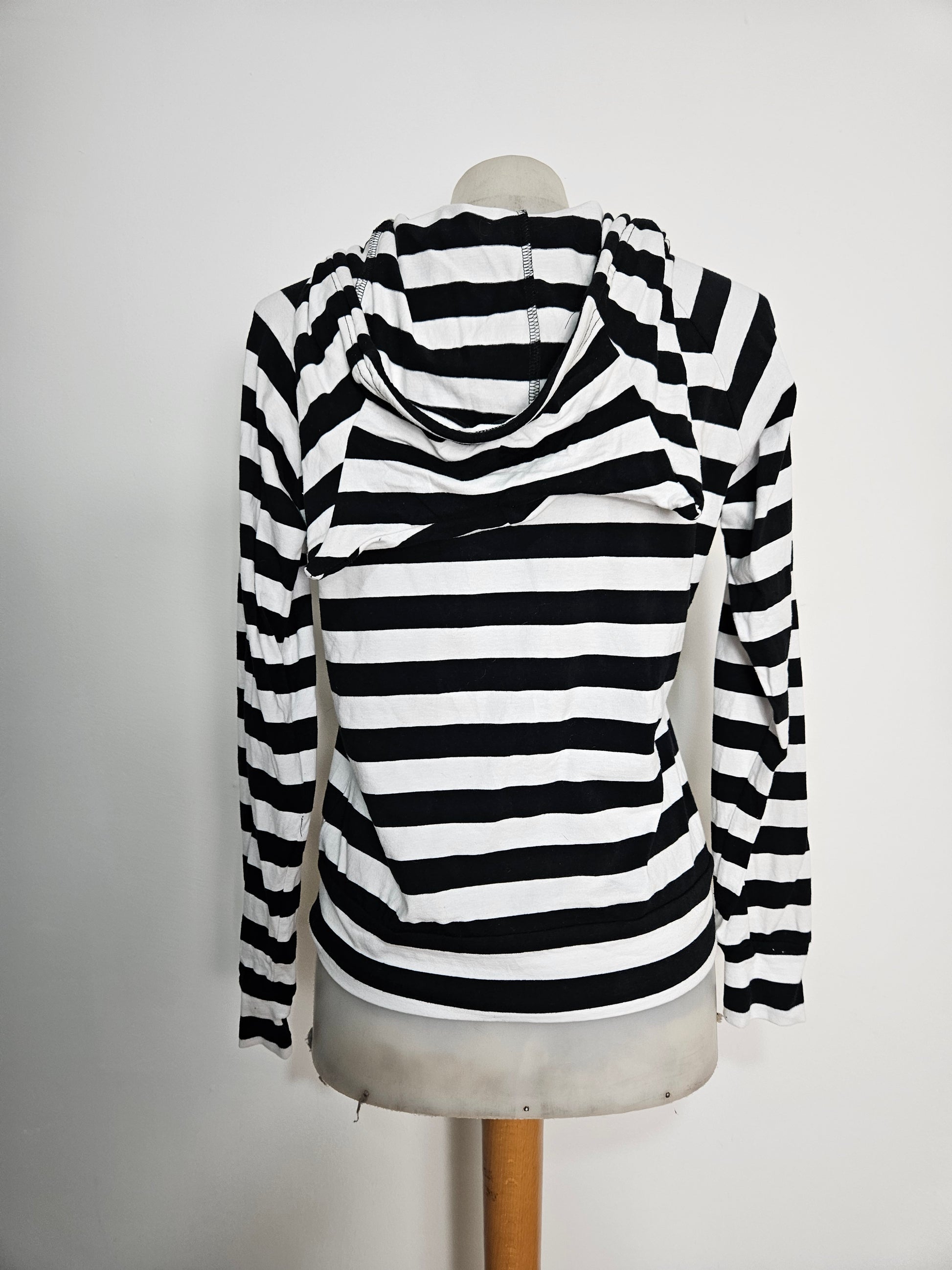 - Gilet rayé noir et rblanc à capuche, modèle iconique des années 2000.
