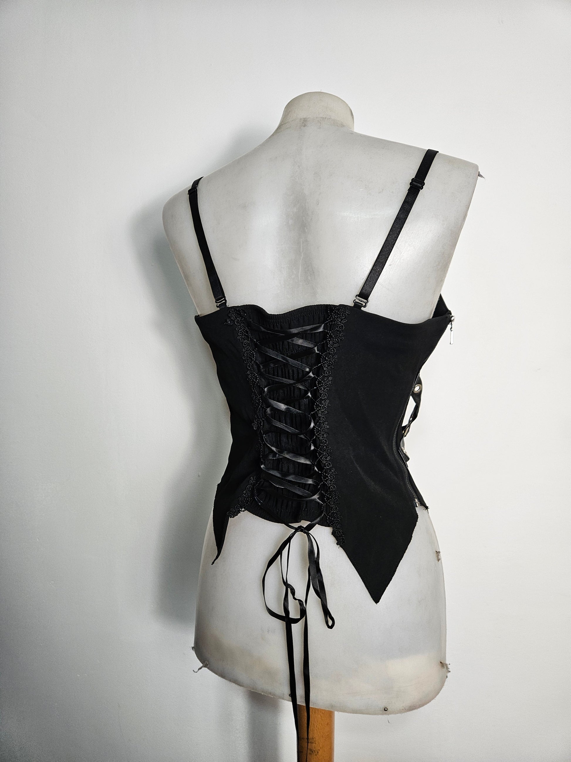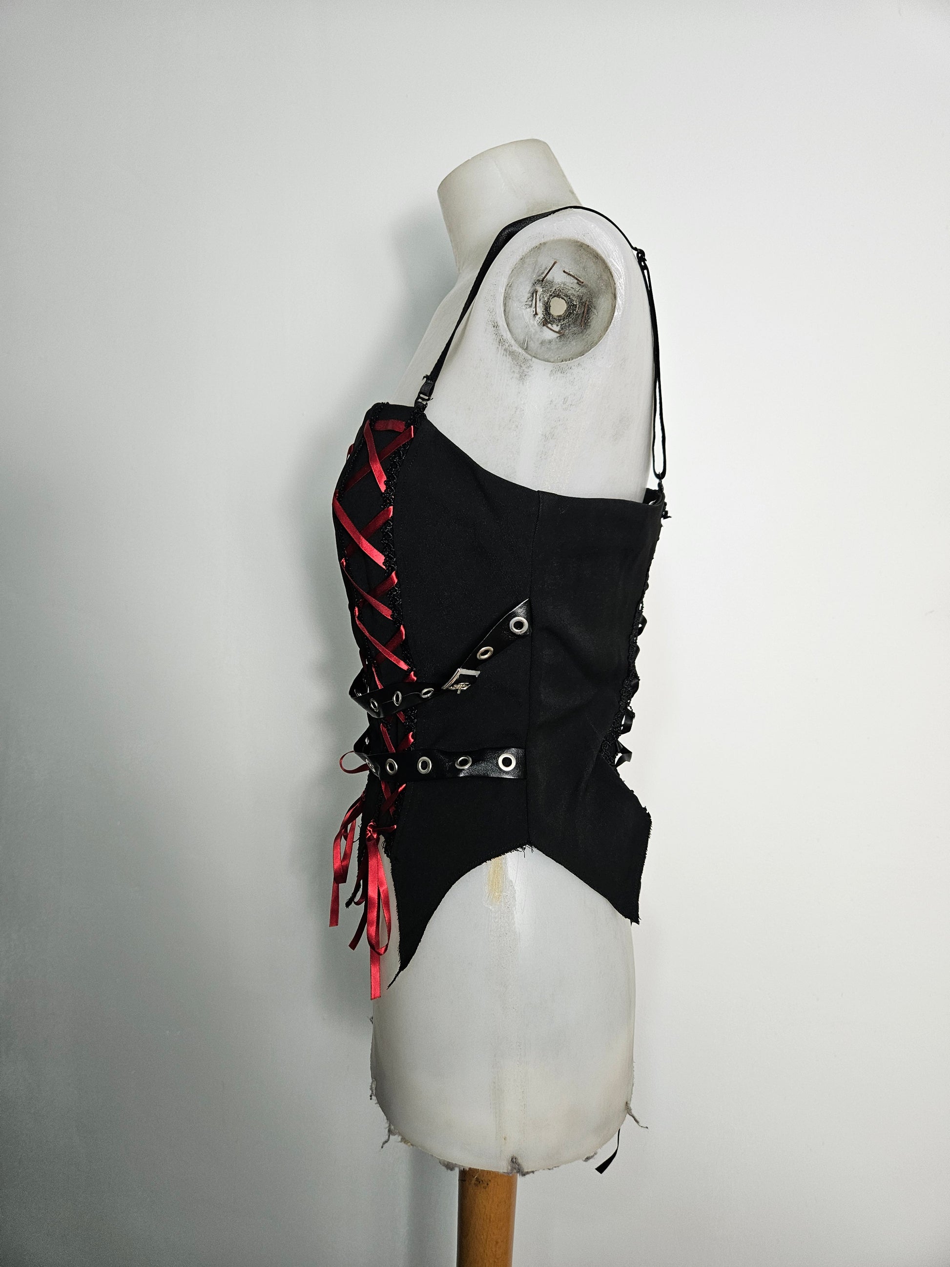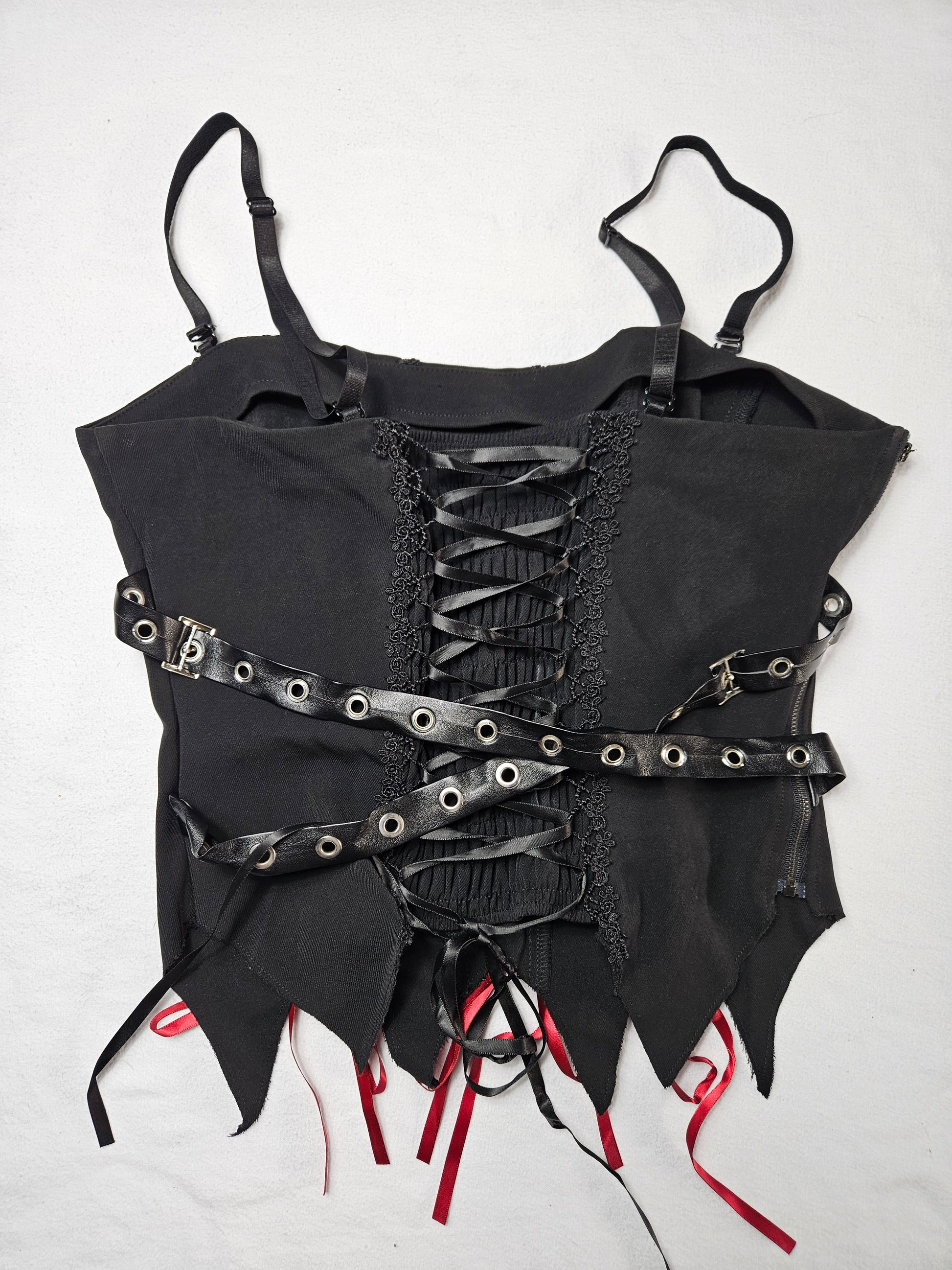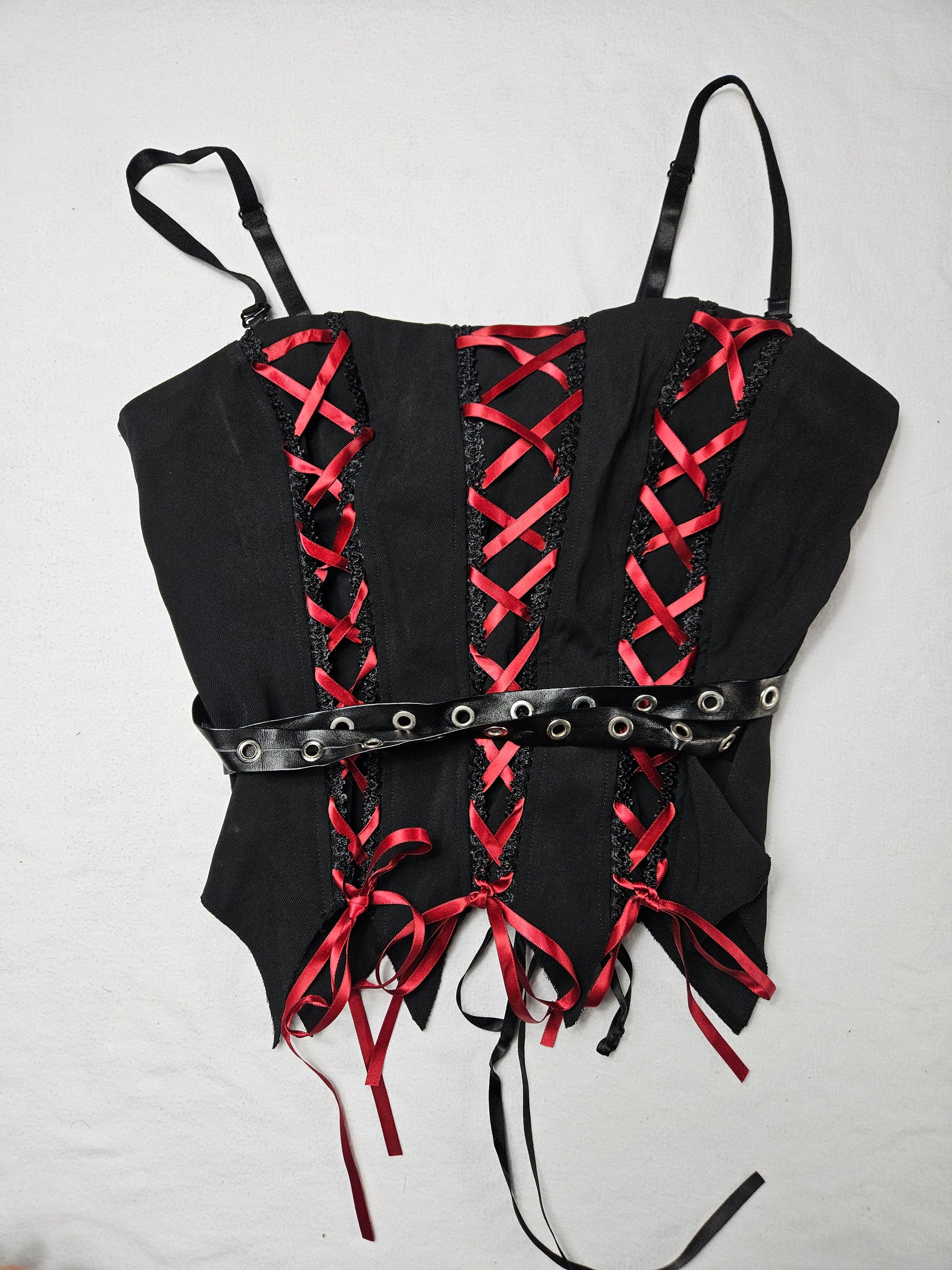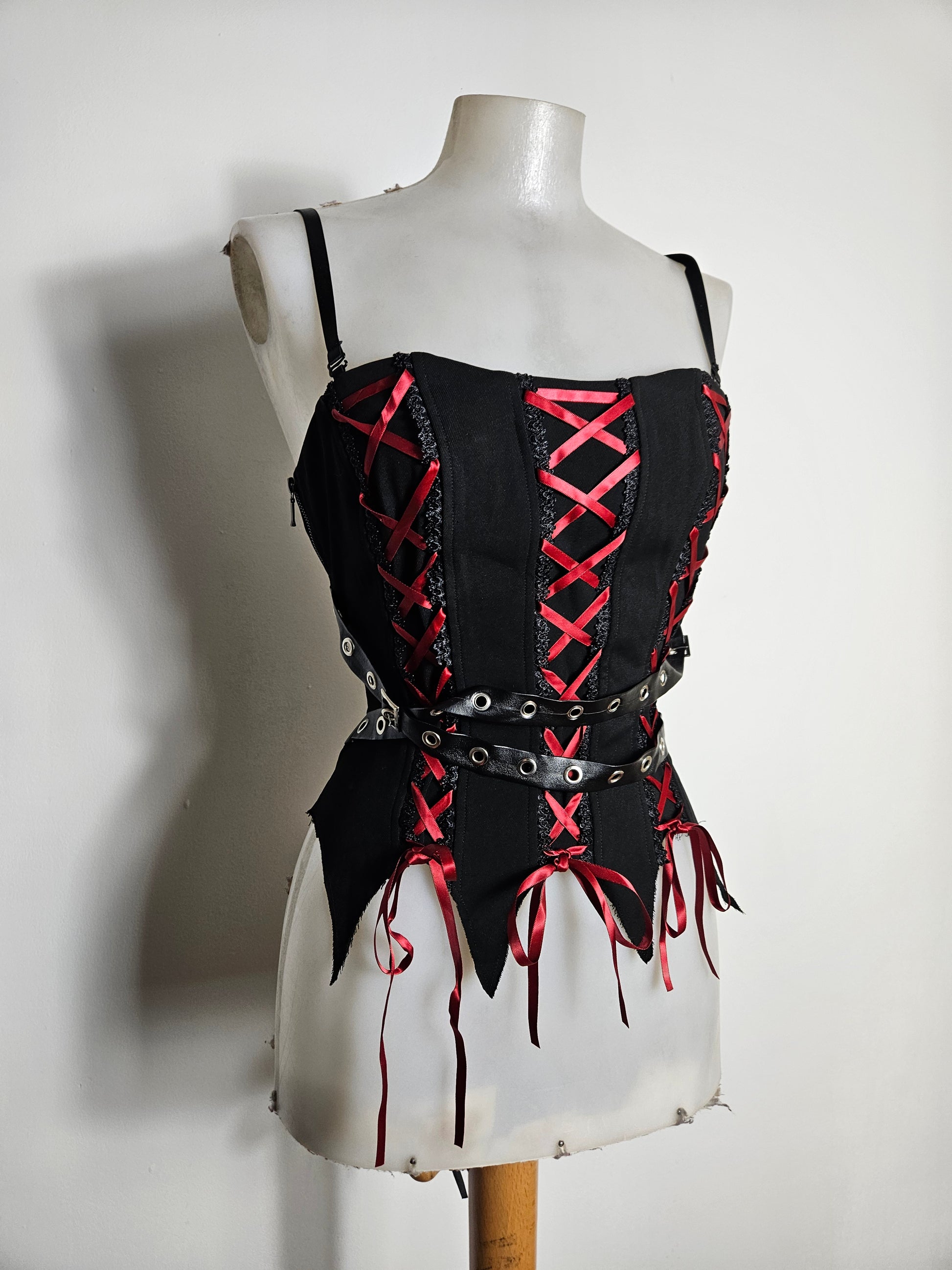 - Bustier noir et rouge à laçage et sangles en similicuir cloutée