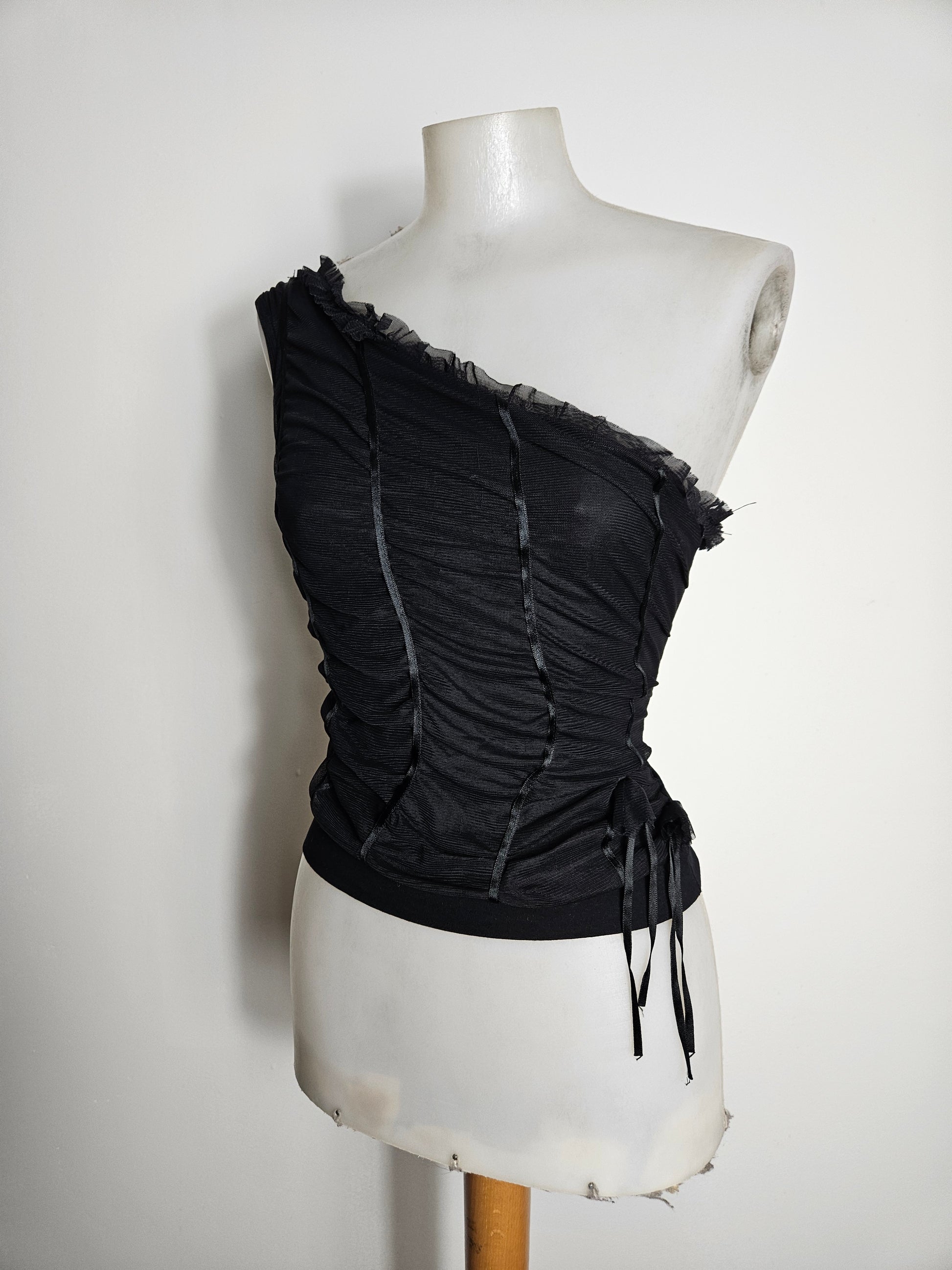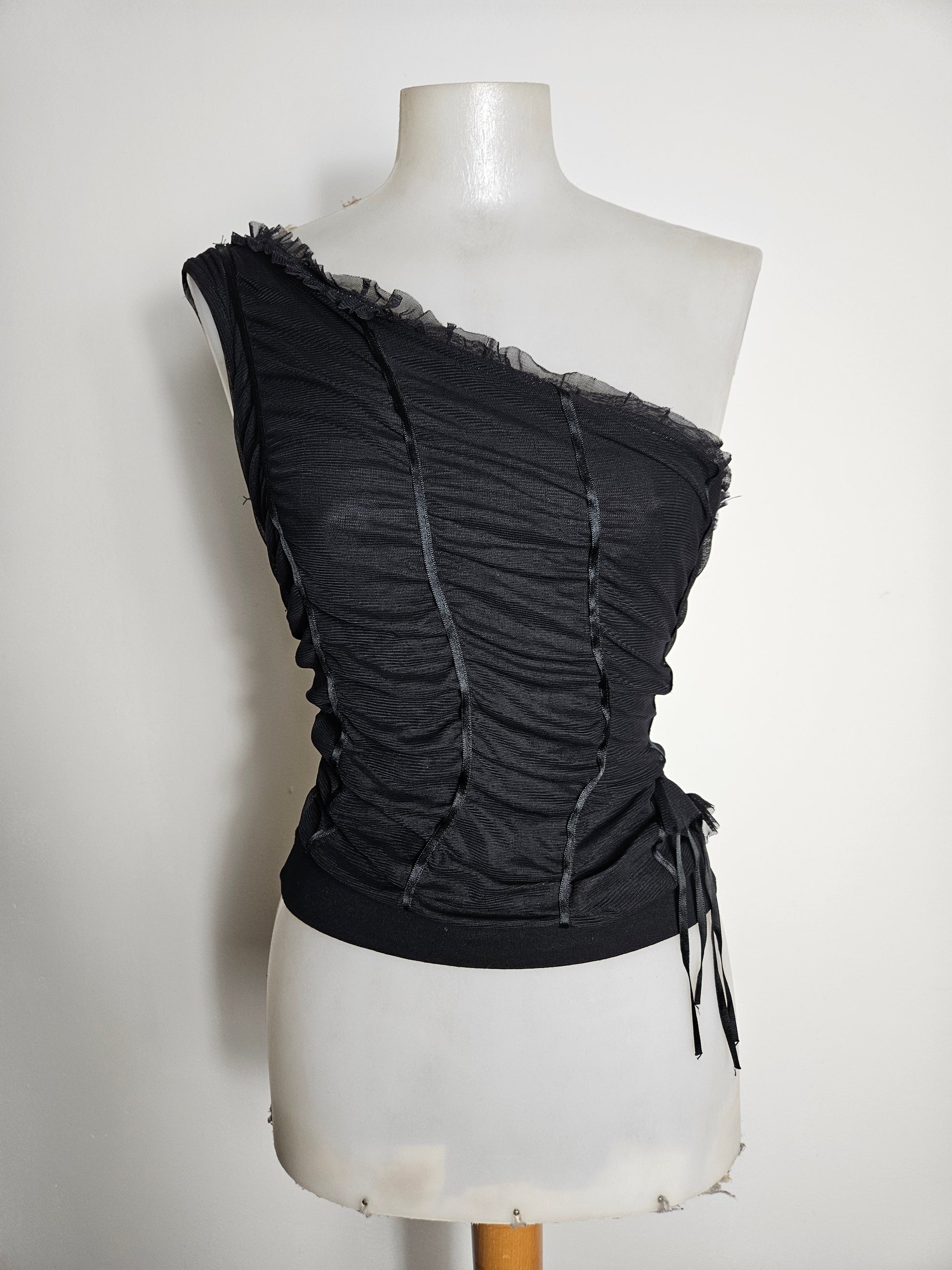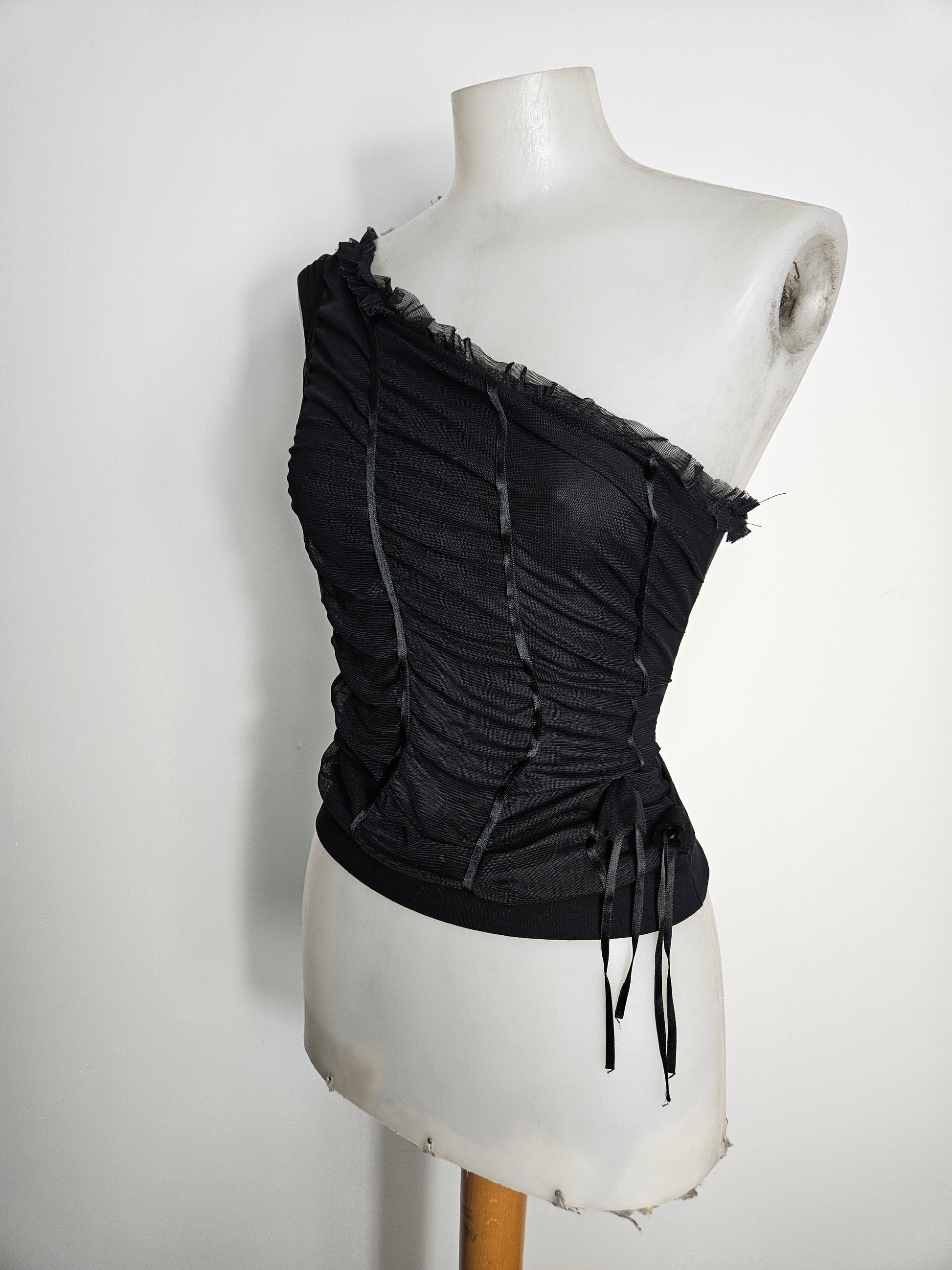 - Tissu plissé avec effet drapé vertical souligné de galons satinés.