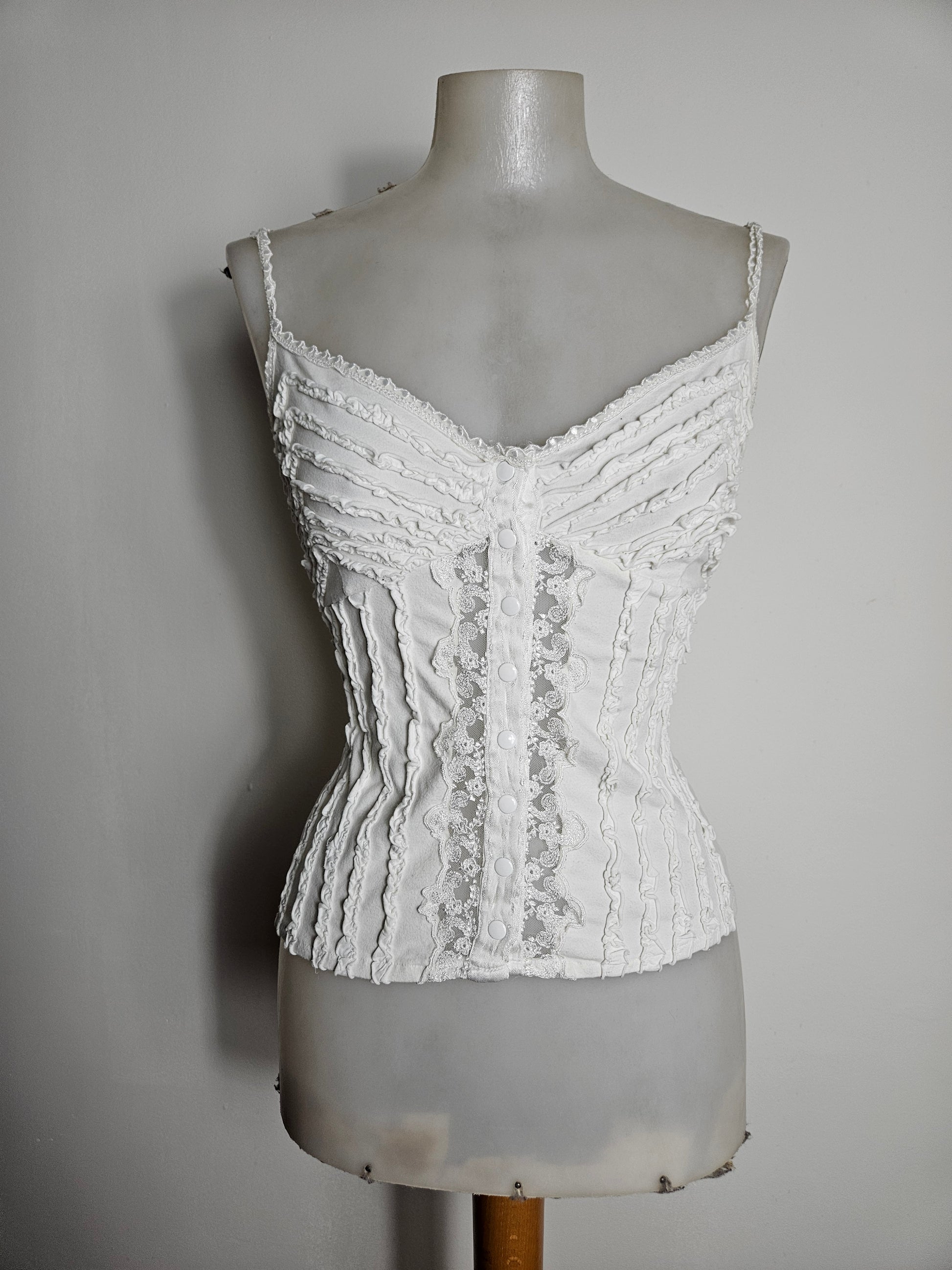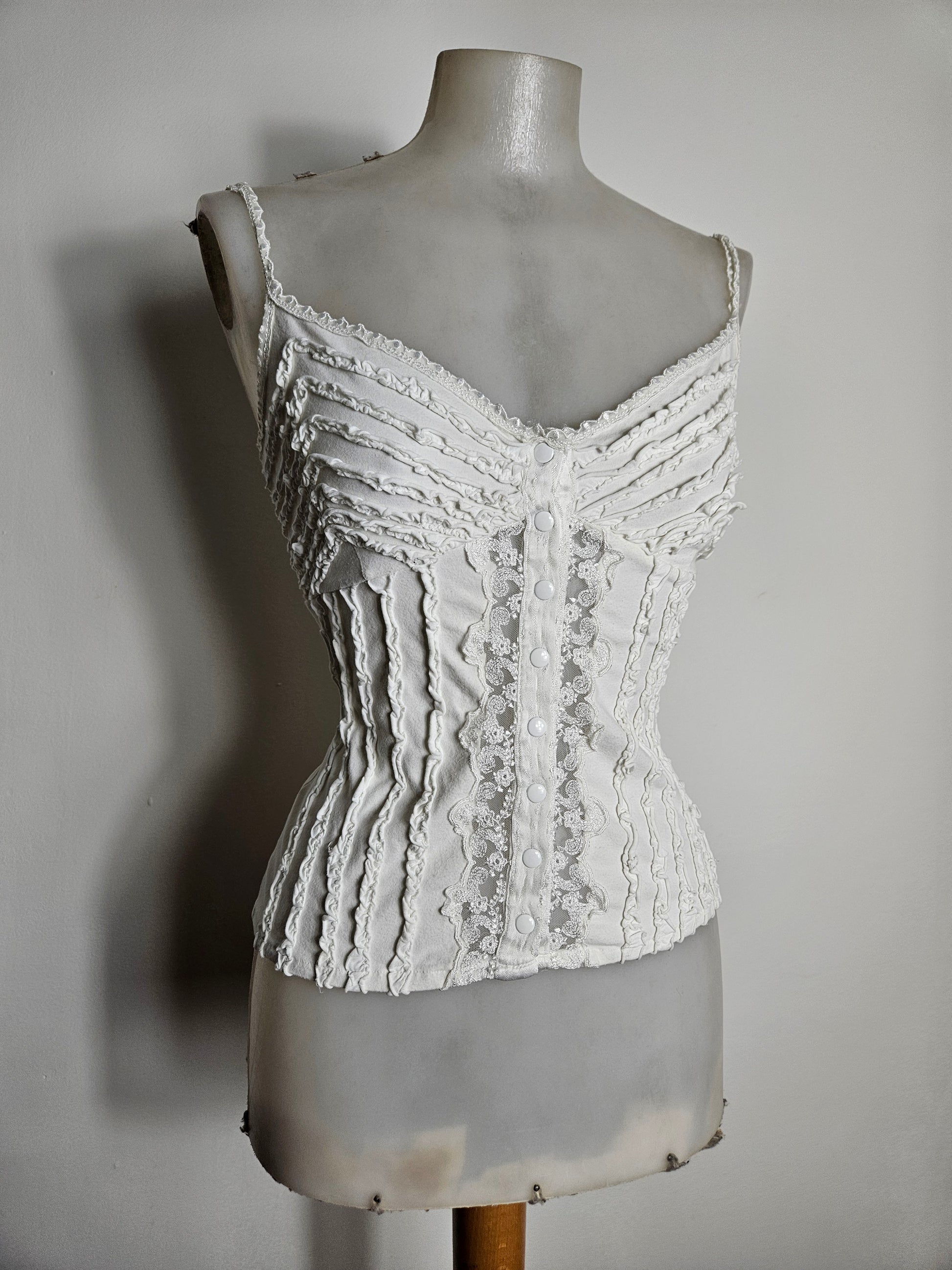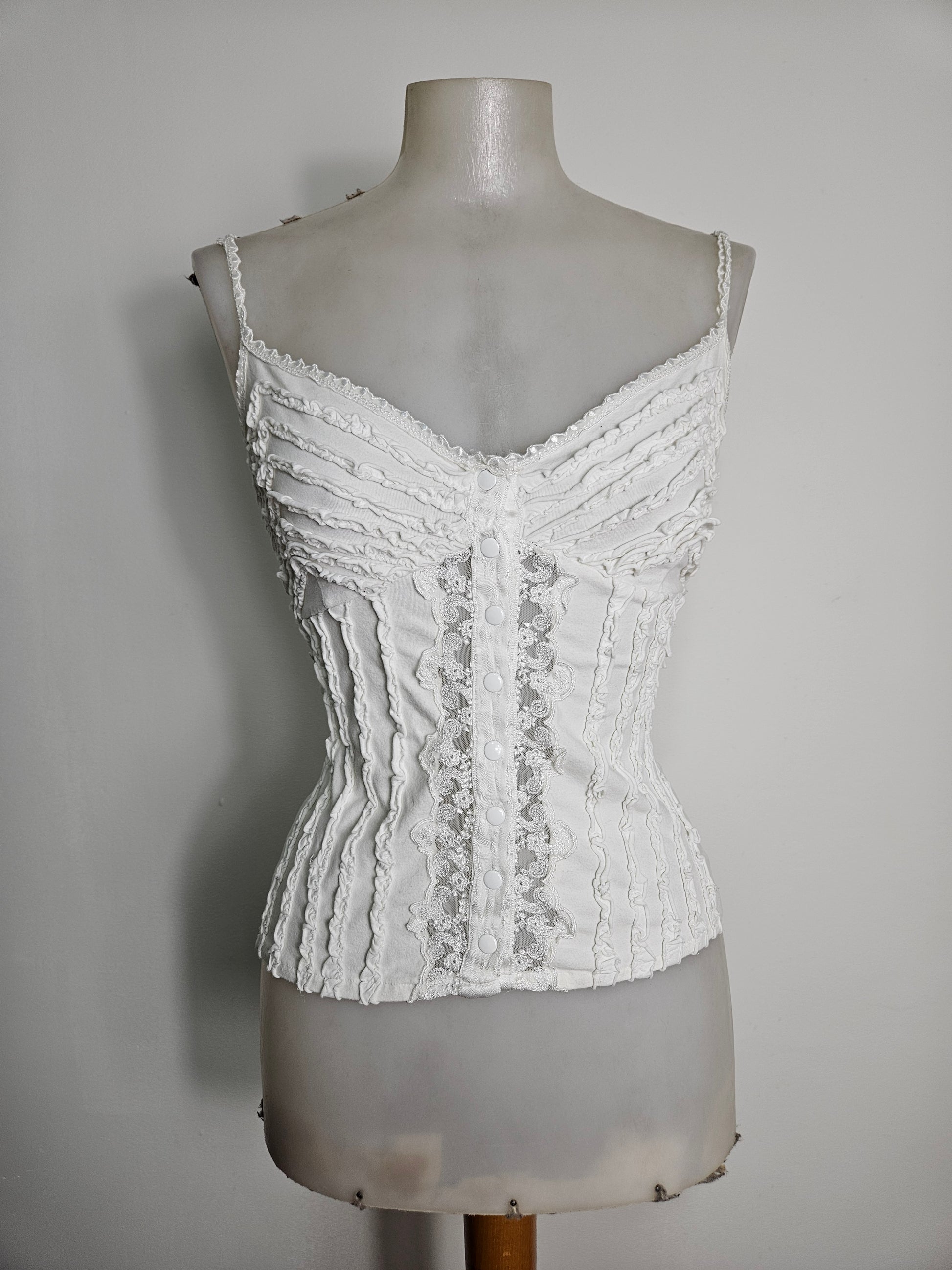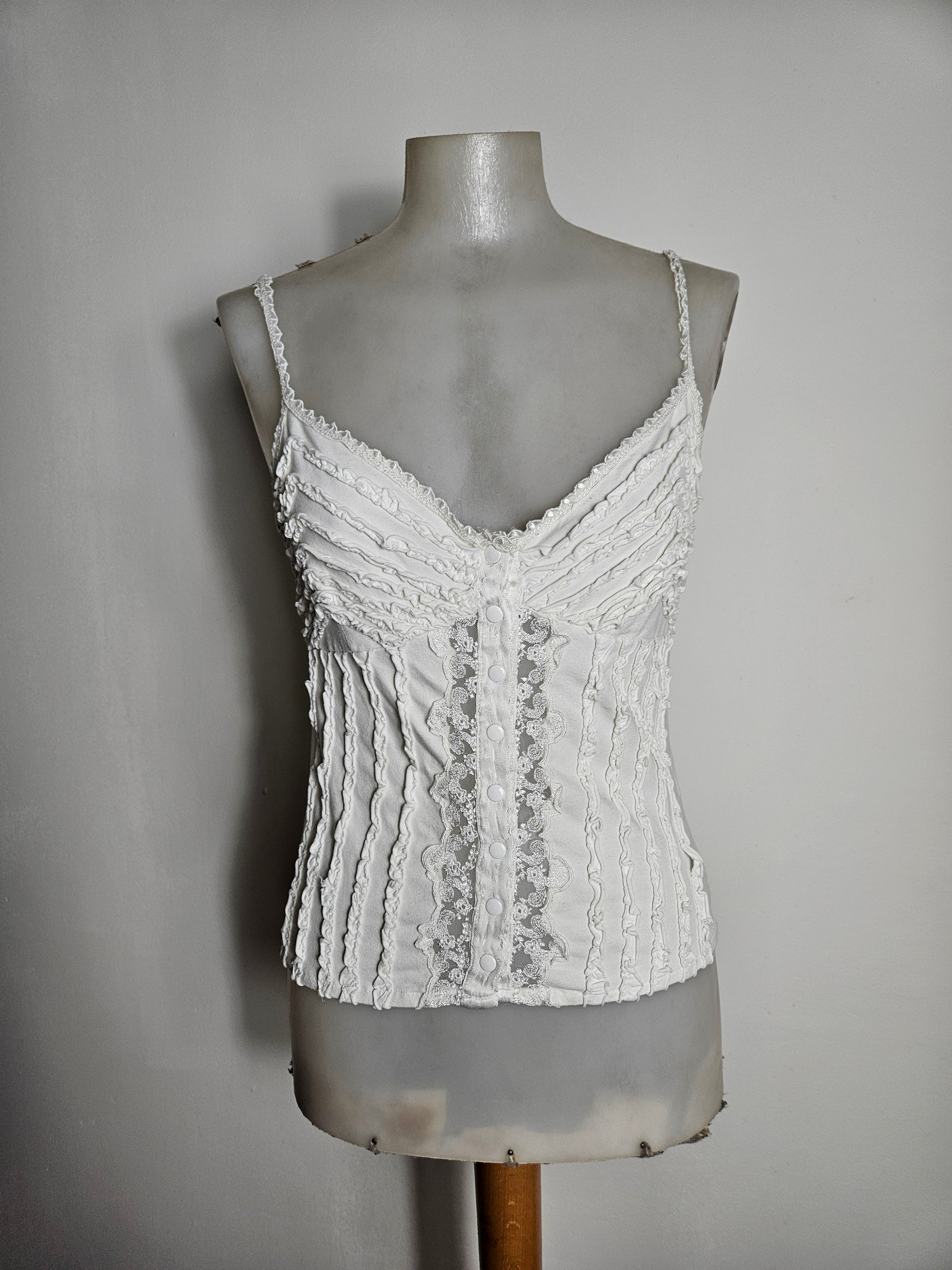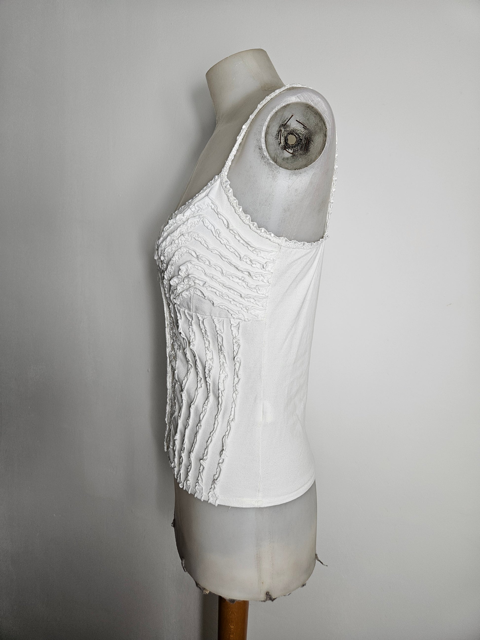 - Top blanc à fines bretelles avec détails plissés et dentelle devant.