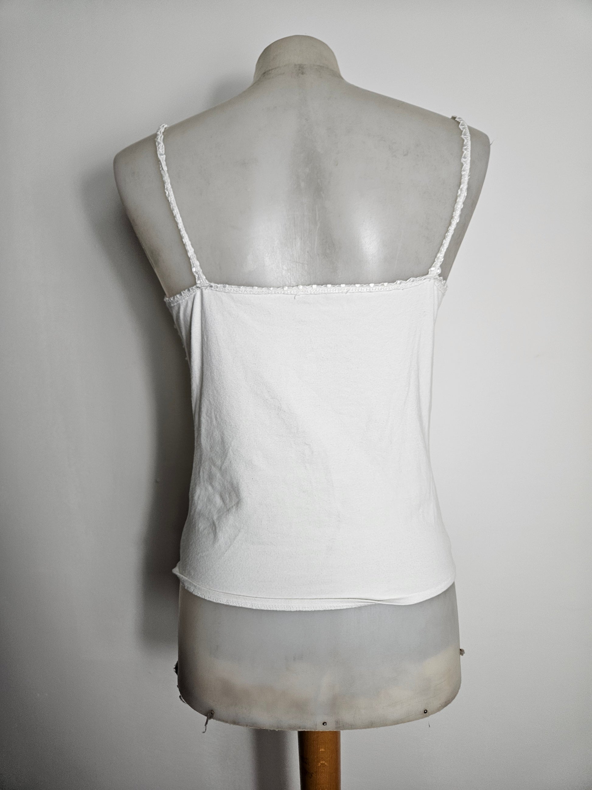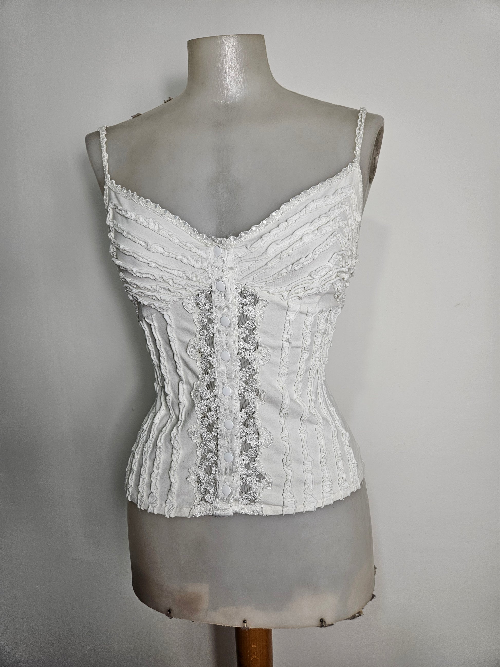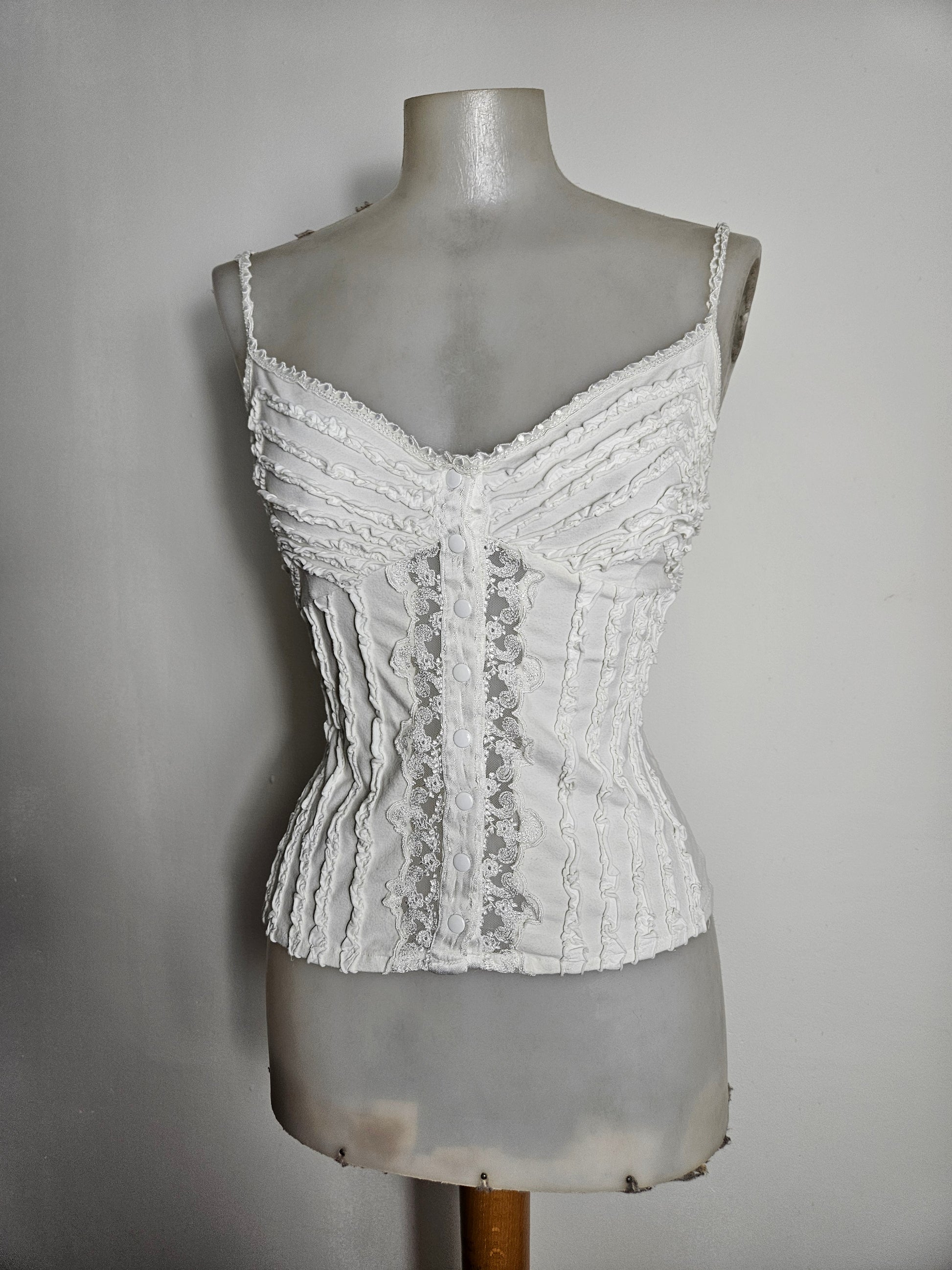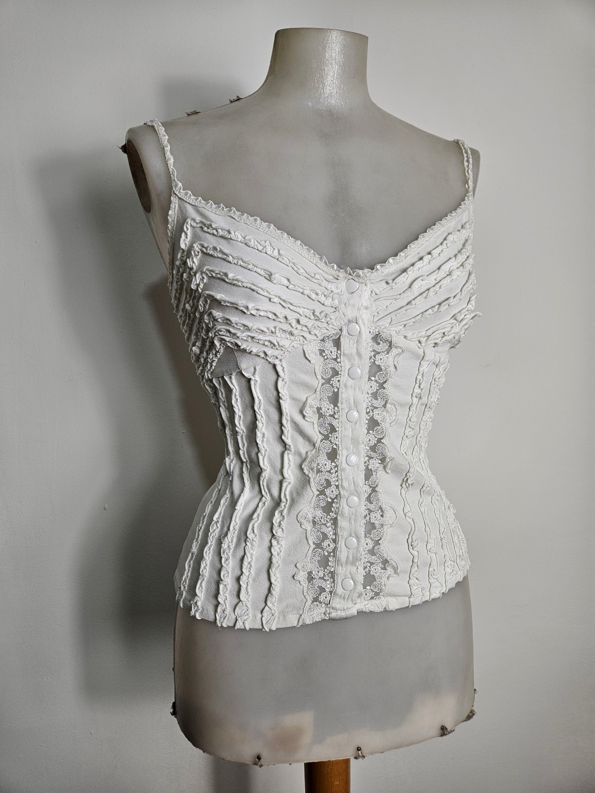 - Top blanc à fines bretelles avec détails plissés et dentelle devant.