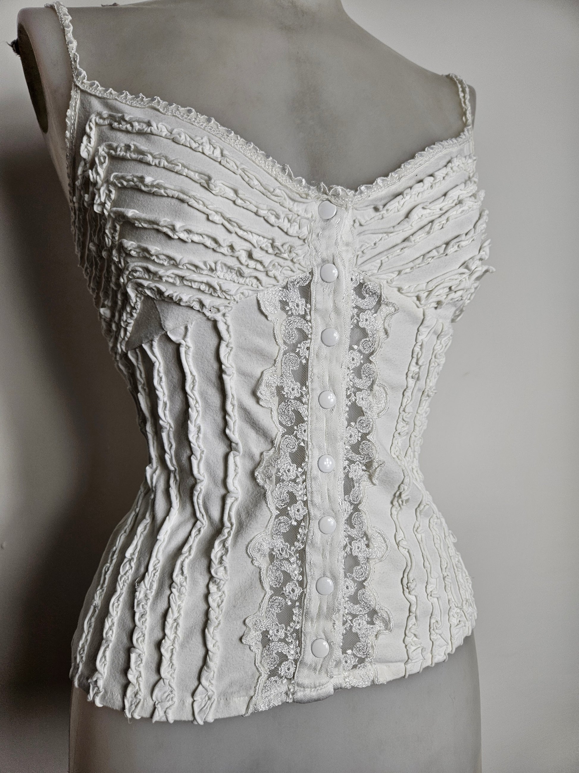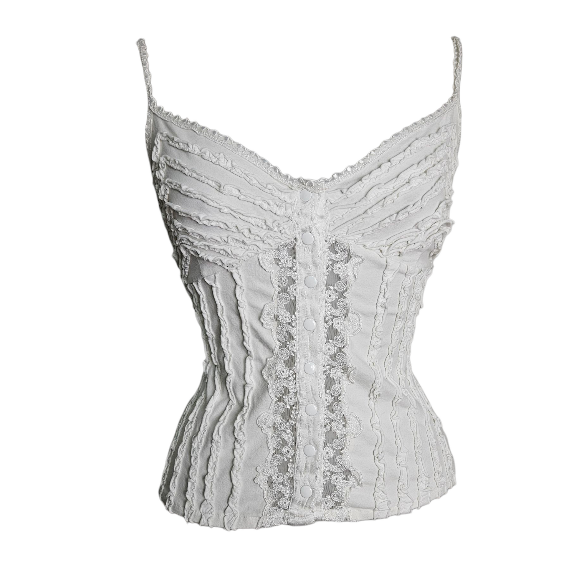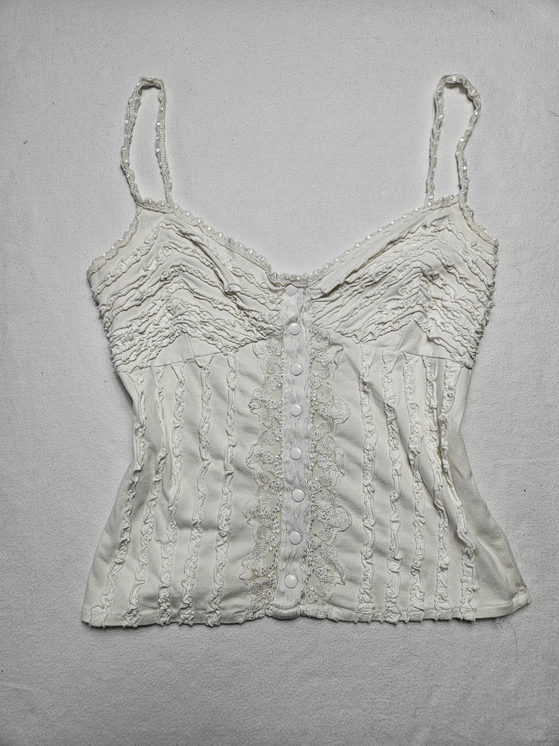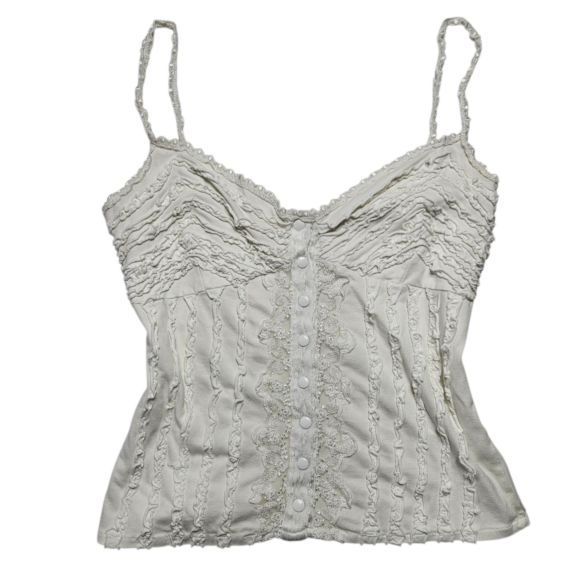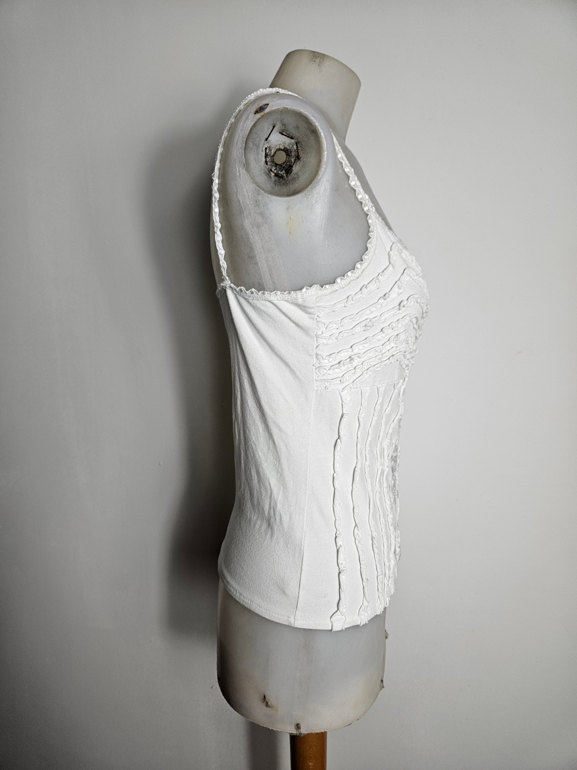 - Top blanc à fines bretelles avec détails plissés et dentelle devant.