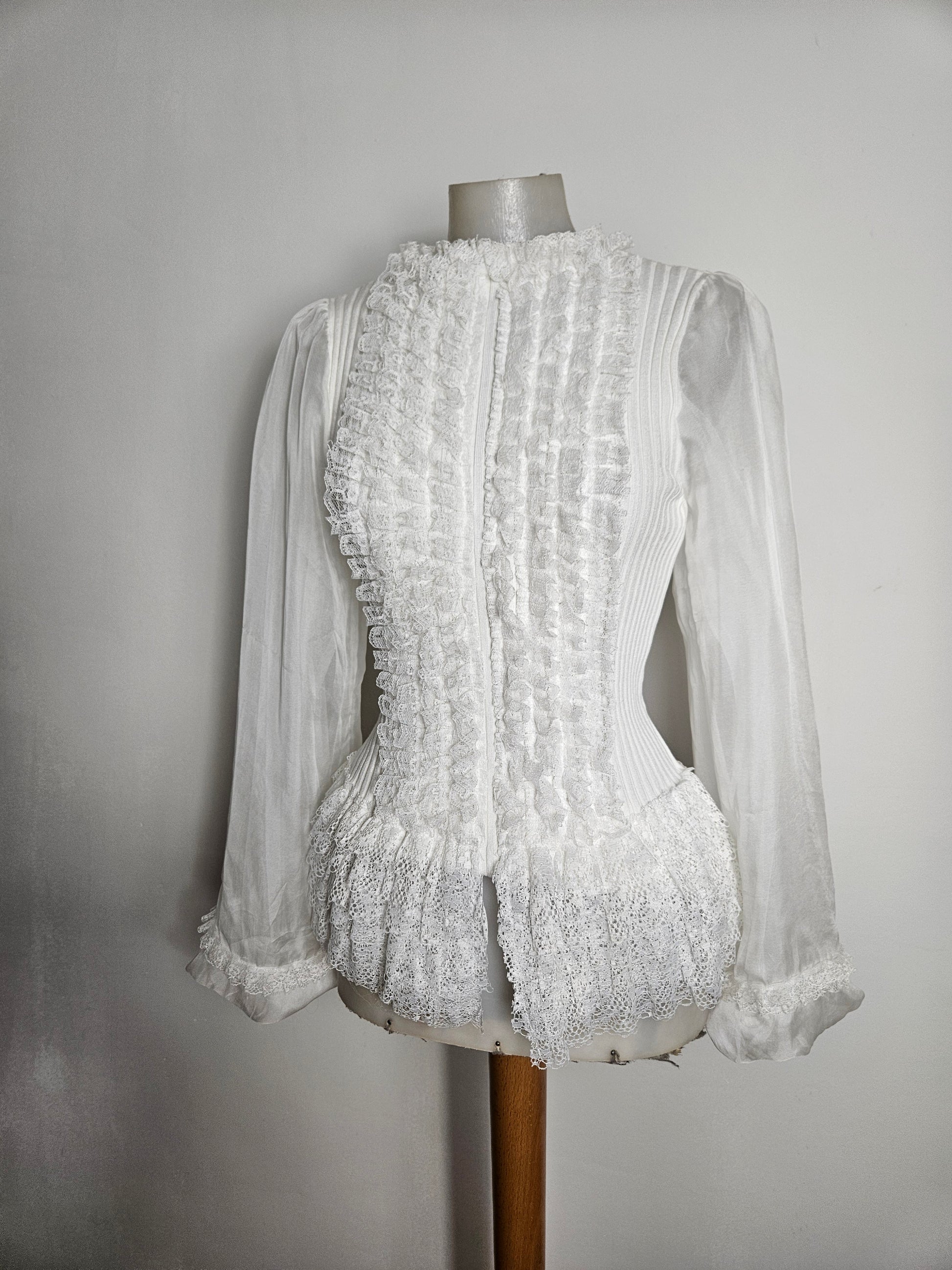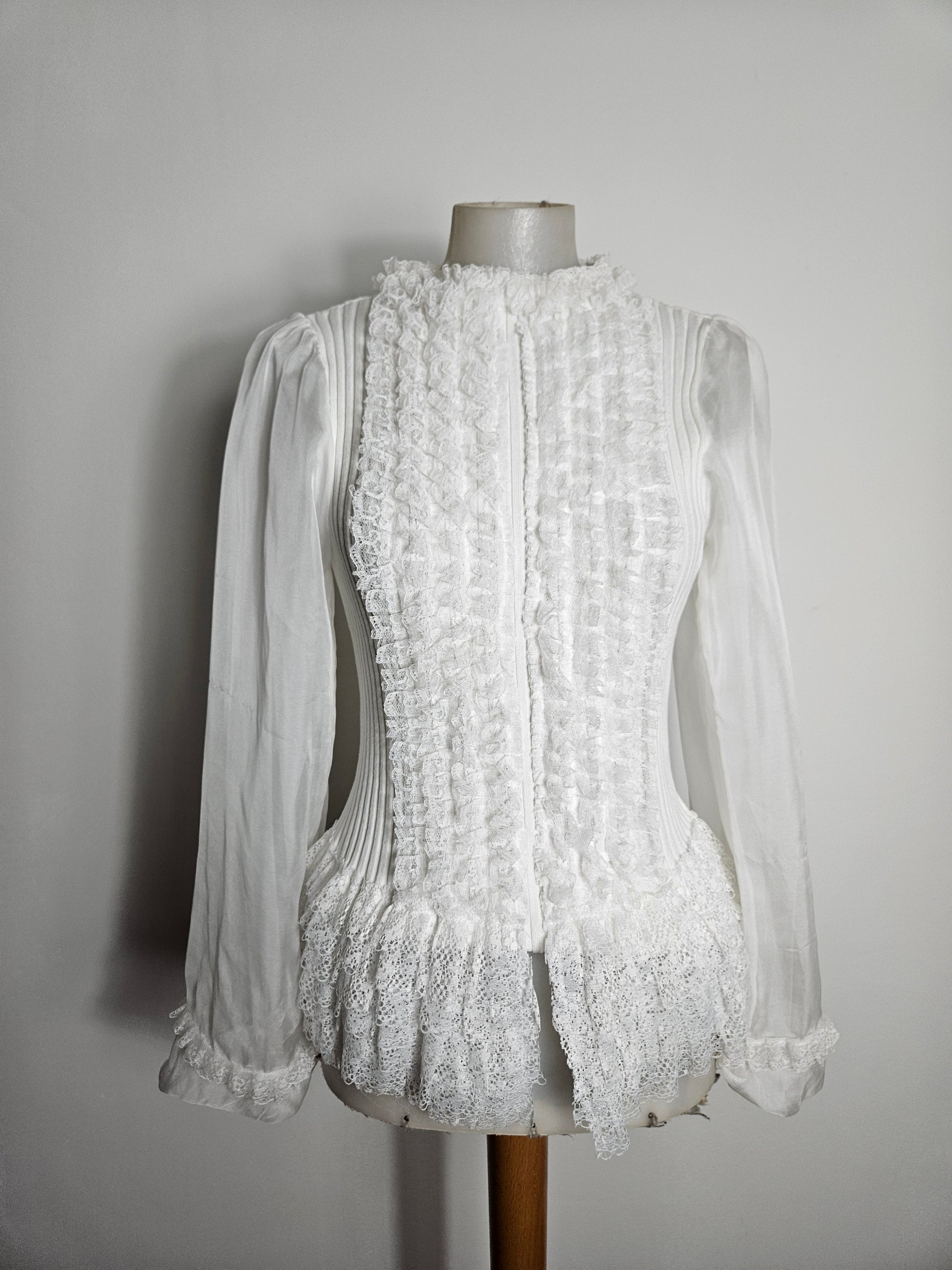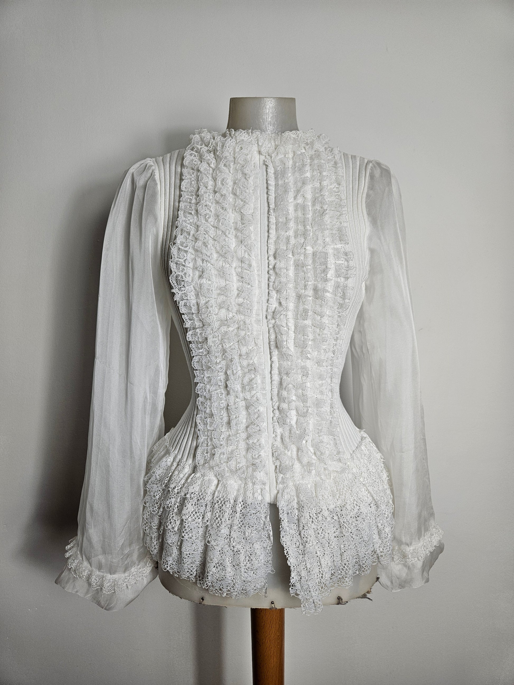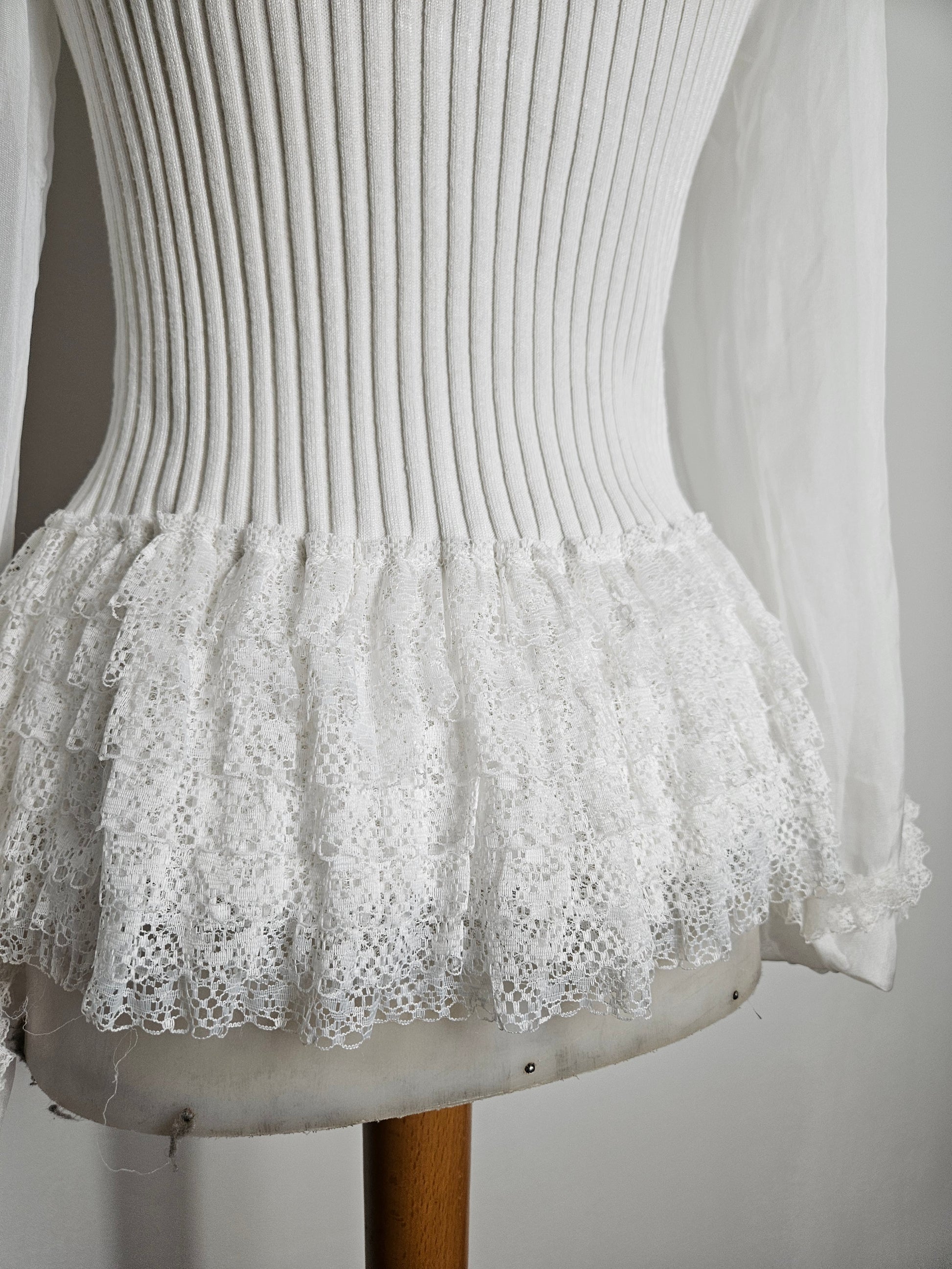 - Volants et détails en dentelle sur le devant et le bas du chemisier