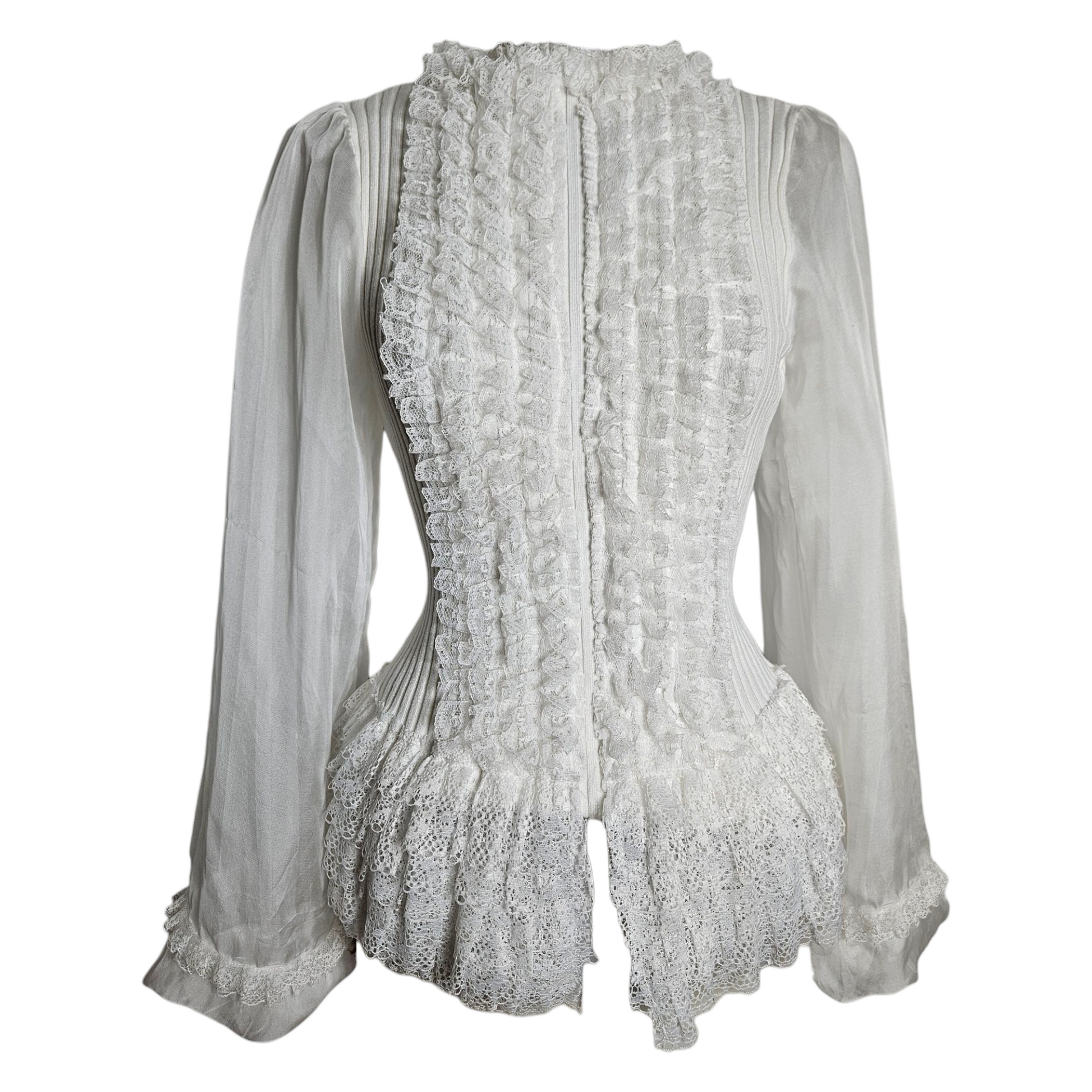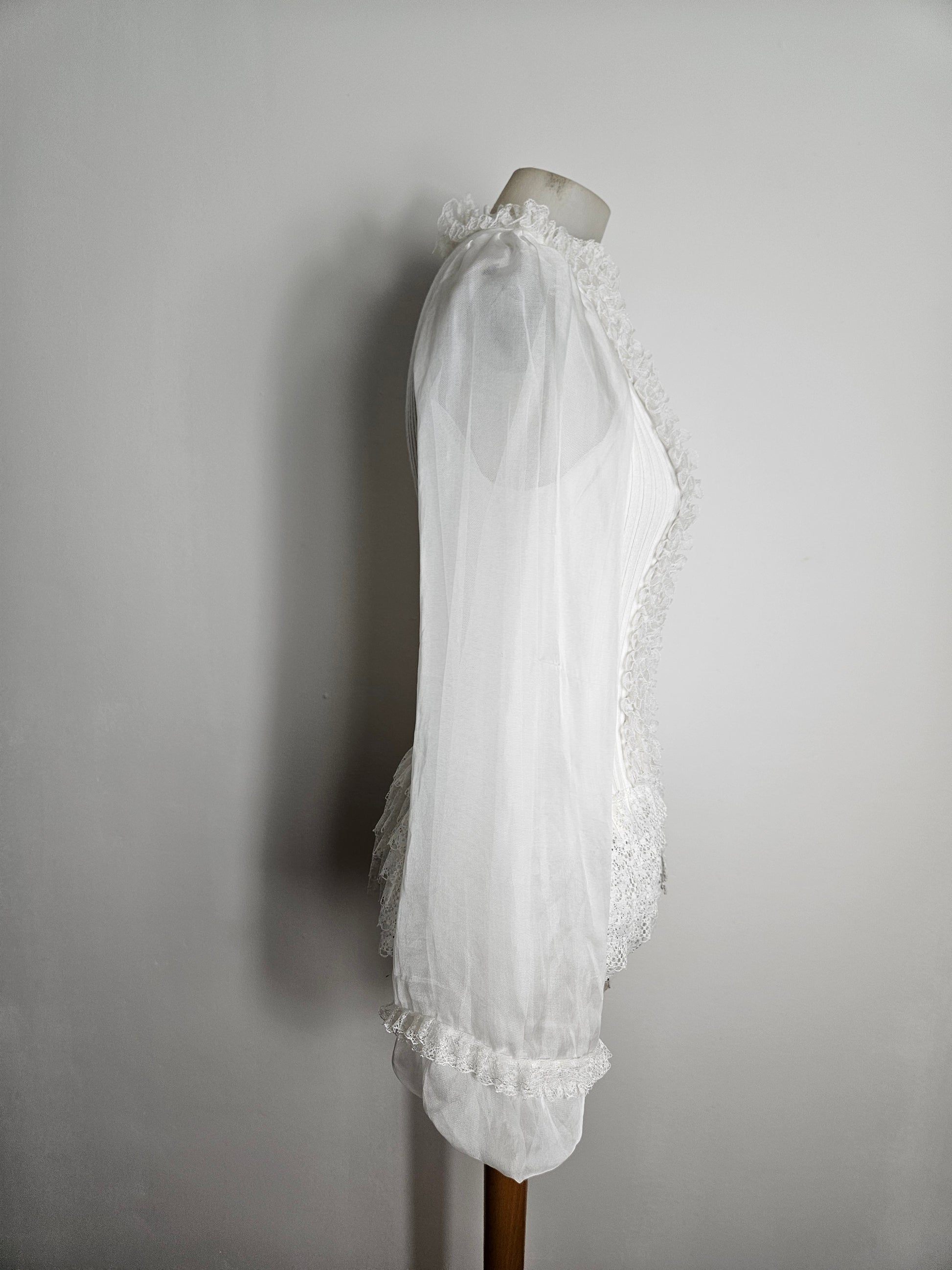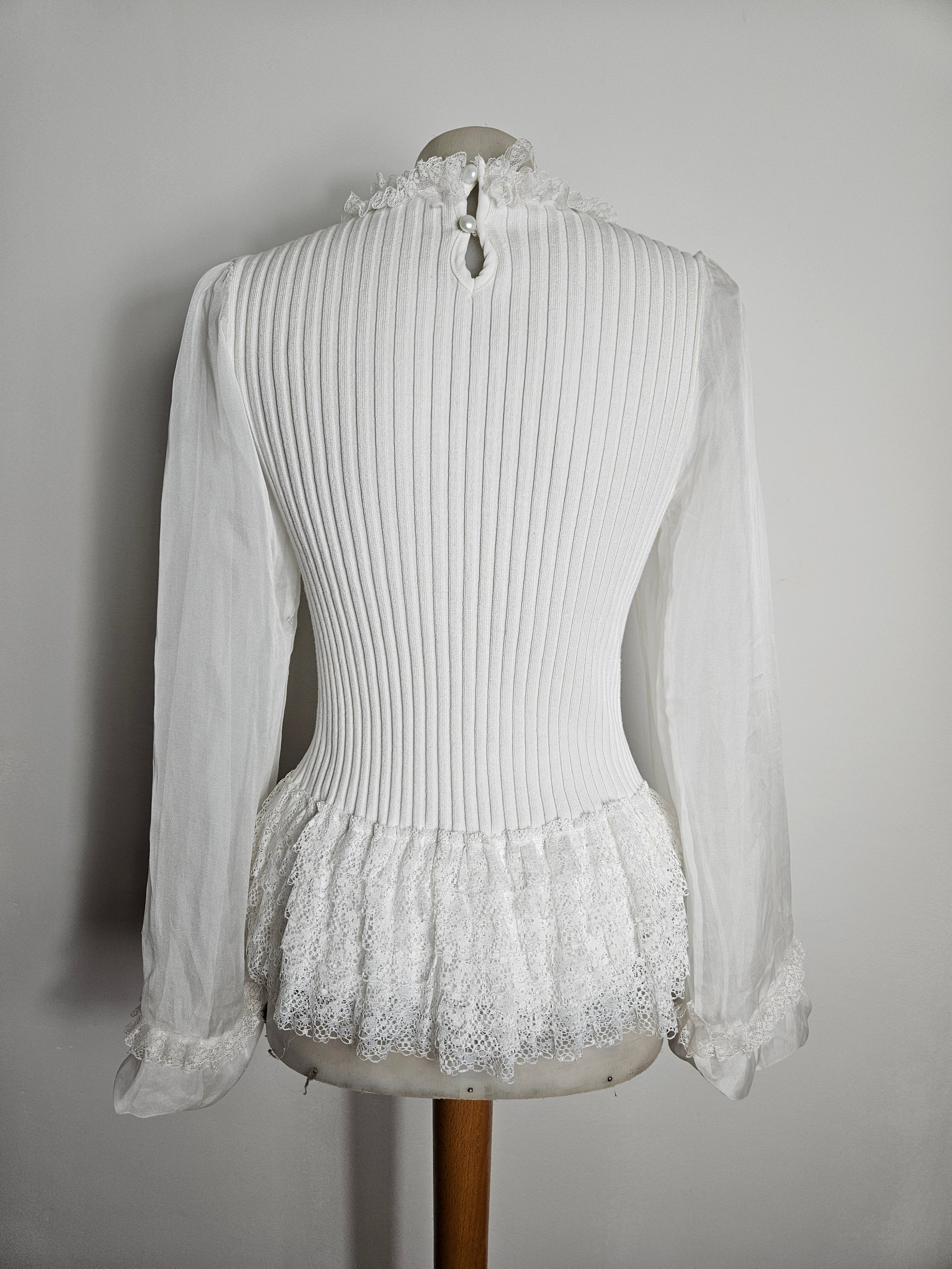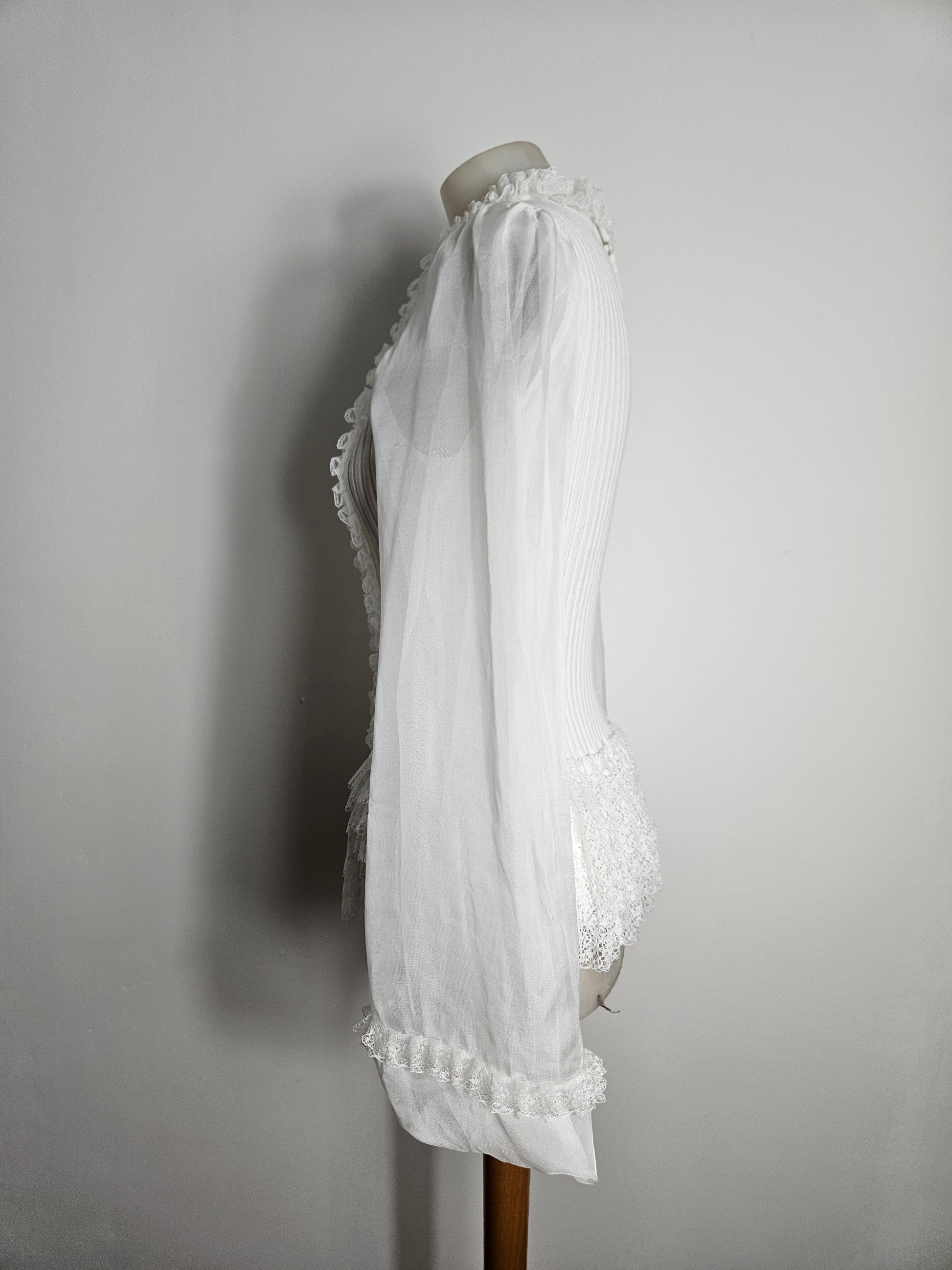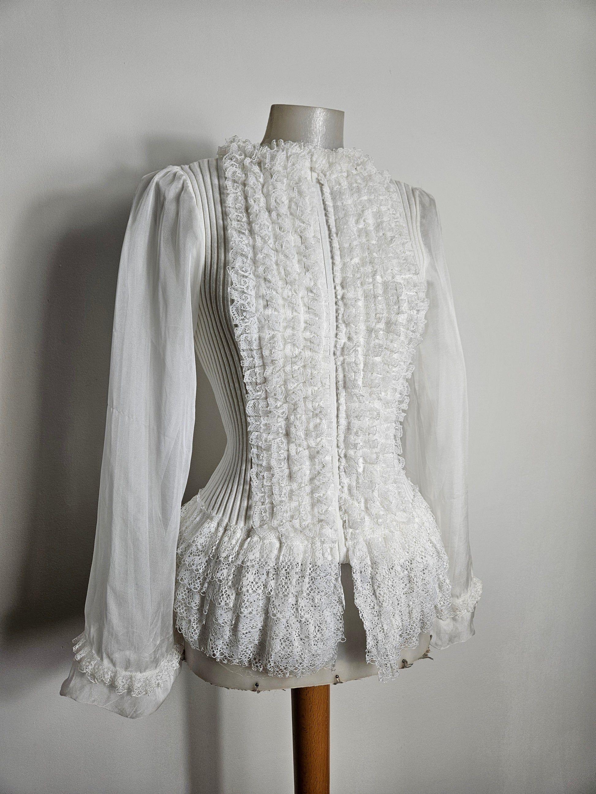- Volants et détails en dentelle sur le devant et le bas du chemisier