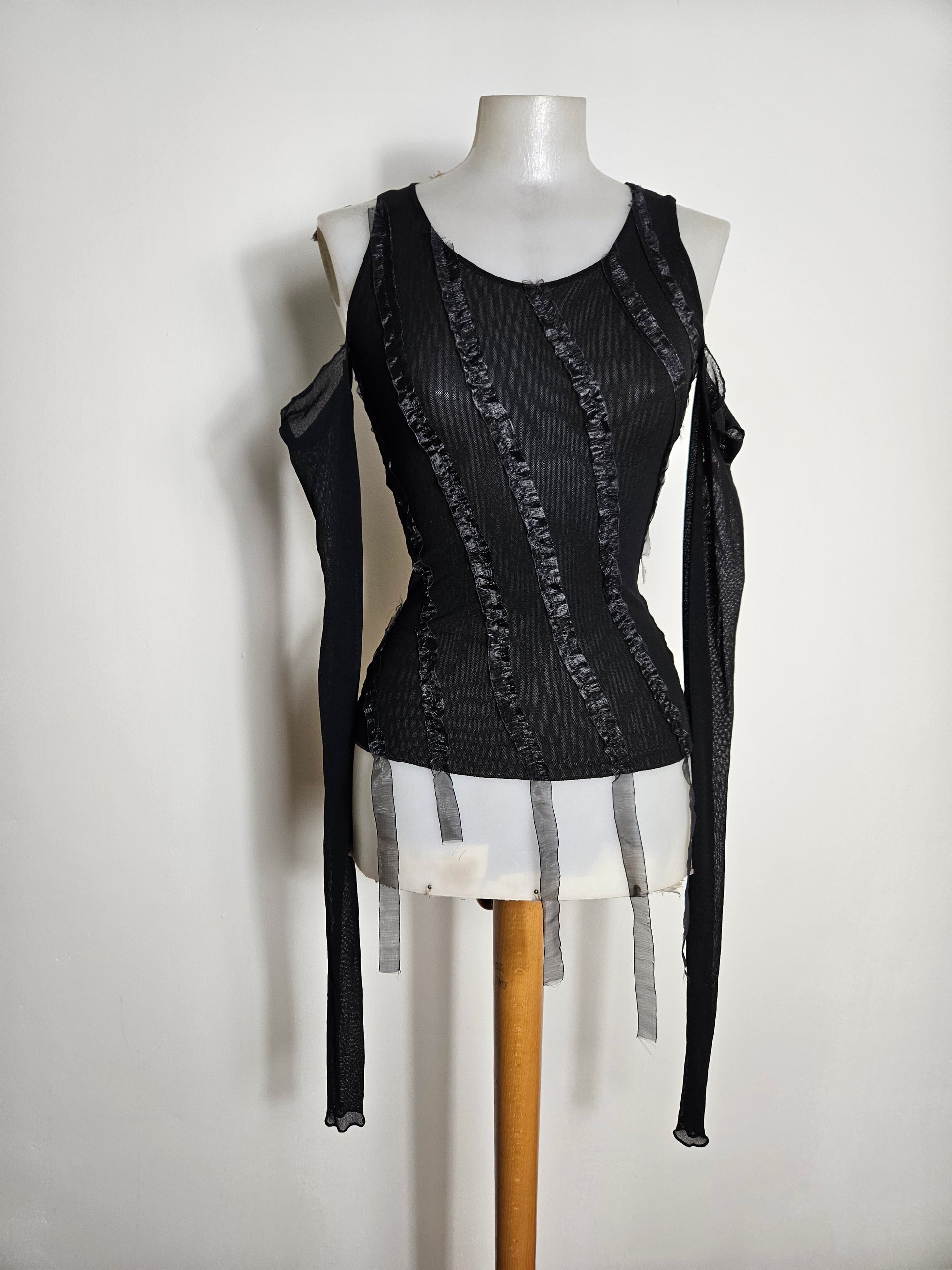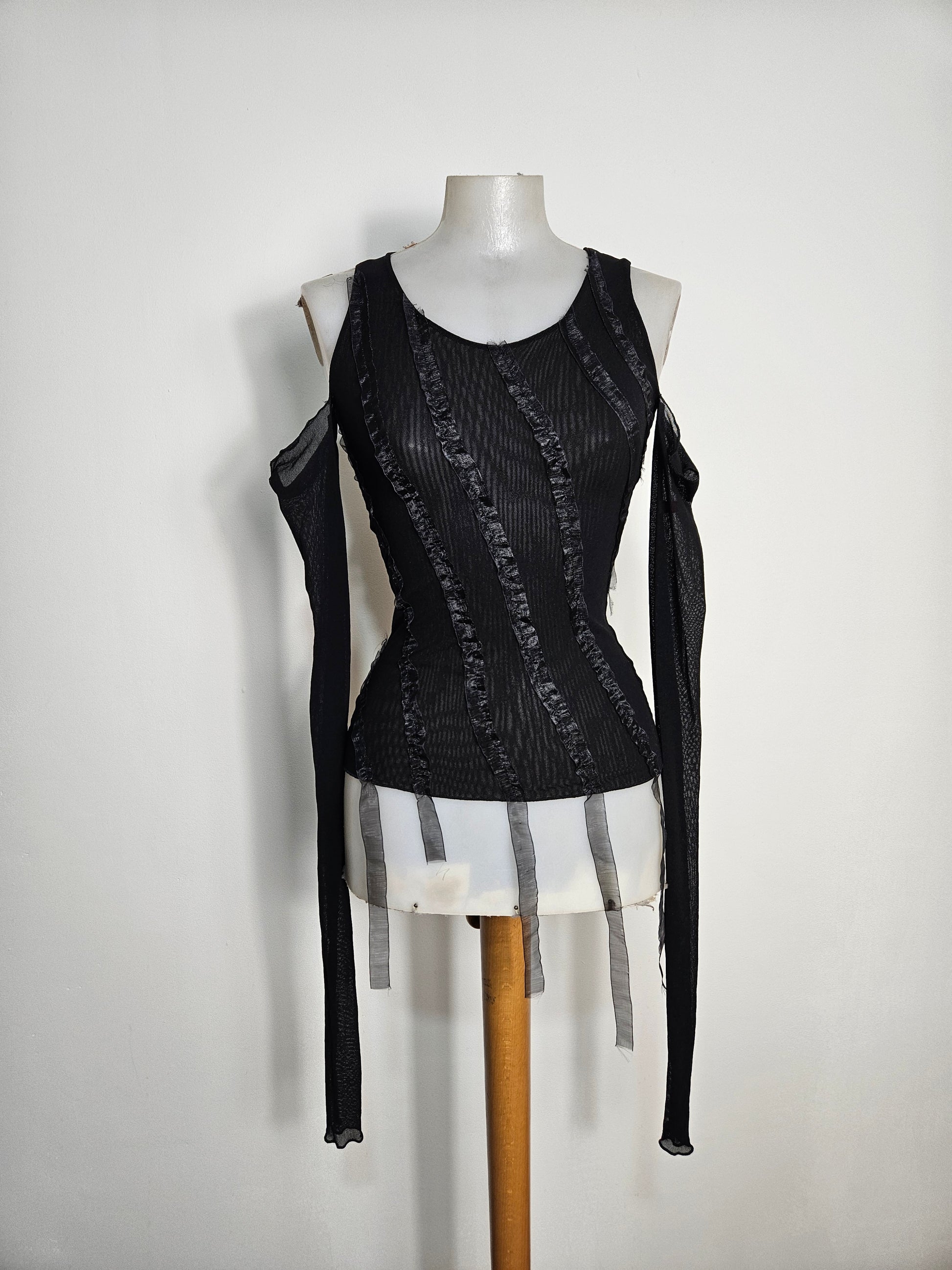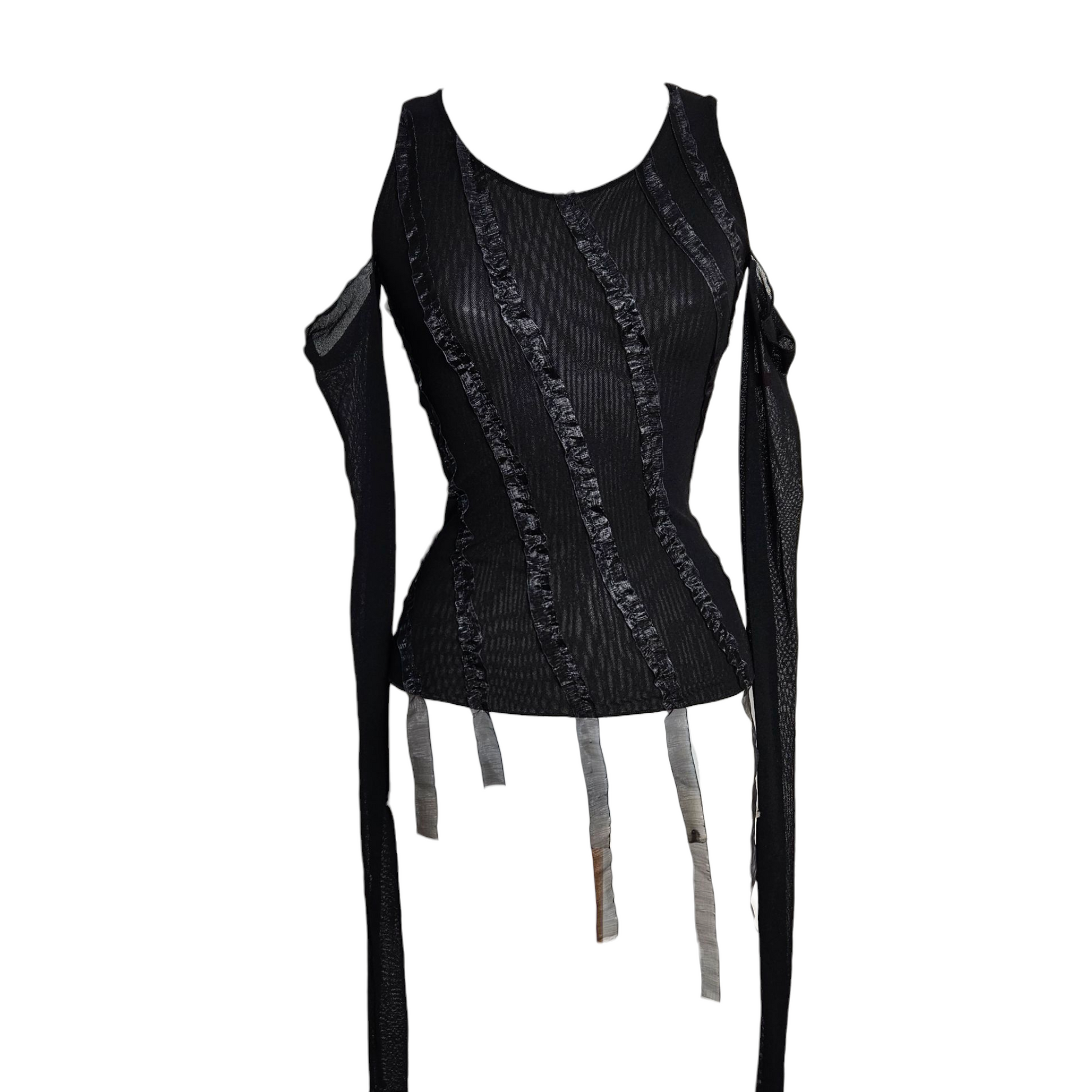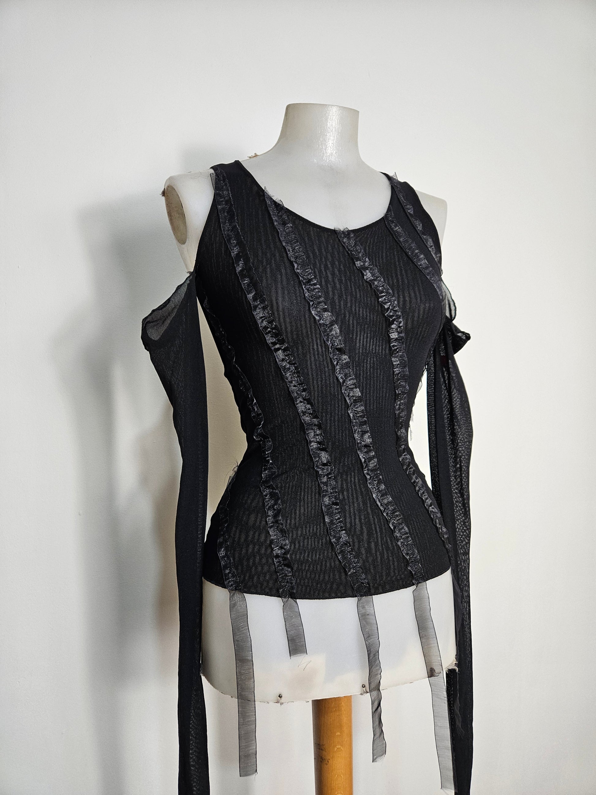 - Bandes verticales texturées avec volants satinés transversales sur le buste