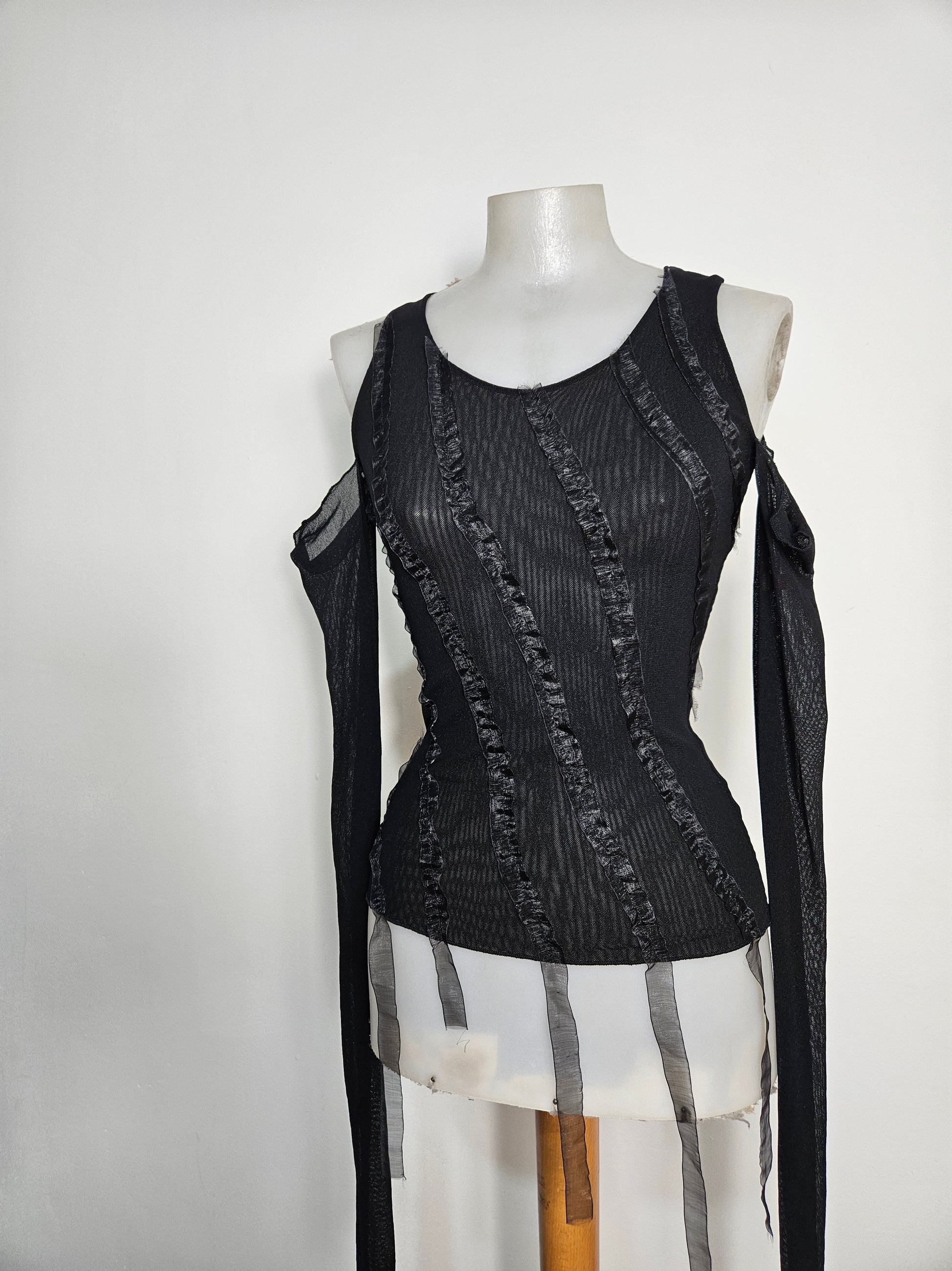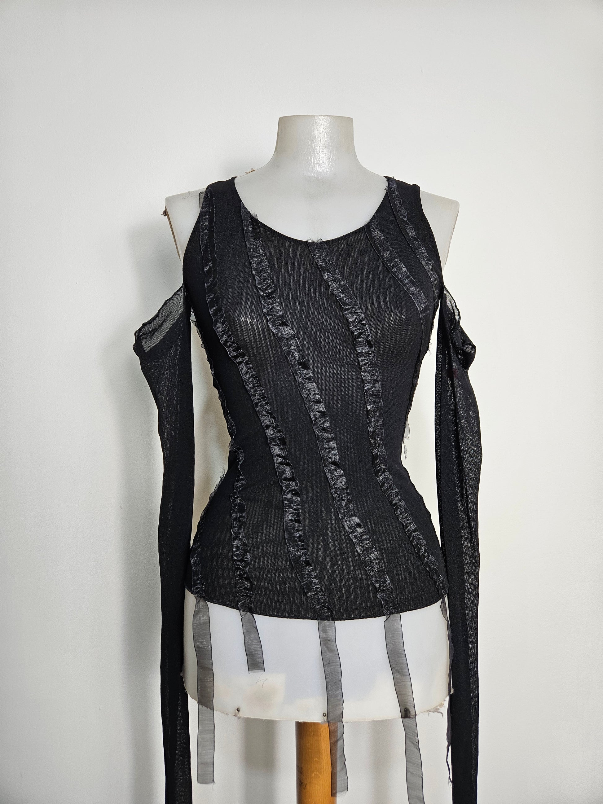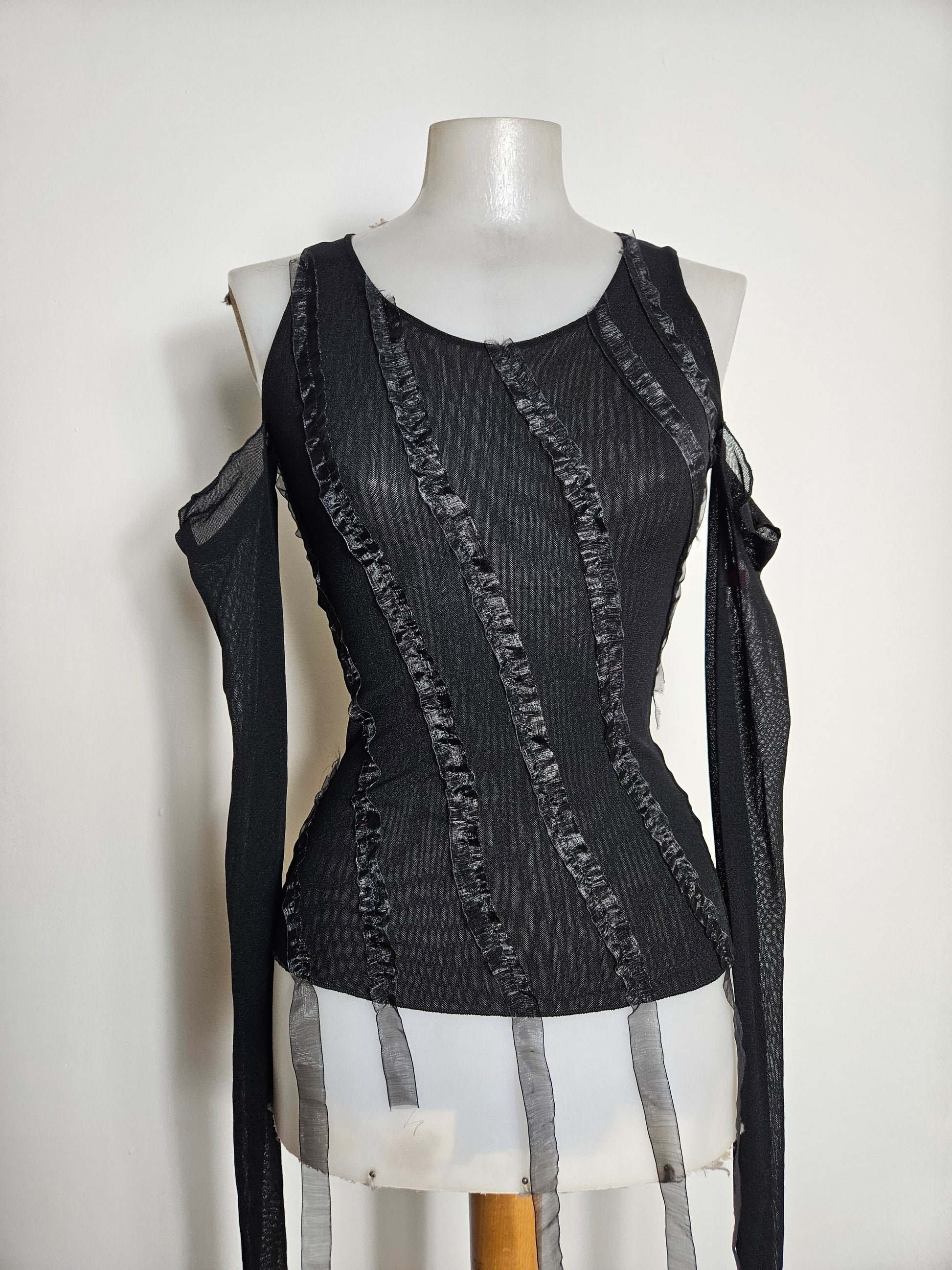 - Bandes verticales texturées avec volants satinés transversales sur le buste