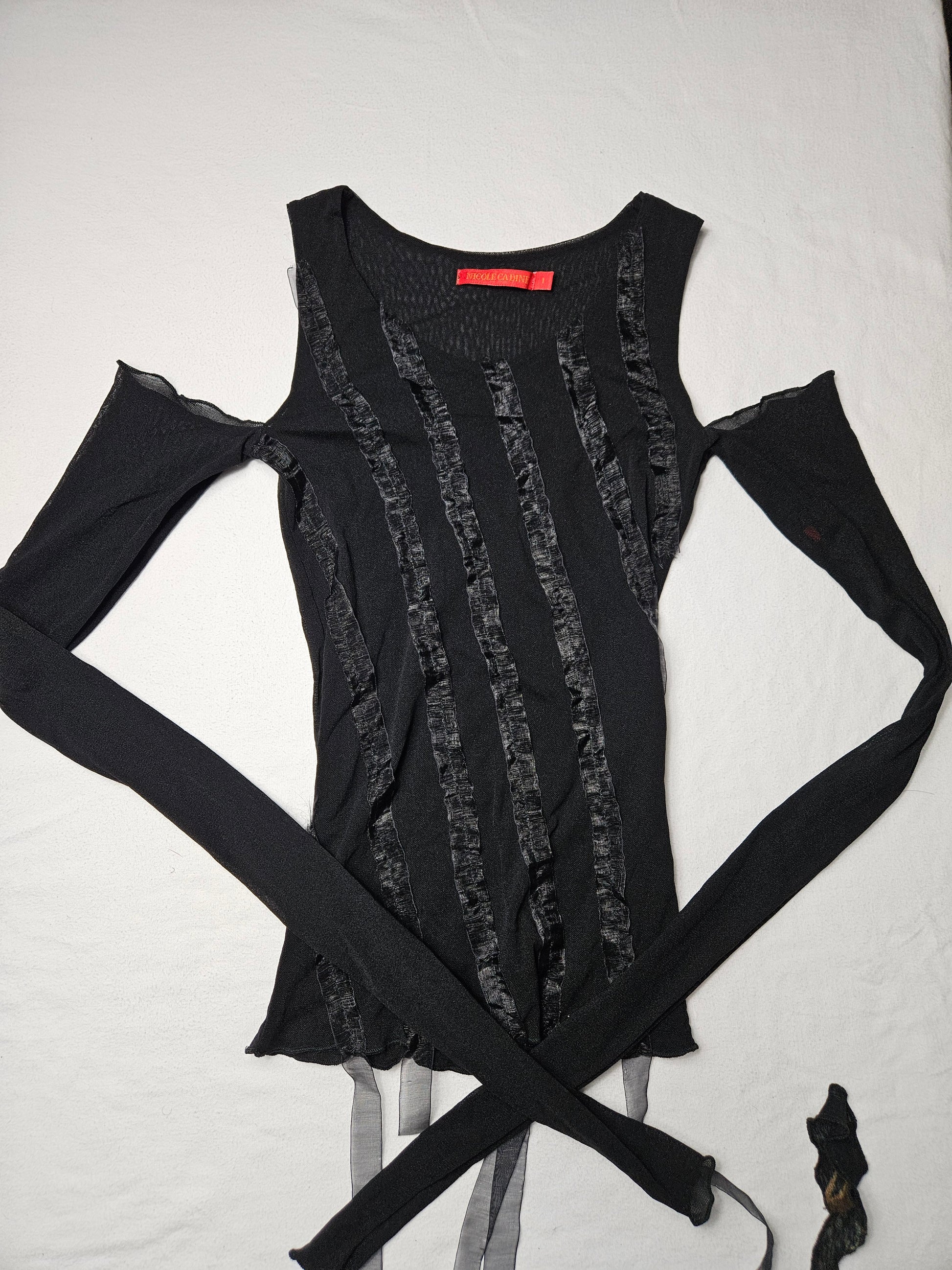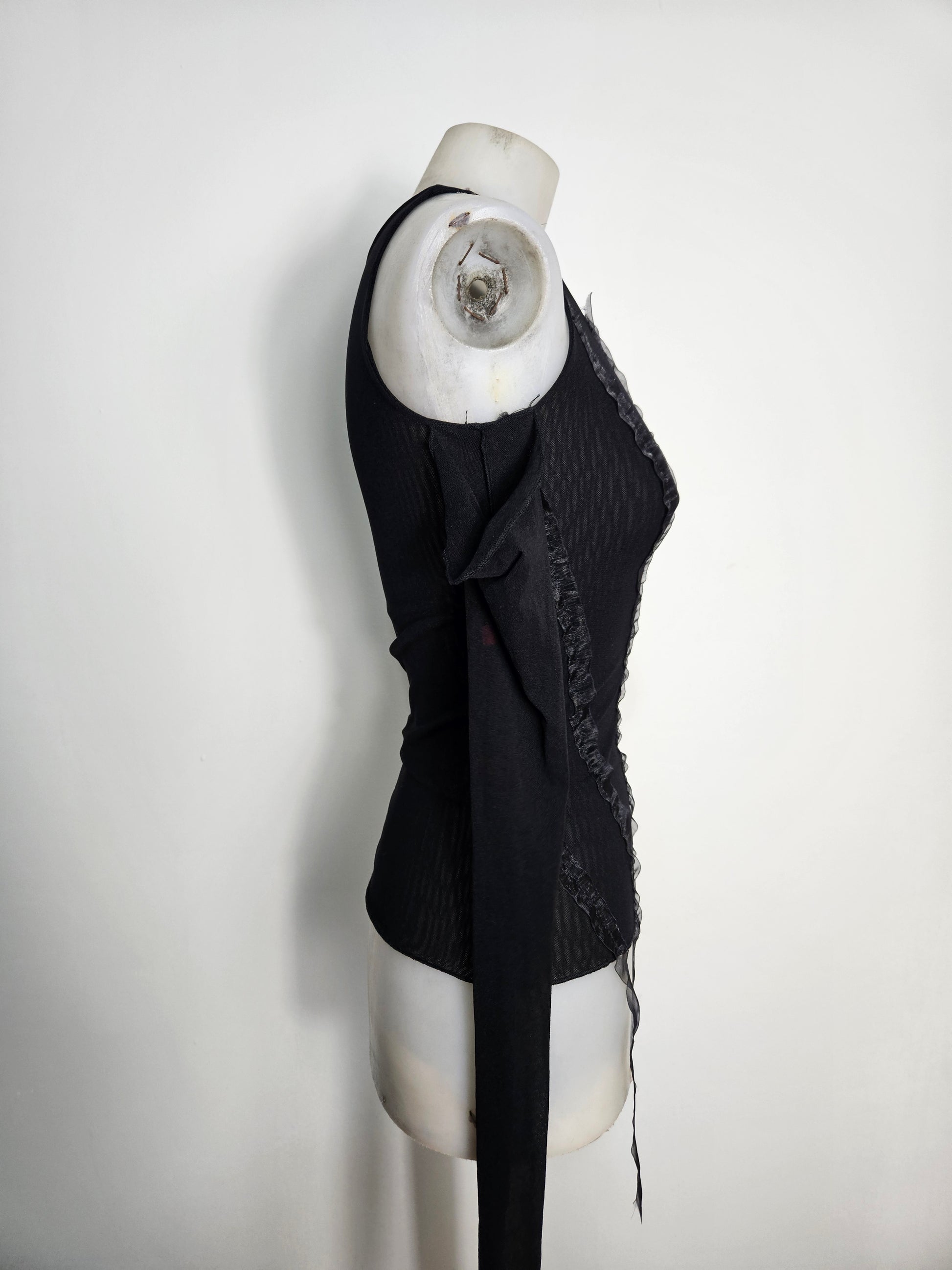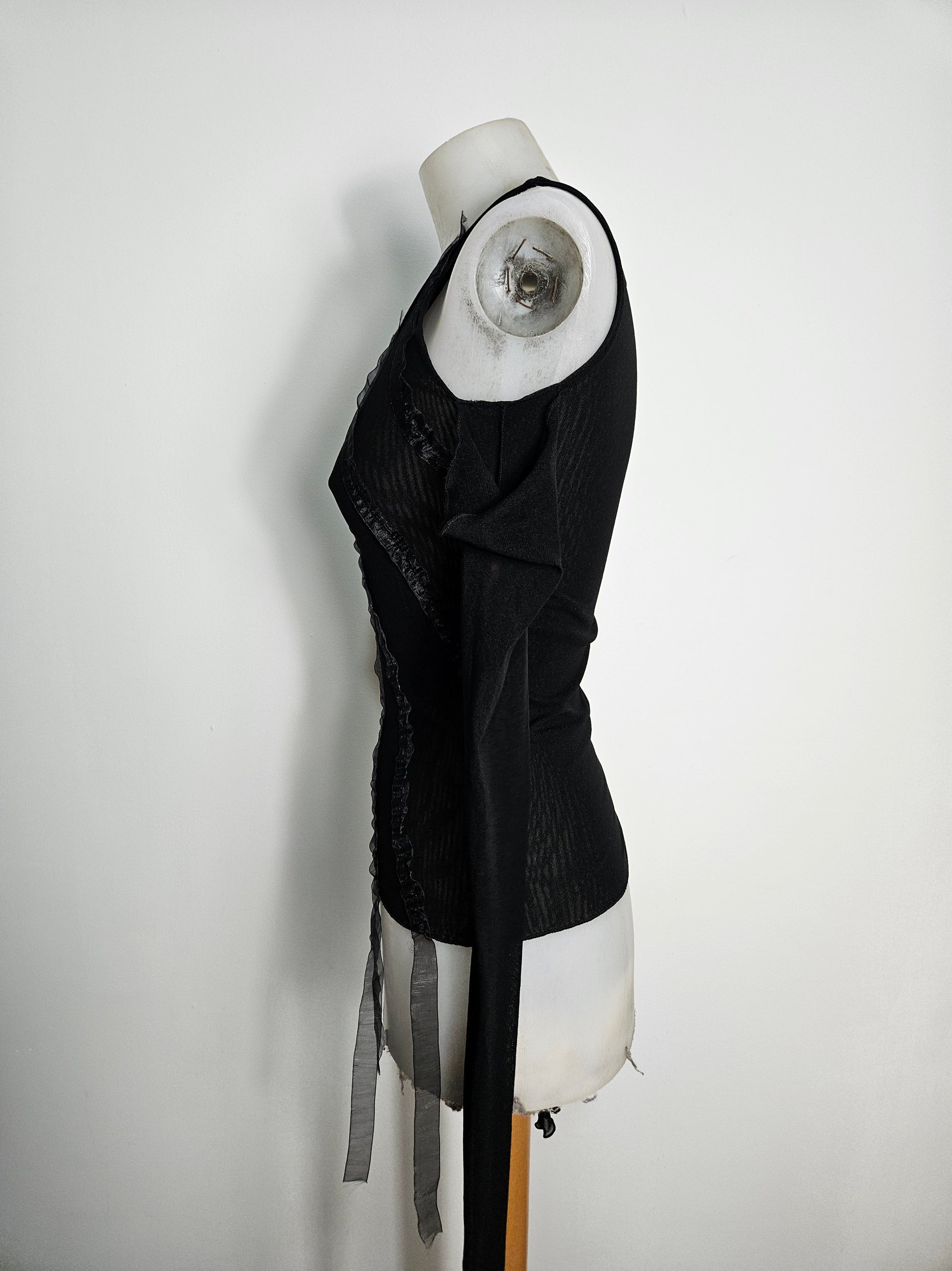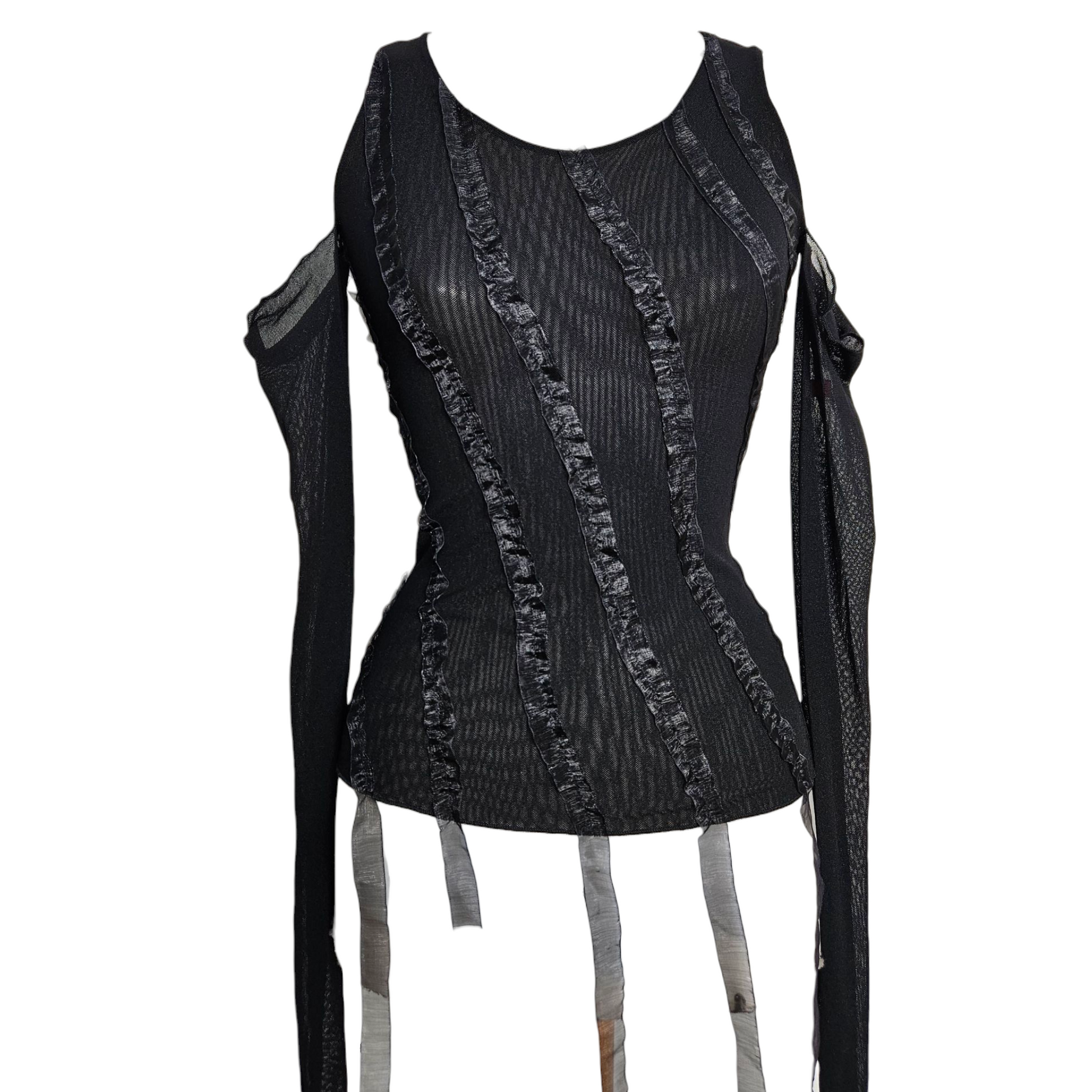 - Bandes verticales texturées avec volants satinés transversales sur le buste