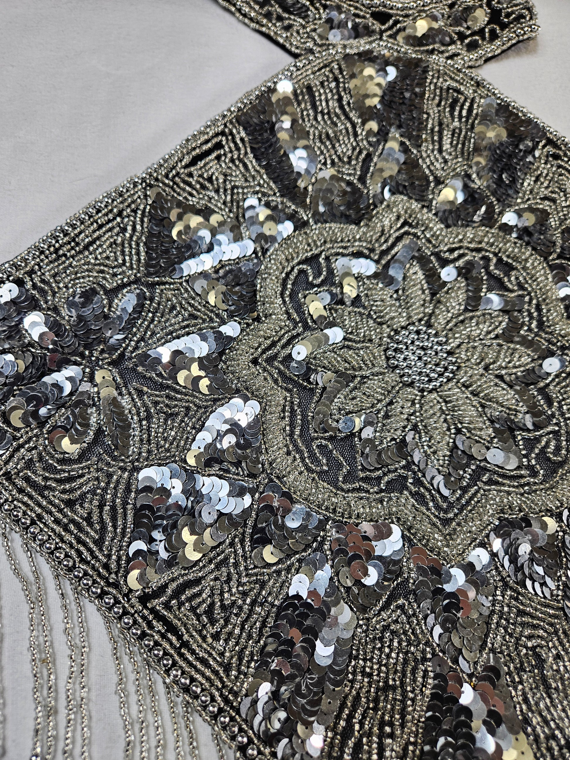 - Les sequins sont argentés avec des reflets dans les mêmes tons.