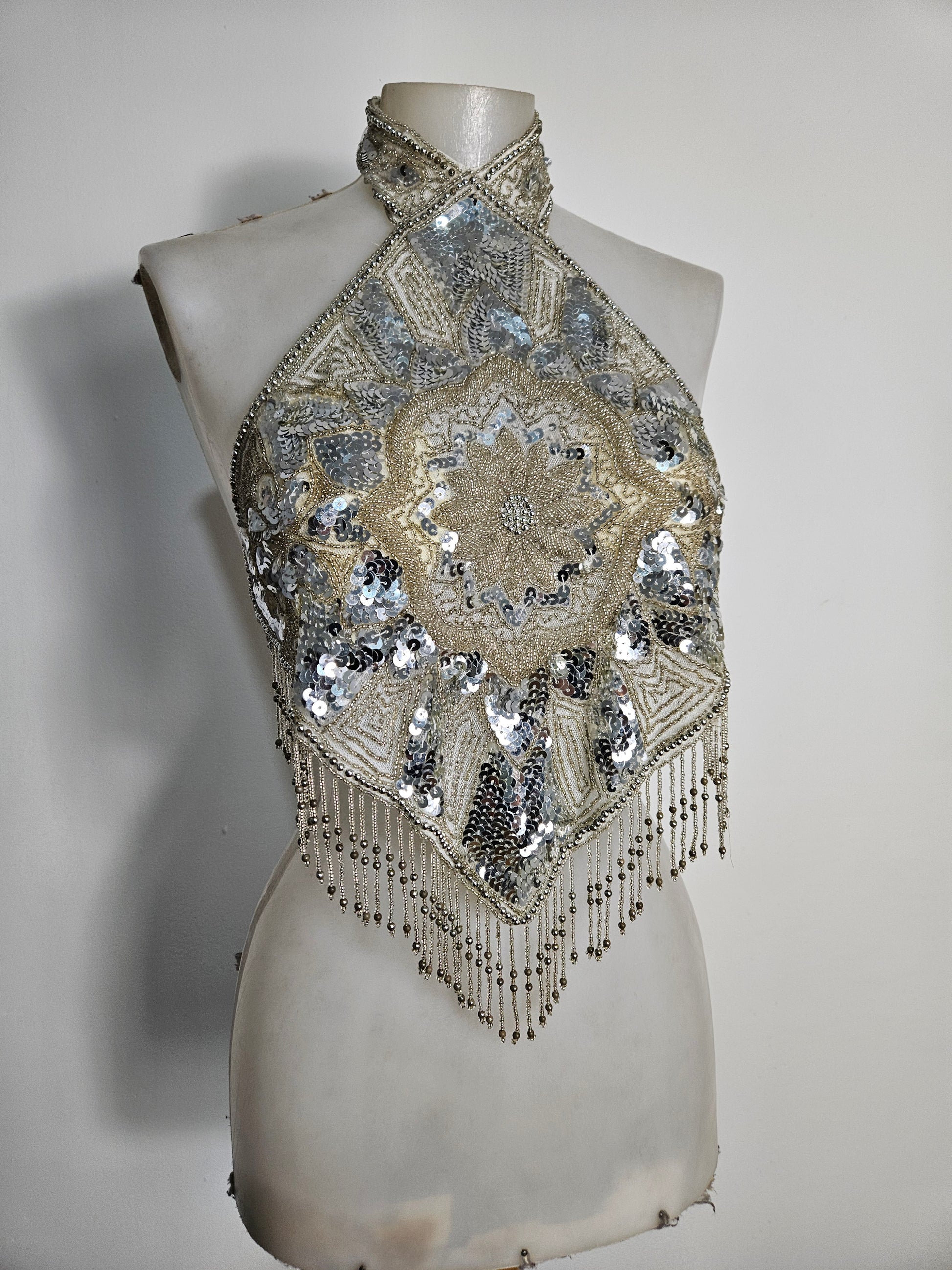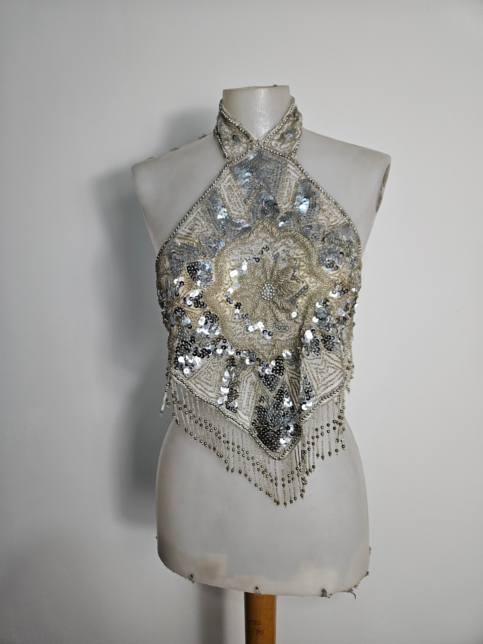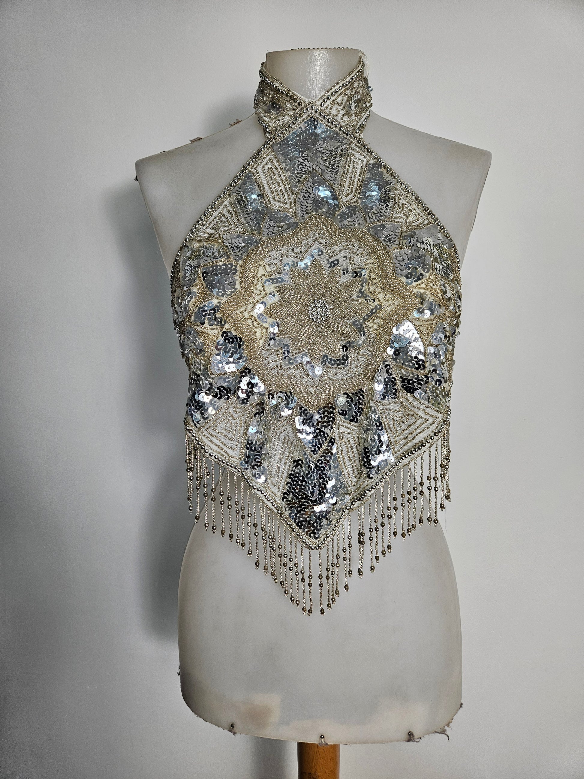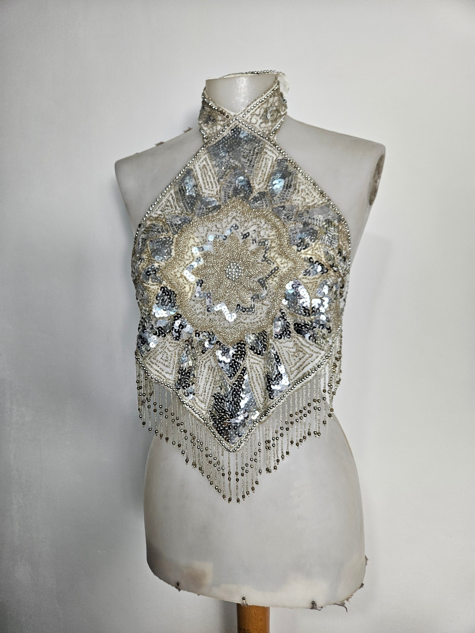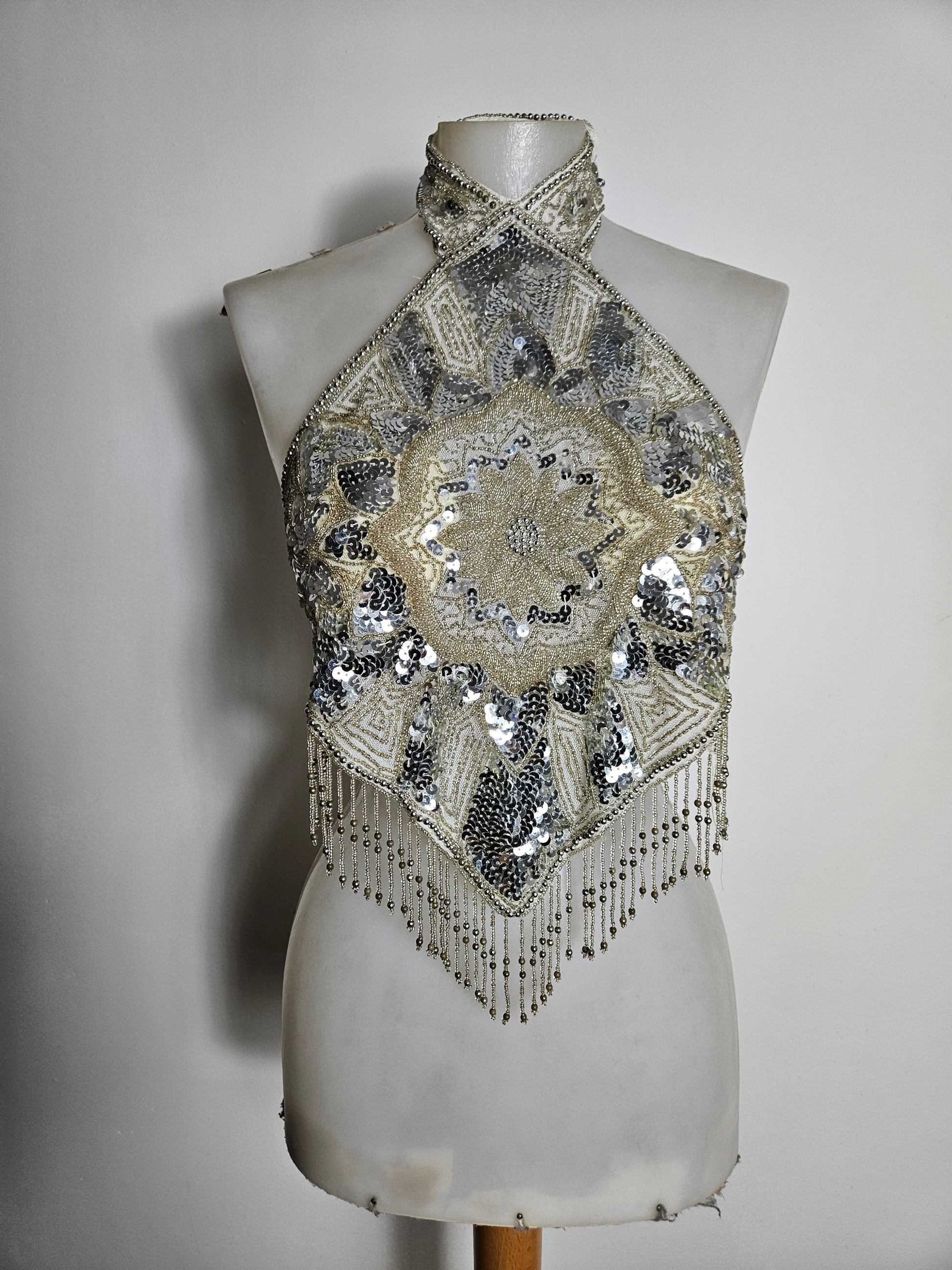 - Haut en voile brodé de perles et sequins en motifs d'arabesques.