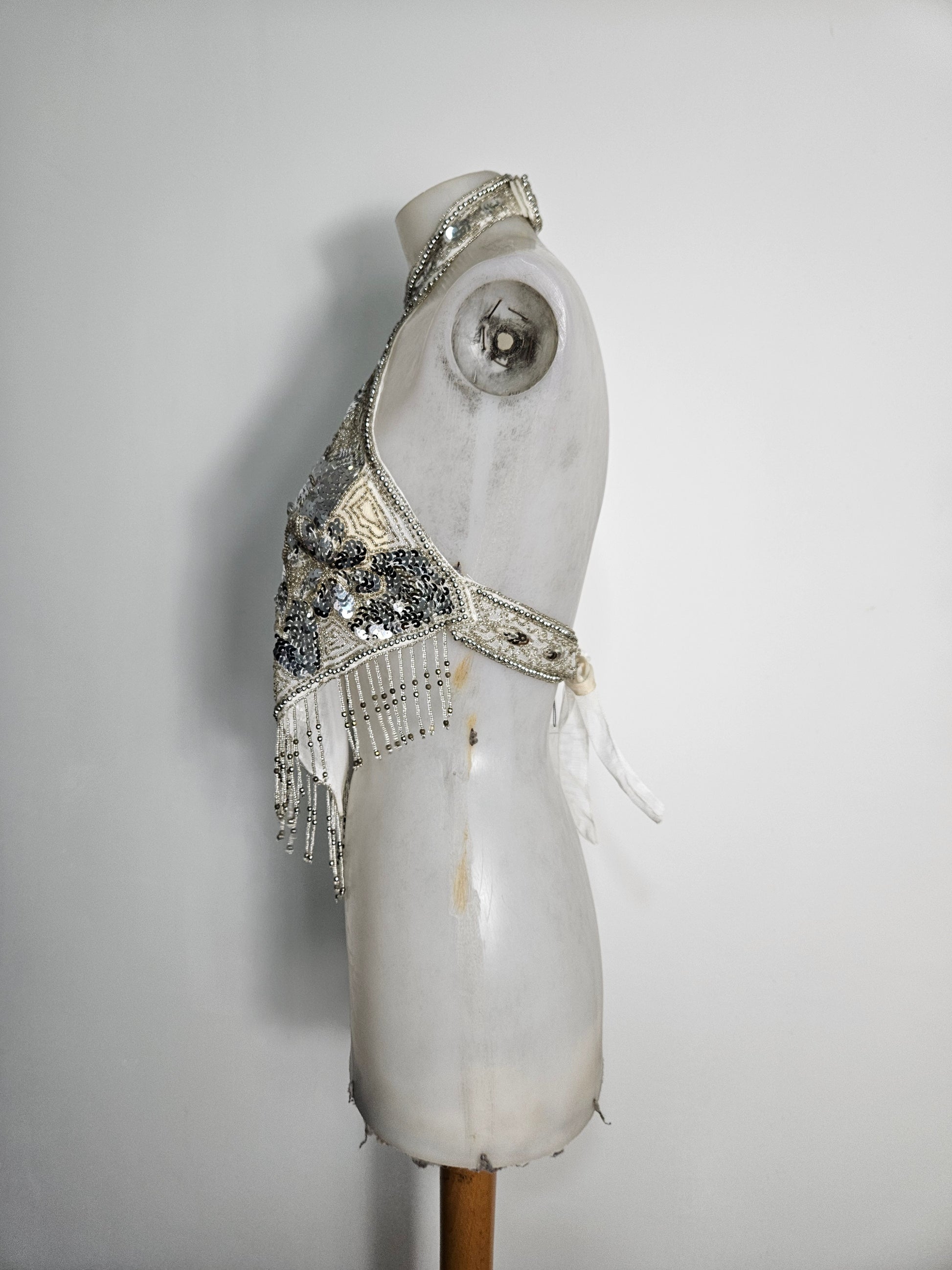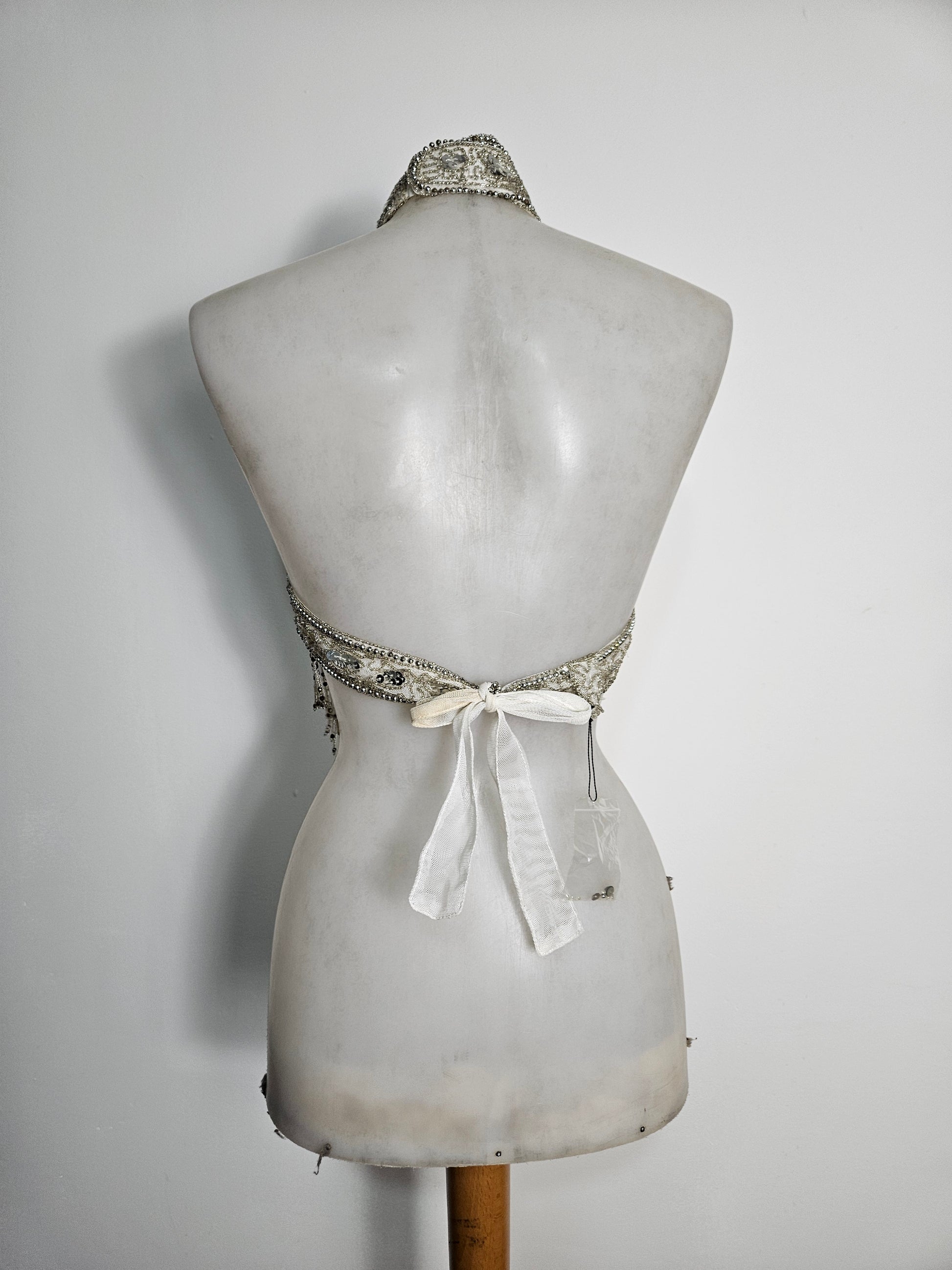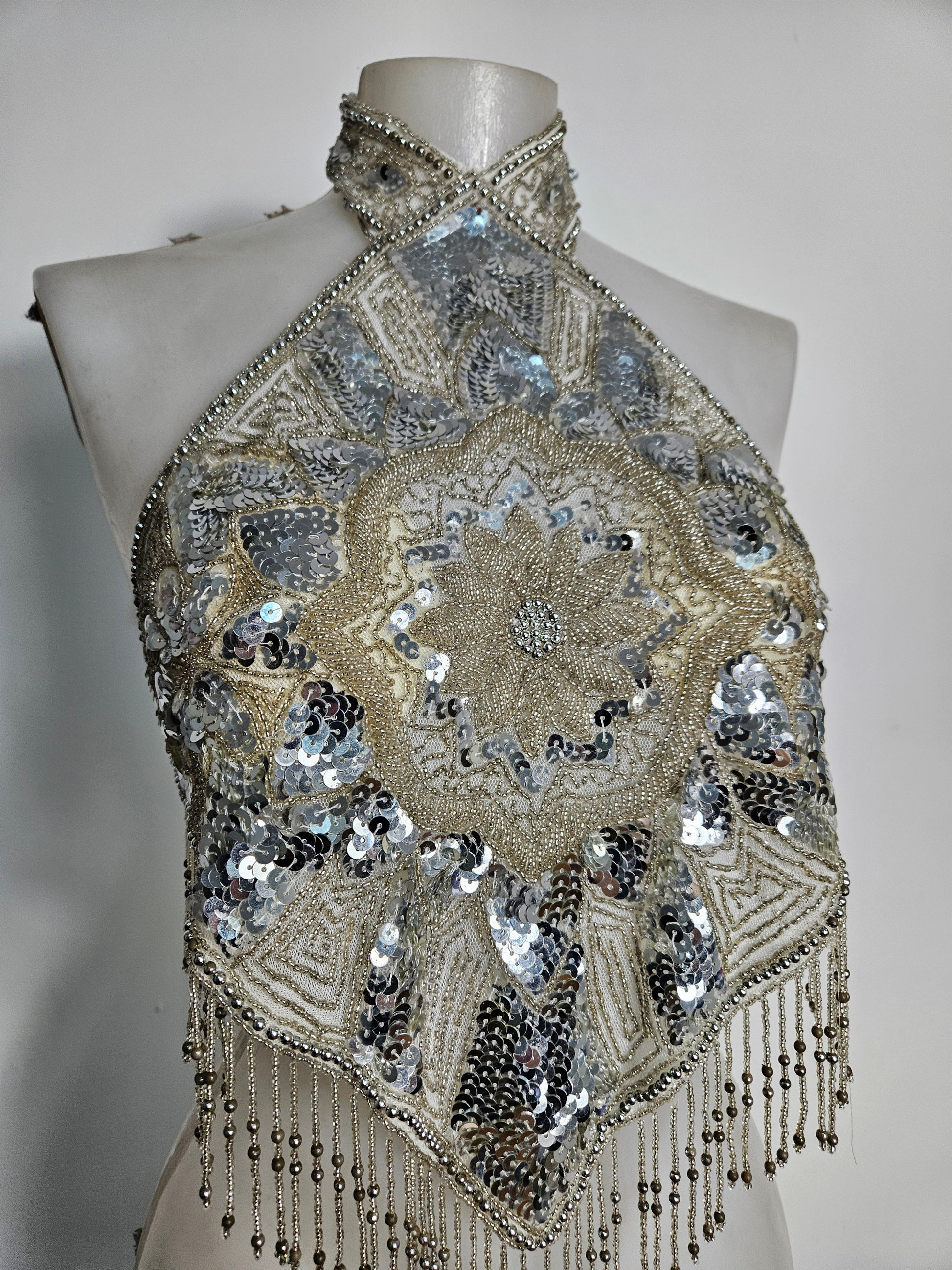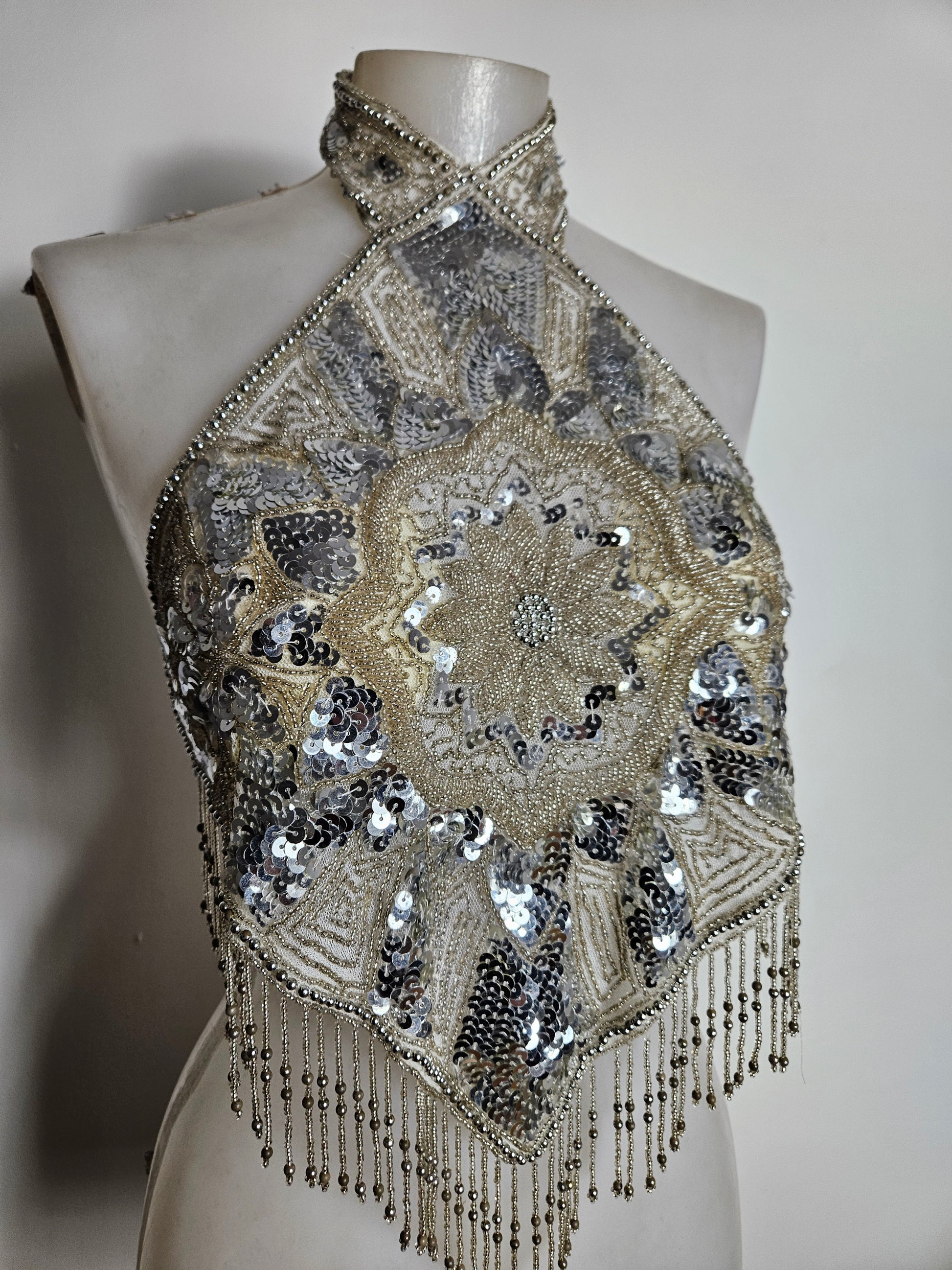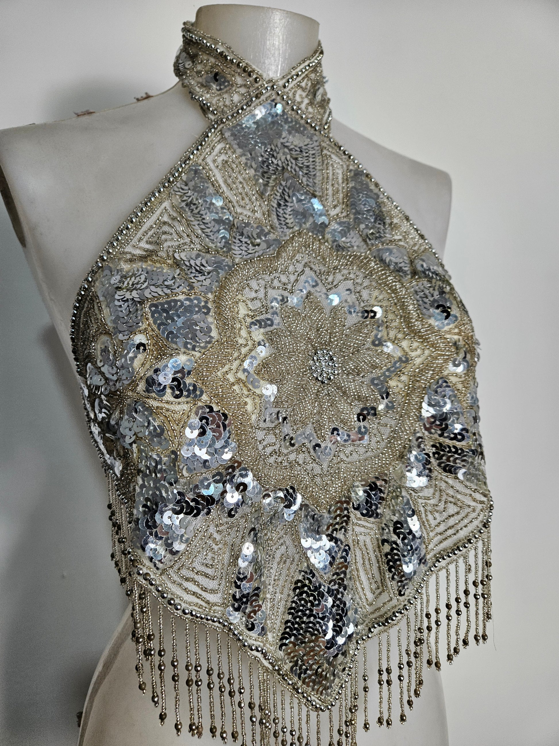 - Haut en voile brodé de perles et sequins en motifs d'arabesques.