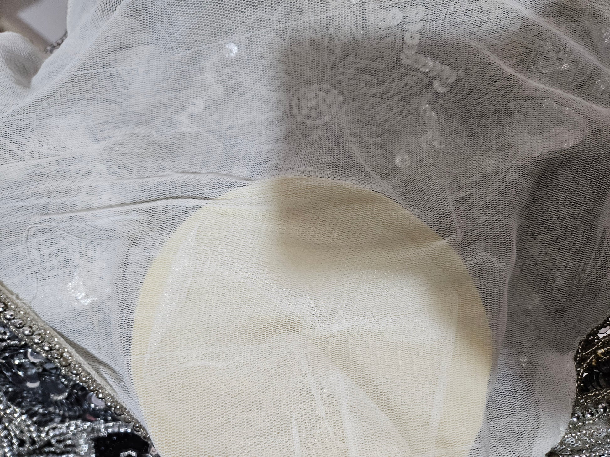 - Les sequins sont blanc et argentés avec des reflets dans les mêmes tons.