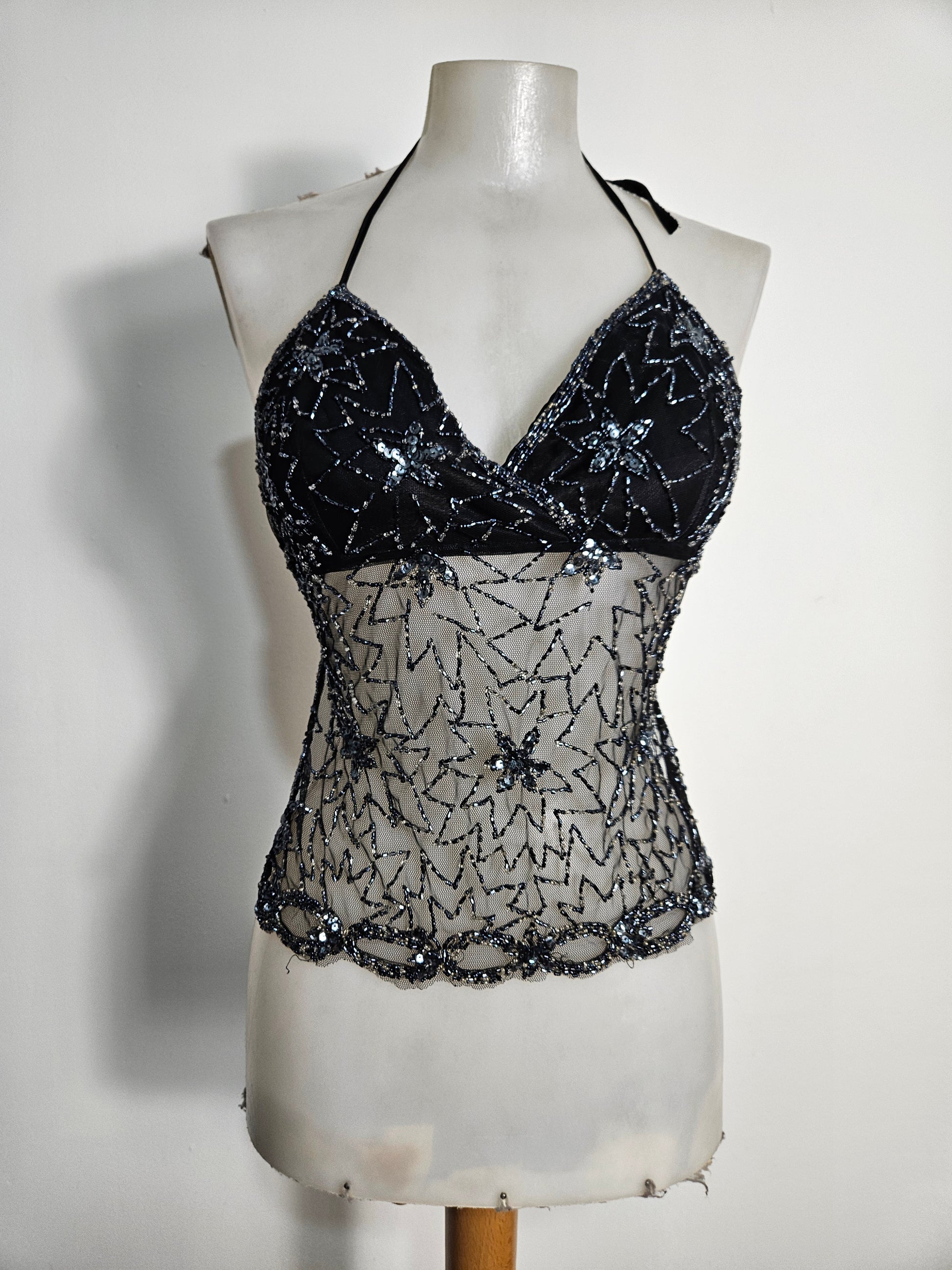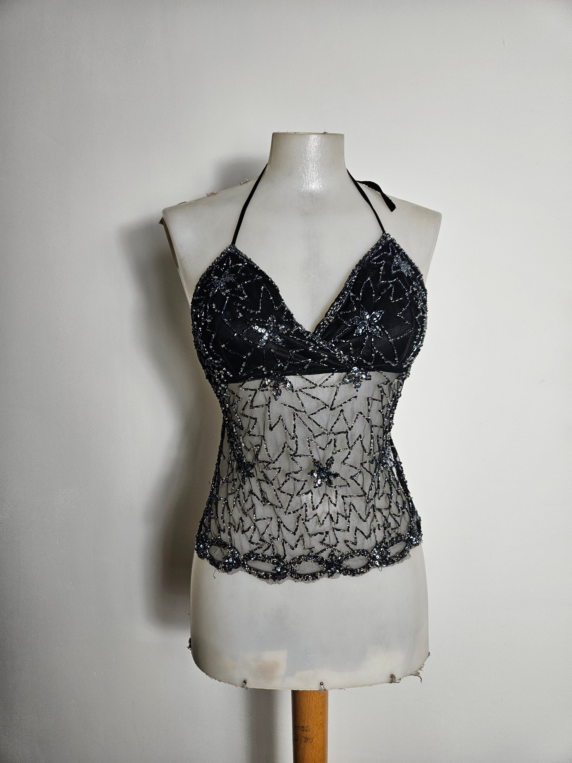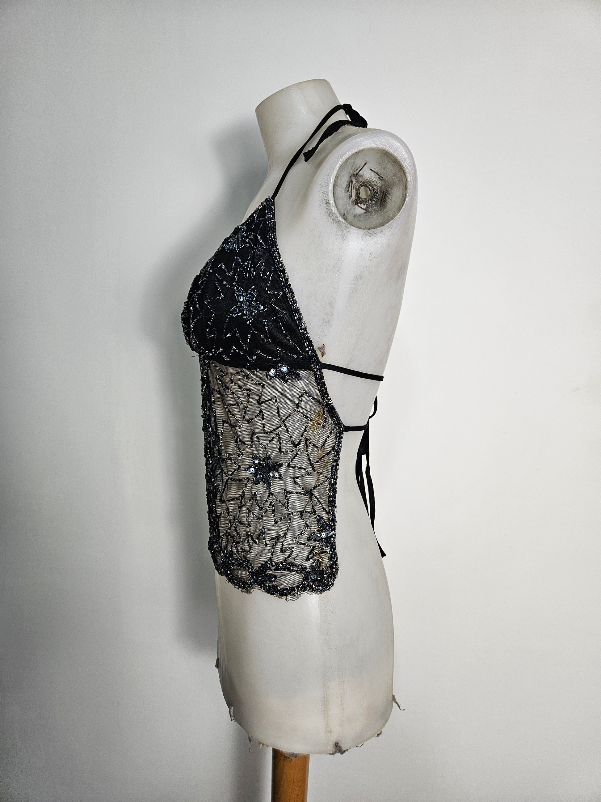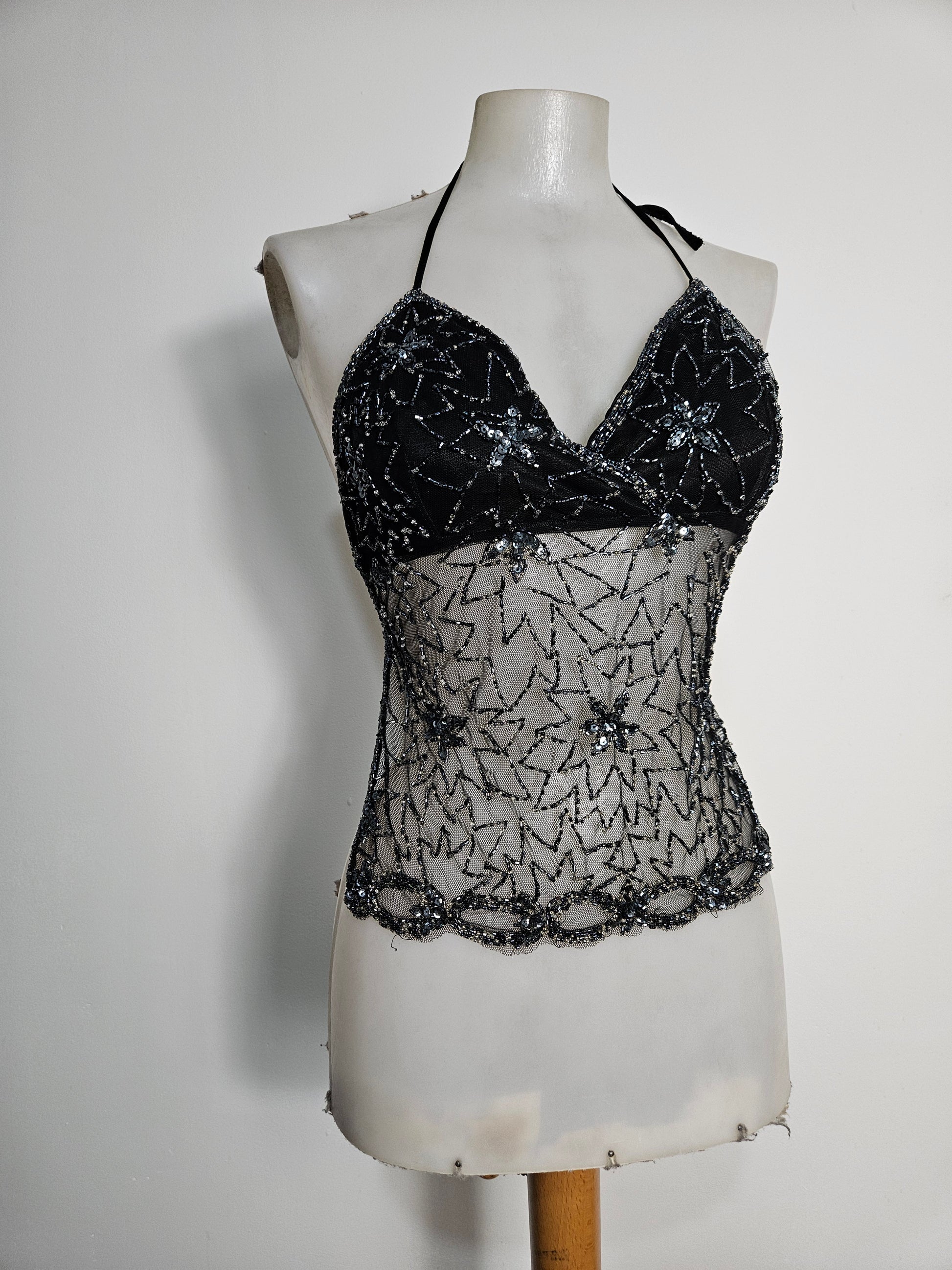 - Haut dos nu noir transparent avec perles et sequins argentés