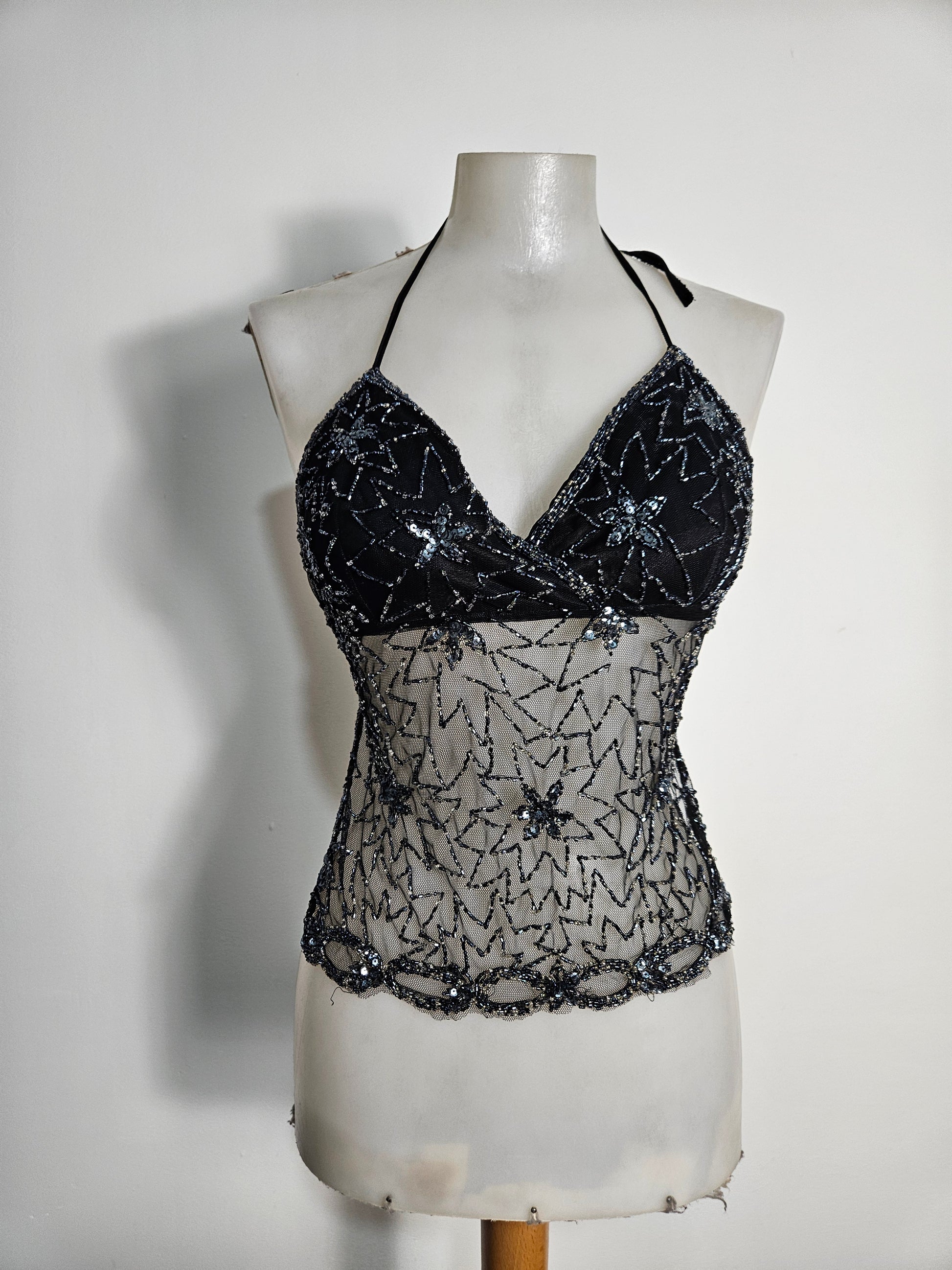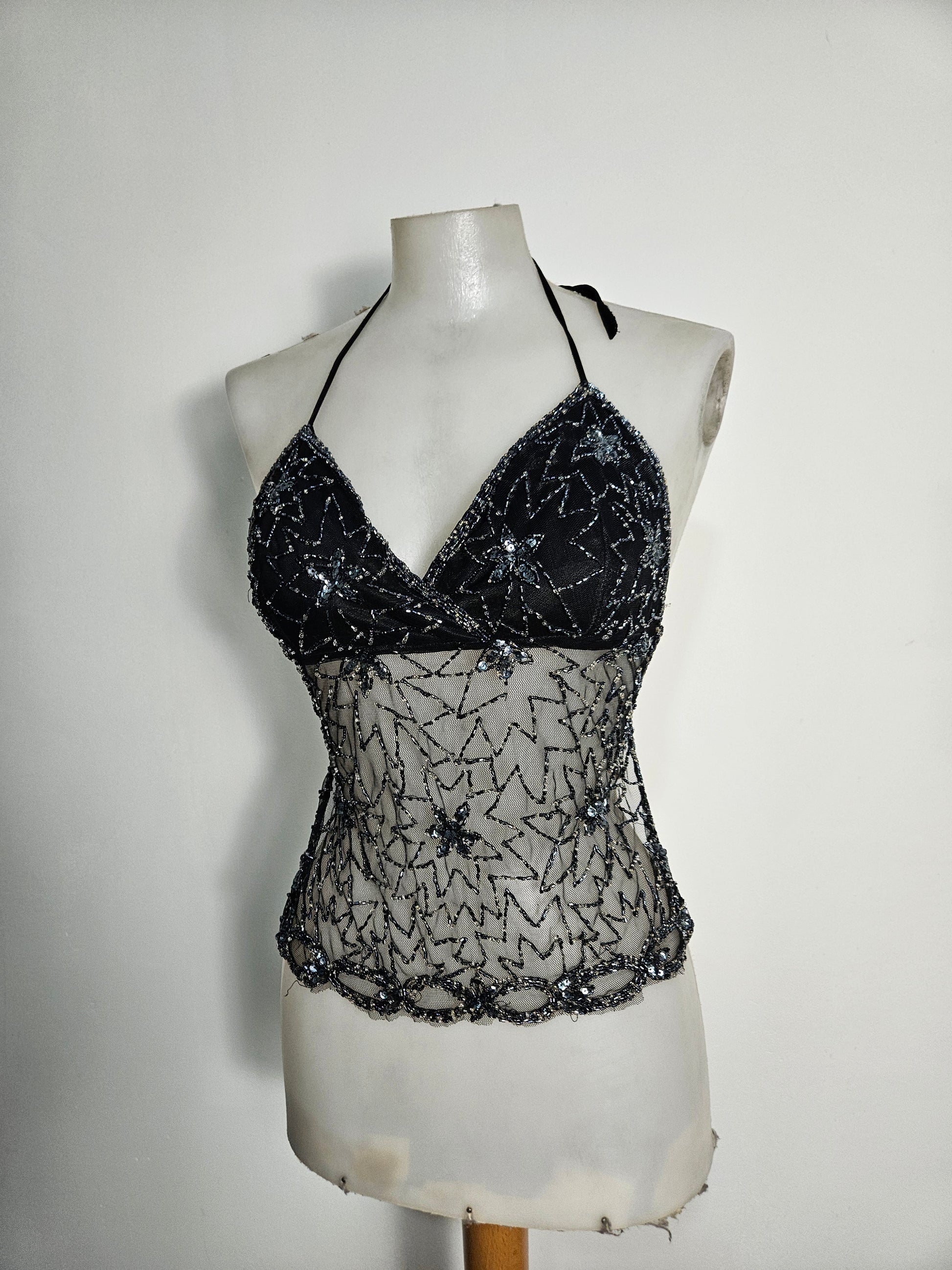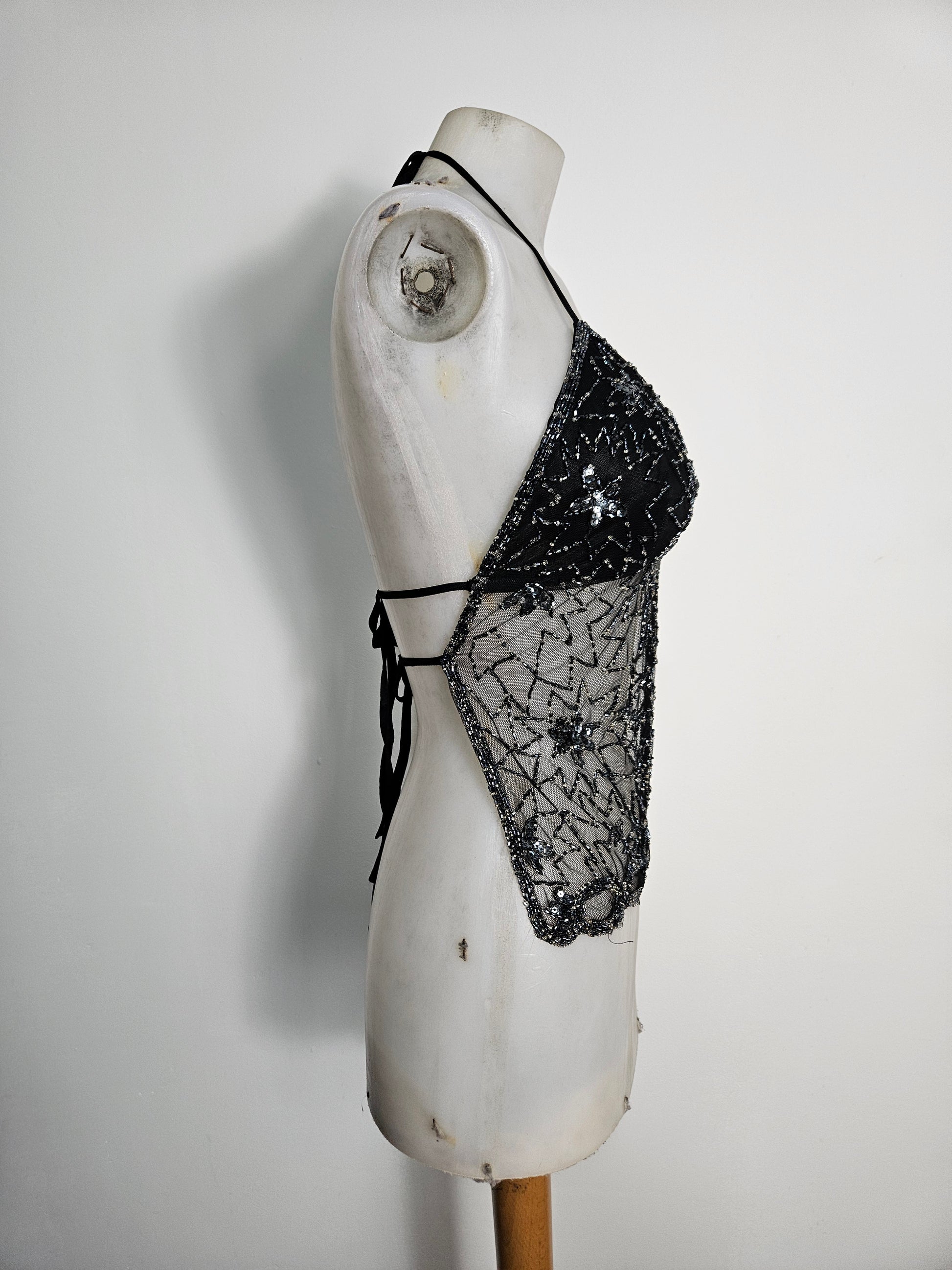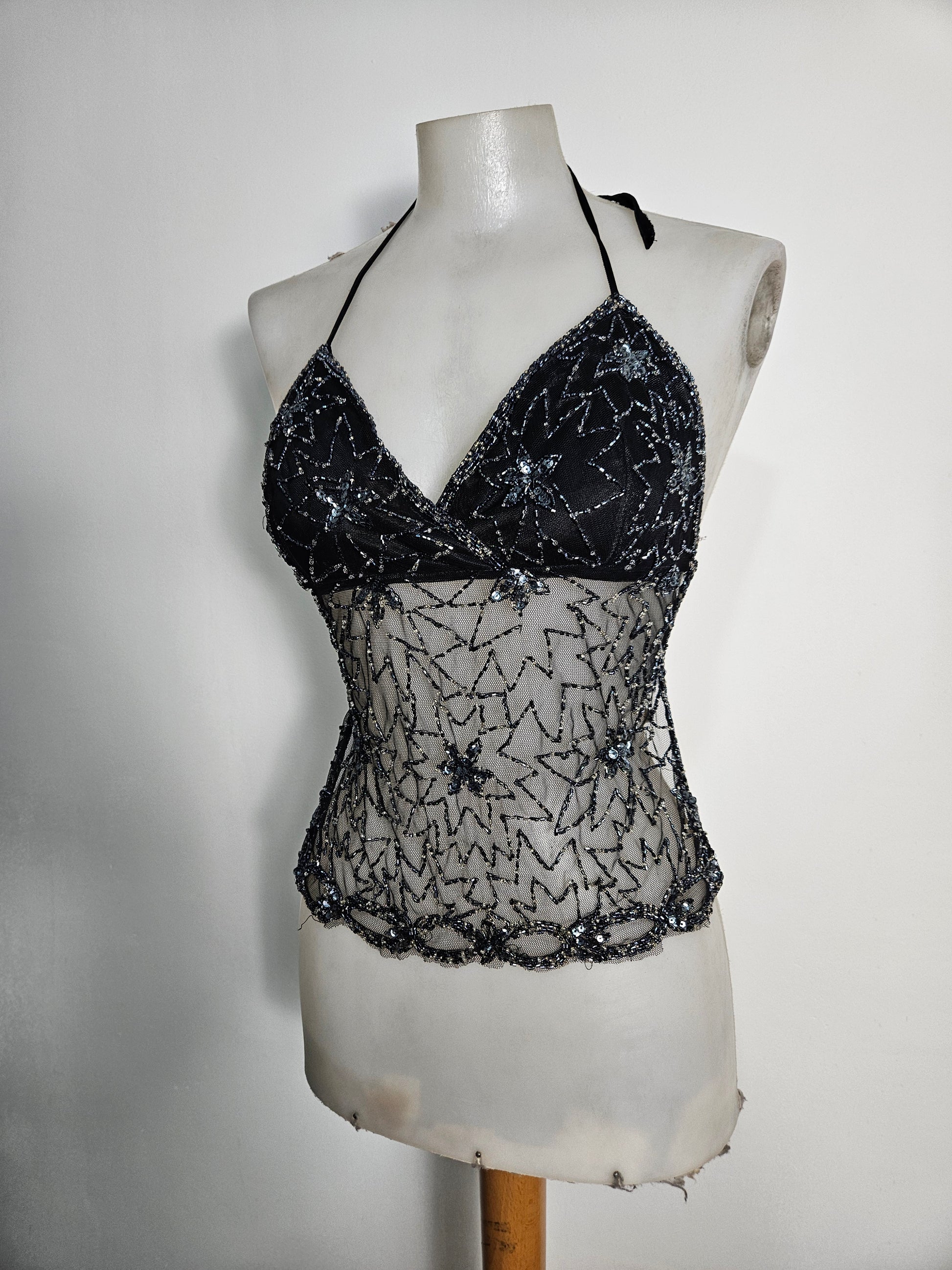 - Haut dos nu noir transparent avec perles et sequins argentés