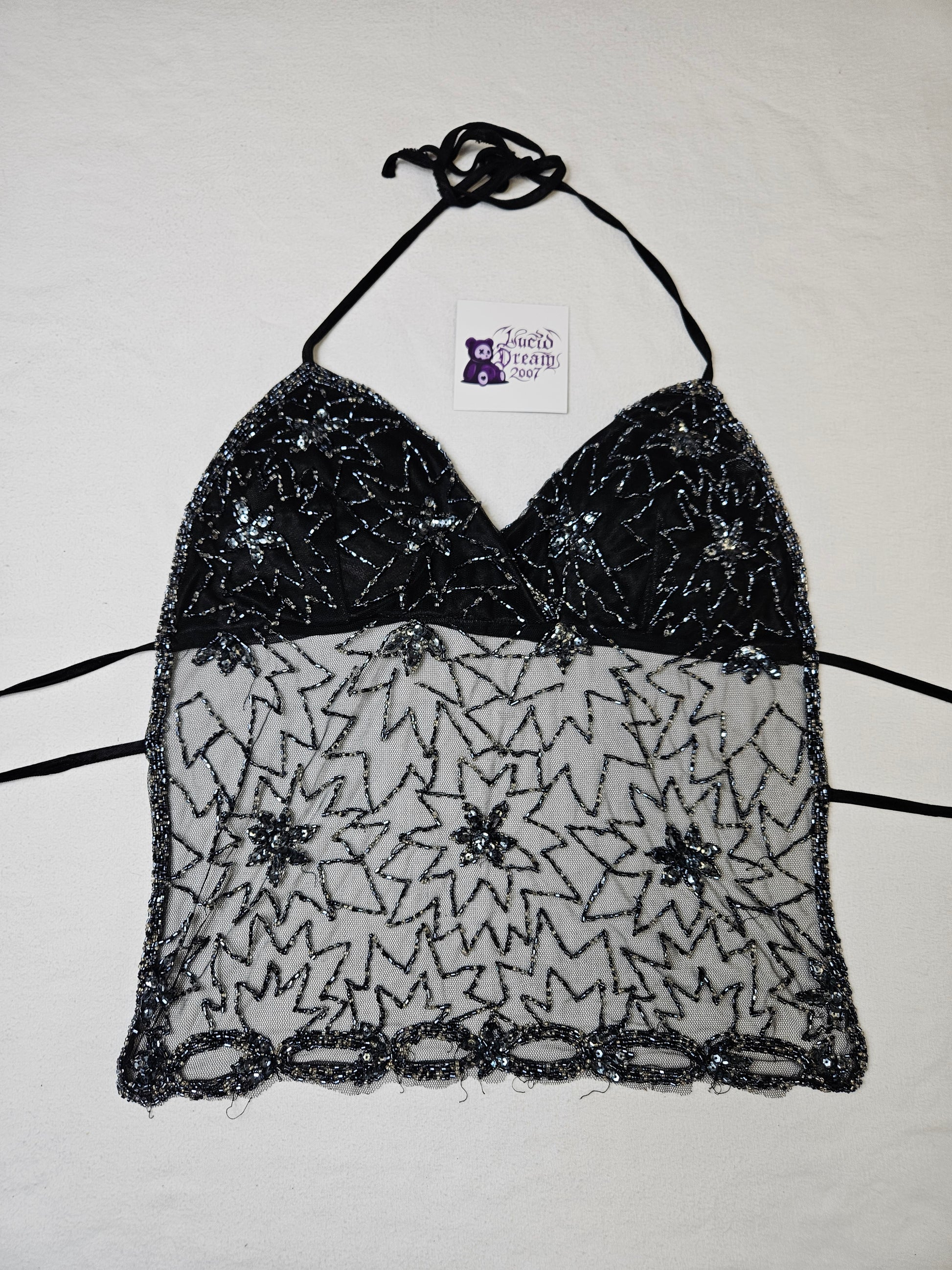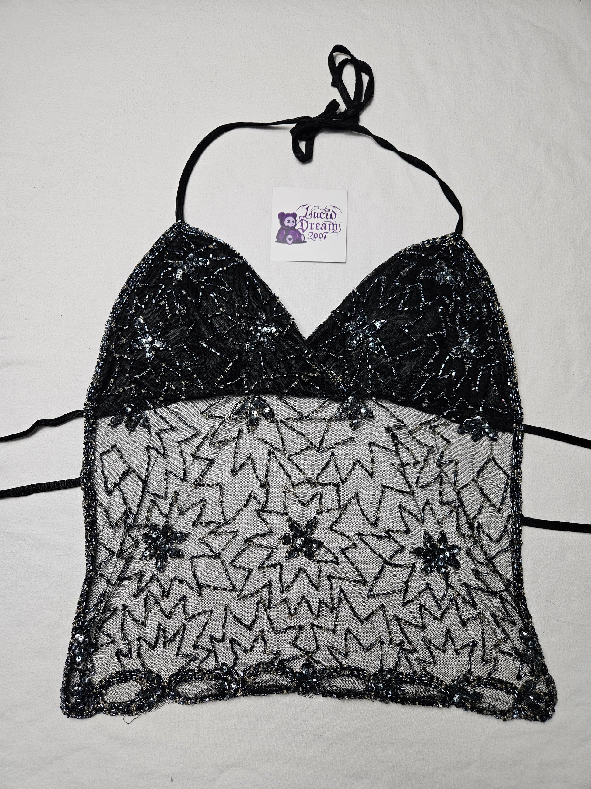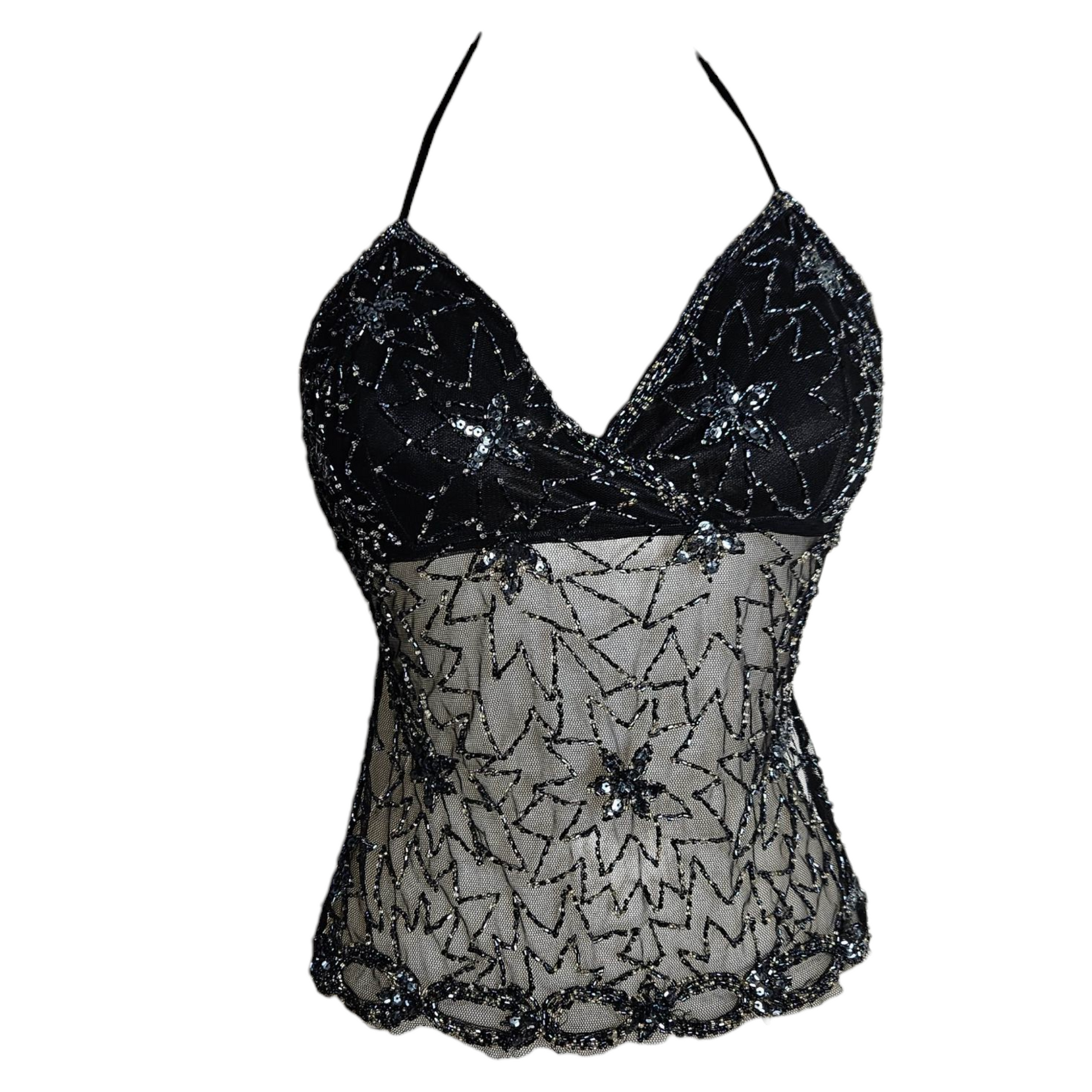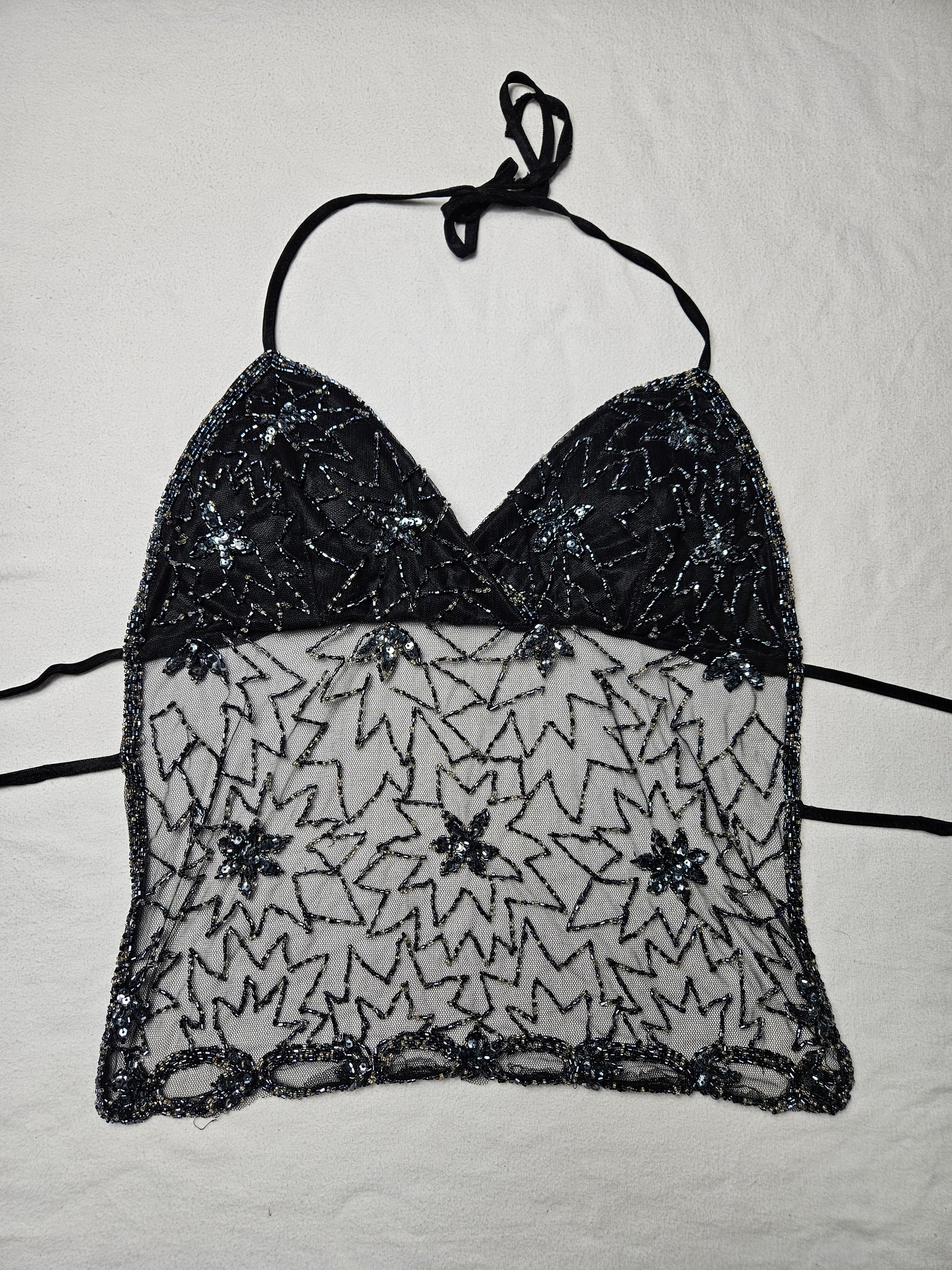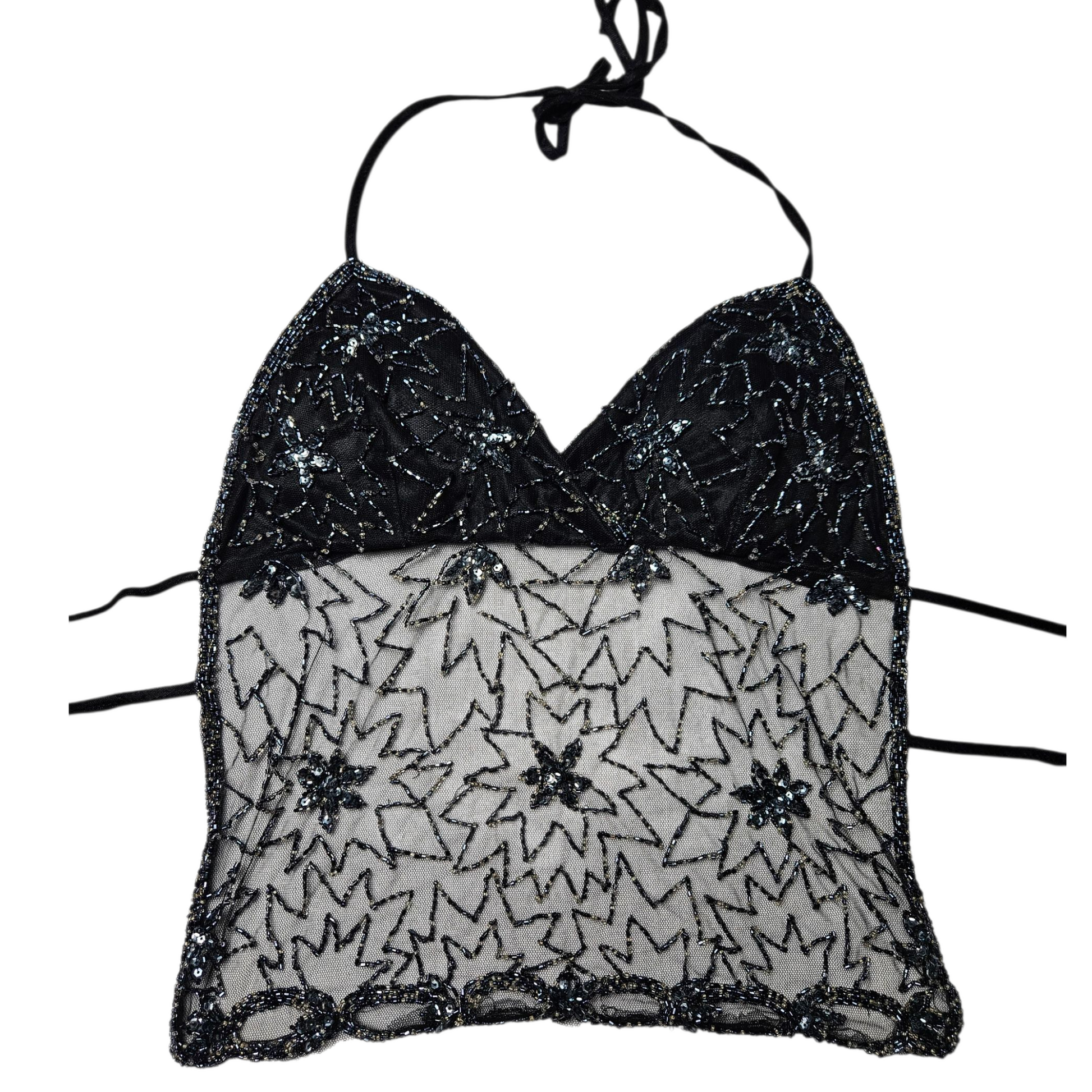 - Haut dos nu noir transparent avec perles et sequins argentés