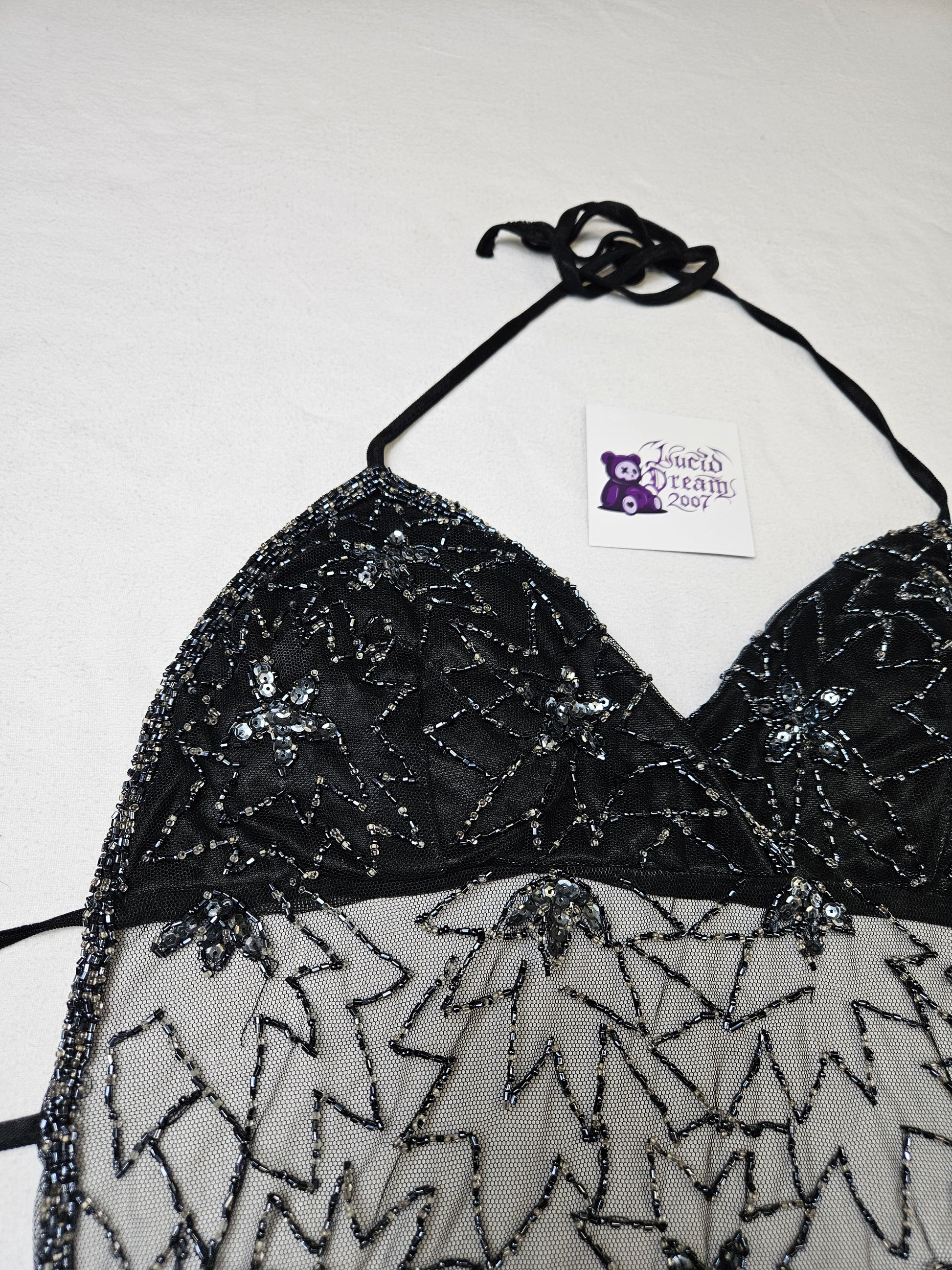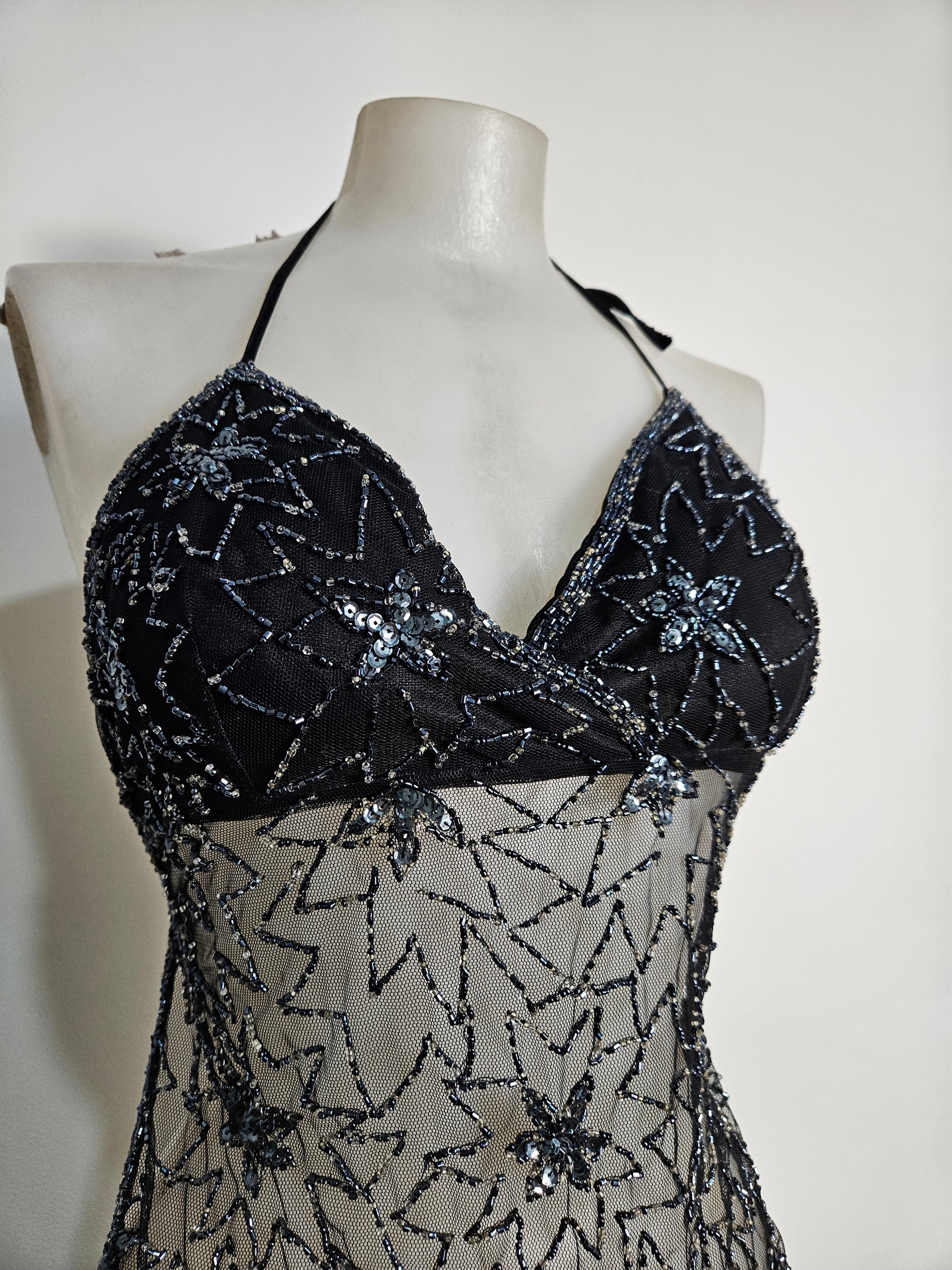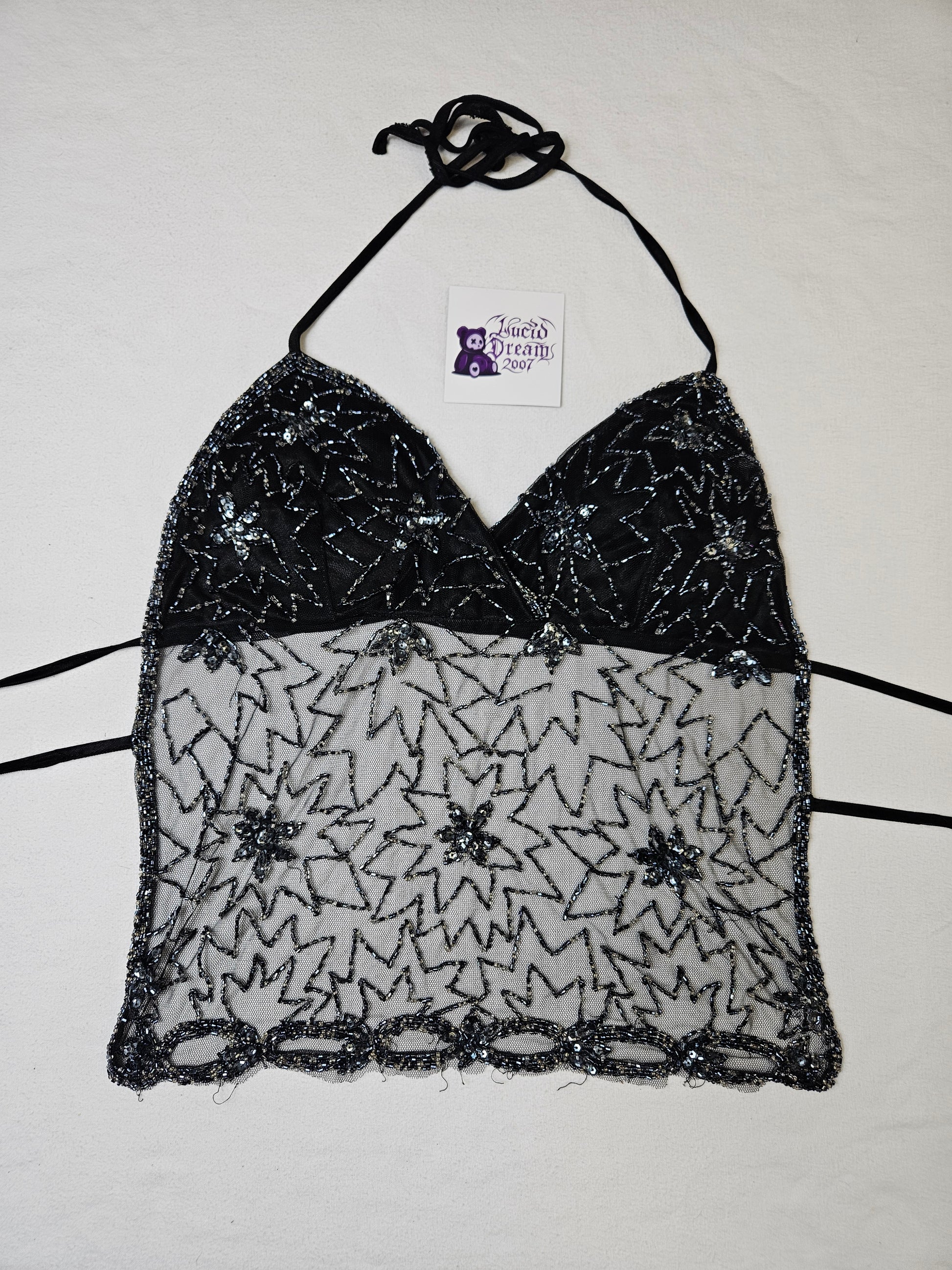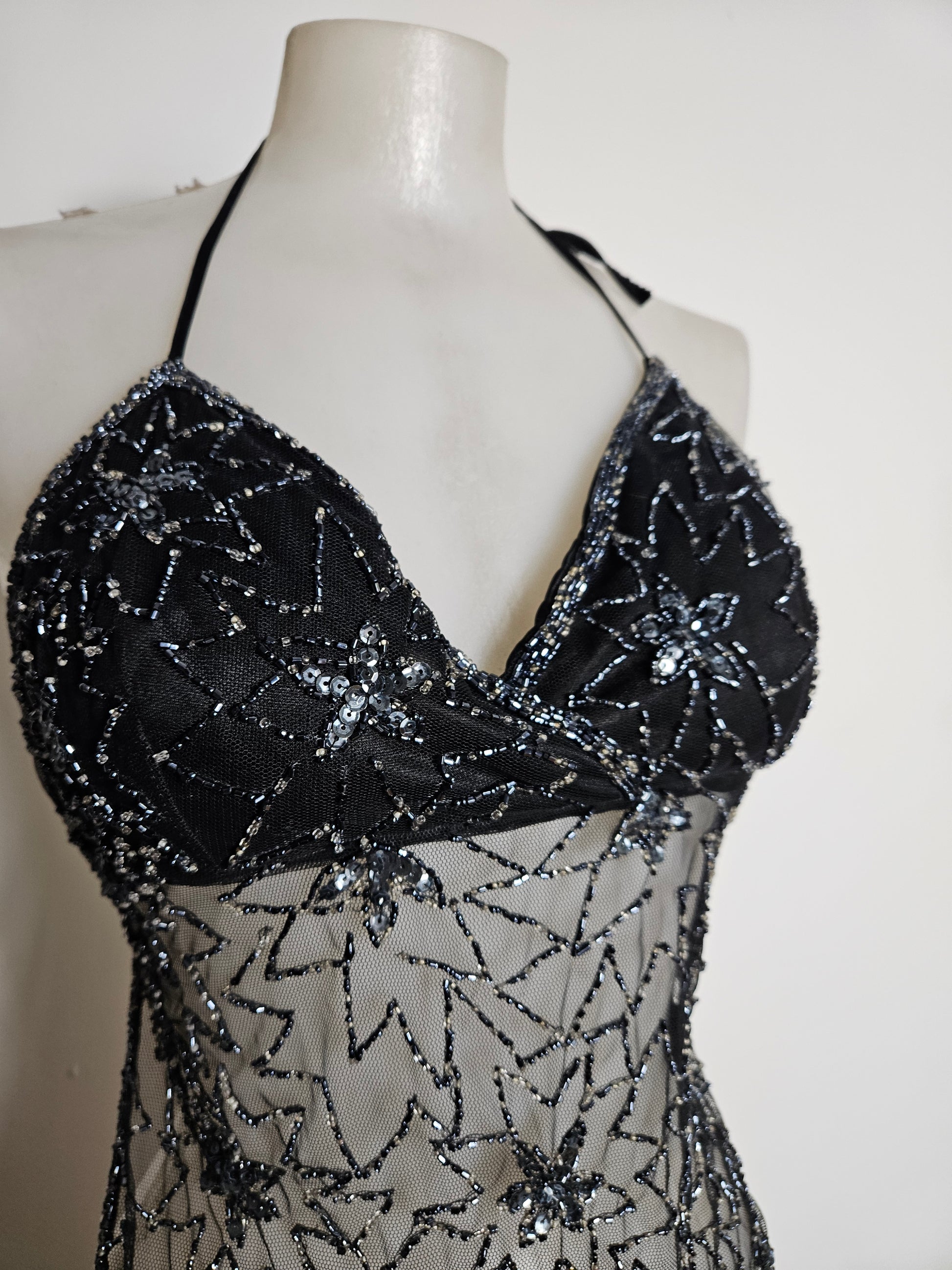 - Haut dos nu noir transparent avec perles et sequins argentés