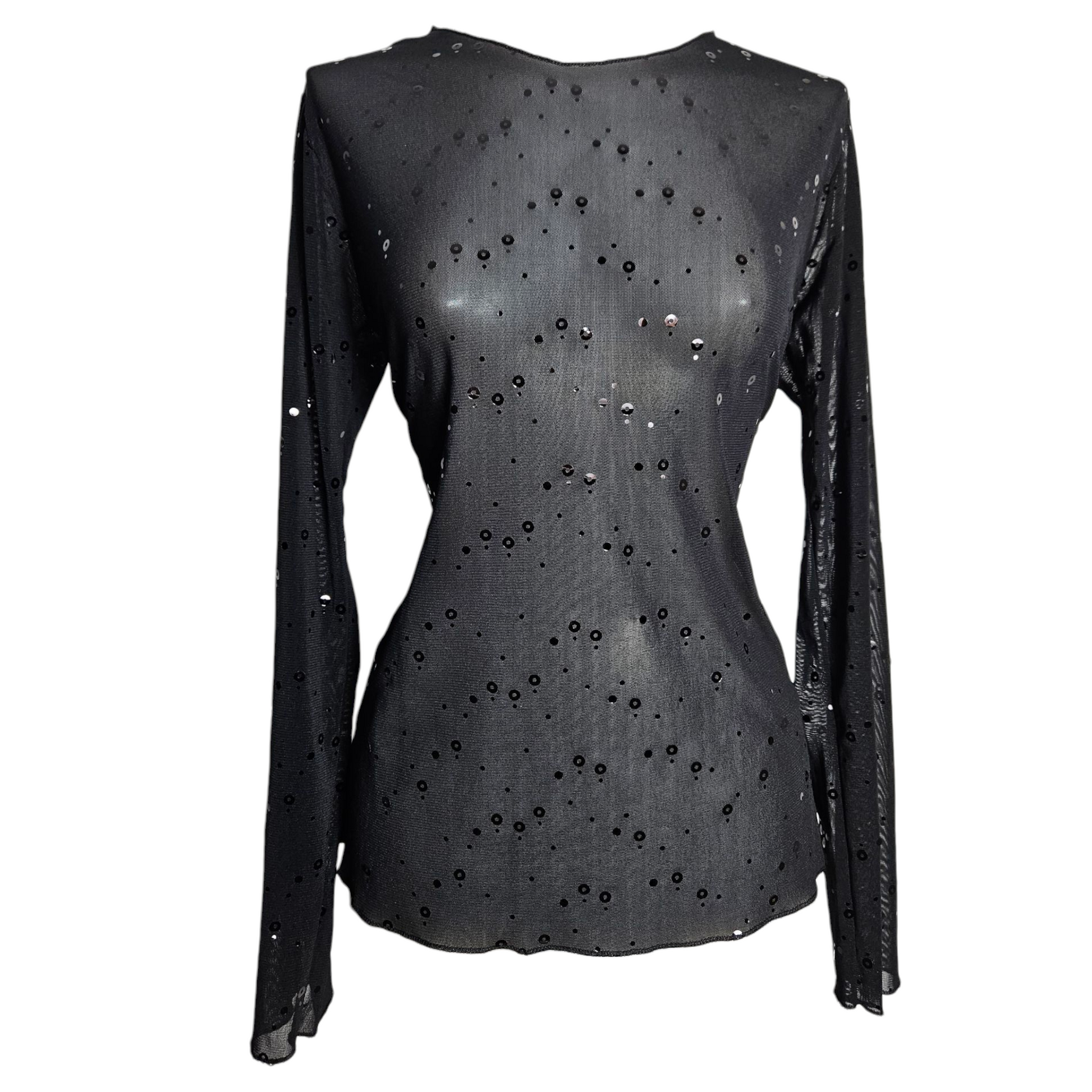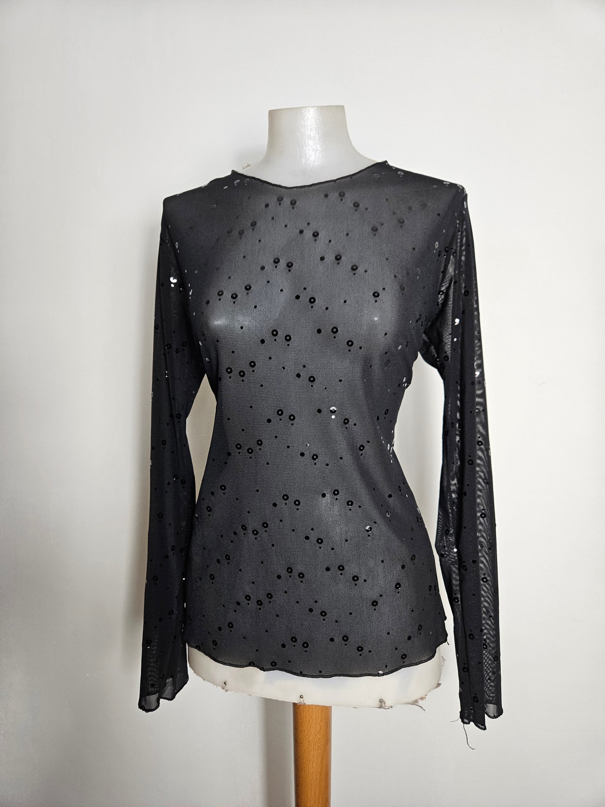 - Orné de sequins noirs cousus de manière dispersée sur l’ensemble du tissu.