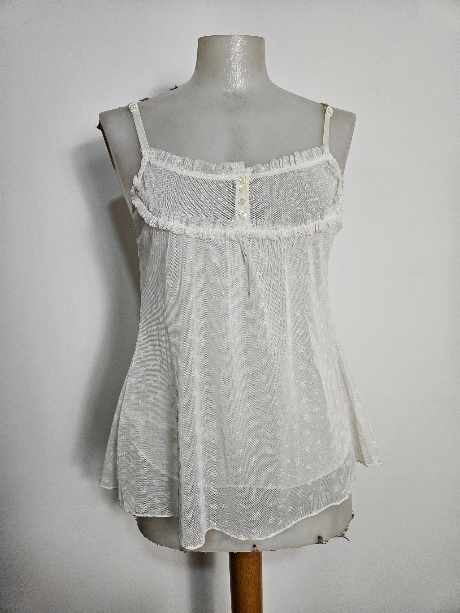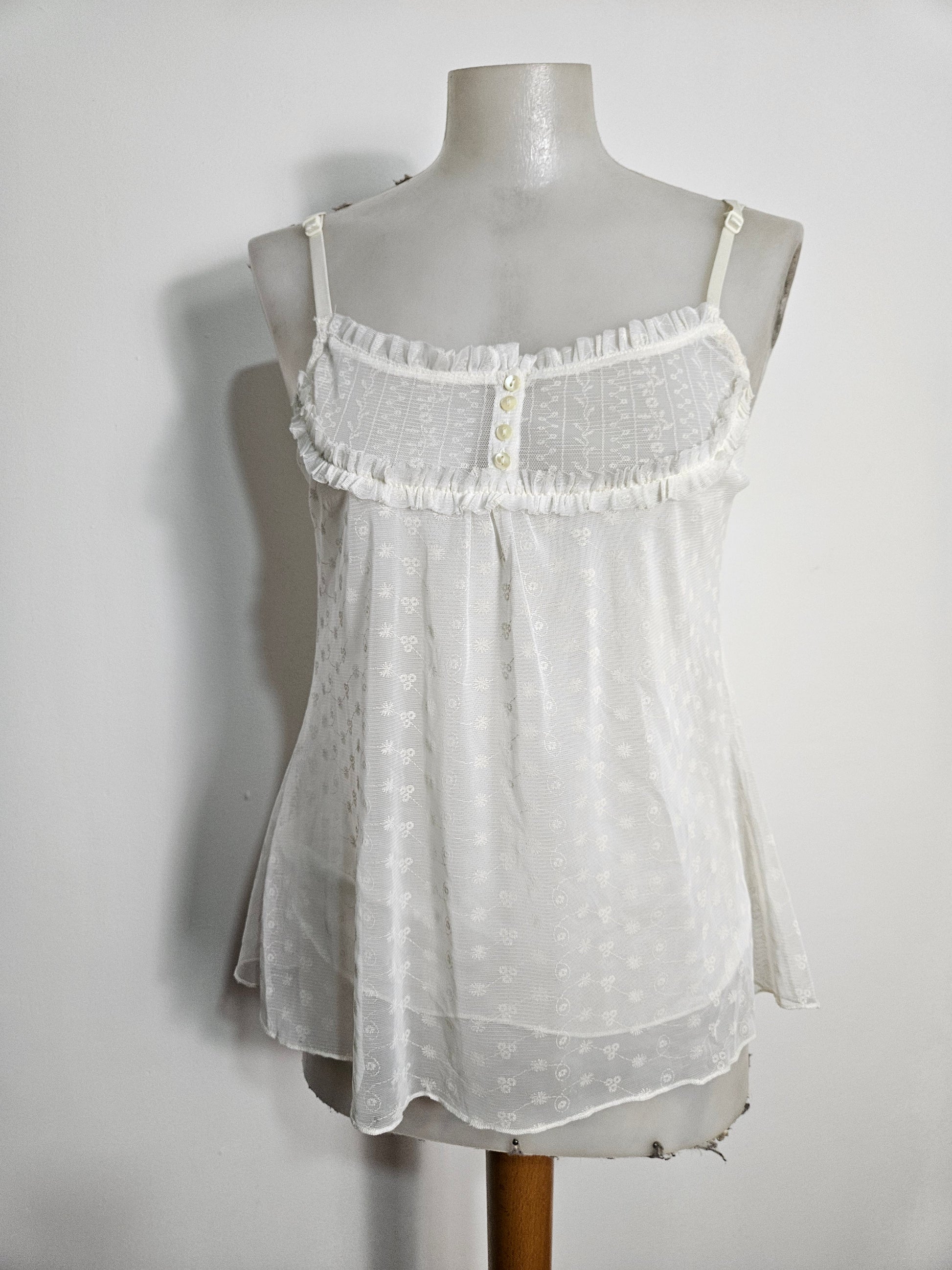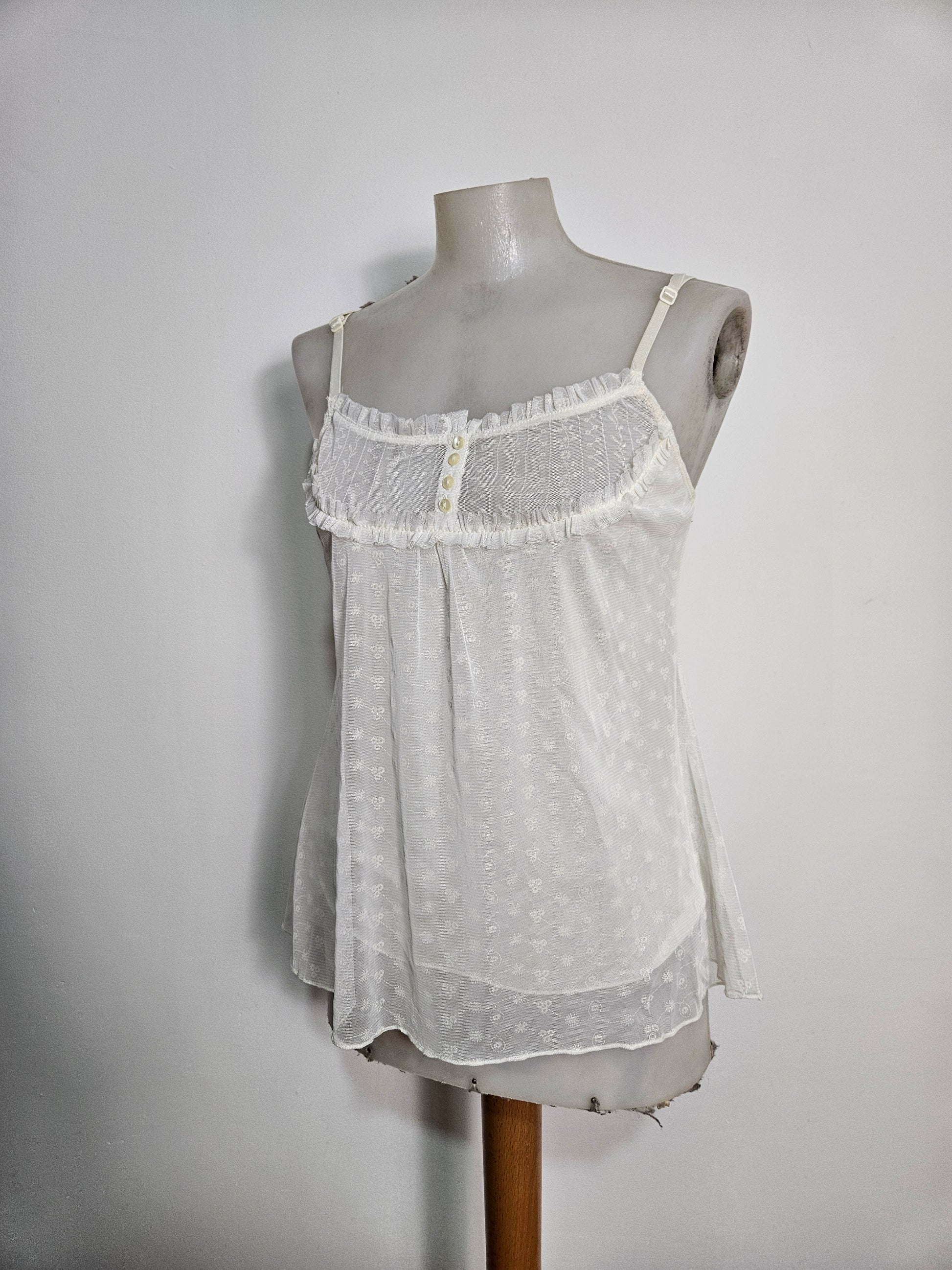 - Top blanc cassé / ivoire à fines bretelles en dentelle brodée