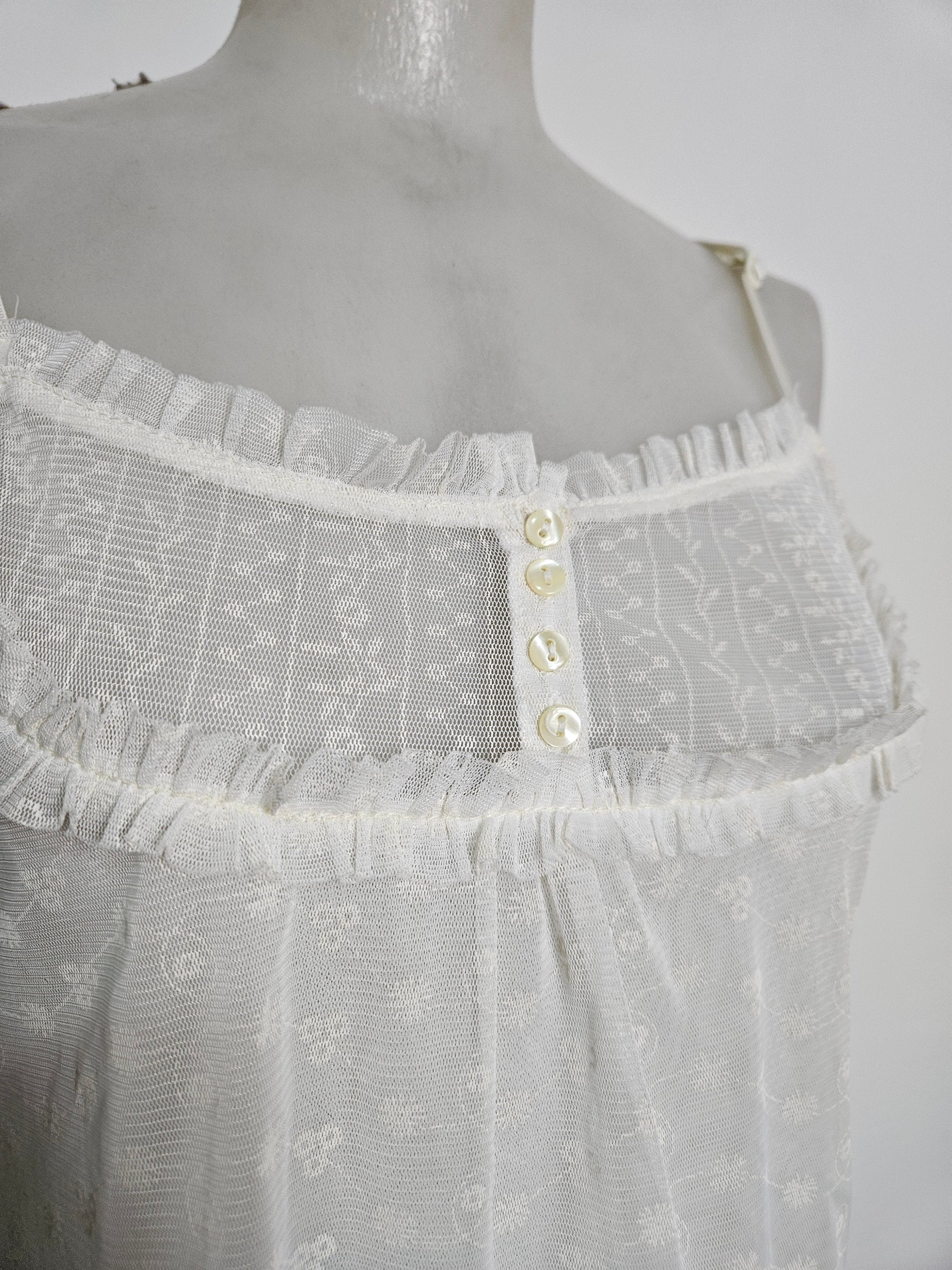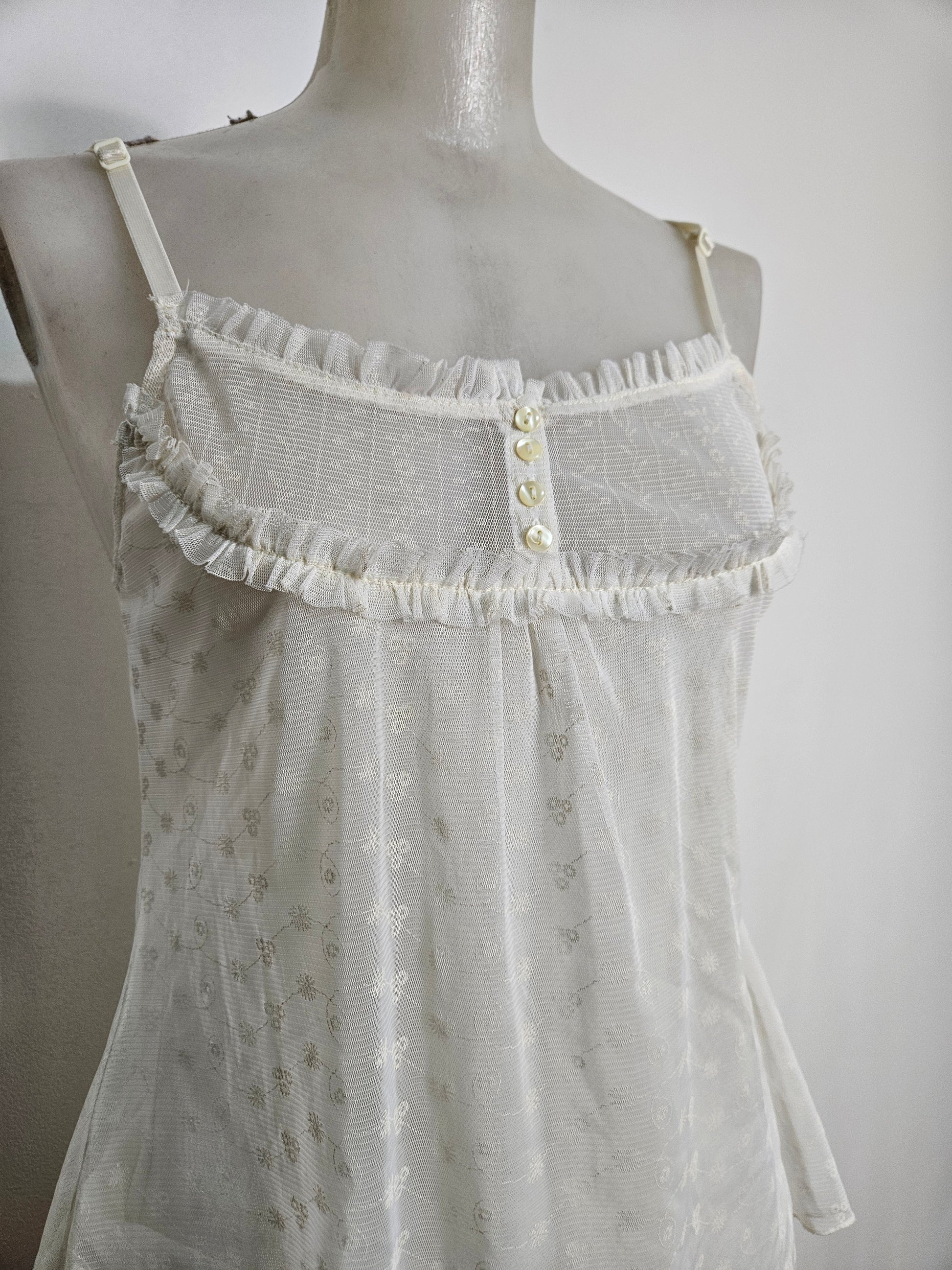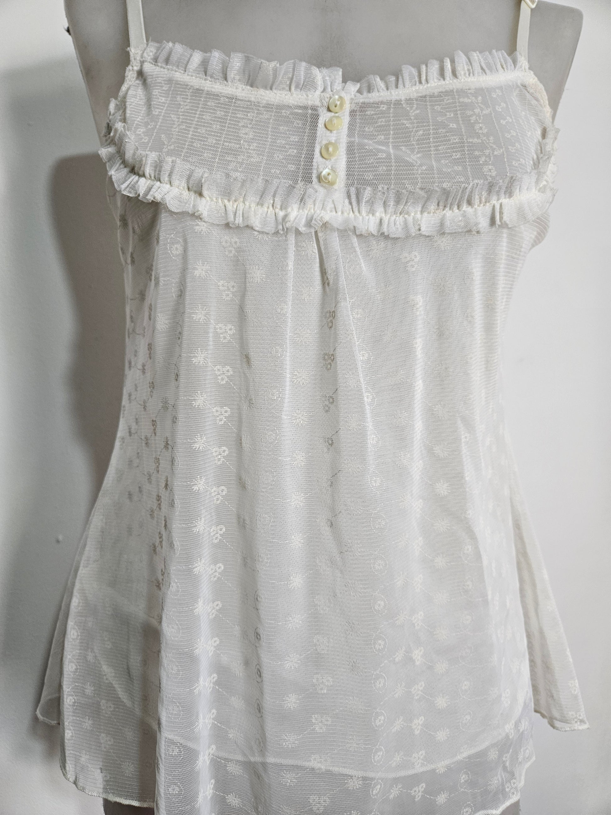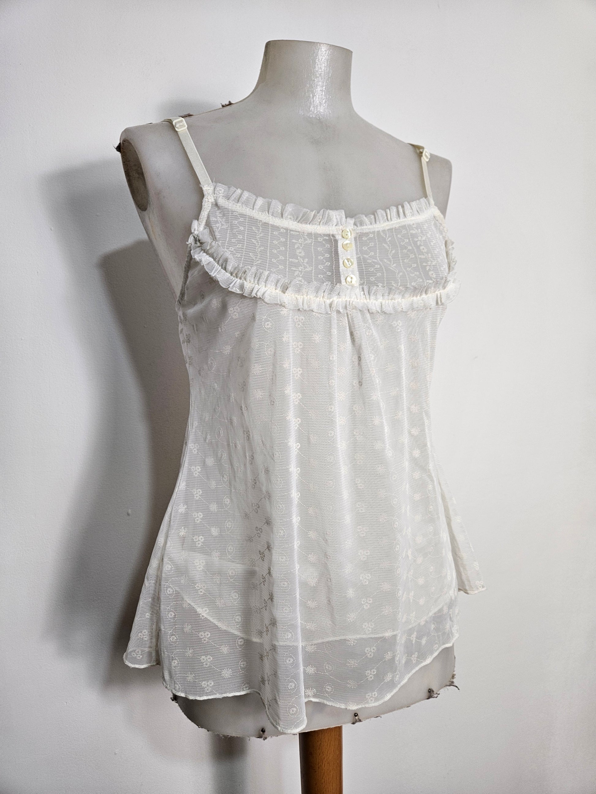 - Top blanc cassé / ivoire à fines bretelles en dentelle brodée