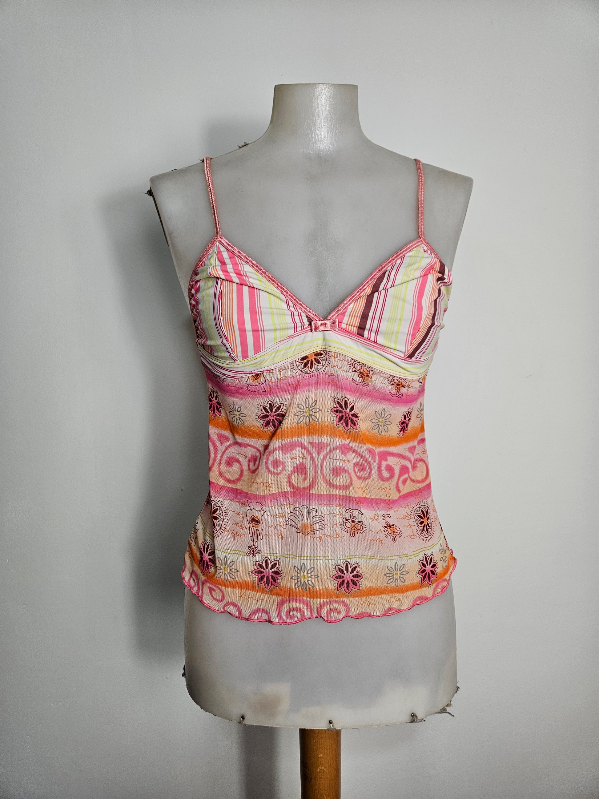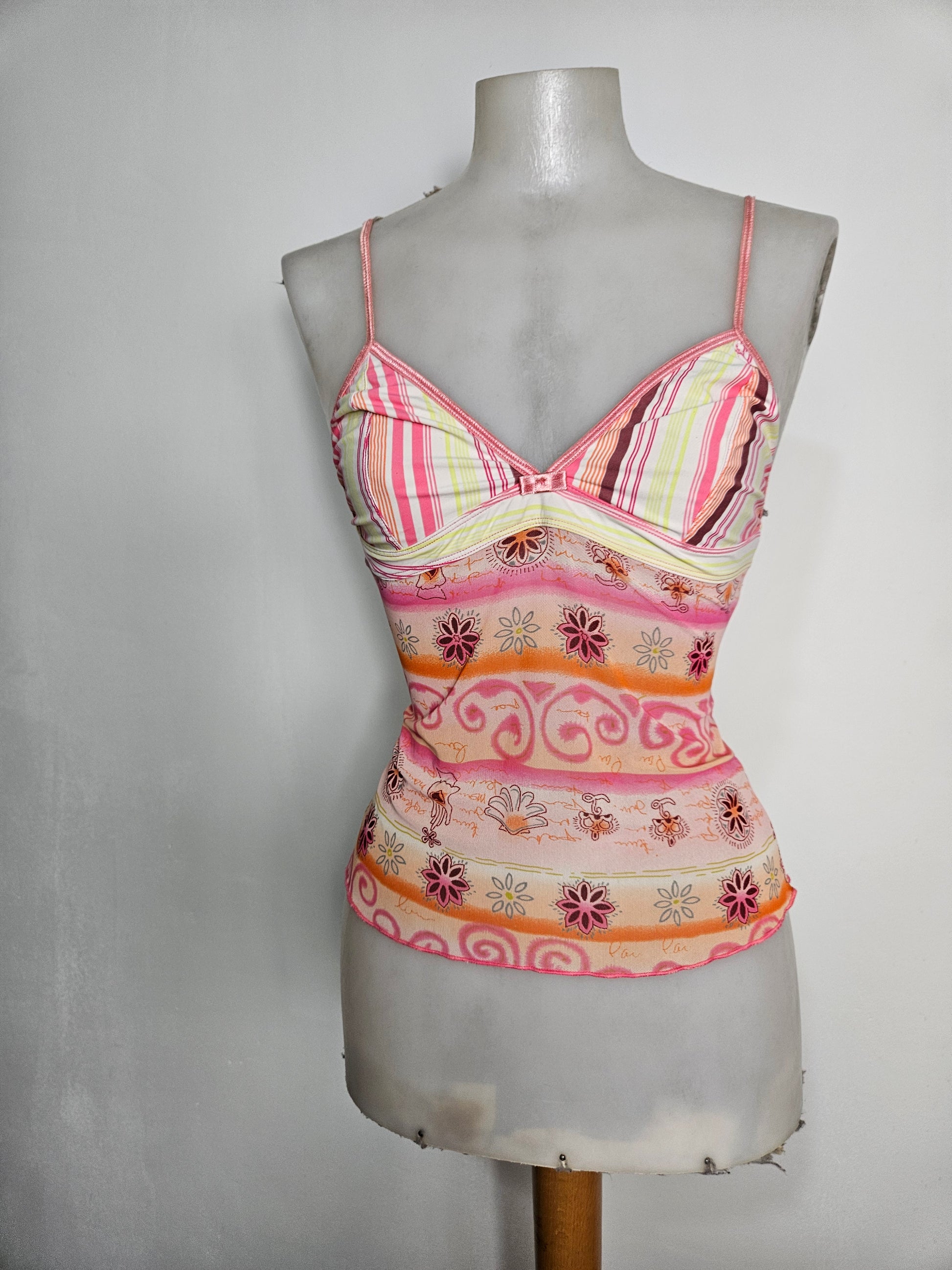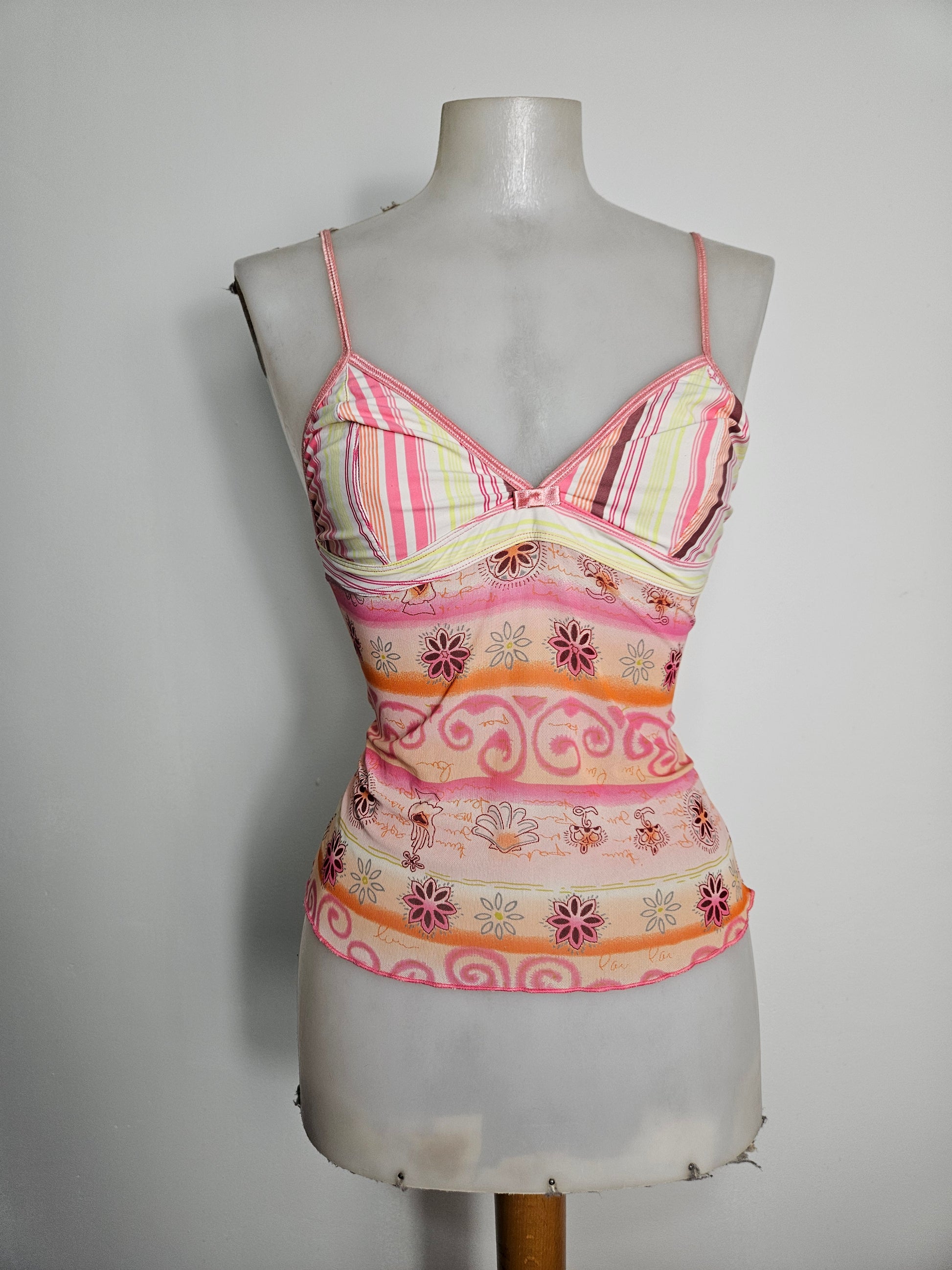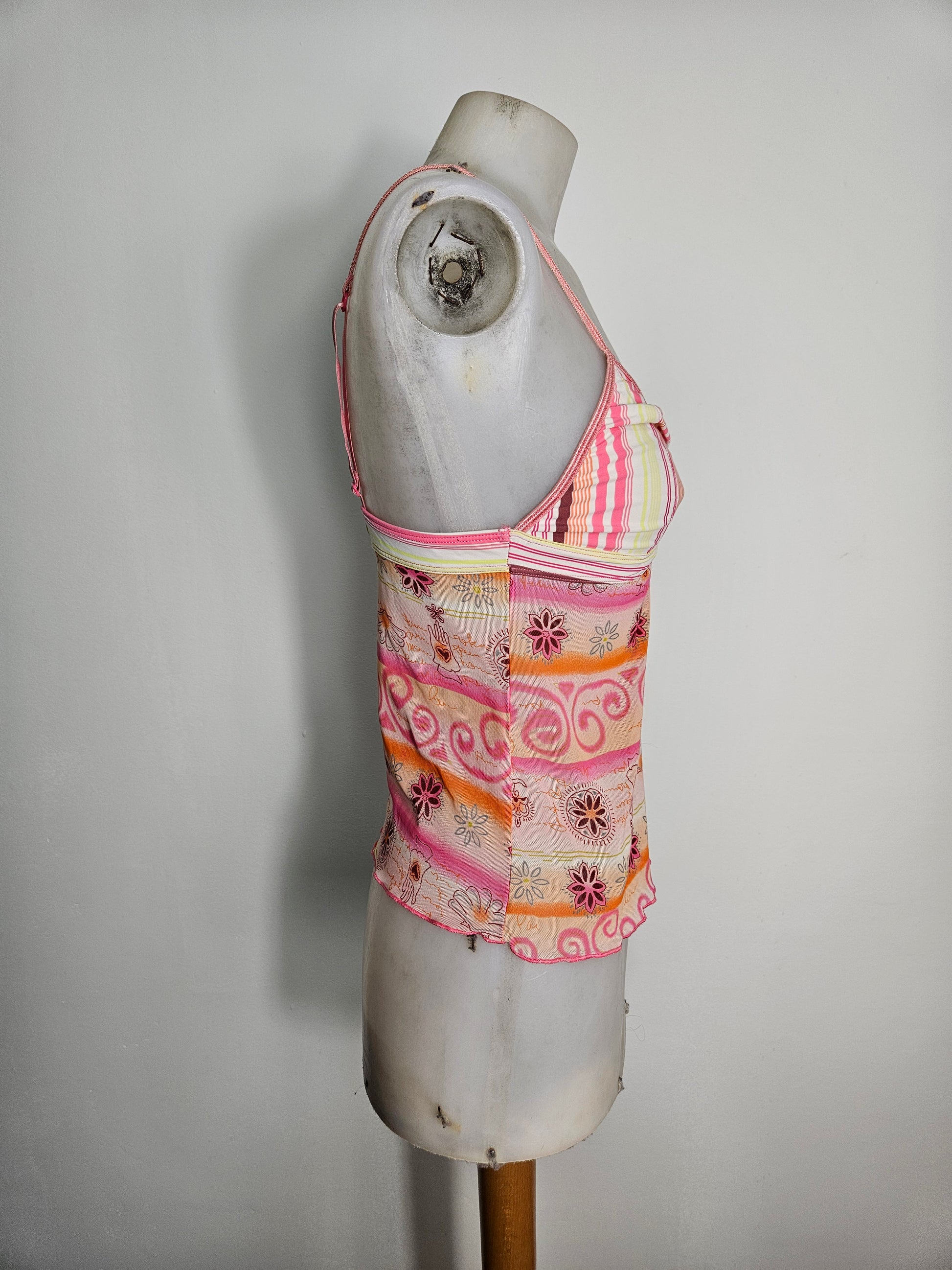 - Débardeur imprimé fleuri et rayé multicolore (dominante rose, orange, motifs fleuris et rayés)