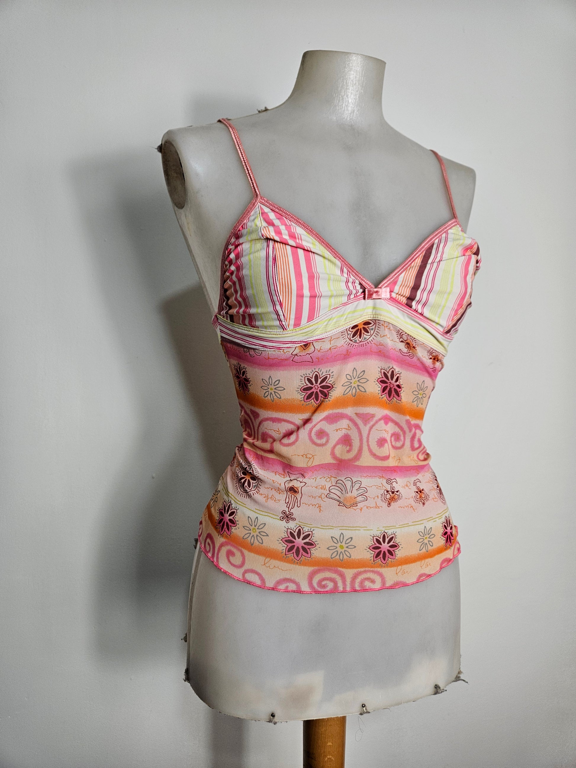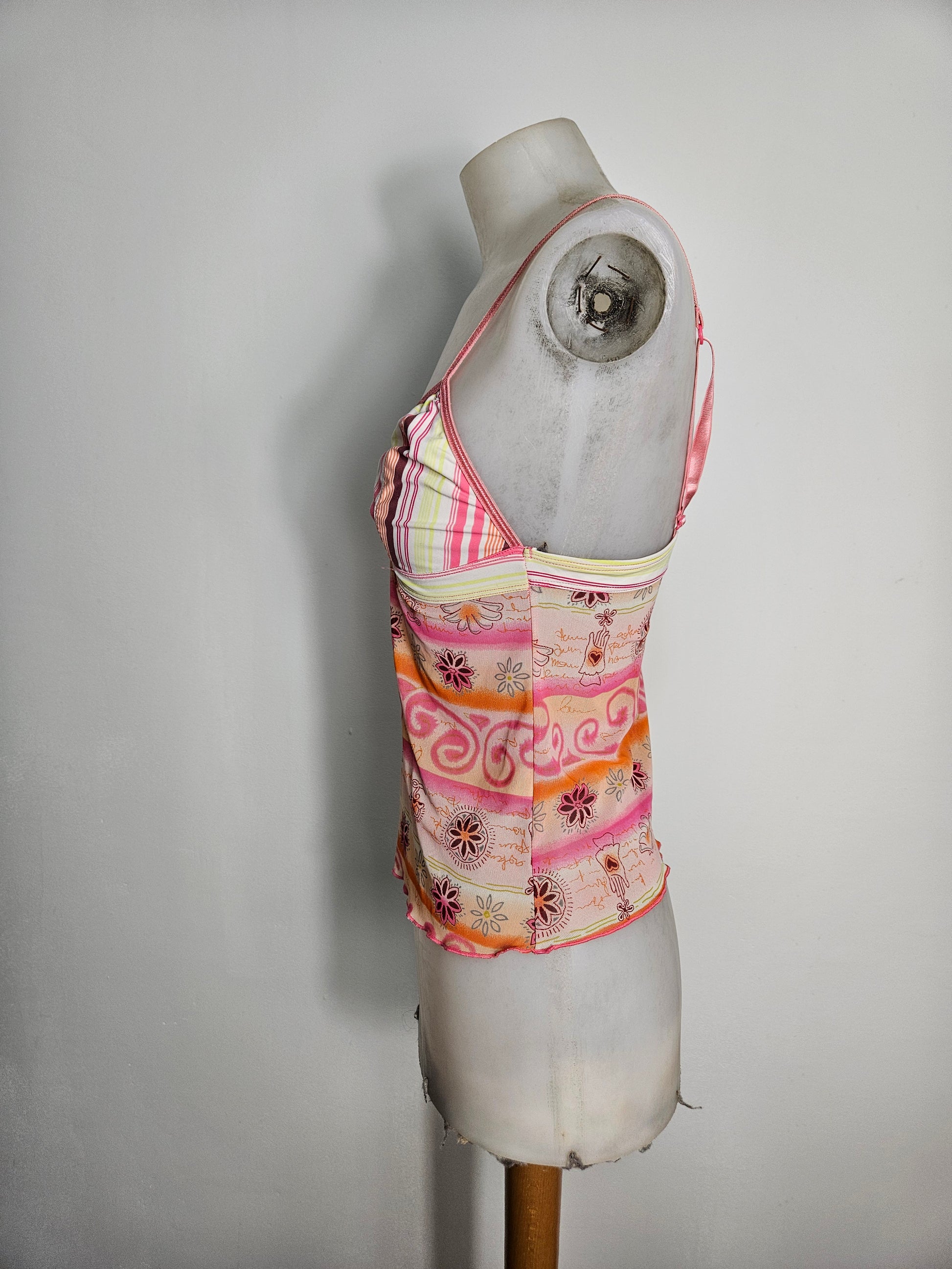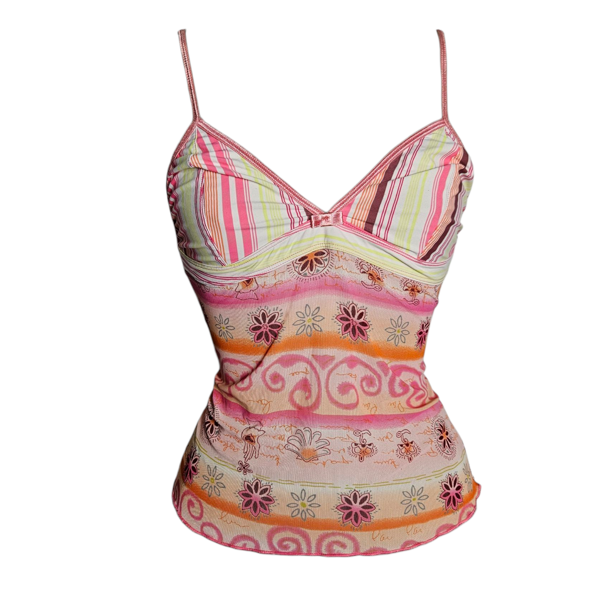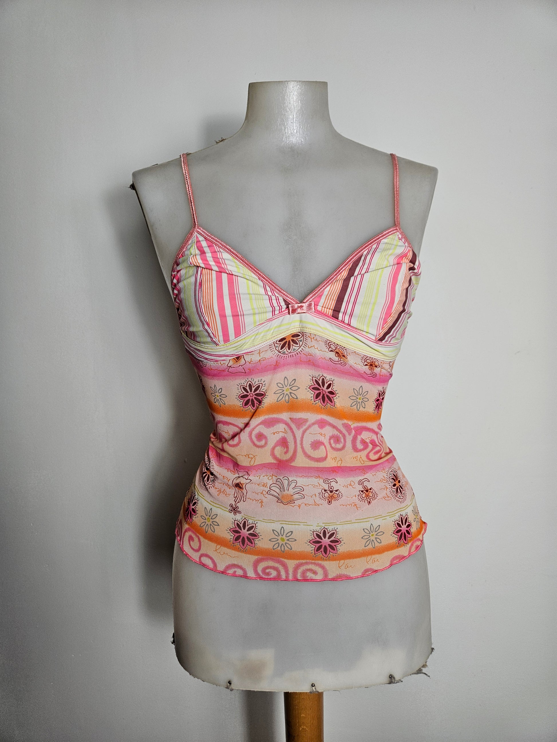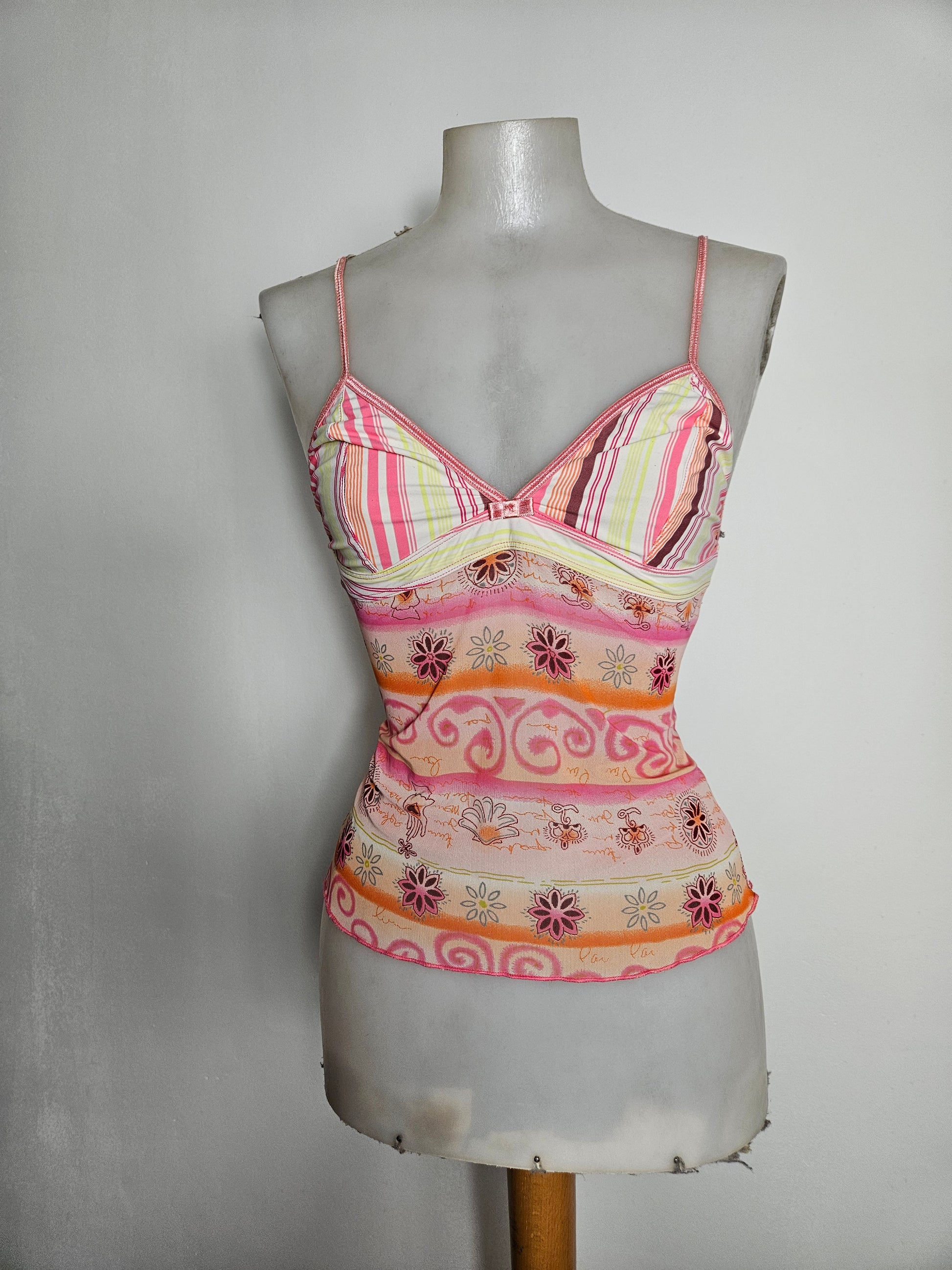 - Débardeur imprimé fleuri et rayé multicolore (dominante rose, orange, motifs fleuris et rayés)