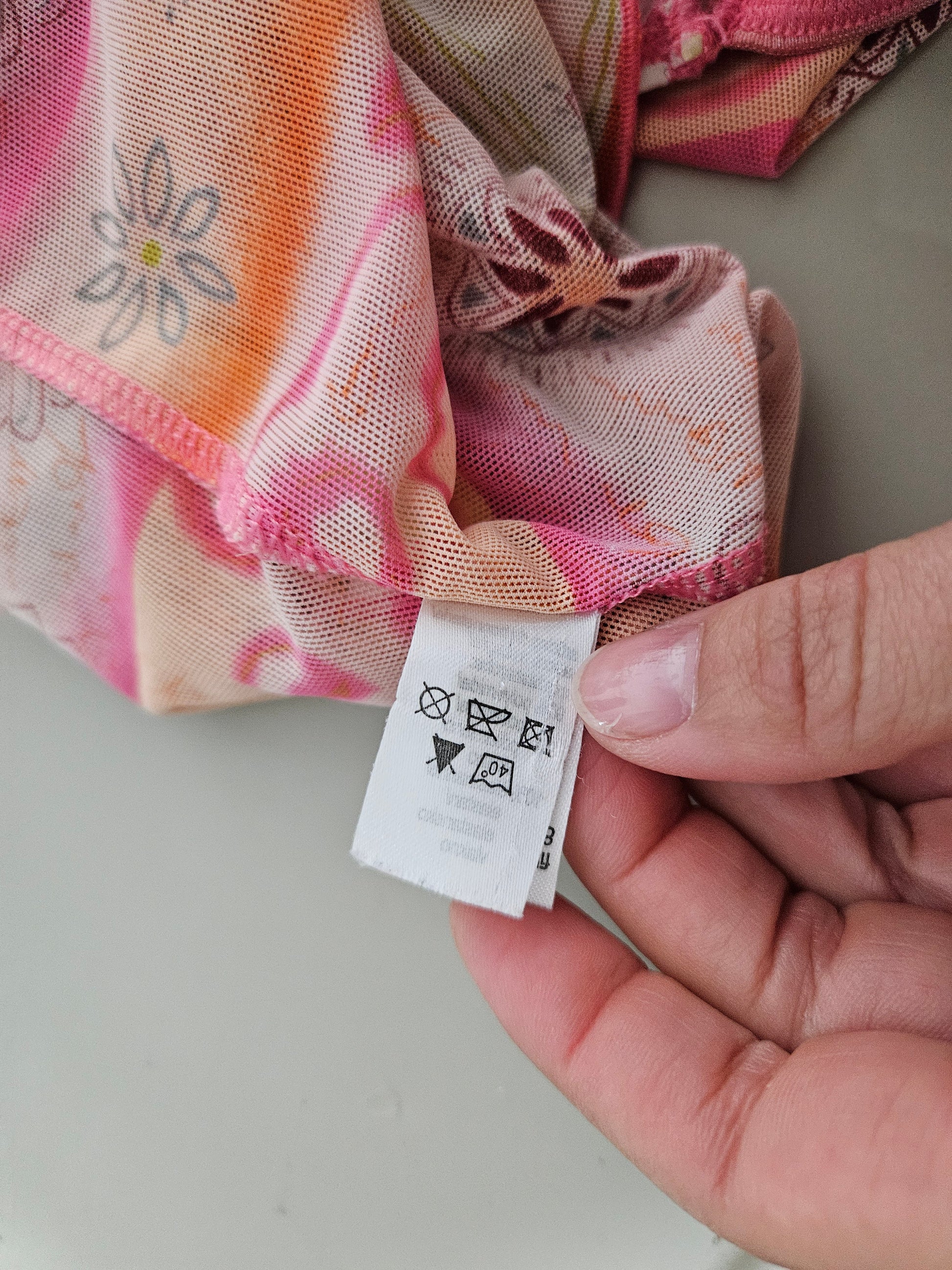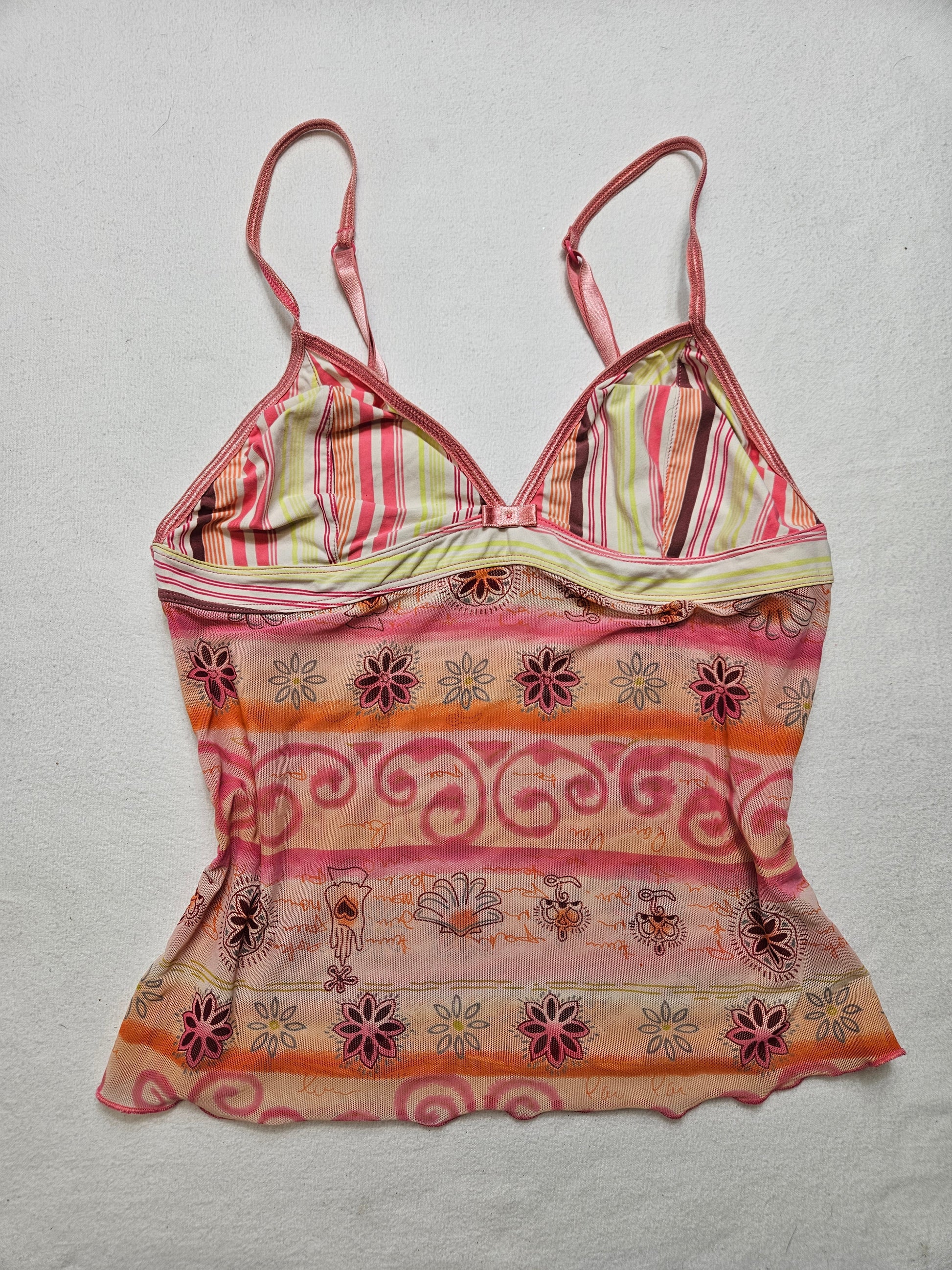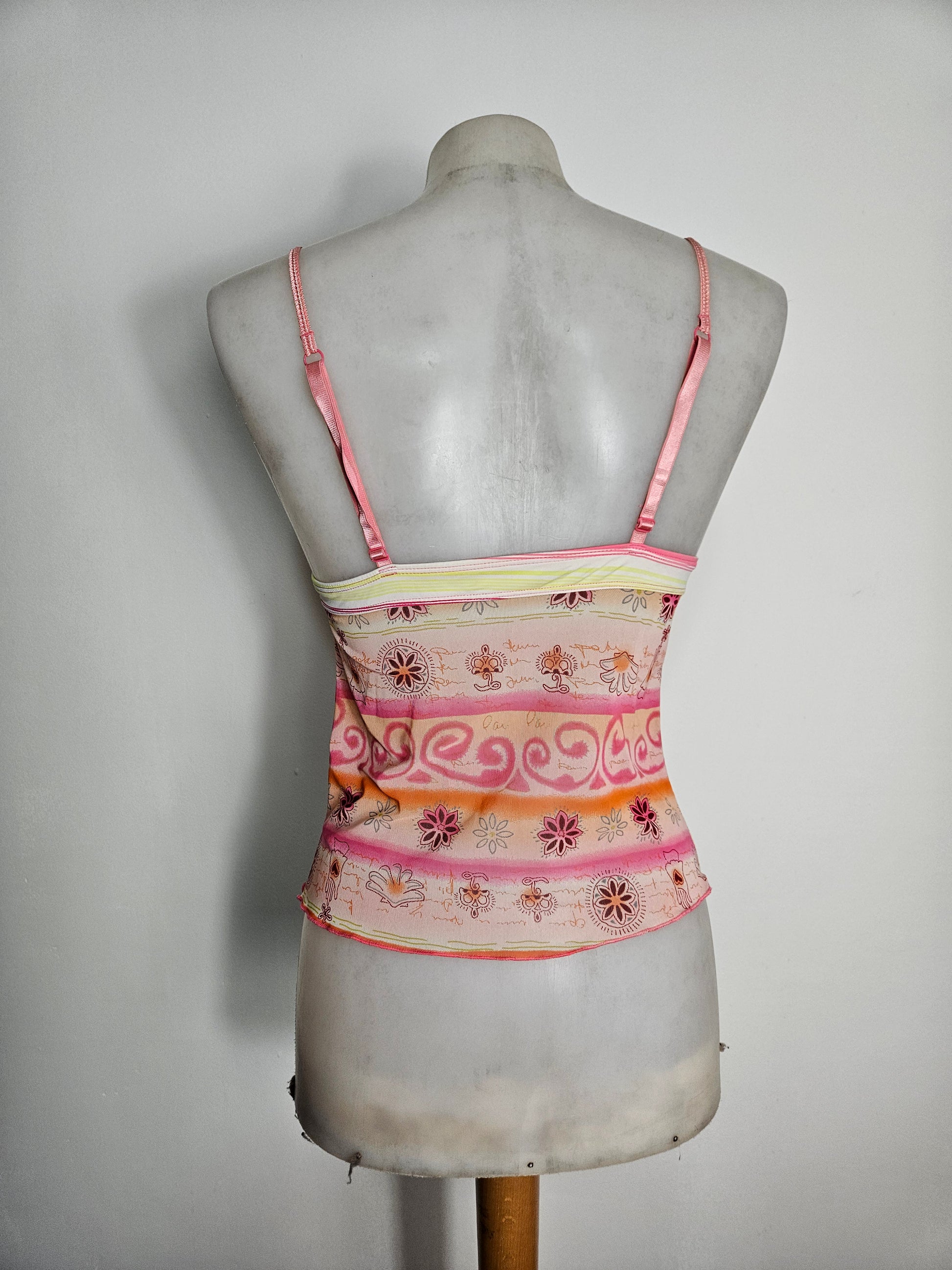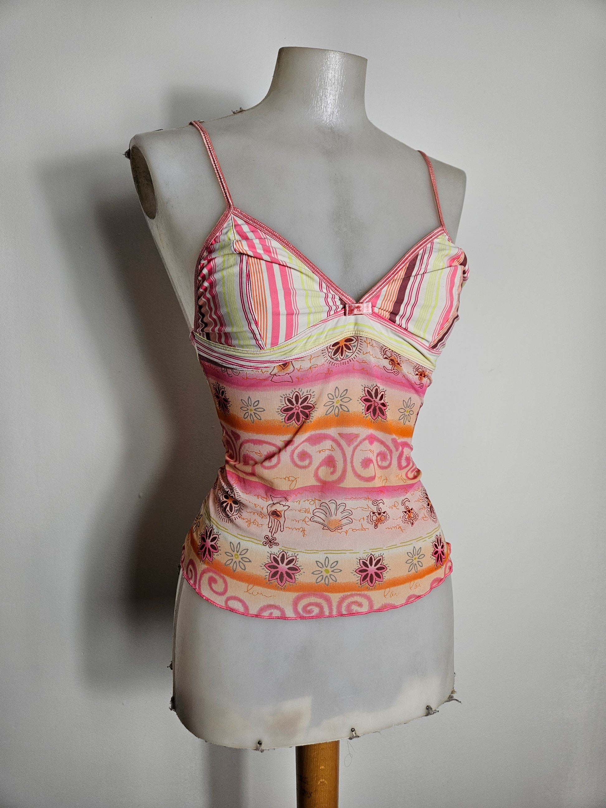 - Débardeur imprimé fleuri et rayé multicolore (dominante rose, orange, motifs fleuris et rayés)