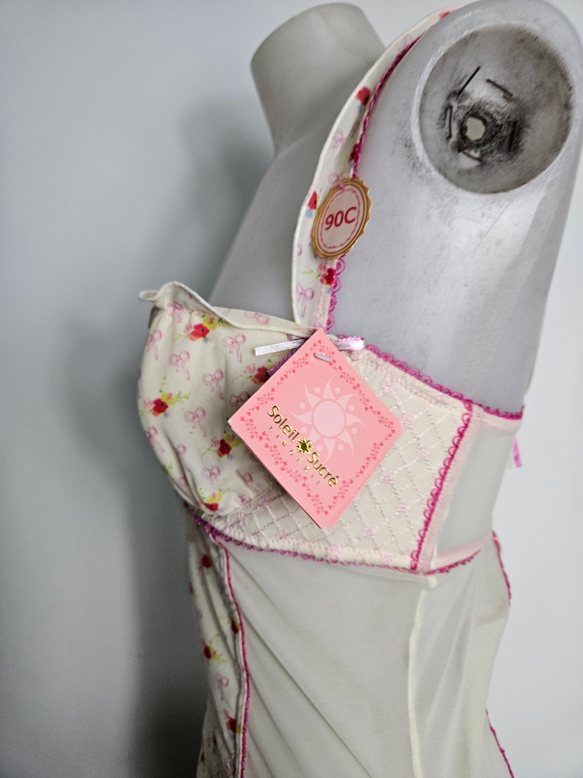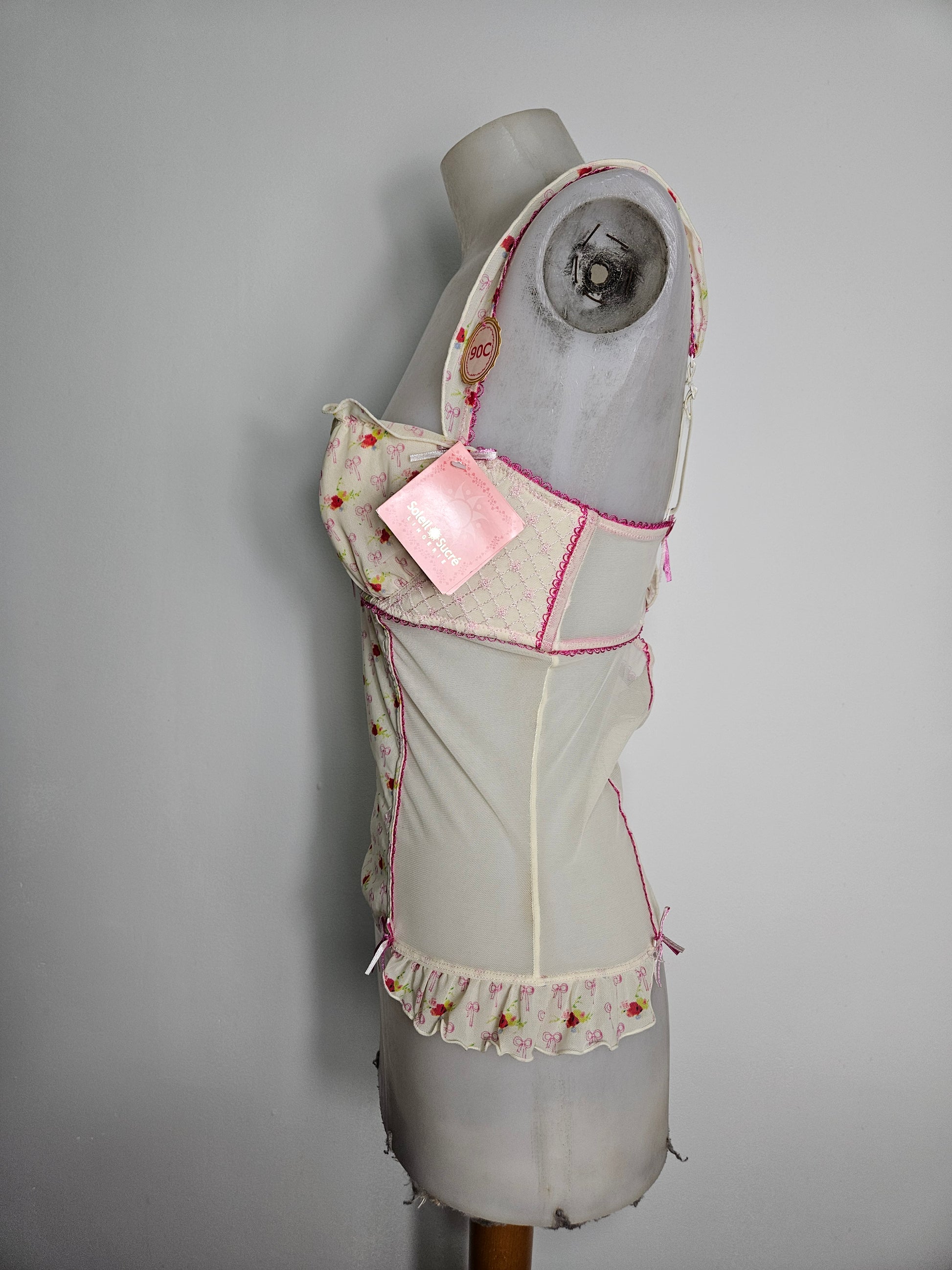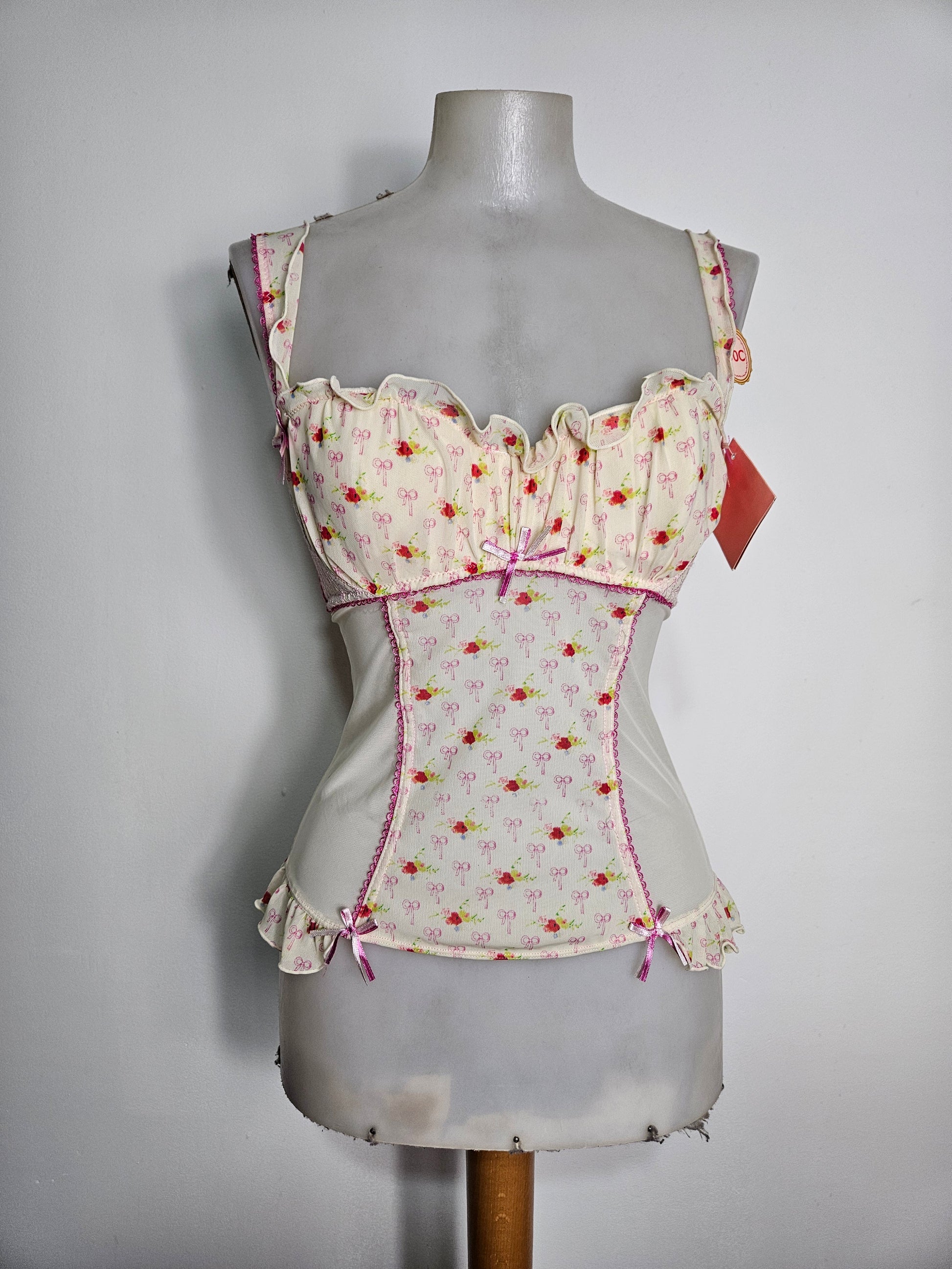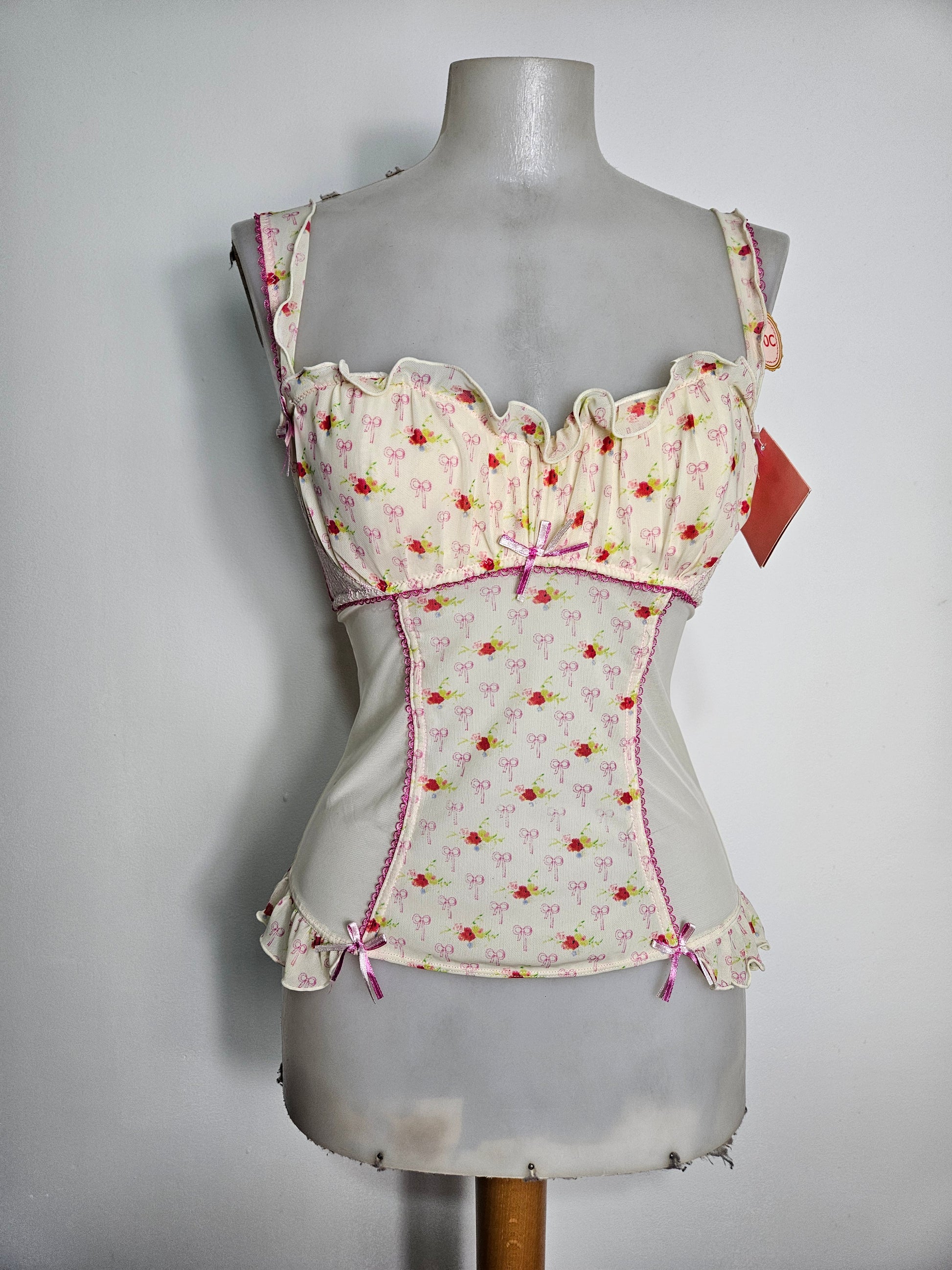 Top style nuisette à fines bretelles réglables, de couleur crème avec un imprimé floral (roses rouges) et des motifs de nœuds roses.