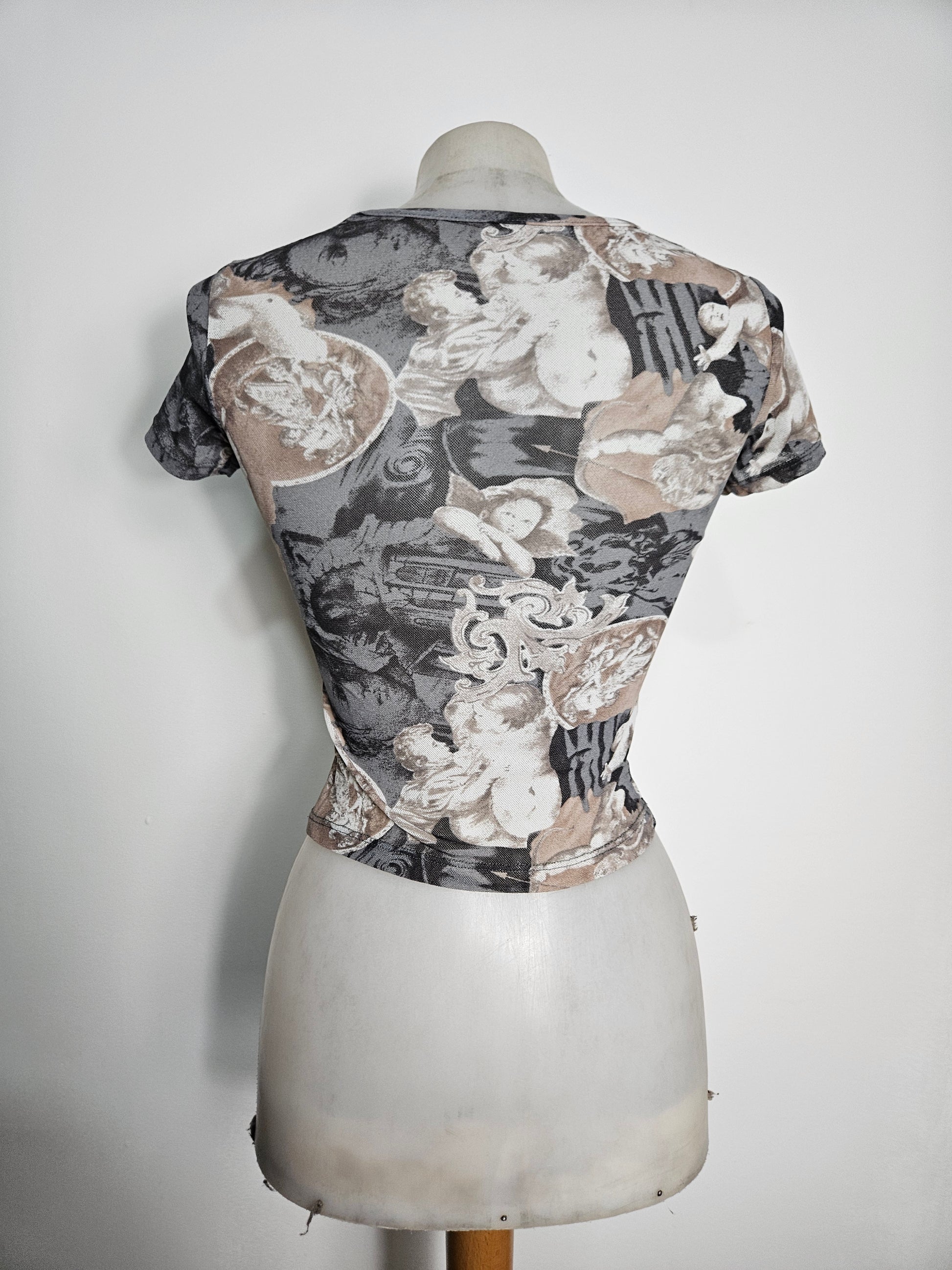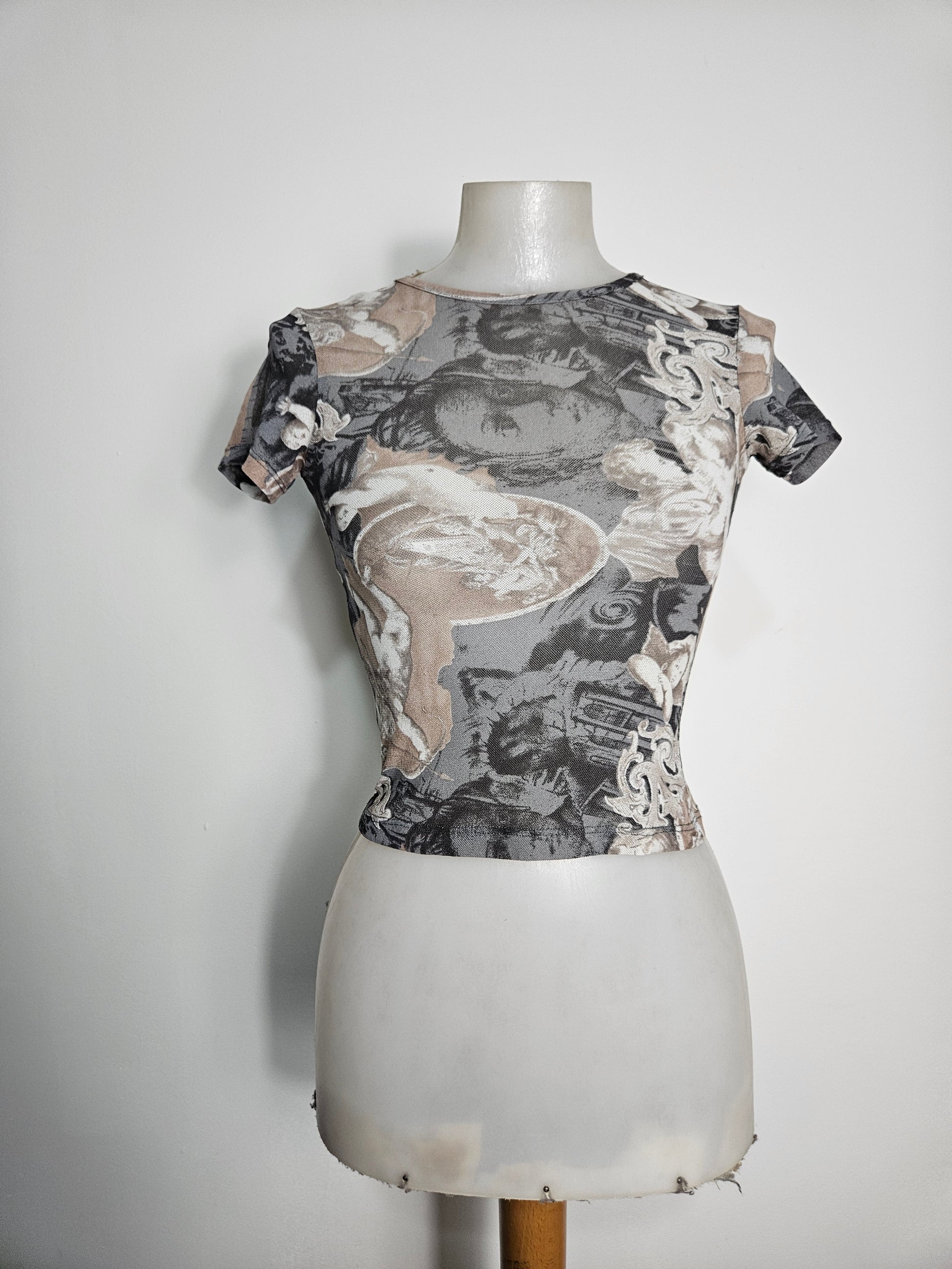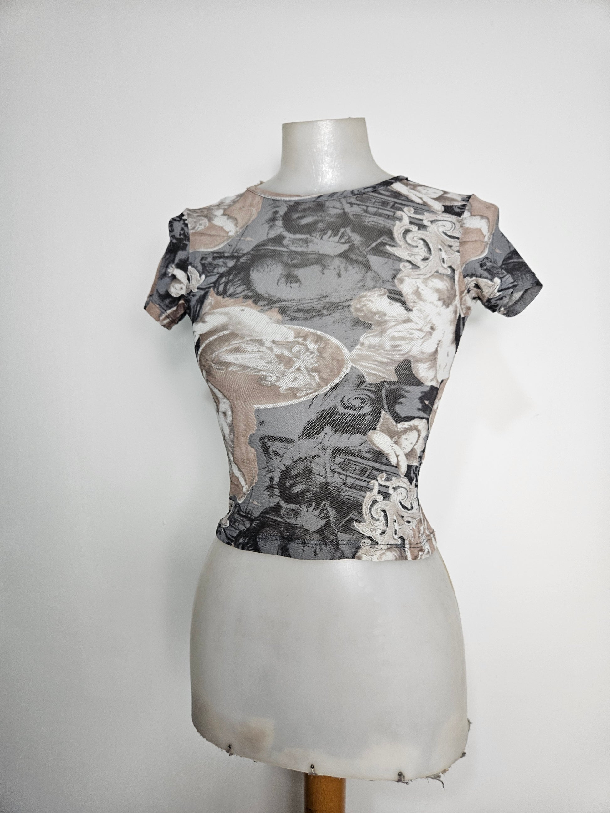 - Haut court en voile à motif renaissance dans les tons gris et beige