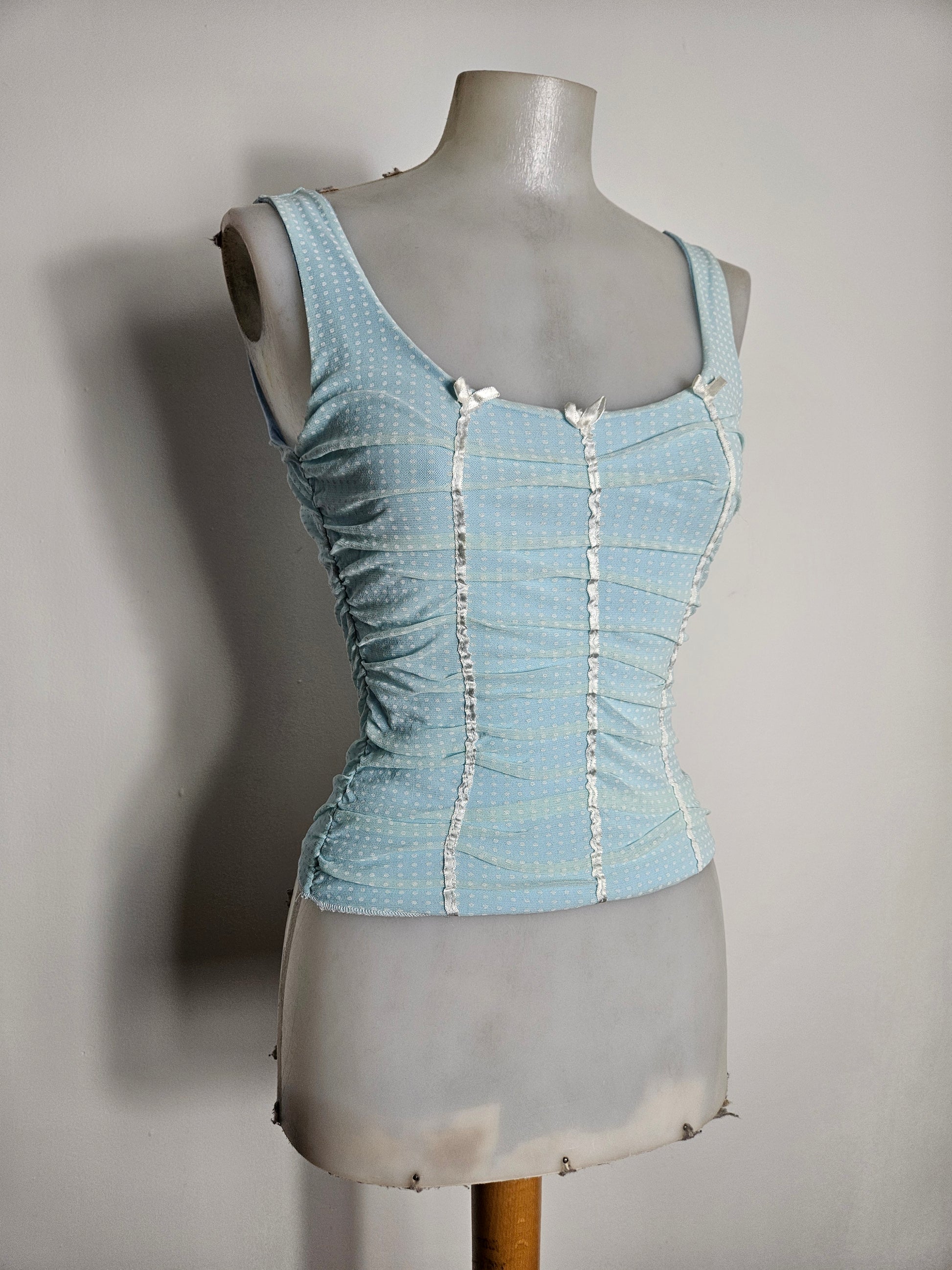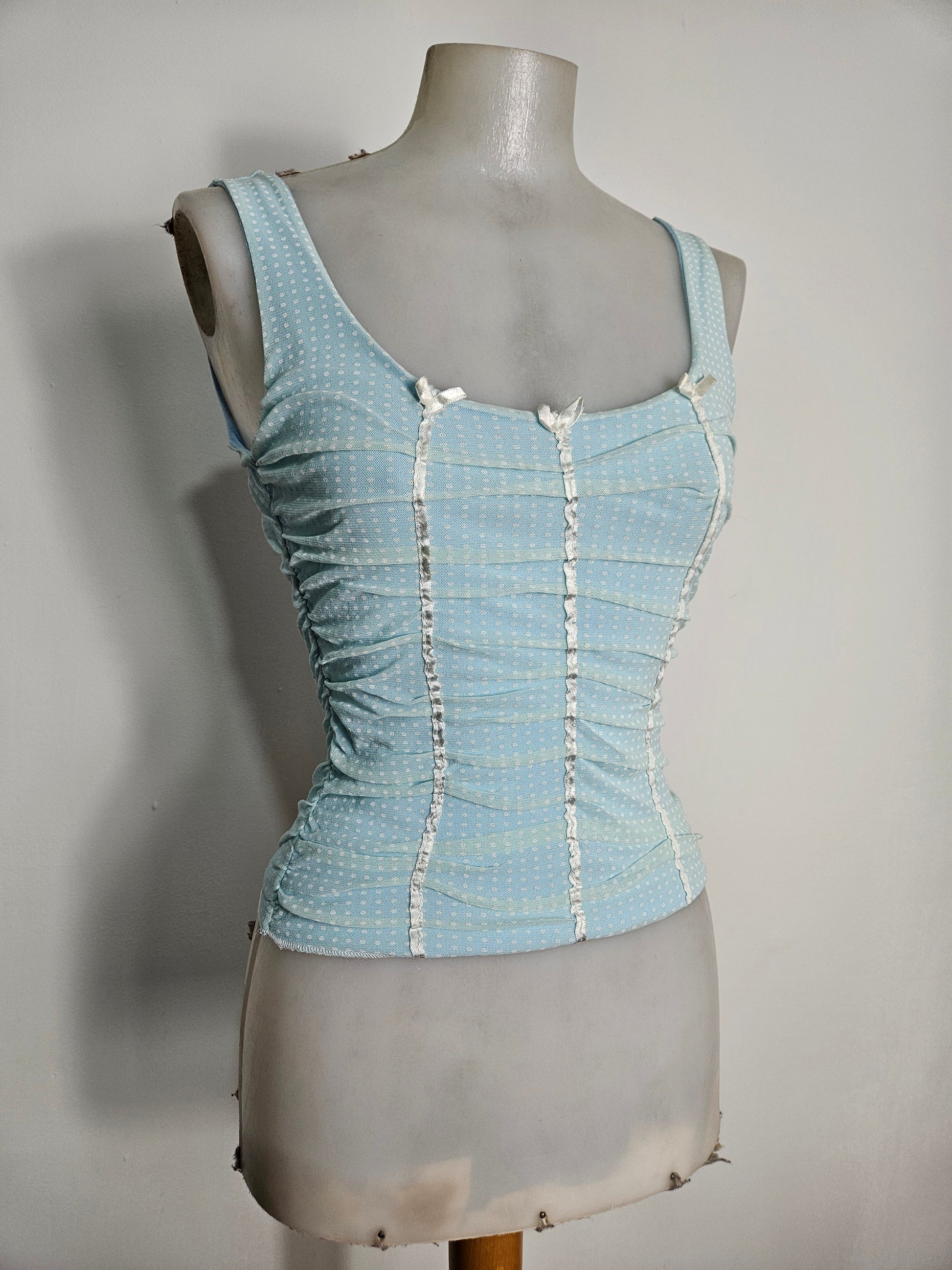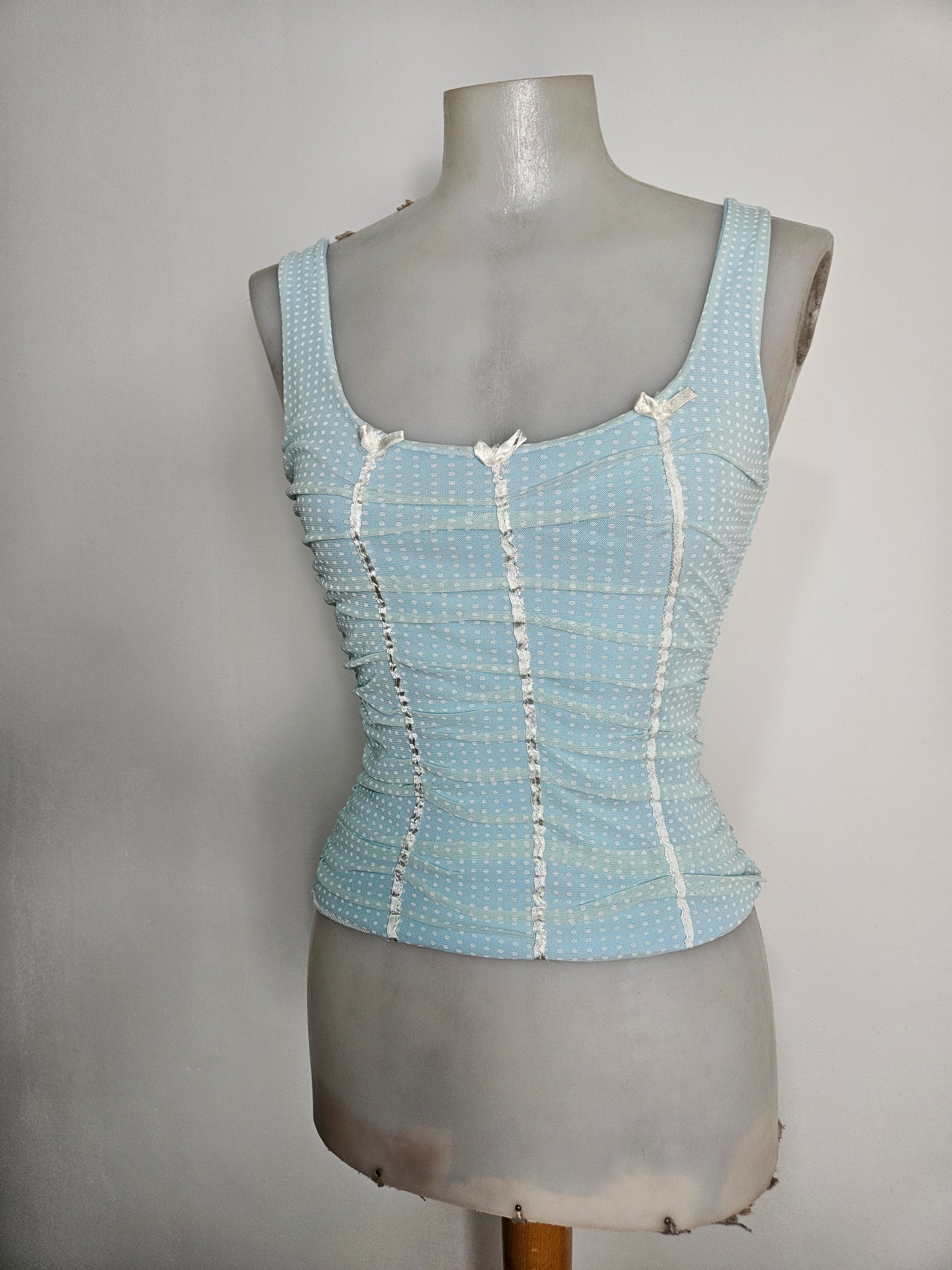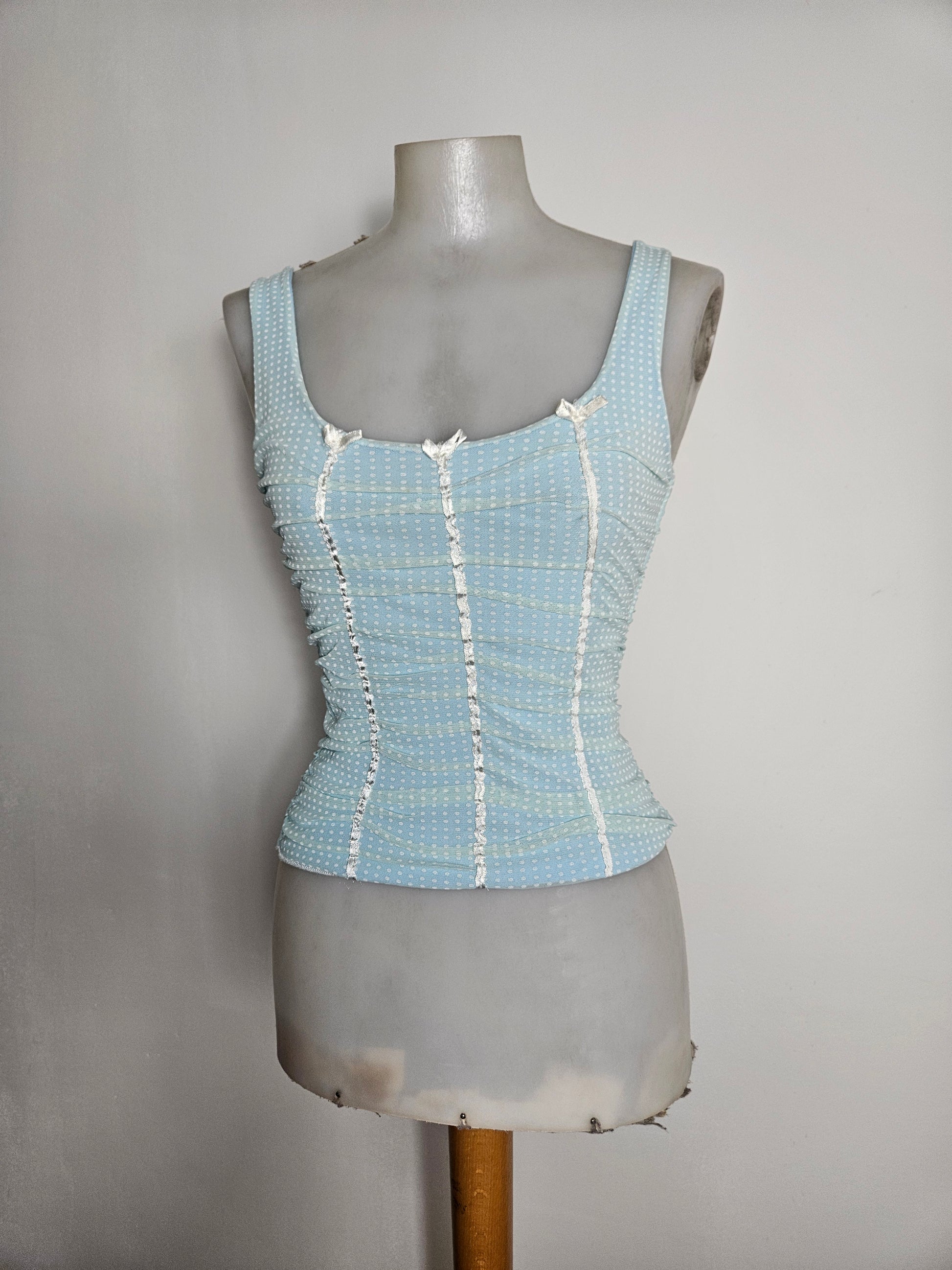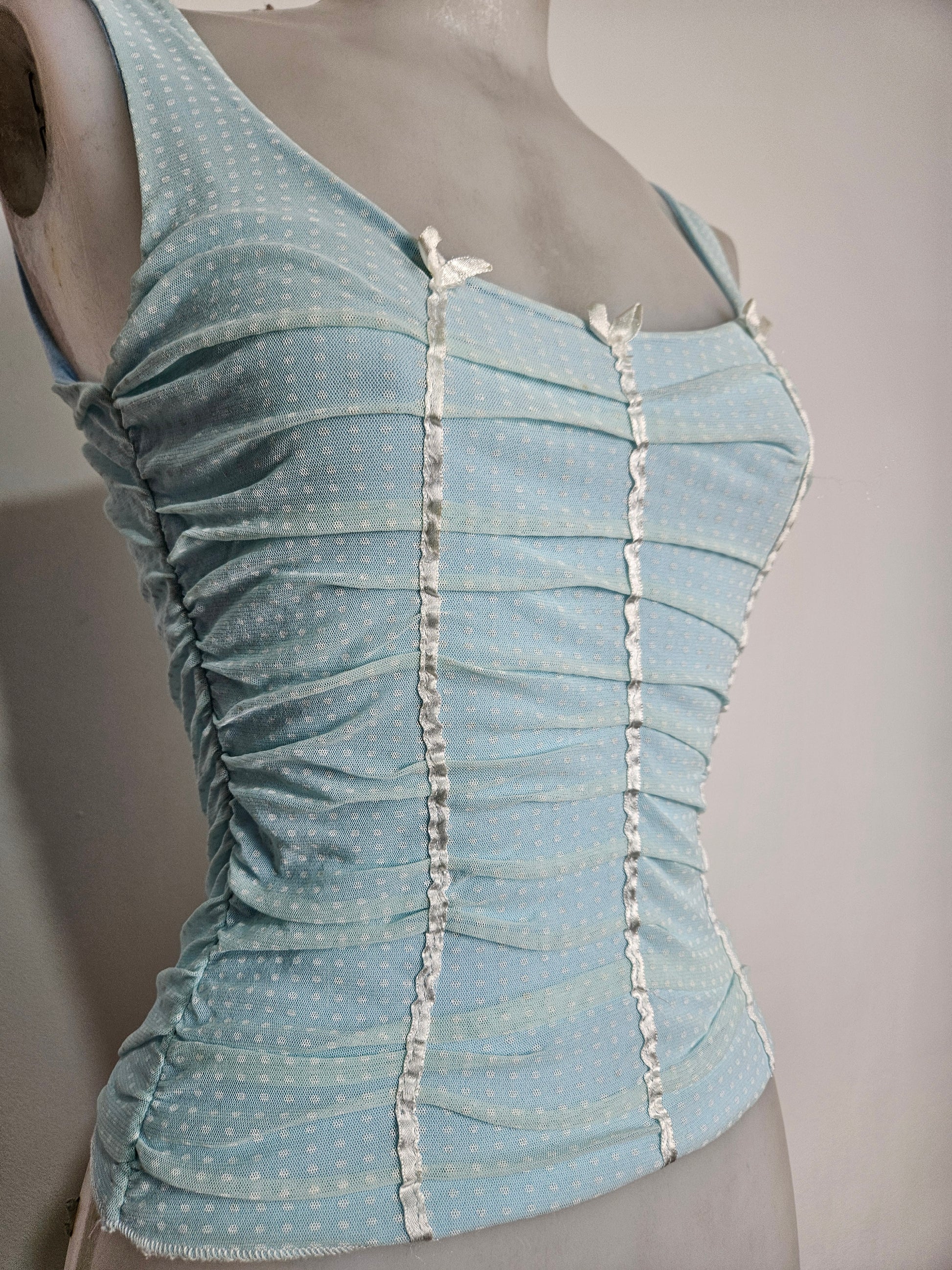 - Coutures apparentes avec finitions en ruban satiné blanc.